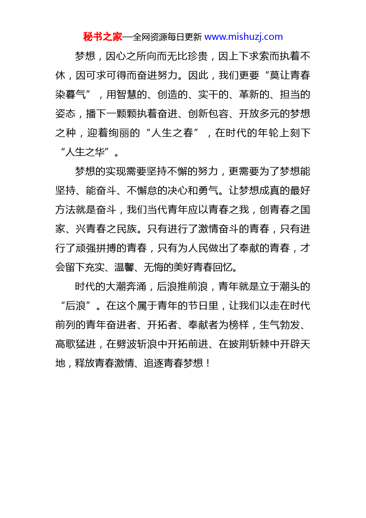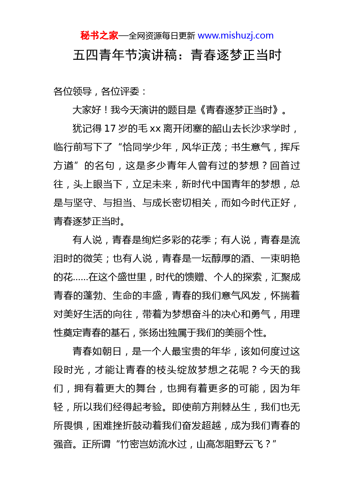 秘书之家—全网资源每日更新www.mishuzj.com五四青年节演讲稿:青春逐梦正当时各位领导,各位评委:大家好!我今天演讲的题目是《青春逐梦正当时》。犹记得17岁的毛xx离开闭塞的韶山去长沙求学时,临行前写下了“恰同学少年,风华正茂;书生意气,挥斥方遒”的名句,这是多少青年人曾有过的梦想?回首过往,头上眼当下,立足未来,新时代中国青年的梦想,总是与坚守、与担当、与成长密切相关,而如今时代正好,青春逐梦正当时。有人说,青春是绚烂多彩的花季;有人说,青春是流泪时的微笑;也有人说,青春是一坛醇厚的酒、一束明艳的花……在这个盛世里,时代的馈赠、个人的探索,汇聚成青春的蓬勃、生命的丰盛,青春的我们意气风发,怀揣着对美好生活的向往,带着为梦想奋斗的决心和勇气,用理性奠定青春的基石,张扬出独属于我们的美丽个性。青春如朝日,是一个人最宝贵的年华,该如何度过这段时光,才能让青春的枝头绽放梦想之花呢?今天的我们,拥有着更大的舞台,也拥有着更多的可能,因为年轻,所以我们经得起考验。即使前方荆棘丛生,我们也无所畏惧,困难挫折鼓动着我们奋发超越,成为我们青春的强音。正所谓“竹密岂妨流水过,山高怎阻野云飞?”秘书之家—全网资源每日更新www.mishuzj.com梦想,因心之所向而无比珍贵,因上下求索而执着不休,因可求可得而奋进努力。因此,我们更要“莫让青春染暮气”,用智慧的、创造的、实干的、革新的、担当的姿态,播下一颗颗执着奋进、创新包容、开放多元的梦想之种,迎着绚丽的“人生之春”,在时代的年轮上刻下“人生之华”。梦想的实现需要坚持不懈的努力,更需要为了梦想能坚持、能奋斗、不懈怠的决心和勇气。让梦想成真的最好方法就是奋斗,我们当代青年应以青春之我,创青春之国家、兴青春之民族。只有进行了激情奋斗的青春,只有进行了顽强拼搏的青春,只有为人民做出了奉献的青春,才会留下充实、温馨、无悔的美好青春回忆。时代的大潮奔涌,后浪推前浪,青年就是立于潮头的“后浪”。在这个属于青年的节日里,让我们以走在时代前列的青年奋进者、开拓者、奉献者为榜样,生气勃发、高歌猛进,在劈波斩浪中开拓前进、在披荆斩棘中开辟天地,释放青春激情、追逐青春梦想!