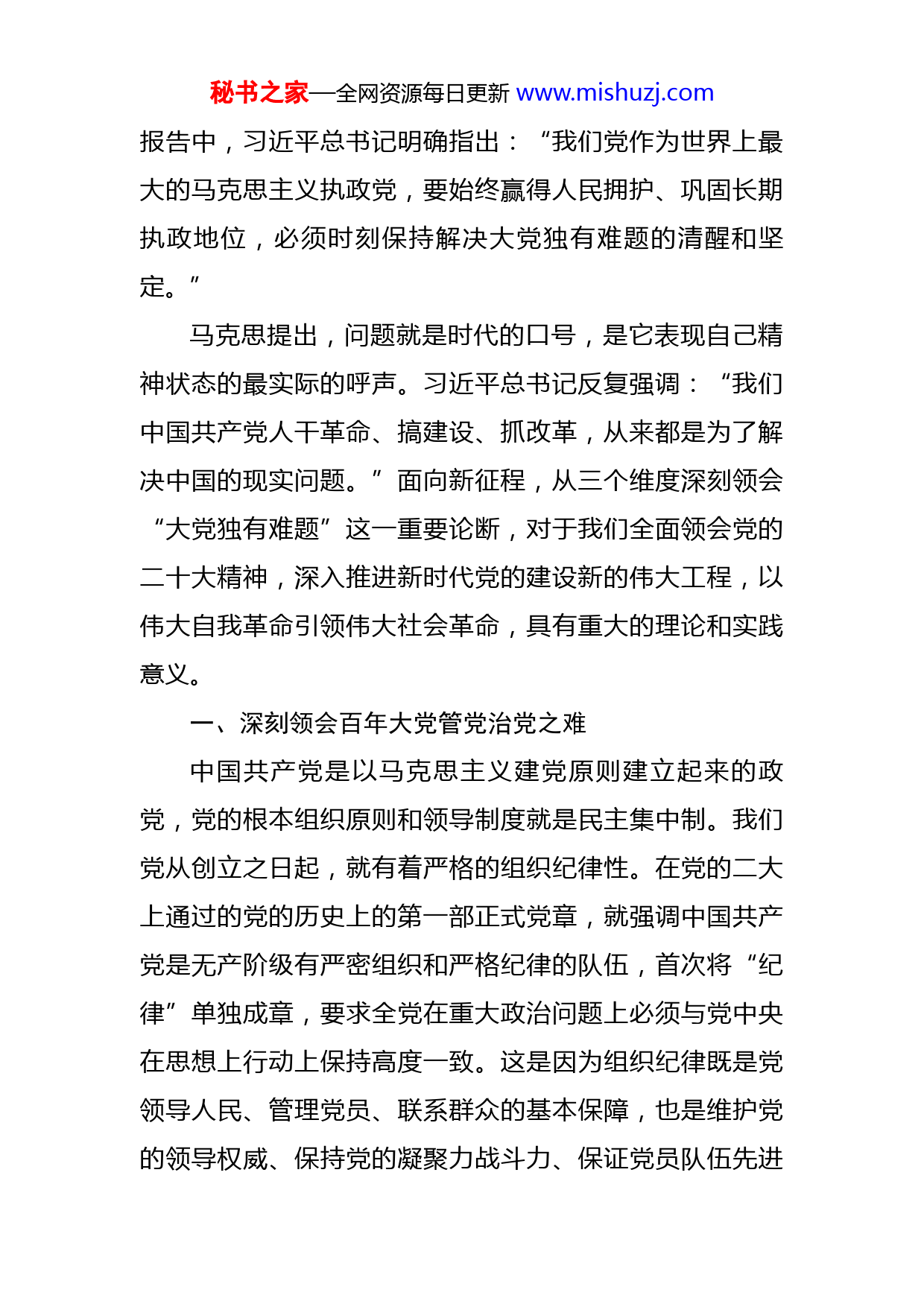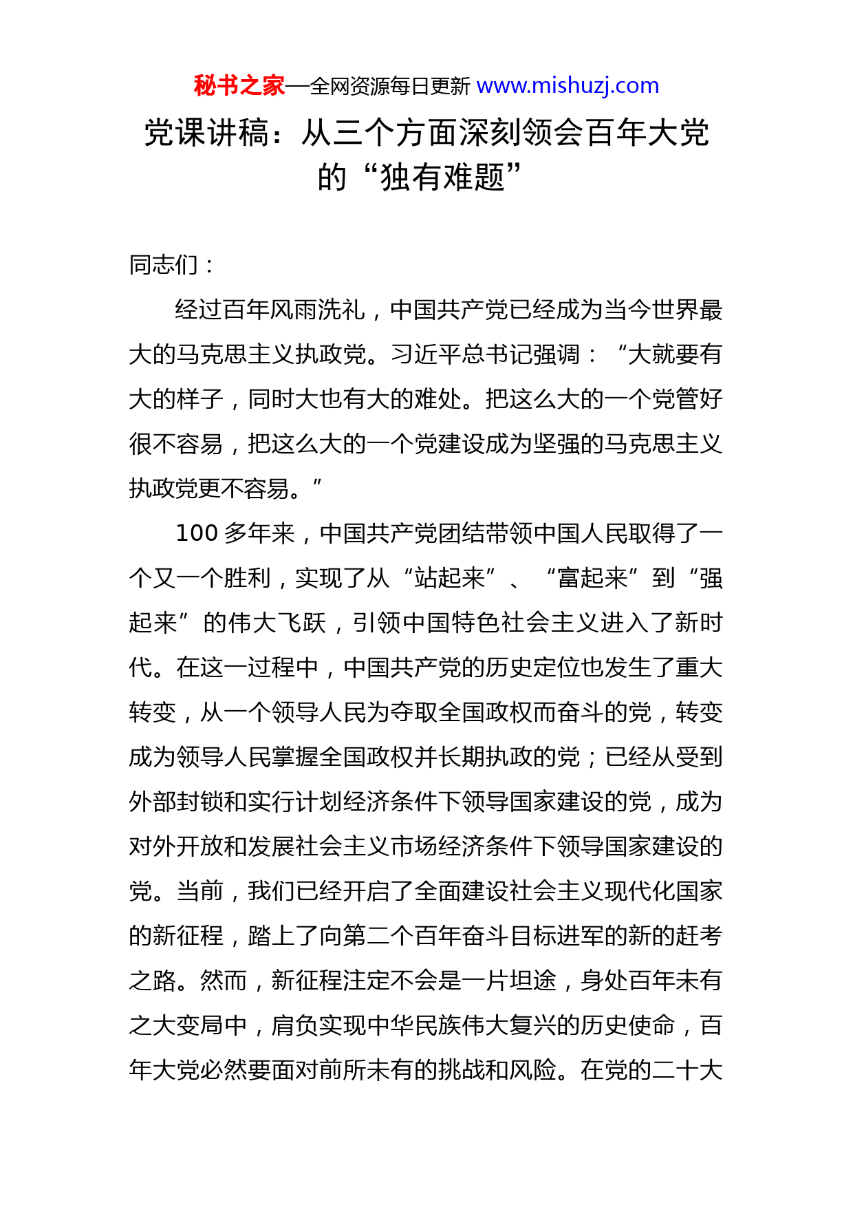 秘书之家—全网资源每日更新www.mishuzj.com党课讲稿:从三个方面深刻领会百年大党的“独有难题”同志们:经过百年风雨洗礼,中国共产党已经成为当今世界最大的马克思主义执政党。习近平总书记强调:“大就要有大的样子,同时大也有大的难处。把这么大的一个党管好很不容易,把这么大的一个党建设成为坚强的马克思主义执政党更不容易。”100多年来,中国共产党团结带领中国人民取得了一个又一个胜利,实现了从“站起来”、“富起来”到“强起来”的伟大飞跃,引领中国特色社会主义进入了新时代。在这一过程中,中国共产党的历史定位也发生了重大转变,从一个领导人民为夺取全国政权而奋斗的党,转变成为领导人民掌握全国政权并长期执政的党;已经从受到外部封锁和实行计划经济条件下领导国家建设的党,成为对外开放和发展社会主义市场经济条件下领导国家建设的党。当前,我们已经开启了全面建设社会主义现代化国家的新征程,踏上了向第二个百年奋斗目标进军的新的赶考之路。然而,新征程注定不会是一片坦途,身处百年未有之大变局中,肩负实现中华民族伟大复兴的历史使命,百年大党必然要面对前所未有的挑战和风险。在党的二十大秘书之家—全网资源每日更新www.mishuzj.com报告中,习近平总书记明确指出:“我们党作为世界上最大的马克思主义执政党,要始终赢得人民拥护、巩固长期执政地位,必须时刻保持解决大党独有难题的清醒和坚定。”马克思提出,问题就是时代的口号,是它表现自己精神状态的最实际的呼声。习近平总书记反复强调:“我们中国共产党人干革命、搞建设、抓改革,从来都是为了解决中国的现实问题。”面向新征程,从三个维度深刻领会“大党独有难题”这一重要论断,对于我们全面领会党的二十大精神,深入推进新时代党的建设新的伟大工程,以伟大自我革命引领伟大社会革命,具有重大的理论和实践意义。一、深刻领会百年大党管党治党之难中国共产党是以马克思主义建党原则建立起来的政党,党的根本组织原则和领导制度就是民主集中制。我们党从创立之日起,就有着严格的组织纪律性。在党的二大上通过的党的历史上的第一部正式党章,就强调中国共产党是无产阶级有严密组织和严格纪律的队伍,首次将“纪律”单独成章,要求全党在重大政治问题上必须与党中央在思想上行动上保持高度一致。这是因为组织纪律既是党领导人民、管理党员、联系群众的基本保障,也是维护党的领导权威、保持党的凝聚力战斗力、保证党员队伍先进秘书之家—全网资源每日更新www.mishuzj.com性纯洁性的现实需要。此外,党的全部力量源于组织,组织能使党的力量倍增,这是中国共产党相较于其他政党的独特优势。党章中规定的“四个服从”,指明了党最基本的组织原则,也是党员应该遵守的最基本的组织纪律。截至2021年年底,中国共产党党员总数为9671.2万名,党的基层组织493.6万个。党员总量和党组织数量的大幅增长,一方面壮大充实了党的力量,更多的新鲜血液加入党的队伍,彰显出党的强大生机与活力,展现出党的事业兴旺发达、欣欣向荣的蓬勃气象;另一方面也使得管党治党的任务比以往任何时候都更加艰巨繁重。习近平总书记在分析党建工作的难题时曾指出:“尽管每个党员都编入一个党组织进行管理,也有严明的组织纪律规定,但就全党来说,一些党组织软弱涣散,一些党员、干部难以受到监督,队伍管理缺位、不到位情况不是个别。”在反思苏共亡党教训时,他进一步强调:“苏共早年在有二十万党员时能够夺取政权,在有二百万党员时能够打败法西斯侵略者,而在有近二千万党员时却丢失了政权、丢失了自己,这是为什么?我看,很重要的一个原因是政治纪律被动摇了,谁都可以言所欲言、为所欲为,那还叫什么政党呢?那是乌合之众了。”中国共产党始终代表最广大人民根本利益,与人民休戚与共、生死相依,没有任何自己特殊的利益,从来不代秘书之家—全网资源每日更新www.mishuzj.com表任何利益集团、任何权势团体、任何特权阶层的利益。这是马克思主义政党区别于其他政党的显著标志。但是,在这样庞大的党员队伍中,难免会混进一些动机不纯、理想信念缺失的人,一些党员不像党员、不在组织、不起作用,有的搞“两面派”、做“两面人”,还有的甚至腐化变质,给党的形象造成严重破坏。党的基层组织是党组织群众、宣传群众、凝聚群众、服务群众的直接载体,基层党组织力量的强弱,直接关系到党的路线方针政策能否在基层有效贯彻执行。但是,当前仍有一些基层党组织软弱涣散,导致党员队伍管理不到位,一些机关单位仍然存在办事拖拉、推诿扯皮、不会作为的行为,一些窗口单位仍然存在吃拿卡要、雁过拔毛、懒政怠政的行为,一些基层社区仍然存在形式主义、官僚主义、欺上瞒下的行为,直接影响了党在群众中的公信力。面对管党治党的这些“独有难题”,我们必须清醒地认识到,党面临的“四大考验”是长期的、复杂的,党面临的“四种危险”是尖锐的、严峻的,党内存在的思想不纯、政治不纯、组织不纯、作风不纯等突出问题尚未得到根本解决,全面从严治党远未到大功告成的时候。新时代新征程上,我们决不能有松劲歇脚、疲劳厌战的情绪,必须坚守初心使命,深刻领会“两个确立”的决定性意义,增强