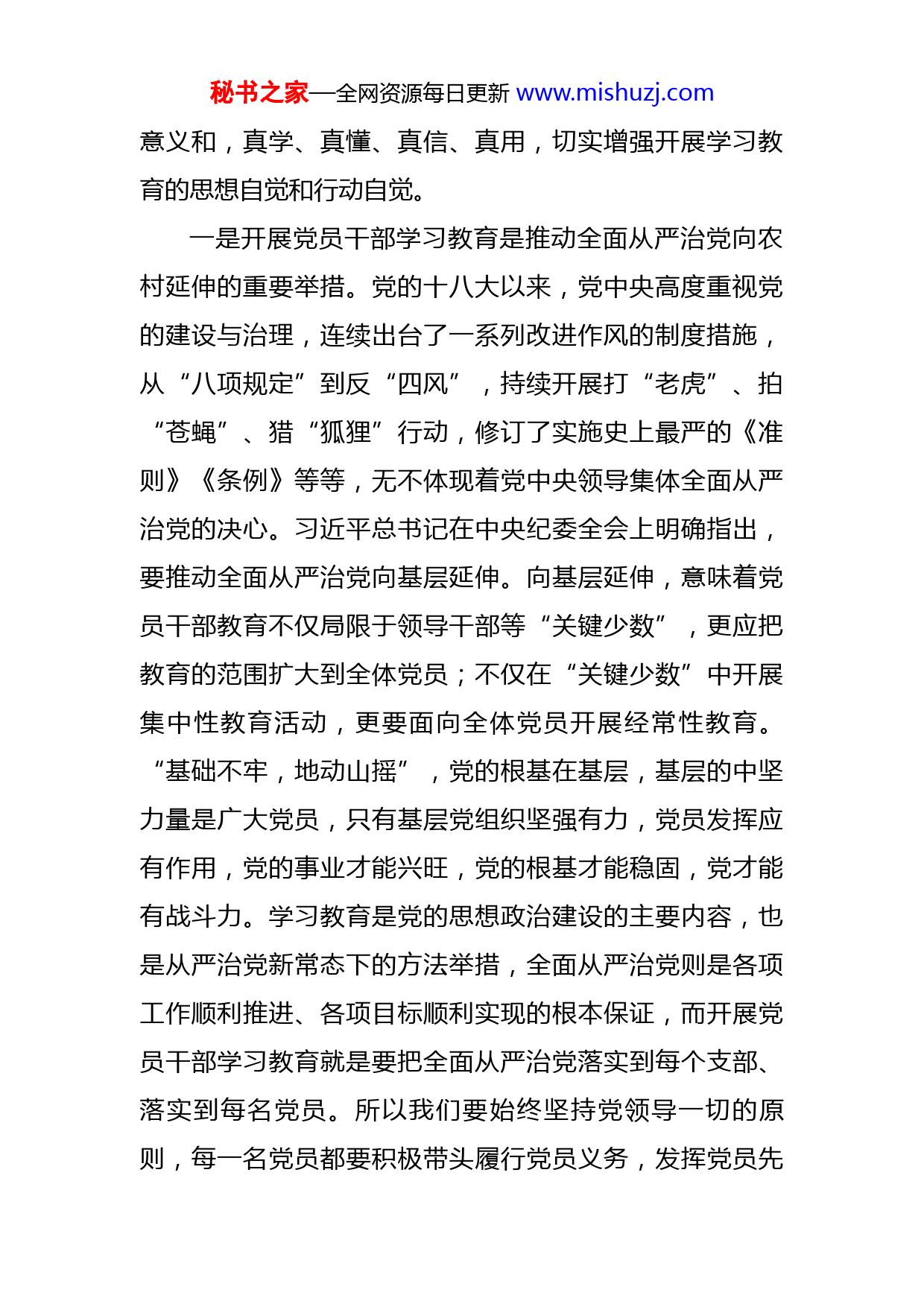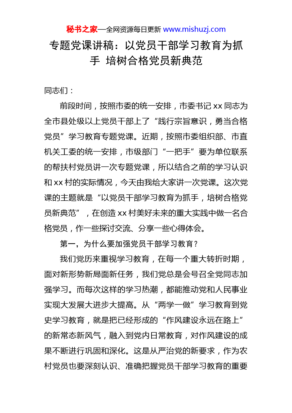 秘书之家—全网资源每日更新www.mishuzj.com专题党课讲稿:以党员干部学习教育为抓手培树合格党员新典范同志们:前段时间,按照市委的统一安排,市委书记xx同志为全市县处级以上党员干部上了“践行宗旨意识,勇当合格党员”学习教育专题党课。近期,按照市委组织部、市直机关工委的统一安排,市级部门“一把手”要为单位联系的帮扶村党员讲一次专题党课,所以结合之前的学习认识和xx村的实际情况,今天由我给大家讲一次党课。这次党课的主题就是“以党员干部学习教育为抓手,培树合格党员新典范”,在创造xx村美好未来的重大实践中做一名合格党员,作一些探讨交流、分享一些心得体会。第一,为什么要加强党员干部学习教育?我们党历来重视学习教育,在每一个重大转折时期,面对新形势新局面新任务,我们党总是会号召全党同志加强学习。而每次这样的学习热潮,都能推动党和人民事业实现大发展大进步大提高。从“两学一做”学习教育到党史学习教育,就是把已经形成的“作风建设永远在路上”的新常态新风气,融入到党内日常教育,对作风建设的成果不断进行巩固和深化。这是从严治党的新要求,作为农村党员也要深刻认识、准确把握党员干部学习教育的重要秘书之家—全网资源每日更新www.mishuzj.com意义和,真学、真懂、真信、真用,切实增强开展学习教育的思想自觉和行动自觉。一是开展党员干部学习教育是推动全面从严治党向农村延伸的重要举措。党的十八大以来,党中央高度重视党的建设与治理,连续出台了一系列改进作风的制度措施,从“八项规定”到反“四风”,持续开展打“老虎”、拍“苍蝇”、猎“狐狸”行动,修订了实施史上最严的《准则》《条例》等等,无不体现着党中央领导集体全面从严治党的决心。习近平总书记在中央纪委全会上明确指出,要推动全面从严治党向基层延伸。向基层延伸,意味着党员干部教育不仅局限于领导干部等“关键少数”,更应把教育的范围扩大到全体党员;不仅在“关键少数”中开展集中性教育活动,更要面向全体党员开展经常性教育。“基础不牢,地动山摇”,党的根基在基层,基层的中坚力量是广大党员,只有基层党组织坚强有力,党员发挥应有作用,党的事业才能兴旺,党的根基才能稳固,党才能有战斗力。学习教育是党的思想政治建设的主要内容,也是从严治党新常态下的方法举措,全面从严治党则是各项工作顺利推进、各项目标顺利实现的根本保证,而开展党员干部学习教育就是要把全面从严治党落实到每个支部、落实到每名党员。所以我们要始终坚持党领导一切的原则,每一名党员都要积极带头履行党员义务,发挥党员先秘书之家—全网资源每日更新www.mishuzj.com锋模范作用,努力在党员干部学习教育中立标杆、树形象、强作风、勇担当,用实际行动践行合格党员的标准。二是开展党员干部学习教育是保持党的先进性和纯洁性的根本途径。党的先进性和纯洁性要靠千千万万党员的先进性和纯洁性来体现,党的执政使命要靠千千万万党员卓有成效、成绩斐然的工作来完成。实践证明,只有广大党员信念坚定、素质优良、作用突出,党才能始终坚强有力,党的事业才会兴旺发达;只有广大党员牢记宗旨、心系群众,党才能始终保持同人民群众的血肉联系,党的执政基础才会更加牢固。党员就要有党员的样子,这是对党员最通俗的要求。但是,现在有不少党员已经把这个通俗的要求忘得一干二净,与当初入党宣誓时的那个“预备党员”渐行渐远,一步一步背离了自己做人做事的底线和本色。十八大之后,从党的高级干部到农村基层干部,先后有众多党员受到党纪国法不同程度的惩处,数量之多、频率之高,触目惊心,令人警醒。仔细想想,那些大大小小的“老虎”“苍蝇”,有谁是天生的?从“好同志”沦为“阶下囚”,“不幸”的轨迹恰恰都是“无”字当头——无组织无纪律,无底线无节操,无法律无道德,最后无法回头、无路可走,最终沦为受历史和人民唾弃的罪人。前车之鉴,后事之师。我们必须把开展党员干部学习教育作为锤炼党性、加强作风建设的基础工程、长期工程,常抓秘书之家—全网资源每日更新www.mishuzj.com不懈、务求实效,着力增强自我净化、自我完善、自我革新、自我提高能力。党中央开展系列党员干部学习教育,就是要深入贯彻“党要管党、从严治党”的根本方针,把党章党规和习近平新时代中国特色社会主义思想作为党性教育的必修课、常态课,引导广大党员特别是基层党员学深悟透,做到学而信、学而用、学而行,引导广大党员真正做一名讲政治、讲规矩、讲道德、讲奉献的合格党员,确保信念更加坚定、纪律更加严明、品行更加端庄、贡献更加无私,从而保持和发展党的先进性和纯洁性。三是开展党员干部学习教育是推动农村改革发展稳定的内生动力。加强思想政治工作是农村党建工作的一项重要职责,也是推动基层改革发展稳定的重要保证。近年来,随着经济社会的迅猛发展,一些党员精神空虚、唯利是图、贪图享受、奢侈浪费,在党不言党、在党不爱党、在党不护党、在党不为党,不按党的组织原则办事,不受党的纪律约束,在工作中不作为、乱作为,在群众面前胡言乱语、散播矛盾,有的品行低劣、价值观错位,沾染了黄、赌、毒等不良习气,这些人不仅没有发挥先锋模范作用,