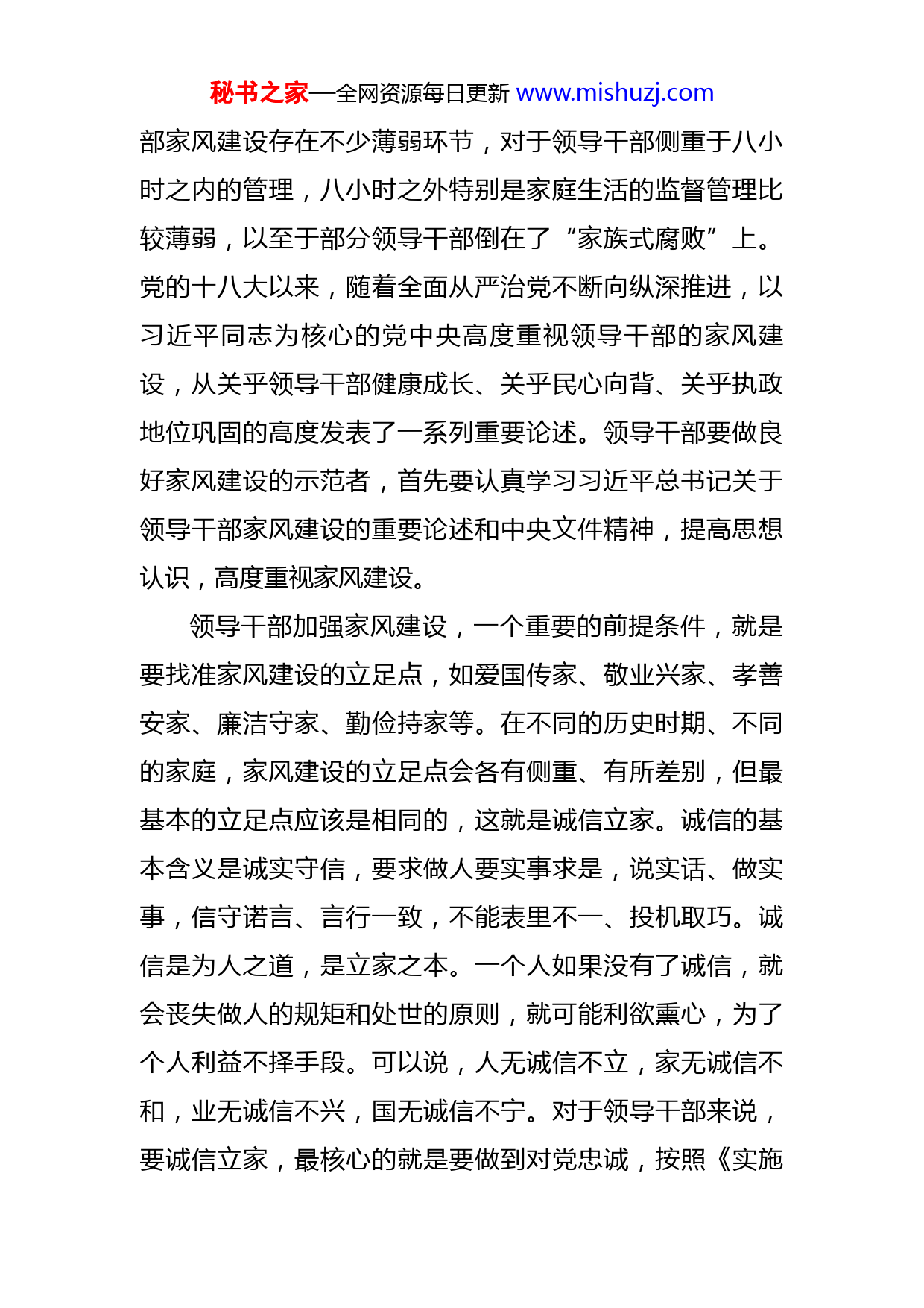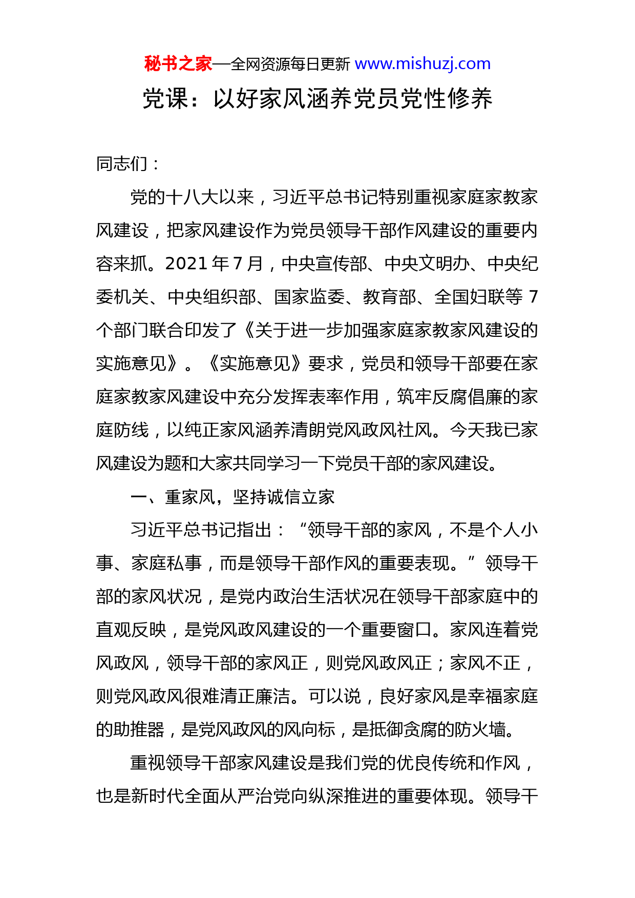 秘书之家—全网资源每日更新www.mishuzj.com党课:以好家风涵养党员党性修养同志们:党的十八大以来,习近平总书记特别重视家庭家教家风建设,把家风建设作为党员领导干部作风建设的重要内容来抓。2021年7月,中央宣传部、中央文明办、中央纪委机关、中央组织部、国家监委、教育部、全国妇联等7个部门联合印发了《关于进一步加强家庭家教家风建设的实施意见》。《实施意见》要求,党员和领导干部要在家庭家教家风建设中充分发挥表率作用,筑牢反腐倡廉的家庭防线,以纯正家风涵养清朗党风政风社风。今天我已家风建设为题和大家共同学习一下党员干部的家风建设。一、重家风,坚持诚信立家习近平总书记指出:“领导干部的家风,不是个人小事、家庭私事,而是领导干部作风的重要表现。”领导干部的家风状况,是党内政治生活状况在领导干部家庭中的直观反映,是党风政风建设的一个重要窗口。家风连着党风政风,领导干部的家风正,则党风政风正;家风不正,则党风政风很难清正廉洁。可以说,良好家风是幸福家庭的助推器,是党风政风的风向标,是抵御贪腐的防火墙。重视领导干部家风建设是我们党的优良传统和作风,也是新时代全面从严治党向纵深推进的重要体现。领导干秘书之家—全网资源每日更新www.mishuzj.com部家风建设存在不少薄弱环节,对于领导干部侧重于八小时之内的管理,八小时之外特别是家庭生活的监督管理比较薄弱,以至于部分领导干部倒在了“家族式腐败”上。党的十八大以来,随着全面从严治党不断向纵深推进,以习近平同志为核心的党中央高度重视领导干部的家风建设,从关乎领导干部健康成长、关乎民心向背、关乎执政地位巩固的高度发表了一系列重要论述。领导干部要做良好家风建设的示范者,首先要认真学习习近平总书记关于领导干部家风建设的重要论述和中央文件精神,提高思想认识,高度重视家风建设。领导干部加强家风建设,一个重要的前提条件,就是要找准家风建设的立足点,如爱国传家、敬业兴家、孝善安家、廉洁守家、勤俭持家等。在不同的历史时期、不同的家庭,家风建设的立足点会各有侧重、有所差别,但最基本的立足点应该是相同的,这就是诚信立家。诚信的基本含义是诚实守信,要求做人要实事求是,说实话、做实事,信守诺言、言行一致,不能表里不一、投机取巧。诚信是为人之道,是立家之本。一个人如果没有了诚信,就会丧失做人的规矩和处世的原则,就可能利欲熏心,为了个人利益不择手段。可以说,人无诚信不立,家无诚信不和,业无诚信不兴,国无诚信不宁。对于领导干部来说,要诚信立家,最核心的就是要做到对党忠诚,按照《实施秘书之家—全网资源每日更新www.mishuzj.com意见》的要求,带头“把对党忠诚纳入党员干部家庭家教家风建设”,坚决做到“两个维护”,听党话、感党恩、跟党走,任何时候都能做到知行合一,在思想上政治上行动上自觉与党中央保持高度一致,决不当“两面人”。二、树政德,坚持修身齐家欲影正者端其表,欲下廉者先之身。俗语说:上梁不正下梁歪。领导干部既是家庭的重要成员,又直接掌握一定的公权力,这就决定了在家风建设中领导干部处于关键地位,领导干部自身的修养高低会直接影响家风的好坏。如果领导干部有好的作风,清正廉洁、一身正气,坚持原则、不徇私情,就能理直气壮地严格要求家人,那么家人就会看在眼里记在心上,不敢随意滥用领导干部手中的权力及其影响去谋取私利;如果领导干部自身不正,为政不端、贪腐无厌,那么怎么能够管得住家人,家人只会跟着学,甚至变本加厉。从近年来查处的一系列典型案例来看,“一人不廉,全家不廉”的反面典型不在少数。所以,抓好家风建设,领导干部必须率先垂范,给家人作出表率,做到从严治家。领导干部要修身正己、以身作则,必须带头加强自身道德品质特别是政德的修养,做到以德修身、以德立威、以德服众。如何加强政德修养?习近平总书记指出:“领导干部要讲政德,政德是整个社会道德建设的风向标。立秘书之家—全网资源每日更新www.mishuzj.com政德,就要明大德、守公德、严私德。”明大德,就是要铸牢理想信念、锤炼坚强党性,在大是大非面前旗帜鲜明,在风浪考验面前无所畏惧,在各种诱惑面前立场坚定。守公德,就是要强化宗旨意识,恪守立党为公、执政为民理念,自觉践行人民对美好生活的向往就是我们的奋斗目标的承诺,做到心底无私天地宽。严私德,就是要严格约束自己的操守和行为,廉洁自律、克己奉公,切实把人民赋予的权力用来造福于人民。只有树立了正确的政德观,才能做到“心不动于微利之诱,目不眩于五色之惑”,摆正位置、端正心态,公道正派、公平正直,走得正、行得端,不搞歪门邪道,不耍小聪明,不玩小把戏,不拉帮结派。在改革开放和市场经济条件下,如何加强政德修养是一个重大课题。领导干部或多或少掌握着各种权力,面临着形形色色的诱惑,是被“围猎”的对象,稍有不慎便会落入别有用心的人设计的圈套之中。因此,各级领导干部应坚持以身作则,慎始慎终、慎独慎微,洁身自好、清正廉洁,以自己的良好作风影响带动家人,形成良好的家风。三、严家教,坚持从严治家部分领导干部家风不正的一个突出表现,就在于没有从严管好家人,以至于家人利用其手中的权力和影响搞