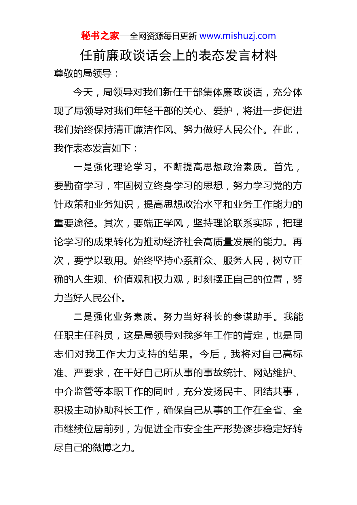 秘书之家—全网资源每日更新www.mishuzj.com任前廉政谈话会上的表态发言材料尊敬的局领导:今天,局领导对我们新任干部集体廉政谈话,充分体现了局领导对我们年轻干部的关心、爱护,将进一步促进我们始终保持清正廉洁作风、努力做好人民公仆。在此,我作表态发言如下:一是强化理论学习,不断提高思想政治素质。首先,要勤奋学习,牢固树立终身学习的思想,努力学习党的方针政策和业务知识,提高思想政治水平和业务工作能力的重要途径。其次,要端正学风,坚持理论联系实际,把理论学习的成果转化为推动经济社会高质量发展的能力。再次,要学以致用。始终坚持心系群众、服务人民,树立正确的人生观、价值观和权力观,时刻摆正自己的位置,努力当好人民公仆。二是强化业务素质,努力当好科长的参谋助手。我能任职主任科员,这是局领导对我多年工作的肯定,也是同志们对我工作大力支持的结果。今后,我将对自己高标准、严要求,在干好自己所从事的事故统计、网站维护、中介监管等本职工作的同时,充分发扬民主、团结共事,积极主动协助科长工作,确保自己从事的工作在全省、全市继续位居前列,为促进全市安全生产形势逐步稳定好转尽自己的微博之力。秘书之家—全网资源每日更新www.mishuzj.com三是强化作风养成,自觉遵守各项规章制度。“无规矩无以成方圆”。我将自觉遵守党的纪律和国家法律法规,严格执行机关各项规章制度。坚持原则,秉公办事,决不以手中的权力谋取任何私利;严于利己,宽以待人,广泛听取各方面的意见和建议,虚心接受批评意见,不断改进工作作风;认真发扬艰苦奋斗、勤俭节约的精神,自觉抵制享乐主义和奢靡之风,反对铺张浪费;坚持自觉、自醒、自警、自励,保持高尚的精神追求和健康的生活情趣,自觉抵制各种腐朽的思想观念的侵蚀,真正做到立党为公、执政为民,永葆共产党员的政治本色。