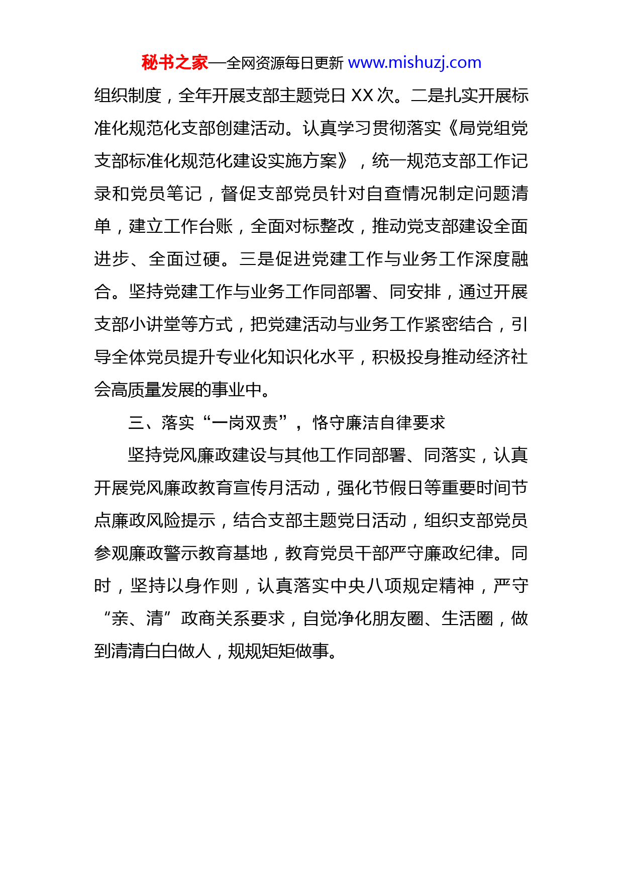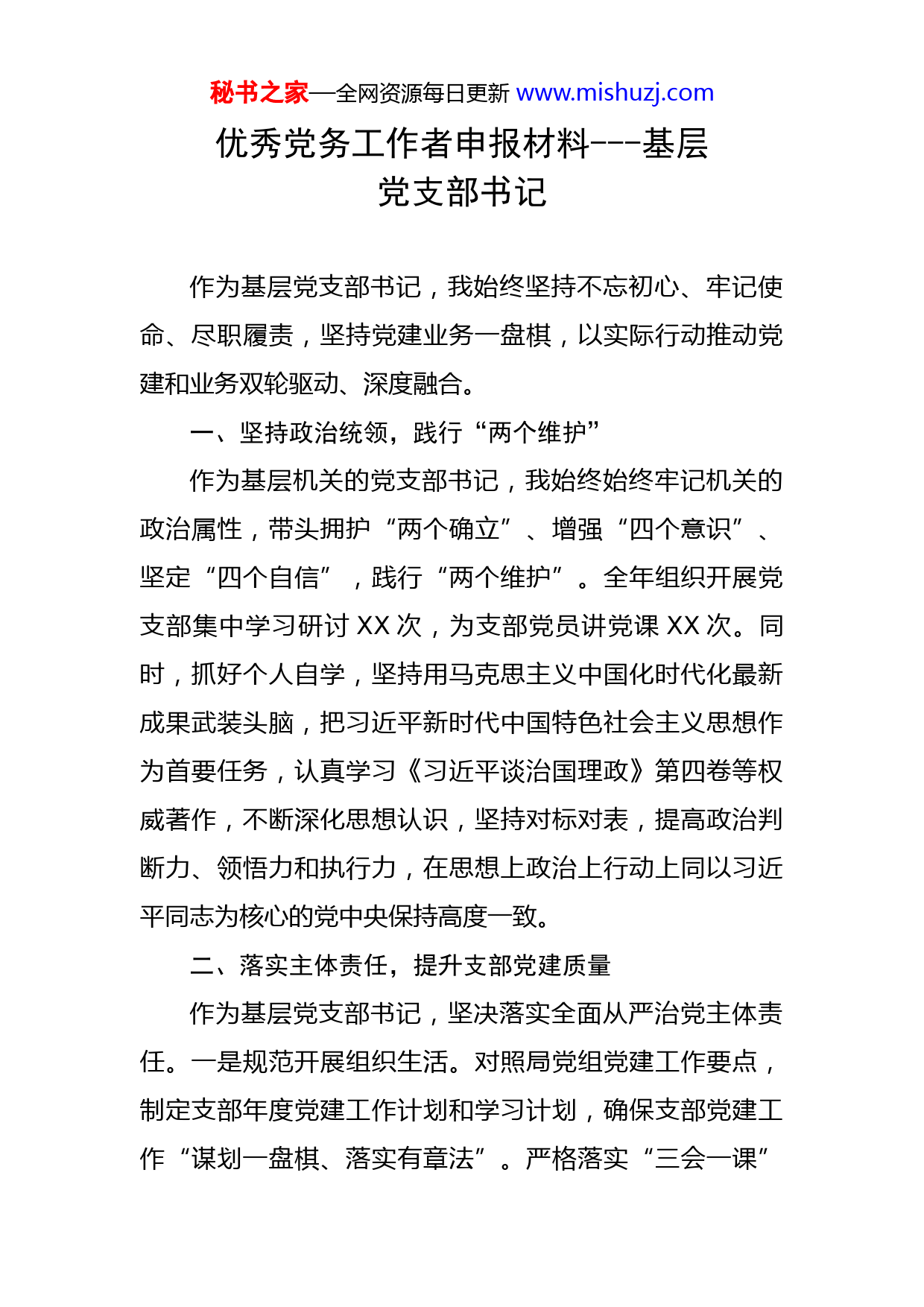 秘书之家—全网资源每日更新www.mishuzj.com优秀党务工作者申报材料---基层党支部书记作为基层党支部书记,我始终坚持不忘初心、牢记使命、尽职履责,坚持党建业务一盘棋,以实际行动推动党建和业务双轮驱动、深度融合。一、坚持政治统领,践行“两个维护”作为基层机关的党支部书记,我始终始终牢记机关的政治属性,带头拥护“两个确立”、增强“四个意识”、坚定“四个自信”,践行“两个维护”。全年组织开展党支部集中学习研讨XX次,为支部党员讲党课XX次。同时,抓好个人自学,坚持用马克思主义中国化时代化最新成果武装头脑,把习近平新时代中国特色社会主义思想作为首要任务,认真学习《习近平谈治国理政》第四卷等权威著作,不断深化思想认识,坚持对标对表,提高政治判断力、领悟力和执行力,在思想上政治上行动上同以习近平同志为核心的党中央保持高度一致。二、落实主体责任,提升支部党建质量作为基层党支部书记,坚决落实全面从严治党主体责任。一是规范开展组织生活。对照局党组党建工作要点,制定支部年度党建工作计划和学习计划,确保支部党建工作“谋划一盘棋、落实有章法”。严格落实“三会一课”秘书之家—全网资源每日更新www.mishuzj.com组织制度,全年开展支部主题党日XX次。二是扎实开展标准化规范化支部创建活动。认真学习贯彻落实《局党组党支部标准化规范化建设实施方案》,统一规范支部工作记录和党员笔记,督促支部党员针对自查情况制定问题清单,建立工作台账,全面对标整改,推动党支部建设全面进步、全面过硬。三是促进党建工作与业务工作深度融合。坚持党建工作与业务工作同部署、同安排,通过开展支部小讲堂等方式,把党建活动与业务工作紧密结合,引导全体党员提升专业化知识化水平,积极投身推动经济社会高质量发展的事业中。三、落实“一岗双责”,恪守廉洁自律要求坚持党风廉政建设与其他工作同部署、同落实,认真开展党风廉政教育宣传月活动,强化节假日等重要时间节点廉政风险提示,结合支部主题党日活动,组织支部党员参观廉政警示教育基地,教育党员干部严守廉政纪律。同时,坚持以身作则,认真落实中央八项规定精神,严守“亲、清”政商关系要求,自觉净化朋友圈、生活圈,做到清清白白做人,规规矩矩做事。