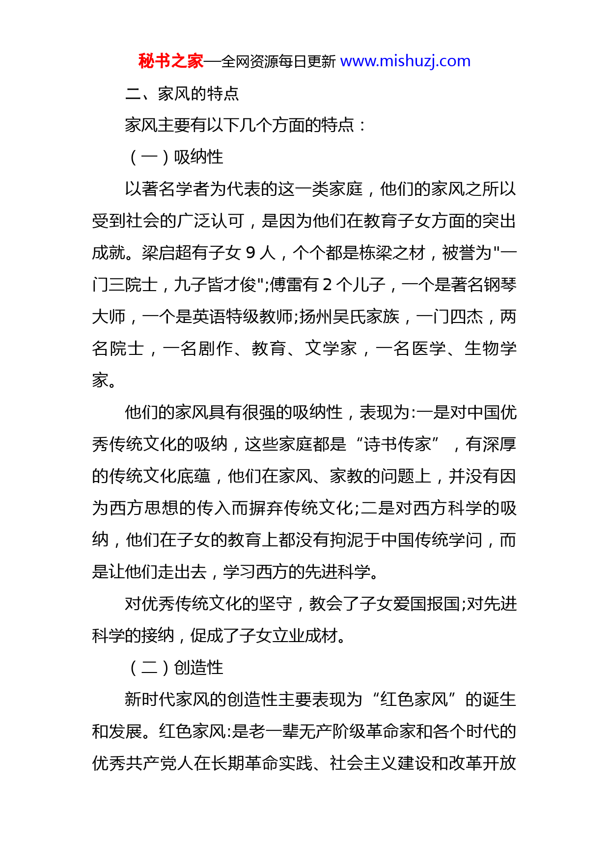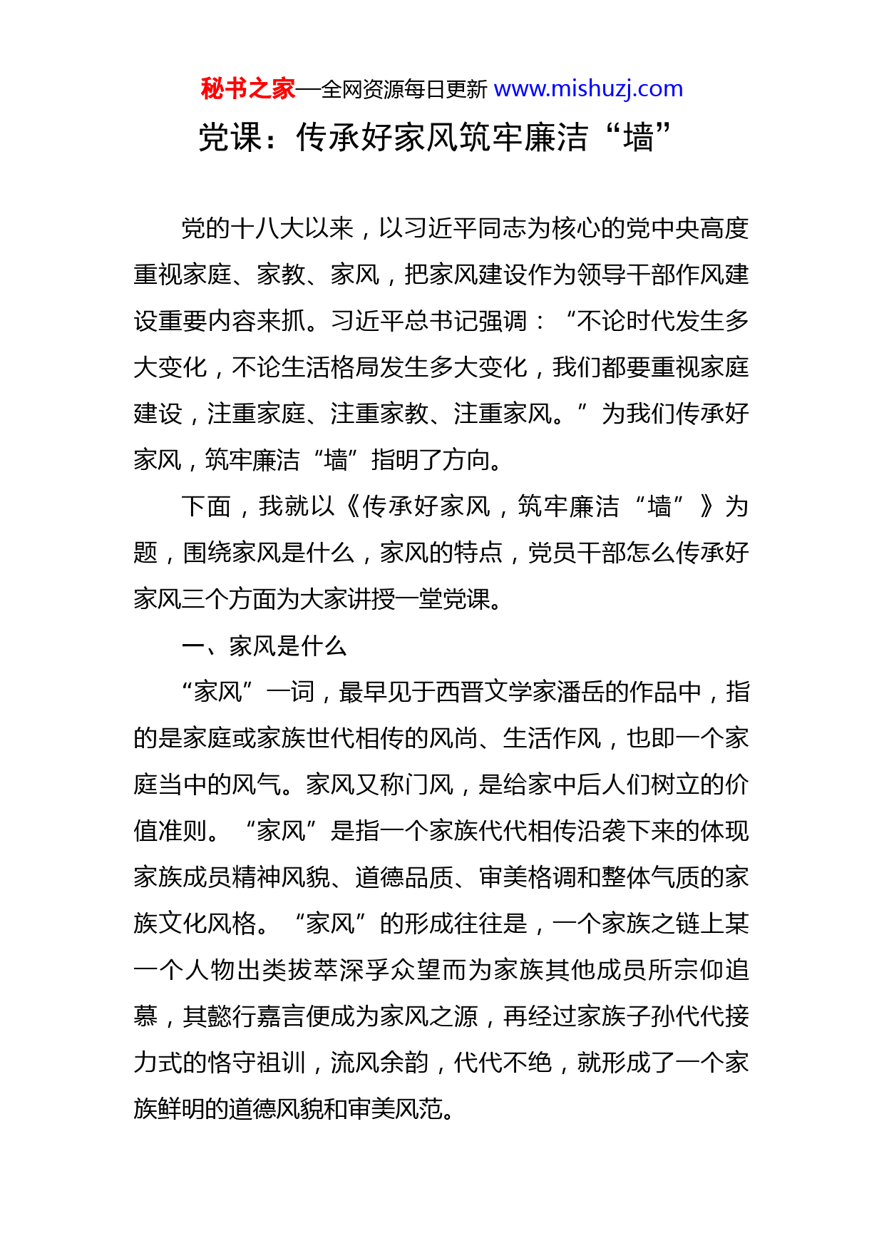 秘书之家—全网资源每日更新www.mishuzj.com党课:传承好家风筑牢廉洁“墙”党的十八大以来,以习近平同志为核心的党中央高度重视家庭、家教、家风,把家风建设作为领导干部作风建设重要内容来抓。习近平总书记强调:“不论时代发生多大变化,不论生活格局发生多大变化,我们都要重视家庭建设,注重家庭、注重家教、注重家风。”为我们传承好家风,筑牢廉洁“墙”指明了方向。下面,我就以《传承好家风,筑牢廉洁“墙”》为题,围绕家风是什么,家风的特点,党员干部怎么传承好家风三个方面为大家讲授一堂党课。一、家风是什么“家风”一词,最早见于西晋文学家潘岳的作品中,指的是家庭或家族世代相传的风尚、生活作风,也即一个家庭当中的风气。家风又称门风,是给家中后人们树立的价值准则。“家风”是指一个家族代代相传沿袭下来的体现家族成员精神风貌、道德品质、审美格调和整体气质的家族文化风格。“家风”的形成往往是,一个家族之链上某一个人物出类拔萃深孚众望而为家族其他成员所宗仰追慕,其懿行嘉言便成为家风之源,再经过家族子孙代代接力式的恪守祖训,流风余韵,代代不绝,就形成了一个家族鲜明的道德风貌和审美风范。秘书之家—全网资源每日更新www.mishuzj.com二、家风的特点家风主要有以下几个方面的特点:(一)吸纳性以著名学者为代表的这一类家庭,他们的家风之所以受到社会的广泛认可,是因为他们在教育子女方面的突出成就。梁启超有子女9人,个个都是栋梁之材,被誉为"一门三院士,九子皆才俊";傅雷有2个儿子,一个是著名钢琴大师,一个是英语特级教师;扬州吴氏家族,一门四杰,两名院士,一名剧作、教育、文学家,一名医学、生物学家。他们的家风具有很强的吸纳性,表现为:一是对中国优秀传统文化的吸纳,这些家庭都是“诗书传家”,有深厚的传统文化底蕴,他们在家风、家教的问题上,并没有因为西方思想的传入而摒弃传统文化;二是对西方科学的吸纳,他们在子女的教育上都没有拘泥于中国传统学问,而是让他们走出去,学习西方的先进科学。对优秀传统文化的坚守,教会了子女爱国报国;对先进科学的接纳,促成了子女立业成材。(二)创造性新时代家风的创造性主要表现为“红色家风”的诞生和发展。红色家风:是老一辈无产阶级革命家和各个时代的优秀共产党人在长期革命实践、社会主义建设和改革开放秘书之家—全网资源每日更新www.mishuzj.com历史进程中形成的家庭风尚,是中国共产党人精神和优良传统的重要组成部分。红色家风是建立在马克思主义基础上的,这就从根本上区别于著名学者类。马克思主义家庭观具有强烈的阶级性和革命性,家庭成员之间是完全平等的关系,血缘和情感是家庭关系维系的基础。马克思主义有“中国化”的问题,红色家风的诞生和发展也是中国革命和社会主义建设的产物,这体现在三个方面。首先,红色家风的创造者是中国共产党老一辈无产阶级革命家,他们是土生土长的中国人,在中国传统文化的教育下长大,传统文化植根于他们的价值观之中。其次,老一辈无产阶级革命家接受了马克思主义思想,并将其基本原理与中国革命的实践相结合,在这一过程中,他们对马克思主义有了新的创造性的发展。再次,通过对革命斗争和社会主义建设的经验总结,批判地融入中国传统文化中优秀的价值取向,形成了以爱党爱国、坚定信仰、忠贞不渝、严守纪律、清正廉洁、律己律家为内核的红色家风。红色家风在不同的家庭有着不同的表现形式,比如周恩来同志拟定过“十条家规”,陈云同志为亲人定下了“三不准”,习仲勋同志教育子女要“勤俭持家、低调做秘书之家—全网资源每日更新www.mishuzj.com人”等。(三)创新性社会主义核心价值体系与社会主义核心价值观的提出,是新时代家风创新性的来源。在中国共产党领导下,走中国特色社会主义道路,实现中华民族的伟大复兴,是现阶段中国各族人民的共同理想。家庭培养的不仅仅是继承者,更是共产主义事业的建设者和接班人。中国共产党作为执政党,党员的家风建设也从家庭层面上升到政党建设和国家层面。《中国共产党党员领导干部廉洁从政若干准则》《领导干部个人事项报告》《中国共产党廉洁自律准则》《中国共产党纪律处分条例》等制度,更是从根本上对党员的家风建设进行了规范。中国历史上的任何一个时期都不曾像今天这样注重家风建设,家风与政风、党风一起构成了当下中国的社会风气。三、党员干部怎样传承好家风党员领导干部的家风,不是自家小事、私事,它代表着党和政府的形象。良好的家风为社会树立正面的榜样,促进社会发展进步;反之,则对社会产生负面作用,损坏党和政府的声誉,破坏党群关系,使党风受到影响。作为一名党员领导干部要传承好家风,筑牢廉洁“墙”,主要从以下三个方面着手:秘书之家—全网资源每日更新www.mishuzj.com(一)要以身作则、率先垂范“其身正,不令而行;其身不正,虽令不从。”树立良好家风,党员干部自身是根本因素。家庭是人生的第一个课堂,父母是孩子最好的老师,党员干部是家人身边的榜样。当好孩子的老师、家人的榜样,不仅要重言传,更要重身教。党员干部只有自己行得端、做得正,始终做到言行一致、表里如一,真正起到模范带头作用,其言行才能有威信,才会对家人具