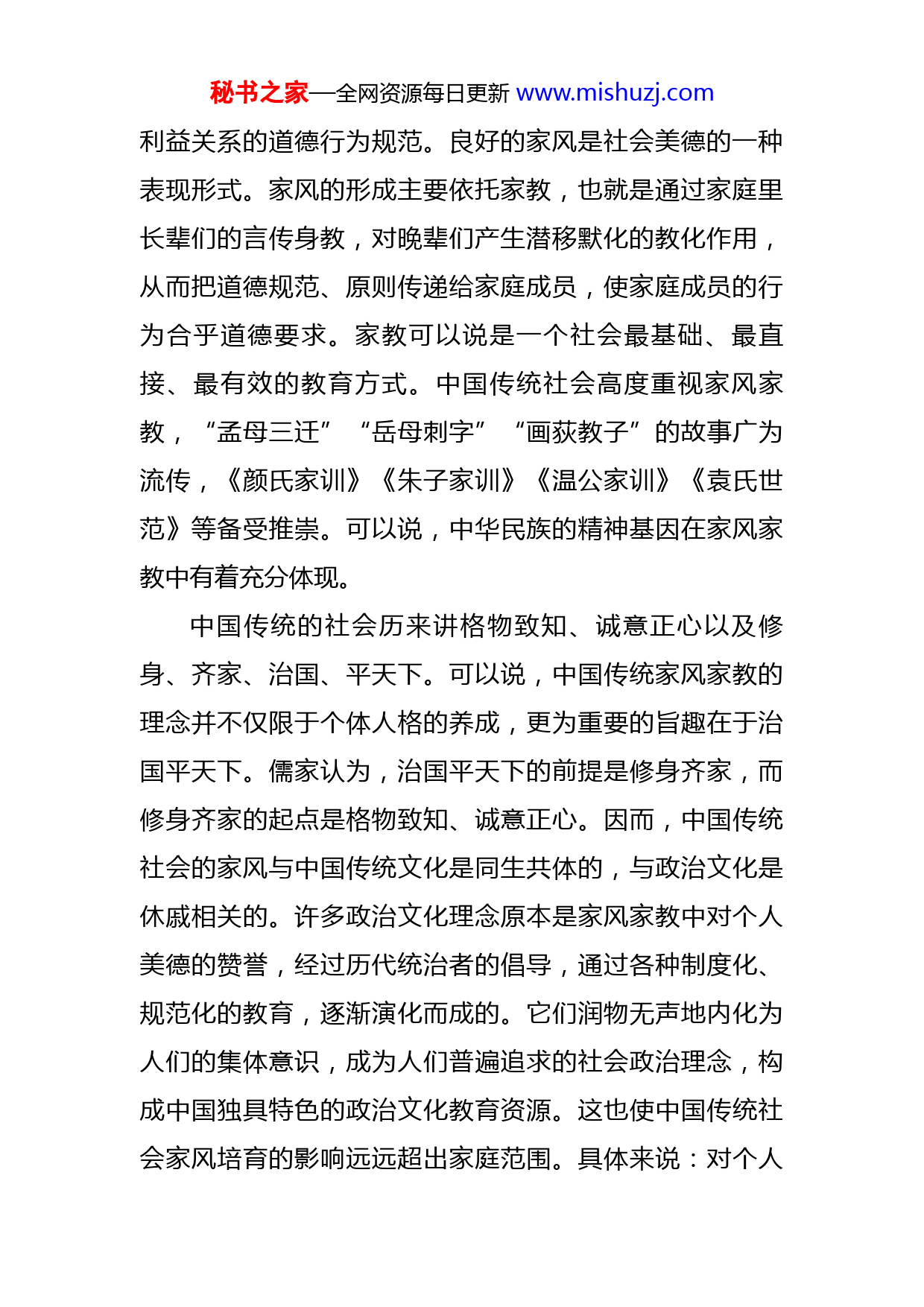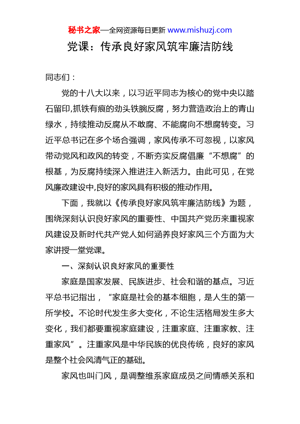 秘书之家—全网资源每日更新www.mishuzj.com党课:传承良好家风筑牢廉洁防线同志们:党的十八大以来,以习近平同志为核心的党中央以踏石留印,抓铁有痕的劲头铁腕反腐,努力营造政治上的青山绿水,持续推动反腐从不敢腐、不能腐向不想腐转变。习近平总书记在多个场合强调,家风传承不可忽视,以家风带动党风和政风的转变,不断夯实反腐倡廉“不想腐”的根基,为反腐持续深入推进注入新活力。由此可见,在党风廉政建设中,良好的家风具有积极的推动作用。下面,我就以《传承良好家风筑牢廉洁防线》为题,围绕深刻认识良好家风的重要性、中国共产党历来重视家风建设及新时代共产党人如何涵养良好家风三个方面为大家讲授一堂党课。一、深刻认识良好家风的重要性家庭是国家发展、民族进步、社会和谐的基点。习近平总书记指出,“家庭是社会的基本细胞,是人生的第一所学校。不论时代发生多大变化,不论生活格局发生多大变化,我们都要重视家庭建设,注重家庭、注重家教、注重家风”。注重家风是中华民族的优良传统,良好的家风是整个社会风清气正的基础。家风也叫门风,是调整维系家庭成员之间情感关系和秘书之家—全网资源每日更新www.mishuzj.com利益关系的道德行为规范。良好的家风是社会美德的一种表现形式。家风的形成主要依托家教,也就是通过家庭里长辈们的言传身教,对晚辈们产生潜移默化的教化作用,从而把道德规范、原则传递给家庭成员,使家庭成员的行为合乎道德要求。家教可以说是一个社会最基础、最直接、最有效的教育方式。中国传统社会高度重视家风家教,“孟母三迁”“岳母刺字”“画荻教子”的故事广为流传,《颜氏家训》《朱子家训》《温公家训》《袁氏世范》等备受推崇。可以说,中华民族的精神基因在家风家教中有着充分体现。中国传统的社会历来讲格物致知、诚意正心以及修身、齐家、治国、平天下。可以说,中国传统家风家教的理念并不仅限于个体人格的养成,更为重要的旨趣在于治国平天下。儒家认为,治国平天下的前提是修身齐家,而修身齐家的起点是格物致知、诚意正心。因而,中国传统社会的家风与中国传统文化是同生共体的,与政治文化是休戚相关的。许多政治文化理念原本是家风家教中对个人美德的赞誉,经过历代统治者的倡导,通过各种制度化、规范化的教育,逐渐演化而成的。它们润物无声地内化为人们的集体意识,成为人们普遍追求的社会政治理念,构成中国独具特色的政治文化教育资源。这也使中国传统社会家风培育的影响远远超出家庭范围。具体来说:对个人秘书之家—全网资源每日更新www.mishuzj.com而言,良好家风家教具有使人安身立命、被社会所接纳的意义;对家族而言,良好家风家教具有荫泽后代、光宗耀祖的意义;对社会而言,良好家风家教具有使社会和谐稳定、有序发展的作用;对国家而言,良好家风家教具有礼治天下、约束为政者行为的功能。中国传统家风家教对于个人、家庭、社会和国家的发展都具有重要意义。二、中国共产党历来重视家风建设重视家风建设,是我们党的优良传统。许多老一辈无产阶级革命家,严于律己,从严治家,遵纪守法,自觉维护党和人民的利益,使亲属和身边工作人员不搞特殊化,以党的利益为重,建设良好家风,起到了很好的表率作用,受到了党和人民的好评。下面,我就举两个例子,大家来感受下,我们老一辈无产阶级革命家是如何重视家风建设的。事例1:周恩来的“十条家规”1968年,周恩来总理的一个侄女赴内蒙古插队,由于表现好,经当地群众推荐,应征参军。周恩来得知后说:“你参军虽然符合手续,但内蒙古那么多人,专挑上了你,还不是看在我们的面子上?我们不能搞特殊化,一点也不能搞。”周恩来还专门给相关同志提出:“你们再不把孩子退回去,我就下命令了。”这个侄女最终脱下军装,返回内蒙古草原插队劳动。临行时,周恩来说,我自秘书之家—全网资源每日更新www.mishuzj.com己没有孩子,但要教育侄子侄女走自己这一条路。事实上,早在新中国成立之初,因不少故乡亲友要谋求一官半职,周恩来总理就曾专门召集家庭会议,定下了“十条家规”:一、晚辈不准丢下工作专程来看望他,只能在出差顺路时去看看;二、来者一律住国务院招待所;三、一律到食堂排队买饭菜,有工作的自己买饭菜票,没工作的由总理代付伙食费;四、看戏以家属身份买票入场,不得用招待券;五、不许请客送礼;六、不许动用公家的汽车;七、凡个人生活上能做的事,不要别人代办;八、生活要艰苦朴素;九、在任何场合都不要说出与总理的关系,不要炫耀自己;十、不谋私利,不搞特殊化。作为国家的总理,管理着一个“大家”,他始终把自己当作人民的勤务员,以身作则,从自己做起,从自己家里做起,决不让亲属之事影响“大家”。周恩来总理的十条家规,不仅是对亲属的严格要求,更是培养干部家风的极好教材。它像一面镜子,告诫我们如何掌好权、用好权,如何过好权力关、亲情关。事例2:习仲勋的严格自律习仲勋严格的家教是众所周知的,他总是用自己的一言一行影响着家人。齐心回忆:“也许是仲勋打心眼儿里爱孩子的缘故,所以他特别重视从严要求和教育子女。”为了让子女从小养成独立的生活习惯,习仲勋让桥桥姐弟秘书之家—全网资源每日更新www.mishuzj.com四人