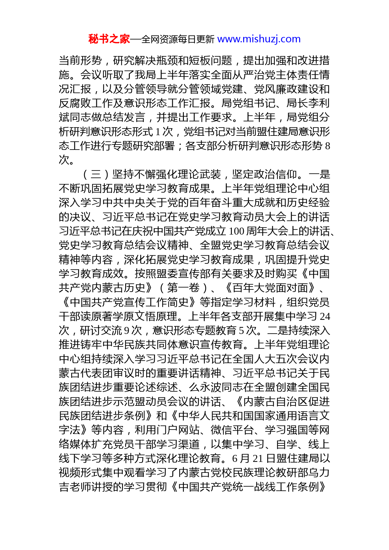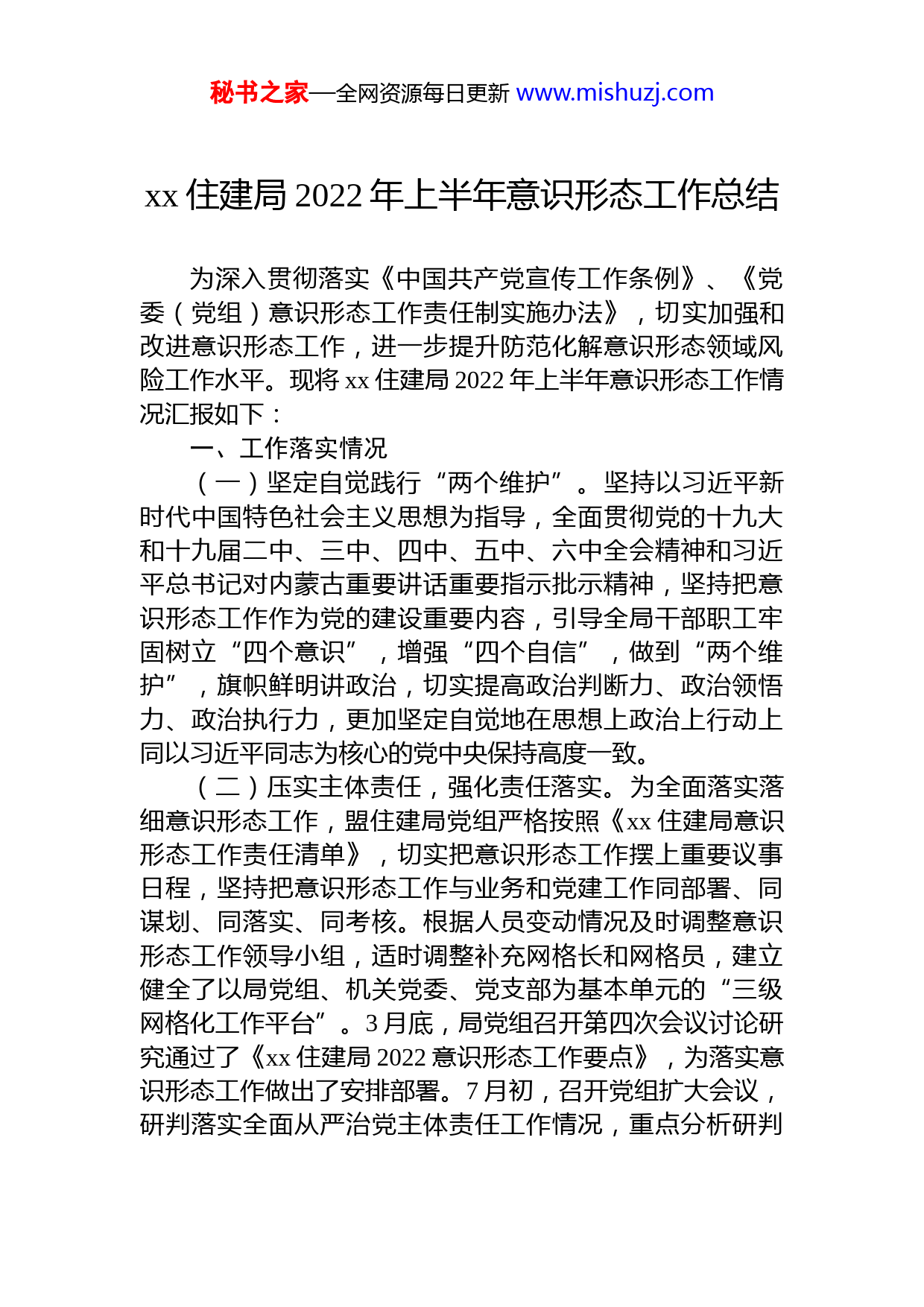 秘书之家—全网资源每日更新www.mishuzj.comxx住建局2022年上半年意识形态工作总结为深入贯彻落实《中国共产党宣传工作条例》、《党委(党组)意识形态工作责任制实施办法》,切实加强和改进意识形态工作,进一步提升防范化解意识形态领域风险工作水平。现将xx住建局2022年上半年意识形态工作情况汇报如下:一、工作落实情况(一)坚定自觉践行“两个维护”。坚持以习近平新时代中国特色社会主义思想为指导,全面贯彻党的十九大和十九届二中、三中、四中、五中、六中全会精神和习近平总书记对内蒙古重要讲话重要指示批示精神,坚持把意识形态工作作为党的建设重要内容,引导全局干部职工牢固树立“四个意识”,增强“四个自信”,做到“两个维护”,旗帜鲜明讲政治,切实提高政治判断力、政治领悟力、政治执行力,更加坚定自觉地在思想上政治上行动上同以习近平同志为核心的党中央保持高度一致。(二)压实主体责任,强化责任落实。为全面落实落细意识形态工作,盟住建局党组严格按照《xx住建局意识形态工作责任清单》,切实把意识形态工作摆上重要议事日程,坚持把意识形态工作与业务和党建工作同部署、同谋划、同落实、同考核。根据人员变动情况及时调整意识形态工作领导小组,适时调整补充网格长和网格员,建立健全了以局党组、机关党委、党支部为基本单元的“三级网格化工作平台”。3月底,局党组召开第四次会议讨论研究通过了《xx住建局2022意识形态工作要点》,为落实意识形态工作做出了安排部署。7月初,召开党组扩大会议,研判落实全面从严治党主体责任工作情况,重点分析研判秘书之家—全网资源每日更新www.mishuzj.com当前形势,研究解决瓶颈和短板问题,提出加强和改进措施。会议听取了我局上半年落实全面从严治党主体责任情况汇报,以及分管领导就分管领域党建、党风廉政建设和反腐败工作及意识形态工作汇报。局党组书记、局长李利斌同志做总结发言,并提出工作要求。上半年,局党组分析研判意识形态形式1次,党组书记对当前盟住建局意识形态工作进行专题研究部署;各支部分析研判意识形态形势8次。(三)坚持不懈强化理论武装,坚定政治信仰。一是不断巩固拓展党史学习教育成果。上半年党组理论中心组深入学习中共中央关于党的百年奋斗重大成就和历史经验的决议、习近平总书记在党史学习教育动员大会上的讲话习近平总书记在庆祝中国共产党成立100周年大会上的讲话、党史学习教育总结会议精神、全盟党史学习教育总结会议精神等内容,深化拓展党史学习教育成果,巩固提升党史学习教育成效。按照盟委宣传部有关要求及时购买《中国共产党内蒙古历史》(第一卷)、《百年大党面对面》、《中国共产党宣传工作简史》等指定学习材料,组织党员干部读原著学原文悟原理。上半年各支部开展集中学习24次,研讨交流9次,意识形态专题教育5次。二是持续深入推进铸牢中华民族共同体意识宣传教育。上半年党组理论中心组持续深入学习习近平总书记在全国人大五次会议内蒙古代表团审议时的重要讲话精神、习近平总书记关于民族团结进步重要论述综述、么永波同志在全盟创建全国民族团结进步示范盟动员会议的讲话、《内蒙古自治区促进民族团结进步条例》和《中华人民共和国国家通用语言文字法》等内容,利用门户网站、微信平台、学习强国等网络媒体扩充党员干部学习渠道,以集中学习、自学、线上线下学习等多种方式深化理论教育。6月21日盟住建局以视频形式集中观看学习了内蒙古党校民族理论教研部乌力吉老师讲授的学习贯彻《中国共产党统一战线工作条例》秘书之家—全网资源每日更新www.mishuzj.com盟住建局副处级以上领导、全体干部职工参会学习。6月底,党组理论中心组围绕铸牢中华民族共同体意识开展专题研讨。上半年各支部共开展铸牢中华民族共同体意识集中学习3次、专题讲座1次、专题研讨3次、主题党日活动2次。通过“互联网+民族政策宣传”,在民族政策宣传月集中宣传《中华人民共和国民族区域自治法》、《内蒙古自治区促进民族团结进步条例》等民族政策法规和《同心共筑中国梦》民族团结进步宣传片,深化民族团结进步教育,铸牢中华民族共同体意识。为深入贯彻落实习近平总书记关于加强和改进民族工作的重要思想,全面贯彻落实中央、自治区党委、盟委工作会议精神,以铸牢中华民族共同体意识为工作主线,扎实推进全国民族团结进步示范盟创建工作,结合盟住建局工作实际分别制定了《xx住建局铸牢中华民族共同体意识工作方案》和《xx住建局关于推进全国民族团结进步示范盟创建工作实施方案》。(四)筑牢宣传阵地,坚守意识形态防线。一是充分利用实体阵地和网络阵地,弘扬正能量。上半年组织全局广大党员干部以视频形式集中观看了《我国安全环境新变化》公益讲座和《<奋进新征程建功新时代>—2022年全国两会精神解读。5月份学习传达了内蒙古自治区党委保密委员会关于微信泄密专项整顿行动开展以来全区微信保密违法违规的案例,进一步增强干部职工的保密意识和网络安全意识。5月18日,盟住建局邀请盟国家保密局副局长王文胜同志开展以《泄密问题高发频发规律探究之我见》为题的保密工作专题培训,全体干部职工及保密工作相关人员