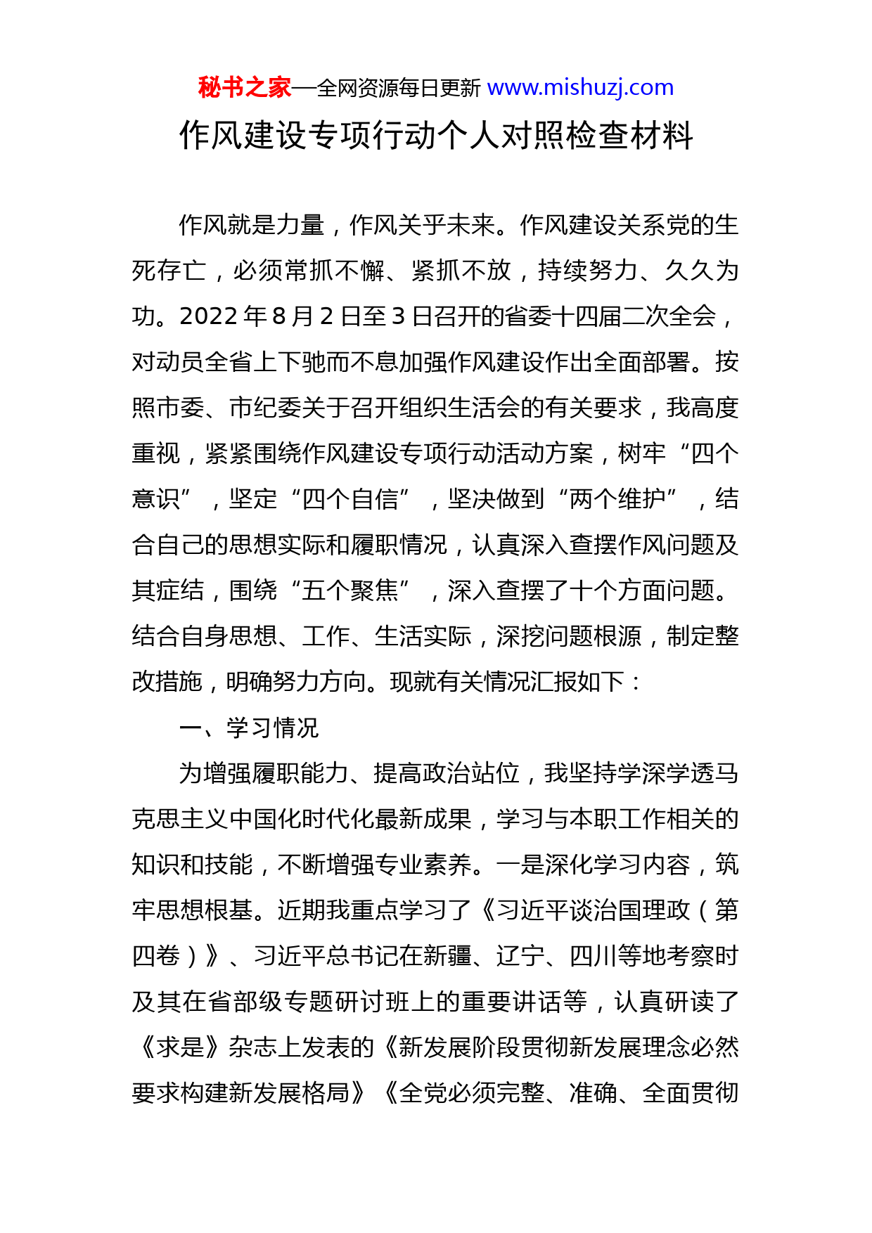秘书之家—全网资源每日更新www.mishuzj.com作风建设专项行动个人对照检查材料作风就是力量,作风关乎未来。作风建设关系党的生死存亡,必须常抓不懈、紧抓不放,持续努力、久久为功。2022年8月2日至3日召开的省委十四届二次全会,对动员全省上下驰而不息加强作风建设作出全面部署。按照市委、市纪委关于召开组织生活会的有关要求,我高度重视,紧紧围绕作风建设专项行动活动方案,树牢“四个意识”,坚定“四个自信”,坚决做到“两个维护”,结合自己的思想实际和履职情况,认真深入查摆作风问题及其症结,围绕“五个聚焦”,深入查摆了十个方面问题。结合自身思想、工作、生活实际,深挖问题根源,制定整改措施,明确努力方向。现就有关情况汇报如下:一、学习情况为增强履职能力、提高政治站位,我坚持学深学透马克思主义中国化时代化最新成果,学习与本职工作相关的知识和技能,不断增强专业素养。一是深化学习内容,筑牢思想根基。近期我重点学习了《习近平谈治国理政(第四卷)》、习近平总书记在新疆、辽宁、四川等地考察时及其在省部级专题研讨班上的重要讲话等,认真研读了《求是》杂志上发表的《新发展阶段贯彻新发展理念必然要求构建新发展格局》《全党必须完整、准确、全面贯彻秘书之家—全网资源每日更新www.mishuzj.com新发展理念》、习近平在上海合作组织成员国元首理事会上的重要讲话等文章,也通过人民日报、学习强国、微信公众号等媒体主动地学习了解党的最新精神。通过读原著、学原文、悟原理,我加深对习近平新时代中国特色社会主义思想和党的重大方针政策的理解,对党的性质、宗旨、指导思想、纲领、基本路线有了进一步的理解和认识,让我解放了思想,更新了观念,开阔了眼界,为政治上的坚定和成熟奠定了理论基础。二是创新学习方式,点亮党课形式。结合作风建设专项行动,开展党员轮流讲党课,先后开讲廉政党课:《夯实清正廉洁的思想根基、坚守清正廉洁的政治初心》以及学习《习近平谈治国理政》第四卷党课《坚持党的全面领导开创复兴历史伟业》。并结合自己的学习和实践体会,深入思考、联系实际,组织喜迎二十大演讲比赛;三是深化学习广度,提升队伍建设。2022年,先后组织单位党员干部实地调研学习共9次,组织班子集中学习30余次,党员干部集中学习52次,集中讨论9次。二、作风建设存在的问题(一)聚焦习近平总书记重要讲话重要指示和党中央决策部署,按照省第十四次党代会工作安排,深入查摆在学习贯彻上有没有领会不深、把握不准等问题,在工作落实中有没有打折扣、搞变通等问题;经过查摆,在工作落秘书之家—全网资源每日更新www.mishuzj.com实上往往是以会议传达会议、以讲话学习讲话、以文件落实文件,喜欢做表面文章,存在落实打折扣、搞变通的问题。理论学习上,仅限于形式上的学了,认为学习会议开了就学完了,没有在实践中检验到底学会了多少,领悟了多少,把握了多少。(二)聚焦高质量发展,深入查摆在思想观念上有没有因循守旧、固步自封等问题,在工作推动上有没有定力不够、韧劲不足、办法不多等问题。通过查摆我发现自己在思想观念上缺乏开拓创新意识,习惯于凭老经验、老办法处理问题,导致效果不理想,在推动工作上办法不多,总习惯于开会布置,布置之后就不管不顾,缺乏检查落实的力度。(三)聚焦群众的急难愁盼,深入查摆在为民服务上有没有敷衍了事、推诿扯皮等问题。通过查摆我发现自己在工作中只对自己分管的工作上心,遇到群众上访不属于自己分管部分的工作存在睁一只眼闭一只眼的麻痹心理,特别是反映一些不是单位职责范围内的问题,总是回避,有不想接,不敢接的思想。复杂困难的问题上有为难情绪,不敢迎难而上,没有那种舍我其谁的精神,在新的历史时期,当前人民群众对政府的服务要求是越来越高,在对群众的服务上只是被动的适应,没有认真的做过思考和做到怎样服务于前。秘书之家—全网资源每日更新www.mishuzj.com(四)聚焦防范化解重大风险,深入查摆在思想意识上有没有麻痹大意、消极应付等问题,在工作标准上有没有马虎草率、粗糙疏漏等问题。防范化解重大风险是我们三大攻坚战之一,虽然能够认识到防范化解重大风险的重要性,及时认真学习习近平总书记关于防范化解重大风险系列论述,但受社会大环境的影响,认为防范化解重大风险是党委政府的事情,机关做好及时监督就可以了。对自己的要求标准有所降低,导致在坚持意识思想、查找各种风险隐患,坚持底线思想、增强驾驭风险的本领等方面出现了差距。对待一些工作缺乏韧劲,缺乏攻坚克难精神,缺乏有效机制,缺乏一抓到底的决心。(五)聚焦加固中央八项规定堤坝、锲而不舍纠“四风”树新风,深入查摆在思想认识上有没有歇脚松劲、疲劳厌战等问题,在具体执行上有没有隐形变异、反弹回潮等问题。通过查摆,我发现自己没有深刻认识到中央解决”四风”问题的重要性和紧迫性,仍然存在应付、观望思想;有的对贯彻落实中央八项规定精神的长期性、艰巨性认识不足,时间一长就容易产生疲劳、松劲情绪,存在挺一阵子就过去了的想法,思想上行动上尚未达到自觉、自律的要求。三、产生问题的原因分析(一)政治素养标准不高。虽然在工作生活中,坚持秘书之家—全网资源每日