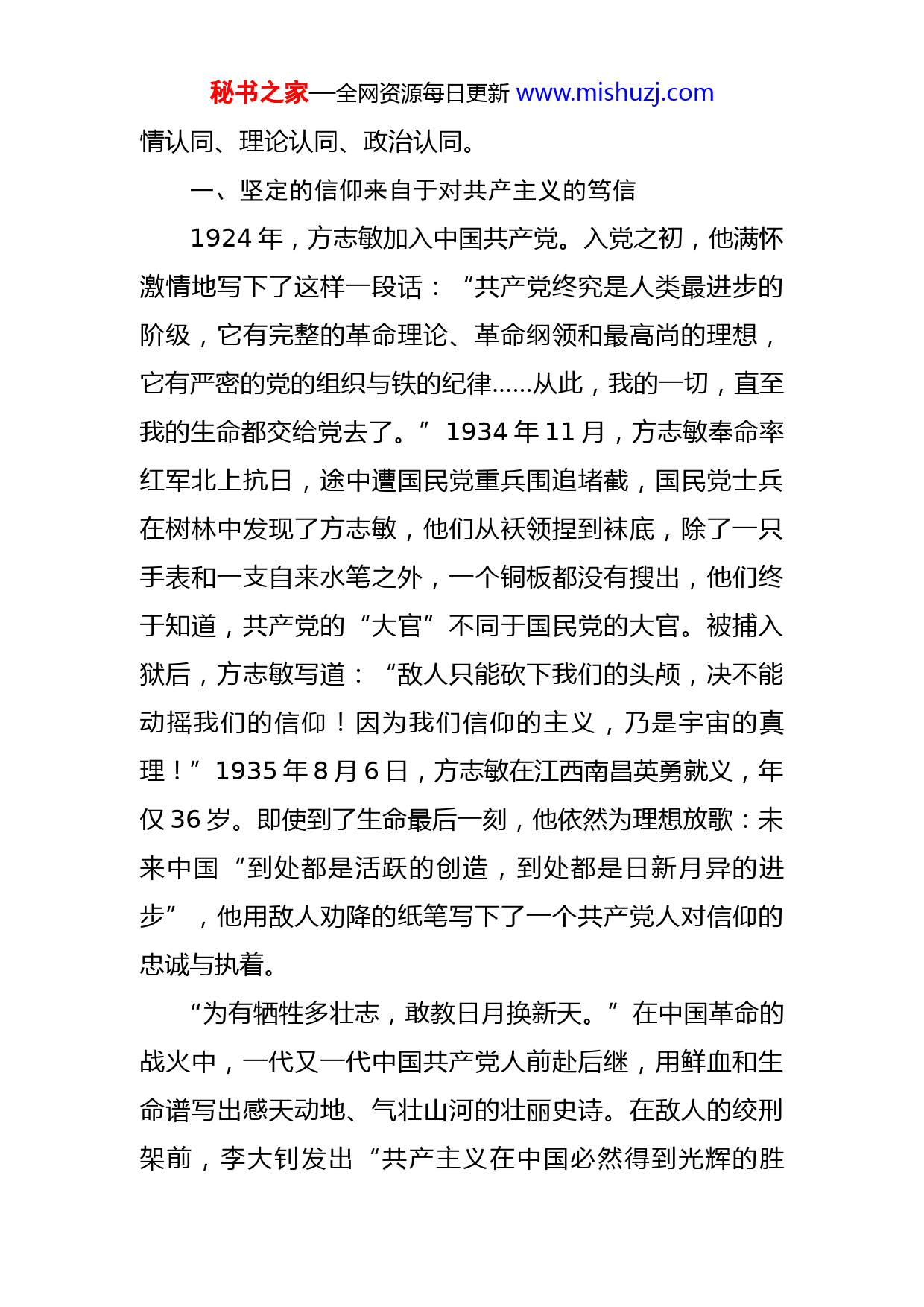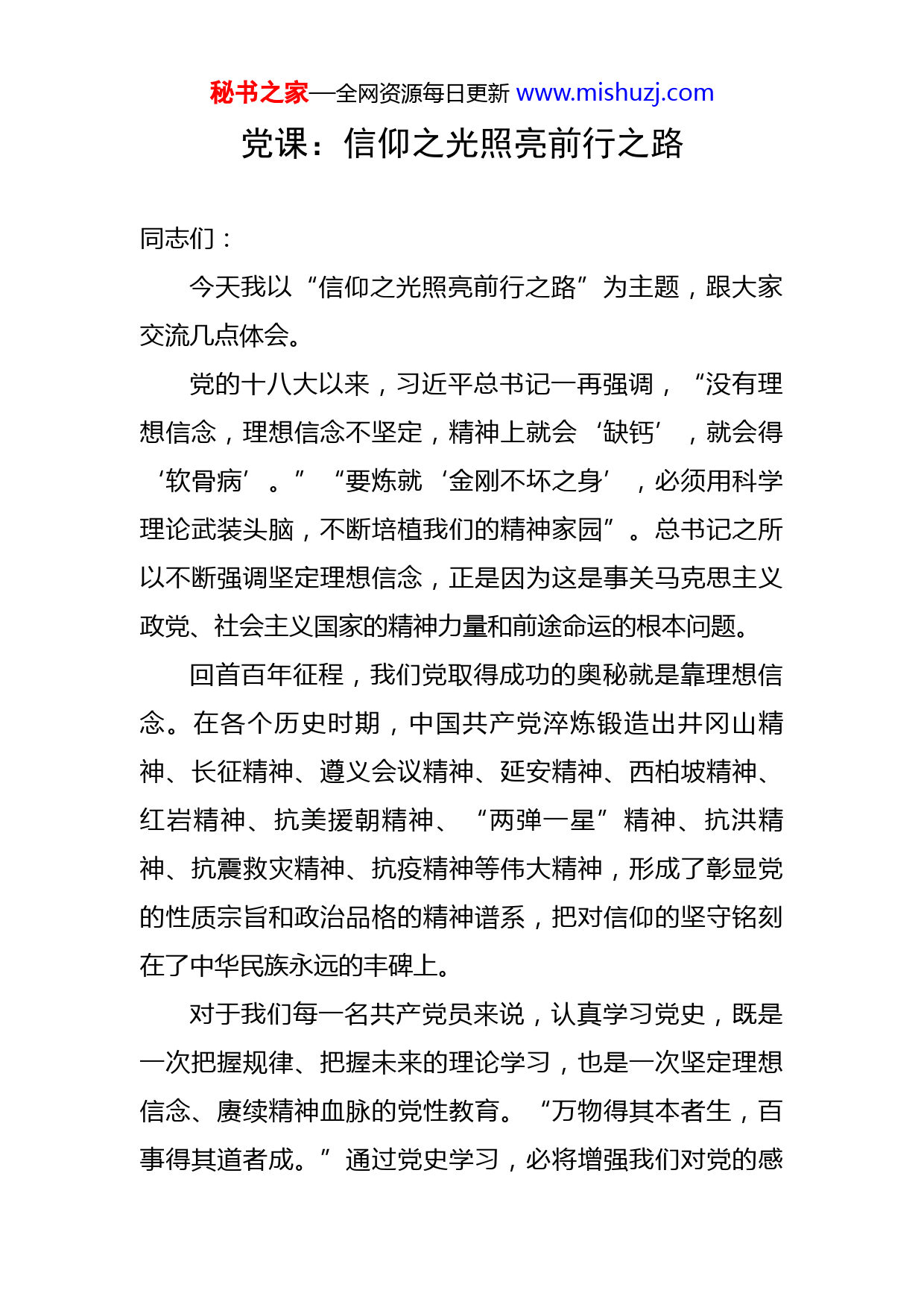 秘书之家—全网资源每日更新www.mishuzj.com党课:信仰之光照亮前行之路同志们:今天我以“信仰之光照亮前行之路”为主题,跟大家交流几点体会。党的十八大以来,习近平总书记一再强调,“没有理想信念,理想信念不坚定,精神上就会‘缺钙’,就会得‘软骨病’。”“要炼就‘金刚不坏之身’,必须用科学理论武装头脑,不断培植我们的精神家园”。总书记之所以不断强调坚定理想信念,正是因为这是事关马克思主义政党、社会主义国家的精神力量和前途命运的根本问题。回首百年征程,我们党取得成功的奥秘就是靠理想信念。在各个历史时期,中国共产党淬炼锻造出井冈山精神、长征精神、遵义会议精神、延安精神、西柏坡精神、红岩精神、抗美援朝精神、“两弹一星”精神、抗洪精神、抗震救灾精神、抗疫精神等伟大精神,形成了彰显党的性质宗旨和政治品格的精神谱系,把对信仰的坚守铭刻在了中华民族永远的丰碑上。对于我们每一名共产党员来说,认真学习党史,既是一次把握规律、把握未来的理论学习,也是一次坚定理想信念、赓续精神血脉的党性教育。“万物得其本者生,百事得其道者成。”通过党史学习,必将增强我们对党的感秘书之家—全网资源每日更新www.mishuzj.com情认同、理论认同、政治认同。一、坚定的信仰来自于对共产主义的笃信1924年,方志敏加入中国共产党。入党之初,他满怀激情地写下了这样一段话:“共产党终究是人类最进步的阶级,它有完整的革命理论、革命纲领和最高尚的理想,它有严密的党的组织与铁的纪律……从此,我的一切,直至我的生命都交给党去了。”1934年11月,方志敏奉命率红军北上抗日,途中遭国民党重兵围追堵截,国民党士兵在树林中发现了方志敏,他们从袄领捏到袜底,除了一只手表和一支自来水笔之外,一个铜板都没有搜出,他们终于知道,共产党的“大官”不同于国民党的大官。被捕入狱后,方志敏写道:“敌人只能砍下我们的头颅,决不能动摇我们的信仰!因为我们信仰的主义,乃是宇宙的真理!”1935年8月6日,方志敏在江西南昌英勇就义,年仅36岁。即使到了生命最后一刻,他依然为理想放歌:未来中国“到处都是活跃的创造,到处都是日新月异的进步”,他用敌人劝降的纸笔写下了一个共产党人对信仰的忠诚与执着。“为有牺牲多壮志,敢教日月换新天。”在中国革命的战火中,一代又一代中国共产党人前赴后继,用鲜血和生命谱写出感天动地、气壮山河的壮丽史诗。在敌人的绞刑架前,李大钊发出“共产主义在中国必然得到光辉的胜秘书之家—全网资源每日更新www.mishuzj.com利”的呐喊;在白色恐怖的阴影里,夏明翰喊出“砍头不要紧,只要主义真”后英勇就义;在血流成河的湘江两岸,红军师长陈树湘和战士们在“为苏维埃新中国流尽最后一滴血”后壮烈牺牲;在抗日敌后的林海雪原,杨靖宇在发出“我们中国人都投降了,还有中国吗?”的质问,孤身一人在绝粮数天后仍与日寇誓死抗争到底……他们的誓言,至今依然在我们耳畔回响。正是这样一位位坚守信仰、为国捐躯的英雄们,支撑着中国共产党从南湖到陕北,从延安窑洞到北京天安门,从井冈山的“星星之火”到全国革命的“燎原之势”,在中国最黑暗、最困难、最危险的时刻,用自己的灵魂和鲜血,挺起了中华民族的脊梁。2016年,习近平总书记在庆祝中国共产党成立95周年大会上重温了方志敏同志英勇就义前的豪迈誓言,并要求全党同志一定要铭记先烈们的遗愿,永志不忘他们为之流血牺牲的伟大理想。学习革命先烈们对信仰的坚守。这也更是要求我们传承红色基因,不忘初心、牢记使命,锤炼忠诚干净担当的政治品格,始终筑牢信仰之基、补足精神之钙、把稳思想之舵。二、坚定的信仰体现在舍生忘死的民族血性70年前,英雄的中国人民志愿军将士,高举保卫和平、反抗侵略的正义旗帜,同朝鲜人民和军队一道,历经秘书之家—全网资源每日更新www.mishuzj.com两年零九个月舍生忘死的浴血奋战,赢得了抗美援朝战争的伟大胜利。“雄赳赳,气昂昂,跨过鸭绿江。保和平,卫祖国,就是保家乡……”70年前,正是在这种坚不可摧的信仰力量鼓舞下,志愿军战士创造出一个又一个战争史上的奇迹。在炮火连天的上甘岭,黄继光舍身堵枪眼,为部队反击开辟胜利通道,让这里成为美军的“伤心岭”;在冰天雪地的长津湖,在牺牲前依然保持战斗姿势的“冰雕连”和他们的战友让美陆战1师经历了“陆战队史上最艰辛的磨难”;在火网密布的小高岭,杨根思在危急时刻抱起最后一包炸药冲向敌群,与敌同归于尽……在朝鲜战场上,志愿军先后涌现出30多万名英雄功臣和近6000个功臣集体,是他们用血肉之躯完成了“抗美援朝,保家卫国”的神圣职责,谱写了一曲荡气回肠的英雄赞歌。他们不愧为中华民族的英雄儿女,不愧为祖国安全和世界和平的坚强卫士,无愧于“最可爱的人”的光荣称号。志愿军司令彭德怀则自豪地向世界宣告:“西方侵略者几百年来只要在东方一个海岸上架起几尊大炮就可霸占一个国家的时代是一去不复返了。”习近平总书记在纪念中国人民志愿军抗美援朝出国作战7周年大会上指出:“经此一战,中国人民粉碎了侵略者陈兵国门、进而将新中国扼杀在摇篮之中的图谋,新中国真正站稳了脚跟。”而抗美援朝战争锻造形成的伟大抗秘书之家—全网资源每日更新ww