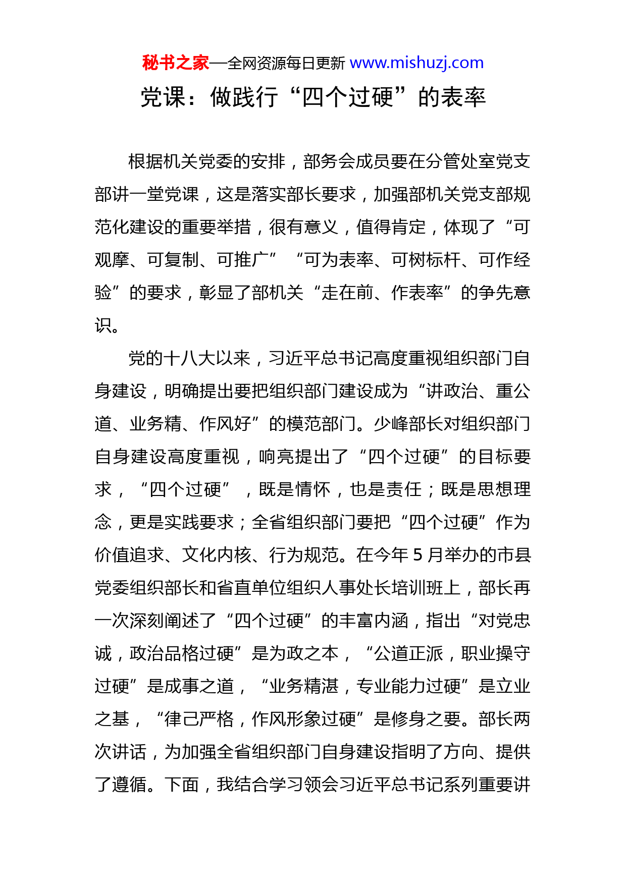 秘书之家—全网资源每日更新www.mishuzj.com党课:做践行“四个过硬”的表率根据机关党委的安排,部务会成员要在分管处室党支部讲一堂党课,这是落实部长要求,加强部机关党支部规范化建设的重要举措,很有意义,值得肯定,体现了“可观摩、可复制、可推广”“可为表率、可树标杆、可作经验”的要求,彰显了部机关“走在前、作表率”的争先意识。党的十八大以来,习近平总书记高度重视组织部门自身建设,明确提出要把组织部门建设成为“讲政治、重公道、业务精、作风好”的模范部门。少峰部长对组织部门自身建设高度重视,响亮提出了“四个过硬”的目标要求,“四个过硬”,既是情怀,也是责任;既是思想理念,更是实践要求;全省组织部门要把“四个过硬”作为价值追求、文化内核、行为规范。在今年5月举办的市县党委组织部长和省直单位组织人事处长培训班上,部长再一次深刻阐述了“四个过硬”的丰富内涵,指出“对党忠诚,政治品格过硬”是为政之本,“公道正派,职业操守过硬”是成事之道,“业务精湛,专业能力过硬”是立业之基,“律己严格,作风形象过硬”是修身之要。部长两次讲话,为加强全省组织部门自身建设指明了方向、提供了遵循。下面,我结合学习领会习近平总书记系列重要讲秘书之家—全网资源每日更新www.mishuzj.com话精神,就如何做到“四个过硬”,谈谈认识和体会,和大家一起作个交流。一、保持“三有”,做到政治品格过硬组织部门是政治机关,必须讲政治、懂政治,而且要反复讲,真正做。部长指出,政治品格过硬,就是要坚定理想信念,忠于党的信仰、忠于党的组织、忠于党的理论和路线方针政策,以对党忠诚之心,选好对党忠诚之人,尽到为党护党之责。做到政治品格过硬,要保持“三有”:第一,有坚定信念。俗话说“灯无油不亮、人无理想不发光”,有没有坚定的信念,人的精神状态不一样。习近平总书记把理想信念比作精神上的“钙”,把“信念坚定”作为好干部的第一条标准,并指出,“政治上不合格,经不起风浪,这样的干部能耐再大也不是我们党需要的好干部”。我们坚定信念,就要坚定道路自信、理论自信、制度自信、文化自信,习近平总书记在去年“七一讲话”中指出,坚持党的领导、走中国特色社会主义道路、独立自主实现国家发展的战略,都“必须长期坚持、永不动摇”;同时10次强调“不忘初心,继续前进”,永远保持马克思主义先进政党的赤子之心,是即将进入第二个百年的中国共产党人“精神之本、灵魂之根、生命之源”。作为组工干部,坚定理想信念,关键要对党的事业、对从秘书之家—全网资源每日更新www.mishuzj.com事的工作有信心,不被眼前的困难所吓到,不被社会的负面舆论所迷惑,更不能戏说“庄严”,调侃“崇高”,甘当群众的“尾巴”,不敢亮剑,成为“网络大V”的“信徒”,不去批驳。有时对社会上的种种现象,对社会腐败问题,要有正确的认知,“世界没你想象的那么好,也没你想象的那么坏”;又比如,我们的国家治理体系有待进一步完善,选人用人还有一定的改进空间,党的建设、组织工作、组织部门自身建设还存在一些需要解决的问题,等等,大家怎么看,在理论上必须清醒,不能在方向上出偏差。最近这次部里的干部人事调整,用一句话,可以说是“几家欢乐几家愁”,如果按资历,就是搞论资排辈、“吃大锅饭”,很难激发活力;现在适当打破一点资历,大家又觉得是否公平,甚至一部分人认为自己吃了亏,心绪不宁、焦灼难安。作为组织部的干部,同志们应该知道,越是这种关键的时候,越考验大家的政治意志、政治品质,不是在座的同志当不了处长、副处长,毕竟岗位资源有限,“需求”总是大于“供给”,大家要提高“政治站位”,站在部务会的高度来思考,这次调整统筹整个部里情况来考虑,兼顾到方方面面是有难度的,但“风物长宜放眼量”,组织对每个人肯定都是关心的。大家如果总觉得组织亏欠自己,心情忧愤,把这种情绪带到平时,既不利于工作,也不利于生活和身心健康。我们要有“板凳秘书之家—全网资源每日更新www.mishuzj.com要坐十年冷”“十年磨一剑”的精神,和谐自己的内心,保持“向前看”的状态,追求思想进步、能力进步,必然会伴随职务进步。第二,有对表意识。讲政治,最核心的是增强政治意识、大局意识、核心意识、看齐意识,自觉向党中央、向省委、向部务会看齐。正如部长强调的:“要无条件看齐”。习近平总书记在省部级领导干部专题研讨班上,讲了“十个面对”:“面对南海的局势,面对台海的局势,面对钓鱼岛事件,面对以美国为代表的西方对我们的种种限制、渗透,面对我们党内存在的突出问题”,面对这么多的困难和考验,全党必须讲政治,必须有坚强的领导核心。作为组工干部,必须增强“四个意识”,不仅要自己做到主动看齐,更要发挥组织工作的职能优势,教育引导广大党员干部坚决维护核心,经常主动全面地“看齐”。过去,我们在后备干部调研、市州班子换届考察、市厅级领导干部集中轮训过程中,主动对标中央的要求,取得了非常好的效果。大家不要认为“对表”是简单的模仿,在“对表”过程中,我们就会领悟到中央、省委的良苦用心,提升政治觉悟,增强政治定力。第三,有身份自觉。部长指出:“增强政治意识,不是空洞的说教,不是口头的表态,而是要落实到具体