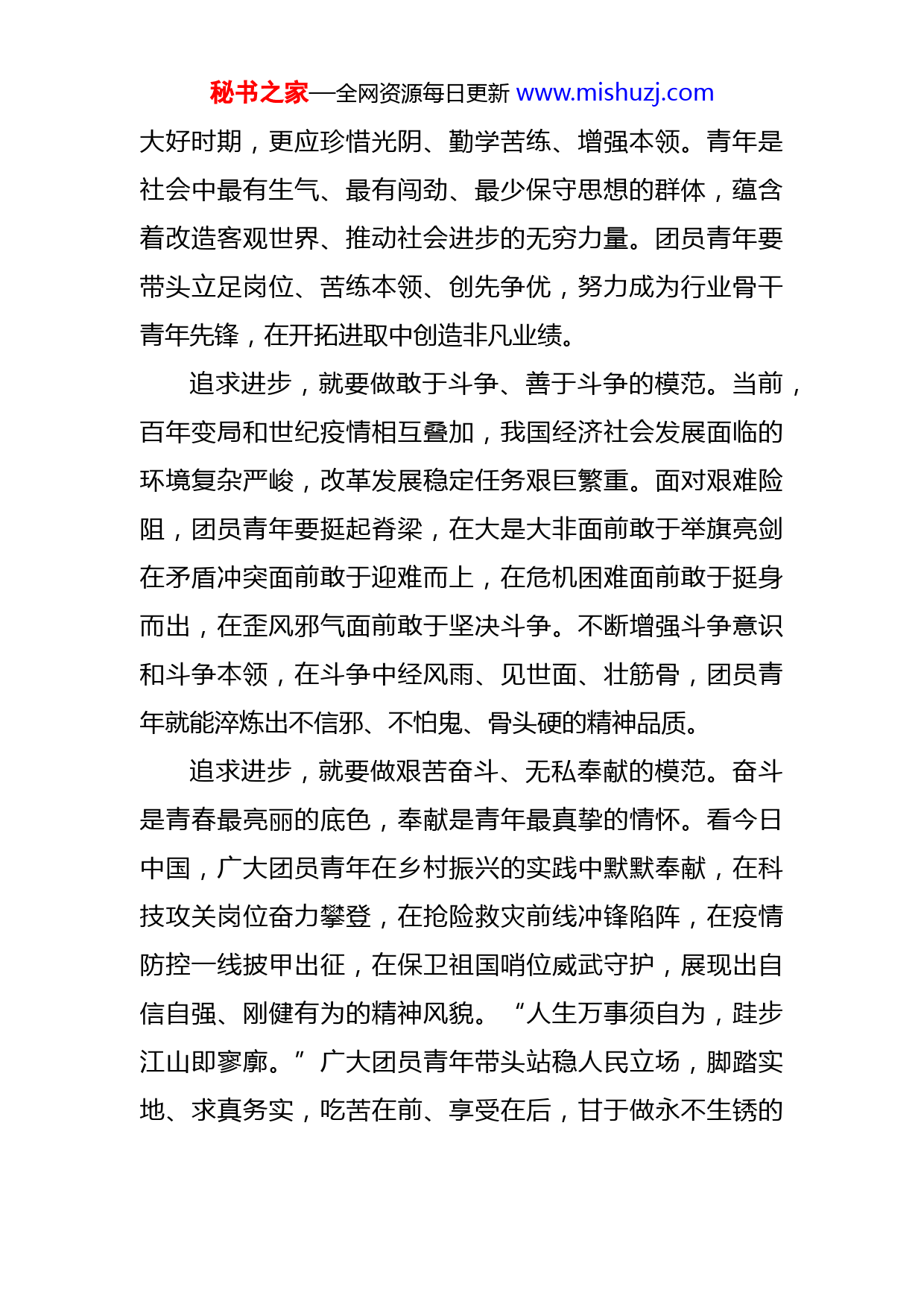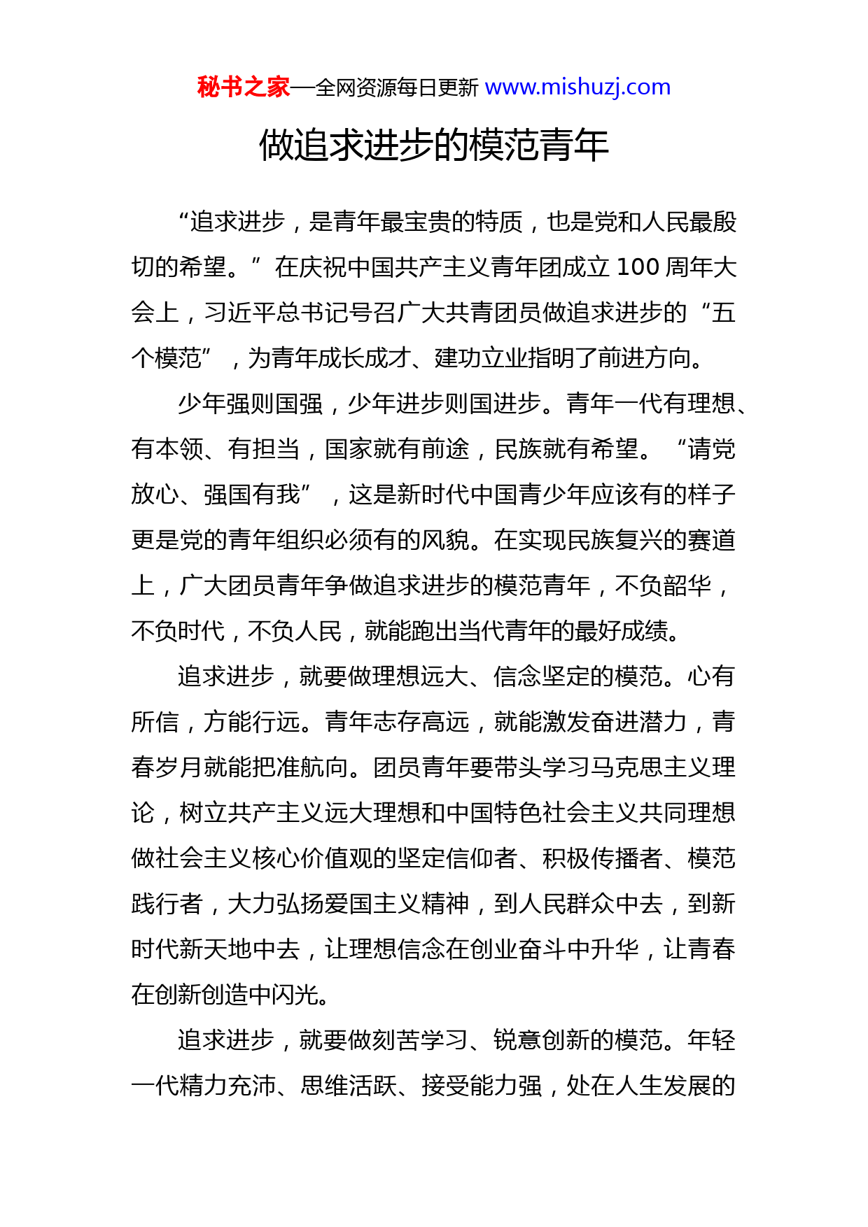 秘书之家—全网资源每日更新www.mishuzj.com做追求进步的模范青年“追求进步,是青年最宝贵的特质,也是党和人民最殷切的希望。”在庆祝中国共产主义青年团成立100周年大会上,习近平总书记号召广大共青团员做追求进步的“五个模范”,为青年成长成才、建功立业指明了前进方向。少年强则国强,少年进步则国进步。青年一代有理想、有本领、有担当,国家就有前途,民族就有希望。“请党放心、强国有我”,这是新时代中国青少年应该有的样子更是党的青年组织必须有的风貌。在实现民族复兴的赛道上,广大团员青年争做追求进步的模范青年,不负韶华,不负时代,不负人民,就能跑出当代青年的最好成绩。追求进步,就要做理想远大、信念坚定的模范。心有所信,方能行远。青年志存高远,就能激发奋进潜力,青春岁月就能把准航向。团员青年要带头学习马克思主义理论,树立共产主义远大理想和中国特色社会主义共同理想做社会主义核心价值观的坚定信仰者、积极传播者、模范践行者,大力弘扬爱国主义精神,到人民群众中去,到新时代新天地中去,让理想信念在创业奋斗中升华,让青春在创新创造中闪光。追求进步,就要做刻苦学习、锐意创新的模范。年轻一代精力充沛、思维活跃、接受能力强,处在人生发展的秘书之家—全网资源每日更新www.mishuzj.com大好时期,更应珍惜光阴、勤学苦练、增强本领。青年是社会中最有生气、最有闯劲、最少保守思想的群体,蕴含着改造客观世界、推动社会进步的无穷力量。团员青年要带头立足岗位、苦练本领、创先争优,努力成为行业骨干青年先锋,在开拓进取中创造非凡业绩。追求进步,就要做敢于斗争、善于斗争的模范。当前,百年变局和世纪疫情相互叠加,我国经济社会发展面临的环境复杂严峻,改革发展稳定任务艰巨繁重。面对艰难险阻,团员青年要挺起脊梁,在大是大非面前敢于举旗亮剑在矛盾冲突面前敢于迎难而上,在危机困难面前敢于挺身而出,在歪风邪气面前敢于坚决斗争。不断增强斗争意识和斗争本领,在斗争中经风雨、见世面、壮筋骨,团员青年就能淬炼出不信邪、不怕鬼、骨头硬的精神品质。追求进步,就要做艰苦奋斗、无私奉献的模范。奋斗是青春最亮丽的底色,奉献是青年最真挚的情怀。看今日中国,广大团员青年在乡村振兴的实践中默默奉献,在科技攻关岗位奋力攀登,在抢险救灾前线冲锋陷阵,在疫情防控一线披甲出征,在保卫祖国哨位威武守护,展现出自信自强、刚健有为的精神风貌。“人生万事须自为,跬步江山即寥廓。”广大团员青年带头站稳人民立场,脚踏实地、求真务实,吃苦在前、享受在后,甘于做永不生锈的秘书之家—全网资源每日更新www.mishuzj.com螺丝钉,就一定能成为走在时代前列的奋进者、开拓者、奉献者,用青春和汗水创造出让世界刮目相看的新奇迹。追求进步,就要做崇德向善、严守纪律的模范。人无德不立,品德是为人之本。团员青年要带头明大德、守公德、严私德,严格遵纪守法,严格履行团员义务,把正确的道德认知、自觉的道德养成、积极的道德实践紧密结合起来,不断修身立德,打牢道德根基,在人生道路上走得更正、走得更远。青年向上,国家向前。入队、入团、入党,是青年追求政治进步的“人生三部曲”,勾勒出青年健康成长、踔厉奋发的人生轨迹。广大青年坚定不移听党话、跟党走,与时代同步伐、与祖国共命运、与人民齐奋斗,必将成长为堪当民族复兴重任的时代新人,让青春在实现中国梦的伟大实践中绽放异彩。