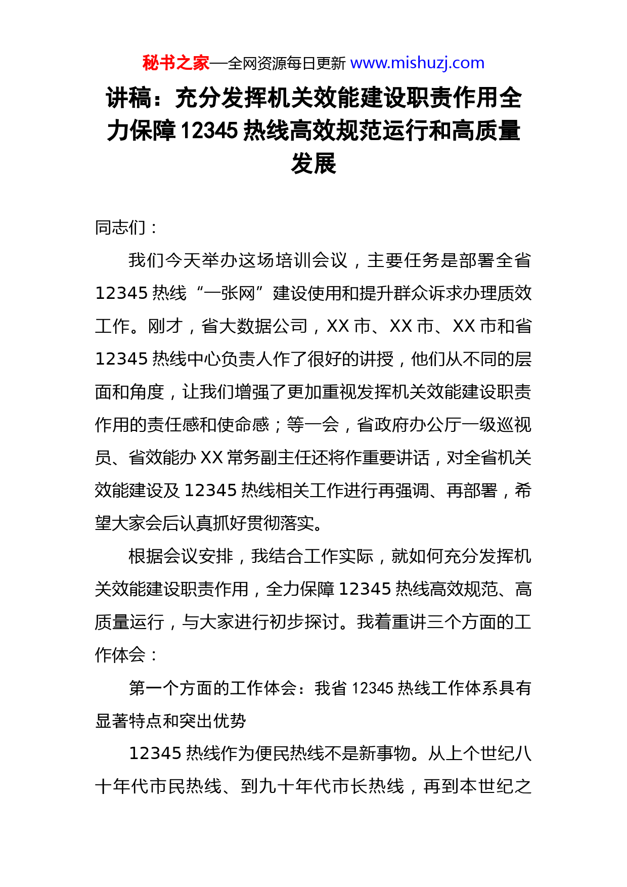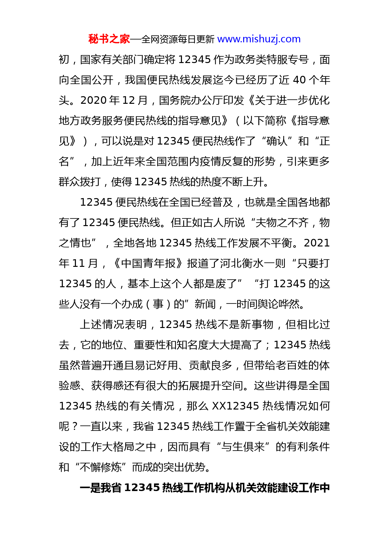 秘书之家—全网资源每日更新www.mishuzj.com讲稿:充分发挥机关效能建设职责作用全力保障12345热线高效规范运行和高质量发展同志们:我们今天举办这场培训会议,主要任务是部署全省12345热线“一张网”建设使用和提升群众诉求办理质效工作。刚才,省大数据公司,XX市、XX市、XX市和省12345热线中心负责人作了很好的讲授,他们从不同的层面和角度,让我们增强了更加重视发挥机关效能建设职责作用的责任感和使命感;等一会,省政府办公厅一级巡视员、省效能办XX常务副主任还将作重要讲话,对全省机关效能建设及12345热线相关工作进行再强调、再部署,希望大家会后认真抓好贯彻落实。根据会议安排,我结合工作实际,就如何充分发挥机关效能建设职责作用,全力保障12345热线高效规范、高质量运行,与大家进行初步探讨。我着重讲三个方面的工作体会:第一个方面的工作体会:我省12345热线工作体系具有显著特点和突出优势12345热线作为便民热线不是新事物。从上个世纪八十年代市民热线、到九十年代市长热线,再到本世纪之秘书之家—全网资源每日更新www.mishuzj.com初,国家有关部门确定将12345作为政务类特服专号,面向全国公开,我国便民热线发展迄今已经历了近40个年头。2020年12月,国务院办公厅印发《关于进一步优化地方政务服务便民热线的指导意见》(以下简称《指导意见》),可以说是对12345便民热线作了“确认”和“正名”,加上近年来全国范围内疫情反复的形势,引来更多群众拨打,使得12345热线的热度不断上升。12345便民热线在全国已经普及,也就是全国各地都有了12345便民热线。但正如古人所说“夫物之不齐,物之情也”,全地各地12345热线工作发展不平衡。2021年11月,《中国青年报》报道了河北衡水一则“只要打12345的人,基本上这个人都是废了”“打12345的这些人没有一个办成(事)的”新闻,一时间舆论哗然。上述情况表明,12345热线不是新事物,但相比过去,它的地位、重要性和知名度大大提高了;12345热线虽然普遍开通且易记好用、贡献良多,但带给老百姓的体验感、获得感还有很大的拓展提升空间。这些讲得是全国12345热线的有关情况,那么XX12345热线情况如何呢?一直以来,我省12345热线工作置于全省机关效能建设的工作大格局之中,因而具有“与生俱来”的有利条件和“不懈修炼”而成的突出优势。一是我省12345热线工作机构从机关效能建设工作中秘书之家—全网资源每日更新www.mishuzj.com孕育而来。我省12345便民热线主管职责原来在省信访局,2016年划由省政府办公厅承担,具体业务由厅效能综合处负责;2018年机构改革后,省政府办公厅“三定”方案规定,厅效能综合处负责12345便民热线的协调、指导等工作,以及涉及省直有关单位诉求件的转办、督办等工作。2021年8月,省委编办批复同意新设立省12345热线中心,这个中心从申请到筹备、再到正式设立的全过程,都是省政府办公厅、省效能办在牵头负责和推动落实。从全省情况看,2021年我省完成政务服务便民热线归并优化后,各地12345热线工作均由原来不同部门或单位主管,统一归由政府办公厅(室)、省效能办主管,从而在全省范围内形成了主管部门统一、体系力量清晰、运行机制顺畅的12345热线工作格局,为全省12345热线高效规范运行提供了坚实的组织机构保障。二是我省12345热线工作职责背靠机关效能建设工作职责。国办《指导意见》对加强12345热线群众诉求办理单位的综合评价、压实诉求办理单位责任等,作出了明确的部署要求。XX各级12345热线工作机构与机关效能建设工作机构既相对分离、各尽其责,又相互配合、一体运作。其中,12345热线工作机构作为前台界面,直接面向社会;机关效能建设工作机构作为后台界面,直接面向联动单位,这不仅有利于体现受理、办理、反馈群众诉求的秘书之家—全网资源每日更新www.mishuzj.com便民性、专业性,而且有利于提高考评、督查、问责等手段的公正性、权威性,从而最大限度地形成两者厘清职责、合理分工、协同发力的效应。机关效能建设工作机构的监督职能。三是我省12345热线工作全过程全流程融汇、践行机关效能建设工作理念。12345热线包括受理、派单、办理、答复、督办、办结、回访、评价等工作环节,每个工作环节都有具体的工作流程、每个工作流程都有细化量化的工作规则及要求。2016年以来,我省先后以省政府办公厅或以省效能办的名义,出台了12345便民服务平台监督管理办法、进一步加强2345便民服务平台工作、12345热线管理规范、进一步优化热线工作方案等政策文件,对12345热线工作全过程全流程都作出了详尽规范、提供了操作指南。可以说,我省12345热线工作从省政府办公厅主管伊始,就自觉践行机关效能建设工作理念,在实践推进中愈来愈深刻地打上了机关效能建设烙印,同时相关制度规定有力确保了热线工作提高为人民服务水平永远在路上。第二个方面的工作体会:我省机关效能建设工作赋能12345热线工作有关丰富的方式手段各级效能办为什么具有权威性?根本原因就在于它有“兵器”“利器”在手。经过长期的探索实践,我省机关秘书之家—全网资源每日更新www.mishuzj.com效能建设主要通过组织绩效管理、开展效能督查、办理效能投诉、实施效能问责等途径来进行,这些也是机关效能建设工作赋能12345热线工作的最基本的方式手段