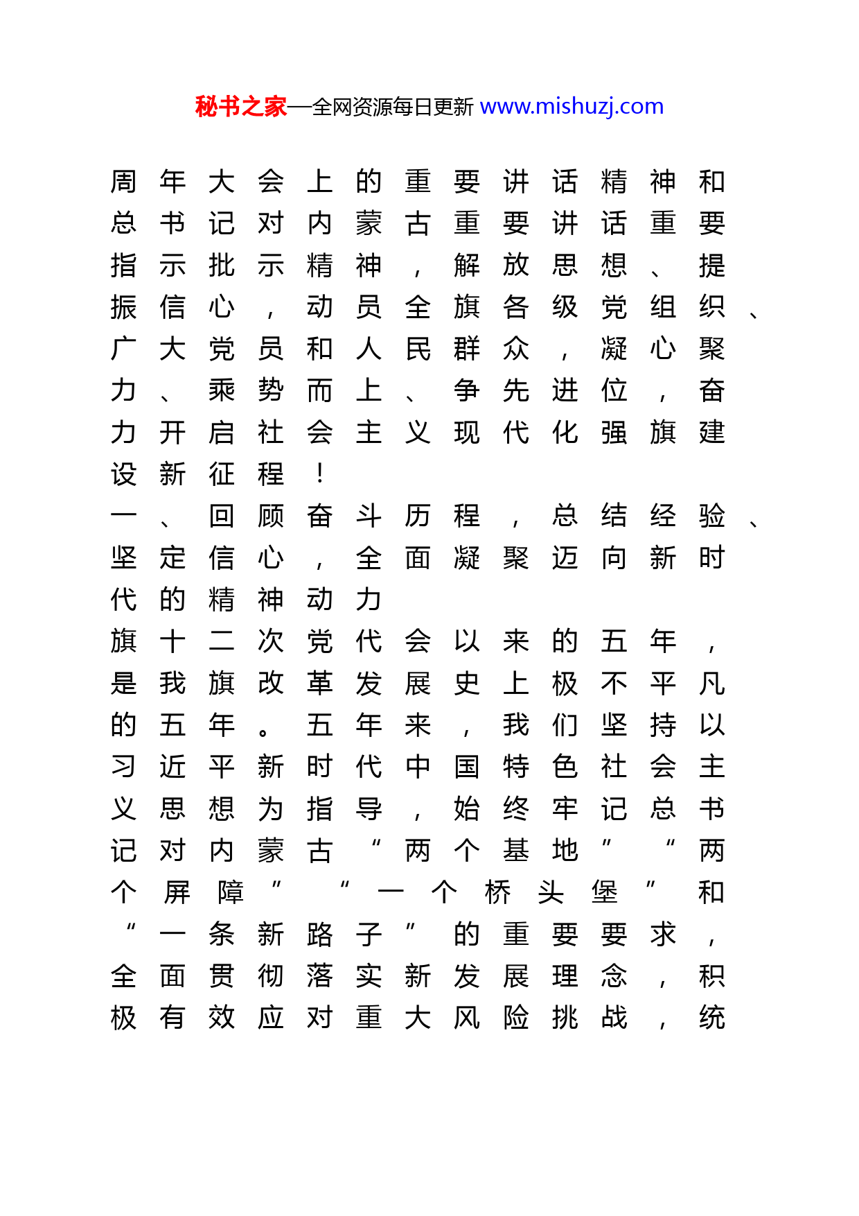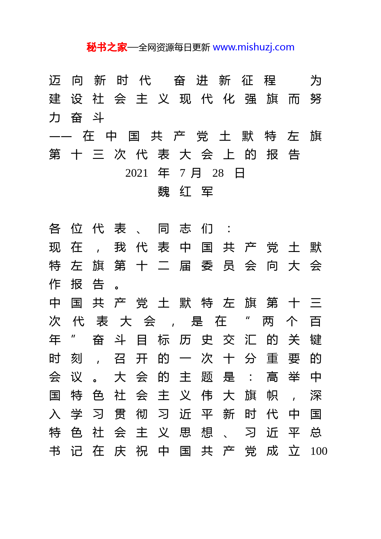 秘书之家—全网资源每日更新www.mishuzj.com迈向新时代奋进新征程为建设社会主义现代化强旗而努力奋斗——在中国共产党土默特左旗第十三次代表大会上的报告2021年7月28日魏红军各位代表、同志们:现在,我代表中国共产党土默特左旗第十二届委员会向大会作报告。中国共产党土默特左旗第十三次代表大会,是在“两个百年”奋斗目标历史交汇的关键时刻,召开的一次十分重要的会议。大会的主题是:高举中国特色社会主义伟大旗帜,深入学习贯彻习近平新时代中国特色社会主义思想、习近平总书记在庆祝中国共产党成立100秘书之家—全网资源每日更新www.mishuzj.com周年大会上的重要讲话精神和总书记对内蒙古重要讲话重要指示批示精神,解放思想、提振信心,动员全旗各级党组织、广大党员和人民群众,凝心聚力、乘势而上、争先进位,奋力开启社会主义现代化强旗建设新征程!一、回顾奋斗历程,总结经验、坚定信心,全面凝聚迈向新时代的精神动力旗十二次党代会以来的五年,是我旗改革发展史上极不平凡的五年。五年来,我们坚持以习近平新时代中国特色社会主义思想为指导,始终牢记总书记对内蒙古“两个基地”“两个屏障”“一个桥头堡”和“一条新路子”的重要要求,全面贯彻落实新发展理念,积极有效应对重大风险挑战,统秘书之家—全网资源每日更新www.mishuzj.com筹疫情防控和经济社会发展,全力以赴稳增长、调结构、抓创新、促改革、惠民生,圆满完成旗十二次党代会确定的各项目标任务,为开启“十四五”新征程奠定了坚实基础。五年来,我们始终坚持紧跟紧随、对标对表,“两个维护”更加坚决。不断提升政治判断力、政治领悟力、政治执行力,先后召开12次旗委全会研究贯彻落实习近平总书记对内蒙古重要讲话重要指示批示精神具体举措,纵深推进扫黑除恶专项斗争、政法队伍教育整顿和煤炭资源、草原林地、供销系统等领域违规违法问题专项整治,不折不扣推进党中央和自治区党委、市委各类巡视巡察督查反馈问题整改,扎实开展“转作风、优环境、勇担当”秘书之家—全网资源每日更新www.mishuzj.com“挖思想根源、肃流毒影响、转工作作风”等行动,形成了“讲政治、守纪律、敢担当、促发展”的浓厚氛围,全旗上下“四个意识”更加牢固、“四个自信”更加笃定、“两个维护”更加坚定。五年来,我们始终坚持奋勇争先、加快发展,综合实力不断增强。到2020年底,全旗地区生产总值完成191.2亿元,年均增长3.6%;社会消费品零售总额年均增长3.9%;城乡常住居民人均可支配收入年均分别增长5.9%和8.8%;一般公共预算收入达到13.7亿元,人均可用财力逐年攀升,连续三年上榜中国西部百强县市,先后荣获“自治区文明城市”“国家卫生县城”称号。实施优化营商环境三年行动计划,152项行政审批秘书之家—全网资源每日更新www.mishuzj.com和政务服务事项全部实现“一窗通办”,961条精细化政务服务事项办理实现“最多跑一次”。落实减税降费政策,累计为企业减免税费8.57亿元,有效激发了市场主体活力,释放了发展新动能。五年来,我们始终坚持调优结构、做强产业,发展质效明显提升。三次产业协调发展,比例由17∶35∶48调整为12∶39∶49。现代农业提质增效,建成高标准农田70万亩,亩均增产25%以上。畜牧业稳定发展,规模化养殖场(区)达118家,牲畜存栏82万头。创建了“五彩土默特”区域公用品牌,孤臻葵花籽、普洱奶茶等15款特色产品得到市场充分肯定。工业经济持续壮大,规模以上企业总量达到43家,产值达到127.4亿元,增加秘书之家—全网资源每日更新www.mishuzj.com值增速全市第三,伊利现代智慧健康谷、金山热电厂二期等核心竞争优势明显、产业带动能力强的企业相继落户开工。新能源汽车产业初具规模,成为自治区中部首个全产业链制造基地。现代服务业进一步繁荣,旅游综合收入达到19.29亿元,电商交易额由不足1亿元增加至5.6亿元。五年来,我们始终坚持勠力同心、合力攻坚,全力打赢“三大攻坚战”。脱贫攻坚战取得全面胜利,36个贫困村全部出列,10775名贫困人口全面脱贫。污染防治成效显著,完成了27个村清洁能源替换和13个村集中供热改造,大青山自然保护区内工矿企业全部关停退出。开展大规模生态绿化行动,完成造林7.5万亩。哈素海生态治秘书之家—全网资源每日更新www.mishuzj.com理和重点河沟整治取得阶段性成果。重大风险防范化解效果明显,累计化解政府隐性债务42.67亿元,风险等级由红色降为黄色。全面加强金融、安全生产、公共安全等领域风险隐患排查化解,社会大局更加和谐稳定。五年来,我们始终坚持统筹布局、城乡一体,环境面貌焕然一新。坚持打基础、补短板、促提升,实施城乡基础设施建设项目130余项,升级改造公路170公里、输配电线路1642公里,修缮危房3000余户。农村人居环境持续改善,卫生清扫、垃圾清运、日常保洁等管护机制基本形成。乡风文明建设扎实推进,新时代文明实践中心全国试点工作深入开展,24个村镇荣获全国全区文明村镇、卫秘书之家—全网资源每日更新www.mishuzj.com生乡镇、乡村治理示范村等称号。察素齐镇现代化建设水平持续提高,开通城镇公交、实现动车经停、配套共享单车,市政公共配套日趋完善。城镇面貌持续改善,实施镇区市政道路及小街巷改造项目20个,新增绿化面积13.8万平方米