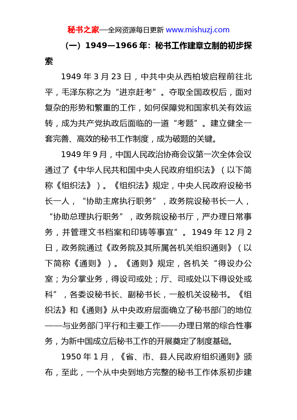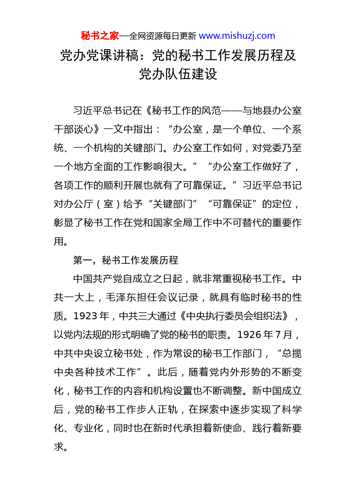 秘书之家—全网资源每日更新www.mishuzj.com党办党课讲稿:党的秘书工作发展历程及党办队伍建设习近平总书记在《秘书工作的风范——与地县办公室干部谈心》一文中指出:“办公室,是一个单位、一个系统、一个机构的关键部门。办公室工作如何,对党委乃至一个地方全面的工作影响很大。”“办公室工作做好了,各项工作的顺利开展也就有了可靠保证。”习近平总书记对办公厅(室)给予“关键部门”“可靠保证”的定位,彰显了秘书工作在党和国家全局工作中不可替代的重要作用。第一,秘书工作发展历程中国共产党自成立之日起,就非常重视秘书工作。中共一大上,毛泽东担任会议记录,就具有临时秘书的性质。1923年,中共三大通过《中央执行委员会组织法》,以党内法规的形式明确了党的秘书的职责。1926年7月,中共中央设立秘书处,作为常设的秘书工作部门,“总揽中央各种技术工作”。此后,随着党内外形势的不断变化,秘书工作的内容和机构设置也不断调整。新中国成立后,党的秘书工作步人正轨,在探索中逐步实现了科学化、专业化,同时也在新时代承担着新使命、践行着新要求。秘书之家—全网资源每日更新www.mishuzj.com(一)1949—1966年:秘书工作建章立制的初步探索1949年3月23日,中共中央从西柏坡启程前往北平,毛泽东称之为“进京赶考”。夺取全国政权后,面对复杂的形势和繁重的工作,如何保障党和国家机关有效运转,成为共产党执政后面临的一道“考题”。建立健全一套完善、高效的秘书工作制度,成为破题的关键。1949年9月,中国人民政治协商会议第一次全体会议通过了《中华人民共和国中央人民政府组织法》(以下简称《组织法》)。《组织法》规定,中央人民政府设秘书长一人,“协助主席执行职务”,政务院设秘书长一人,“协助总理执行职务”,政务院设秘书厅,严办理日常事务,并管理文书档案和印铸等事宜”。1949年12月2日,政务院通过《政务院及其所属各机关组织通则》(以下简称《通则》)。《通则》规定,各机关“得设办公室;为分掌业务,得设司或处;厅、司或处以下得设处或科”,各委设秘书长、副秘书长,一般机关设秘书。《组织法》和《通则》从中央政府层面确立了秘书部门的地位——与业务部门平行和主要工作——办理日常的综合性事务,为新中国成立后秘书工作的开展奠定了制度基础。1950年1月,《省、市、县人民政府组织通则》颁布,至此,一个从中央到地方完整的秘书工作体系初步建秘书之家—全网资源每日更新www.mishuzj.com立。1951年4月,中央人民政府政务院在北京召开了全国秘书长会议。会议讨论通过了一系列文件,包括《关于各级政府机关秘书长和不设秘书长的办公厅主任的工作任务和秘书工作机构的决定》(以下简称《决定》)、《公文处理暂行办法》、《保守国家机密暂行条例》、《关于处理人民来信和接见人民工作的规定》、《关于加强文书处理工作和档案工作的决定》等。其中,《决定》明确了秘书部门的工作任务:协助首长综合情况,研究政策,推行工作;协助首长密切各方面的工作联系;协助首长掌管机关内部统一战线工作;协助首长掌管保密工作;掌管机要工作;主持日常行政事务;掌管机关事务工作。《决定》还就如何做好秘书工作,提出了一些指导性意见,如“熟悉政策法令,创造和积累经验”“经常注意了解各部门工作动向”等。机构设置方面,《决定》指出,应根据精简原则,尽力减少层次,办公室“一般可分设两层,最多不超过三层”,“适应业务分工,组织机构可适当向横的方面发展,逐渐改变过大过多的一揽子的组织形式”。1951年的全国秘书长会议是新中国成立后秘书工作领域的第一次专题会议,它总结了新中国成立一年半以来秘书工作的成绩和经验,制定了各项工作制度,极大地推动了秘书工作的发展。秘书之家—全网资源每日更新www.mishuzj.com对于秘书的配备和任用,党和国家提出了更多更细致的要求。1956年1月,中共中央下发《关于今后高级干部配备秘书时须经一定组织审查批准的通知》,要求“今后担负重要领导工作的干部的秘书,必须挑选政治上完全可靠的党员干部充任,而且要经过一定组织的严格审查和批准”。1964年10月,中共中央办公厅发布《关于机要秘书工作的暂行规定》指出,机要秘书工作是——项极为重要的政治性工作;机要秘书要由具有一定工作经验和一定政治、文化水平的党员干部担任;任用机要秘书,必须由任用部门严格审查,报上级党委组织部批准。截至“文革”前,秘书工作的建章立制基本完成,我国初步探索出一套比较成体系的秘书工作制度。需要说明的是,这一时期秘书工作的发展主要依靠经验的积累,离科学化、专业化的要求还存在很大差距。“文革”期间,秘书机构和秘书工作制度遭到破坏,发展陷入停滞。(二)1978—2012年:秘书工作逐步走向科学化、专业化1978年12月,党的十一届三中全会作出把党和国家工作中心转移到经济建设上来的历史性决策,开启了改革开放和社会主义现代化的伟大征程。在新的历史时期,党的秘书工作逐步走向科学化、专业化。1981年3月,“文革”后首次全国党委秘书长、办公秘书之家—全网资源每日更新www.mishuzj.com厅主任座谈会在北京召开。会议认为,“文革”前的许多秘书工作制度是完全合理和行之有效的,在新时期仍然需要认真执行