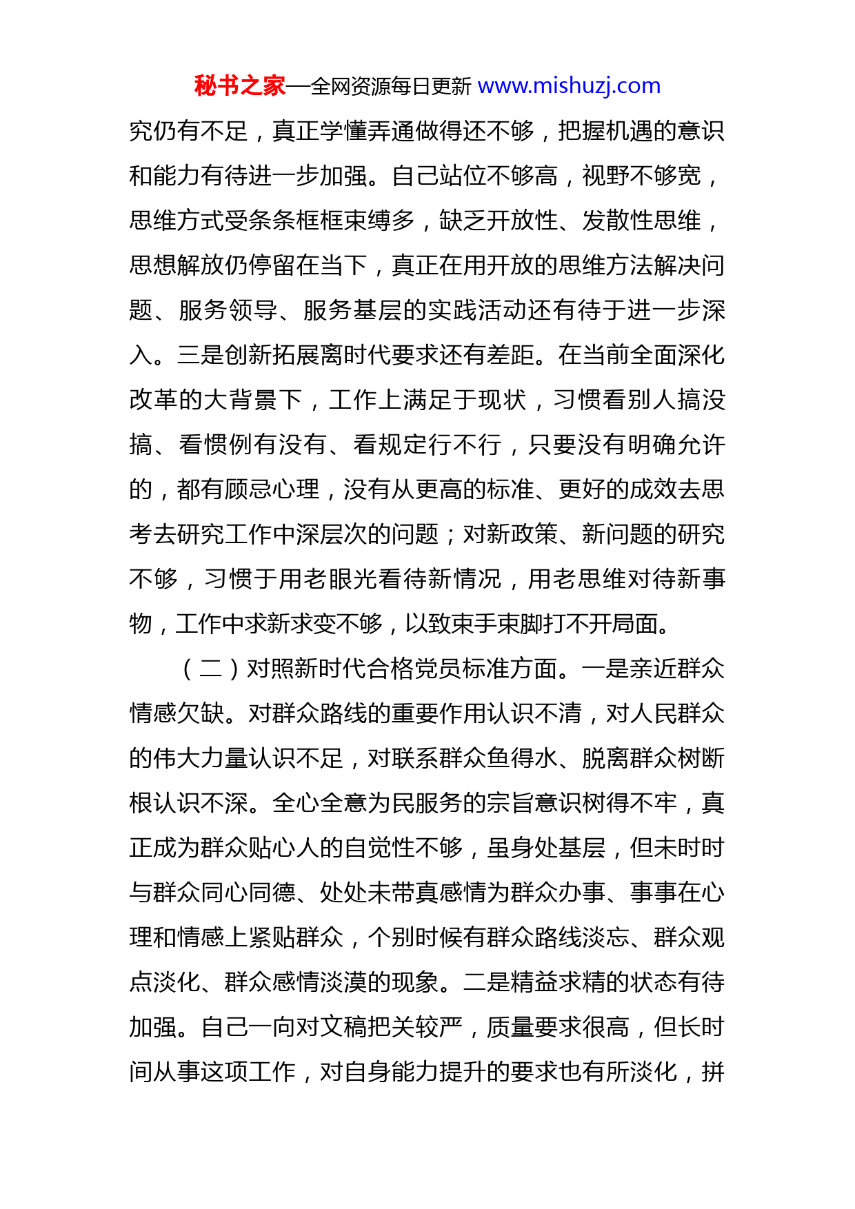 秘书之家—全网资源每日更新www.mishuzj.com党员2021年度组织生活会个人对照检查材料(3599字)按照《关于召开2021年度组织生活会和开展民主评议党员工作的通知》要求,会前,本人采取集中学习、交流探讨、个人自学、党小组分享学习心得等形式,认真学习习近平总书记“七一”重要讲话,学习党的十九届六中全会精神等内容,提升了党性修养,为开好本次组织生活会打好了坚实基础。同时与党员、与支委成员进行了谈心谈话,听取了改进工作的意见和建议,并对照4个方面,认真查摆了存在的问题、剖析了产生的原因、明确了努力方向。现将个人对照检查情况报告如下。一、存在的问题(一)对照党中央和习近平总书记的号召和要求方面。一是理论学习不够深入。虽然能够认真落实各级部署安排,积极响应党史学习教育、党的十九届六中全会精神的学习号召,利用闲暇时间主动学习,并多次参加支部组织的读书班、党建大讲堂等活动,开展集中学习,但相对来说,还是存在着局部零散学习多、全面系统学习少的问题,整体学习的规划并不充分,学习机制上仍不完善,未能营造良好的学习氛围。二是开放思维还不够主动。对于党中央、国务院和省委、省政府政策文件的及时学习和研秘书之家—全网资源每日更新www.mishuzj.com究仍有不足,真正学懂弄通做得还不够,把握机遇的意识和能力有待进一步加强。自己站位不够高,视野不够宽,思维方式受条条框框束缚多,缺乏开放性、发散性思维,思想解放仍停留在当下,真正在用开放的思维方法解决问题、服务领导、服务基层的实践活动还有待于进一步深入。三是创新拓展离时代要求还有差距。在当前全面深化改革的大背景下,工作上满足于现状,习惯看别人搞没搞、看惯例有没有、看规定行不行,只要没有明确允许的,都有顾忌心理,没有从更高的标准、更好的成效去思考去研究工作中深层次的问题;对新政策、新问题的研究不够,习惯于用老眼光看待新情况,用老思维对待新事物,工作中求新求变不够,以致束手束脚打不开局面。(二)对照新时代合格党员标准方面。一是亲近群众情感欠缺。对群众路线的重要作用认识不清,对人民群众的伟大力量认识不足,对联系群众鱼得水、脱离群众树断根认识不深。全心全意为民服务的宗旨意识树得不牢,真正成为群众贴心人的自觉性不够,虽身处基层,但未时时与群众同心同德、处处未带真感情为群众办事、事事在心理和情感上紧贴群众,个别时候有群众路线淡忘、群众观点淡化、群众感情淡漠的现象。二是精益求精的状态有待加强。自己一向对文稿把关较严,质量要求很高,但长时间从事这项工作,对自身能力提升的要求也有所淡化,拼秘书之家—全网资源每日更新www.mishuzj.com搏劲头和开拓精神不如以前,精神倦怠的现象有所抬头,有时产生了“差不多”“还可以”的想法,不能一如既往地保持对文稿的严要求、高水准。三是在作风建设还需加强。对党的创新理论认知不够,结合工作实际情况主动思考较少、实际探索不足,未能做到用心体会、悉心领悟、诚心践行,务实的工作作风有待进一步加强。真正站在群众的角度,深入基层实际进行实地调查研究工作开展的不经常,与人民群众心贴心、手握手传达基层诉求,协助市委改善体制机制、调优民生办法方面需要继续加强。在打破传统路径依赖、以创新思维推进工作、解决问题方面用力不足,未能做到以点带面、以小见大,察实情、谋新招,影响了工作实效。(三)对照入党誓词方面。一是解决群众难题措施不够科学。帮扶群众制度机制还没有完全建立起来,集中、短期的帮扶也有,但常态化帮扶不够,工作忙时放一放、任务重时缓一缓,缺乏计划性、系统性;比较注重解决硬件设施难题,而在群众满意度提升上关注不够,解决思路及方法坚持不好。二是对防微杜渐、警钟长鸣缺乏应有认识。尽管自身能够充分意识到政治纪律是“带电的高压线”、政治规矩是“高悬的铁戒尺”,但还是存在“独善其身”的思想,在廉洁自律的认识上还有差距,对抓党风廉政建设的理解还不够到位。三是进取精神相比退化。存秘书之家—全网资源每日更新www.mishuzj.com在“功到业熟”的自满情绪,有时也缺乏“踏石留印、抓铁有痕”的劲头,亲力亲为少了,争当“领头雁”意识不强。对新形势新要求把握不够,对面临的危机和差距认识不足,在生态建设、民生改善等工作中建言献策不够,思路不够开阔,以文辅政、建言献策的作用得不到充分发挥。(四)对照革命先辈和先进典型方面,一是拼搏奉献的劲头不足。自认为在XX工作时间比较长了,不自觉地产生“松口气”“歇歇脚”的想法,拼搏进取、甘于奉献的精神保持得不好。比如,在材料不急的情况下,有时会安排综合的同志加班,自己却回家了,带着同志们一起干、一起挑灯夜战的次数少了。二是斗争精神不够。总感到自己是个处级,上有思路清、能力强的领导领着,身边几位同志机关资历、经验也都比我丰富,自己按领导意图做好就行了,统筹全科工作还打不开思路、放不开手脚、下不了决心,积极出谋划策、主动靠上去,有时有矛盾上交现象。抓科室建设上,主要靠大家自觉自愿,人员思想上关注的不够、纪律约束上强调的不够,督促不经常,担当还不够,反映出自己事业心责任心不强,为党奋斗的意识有些淡化了。三是勇