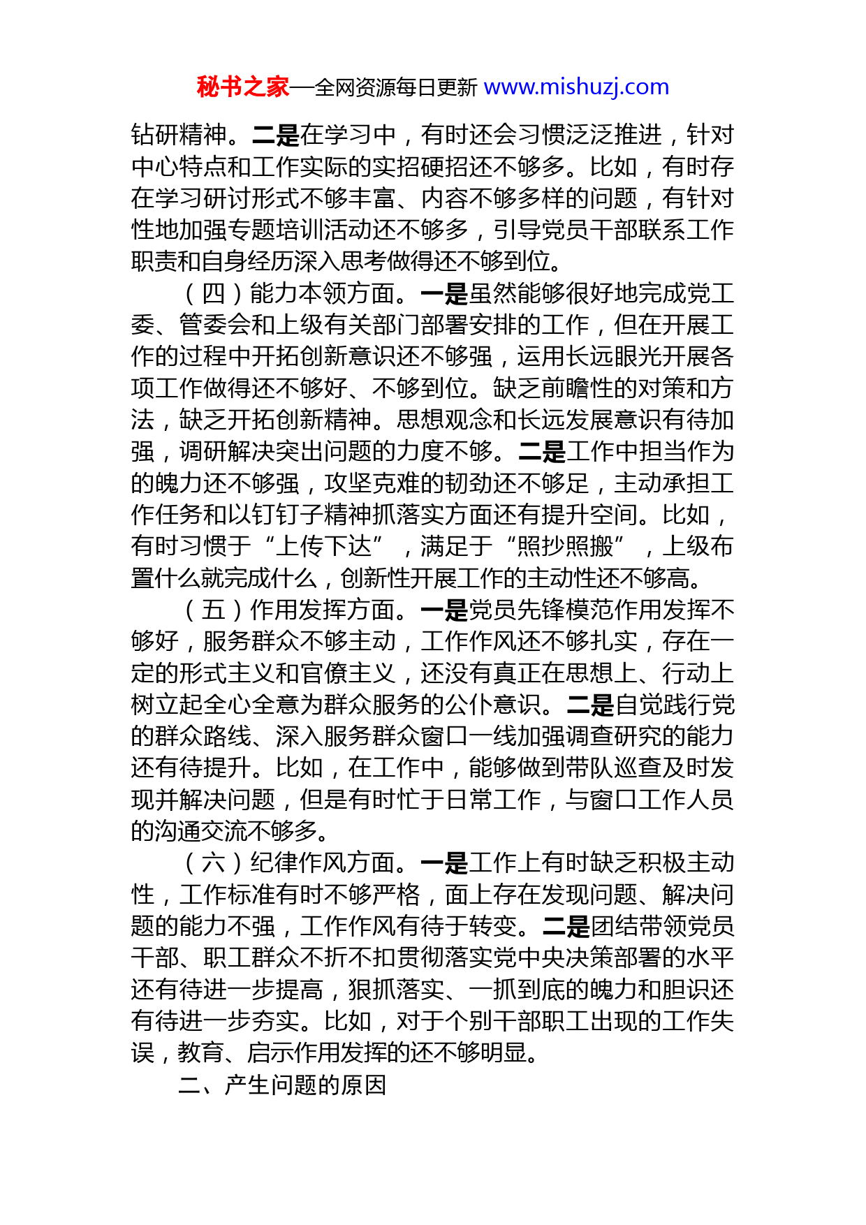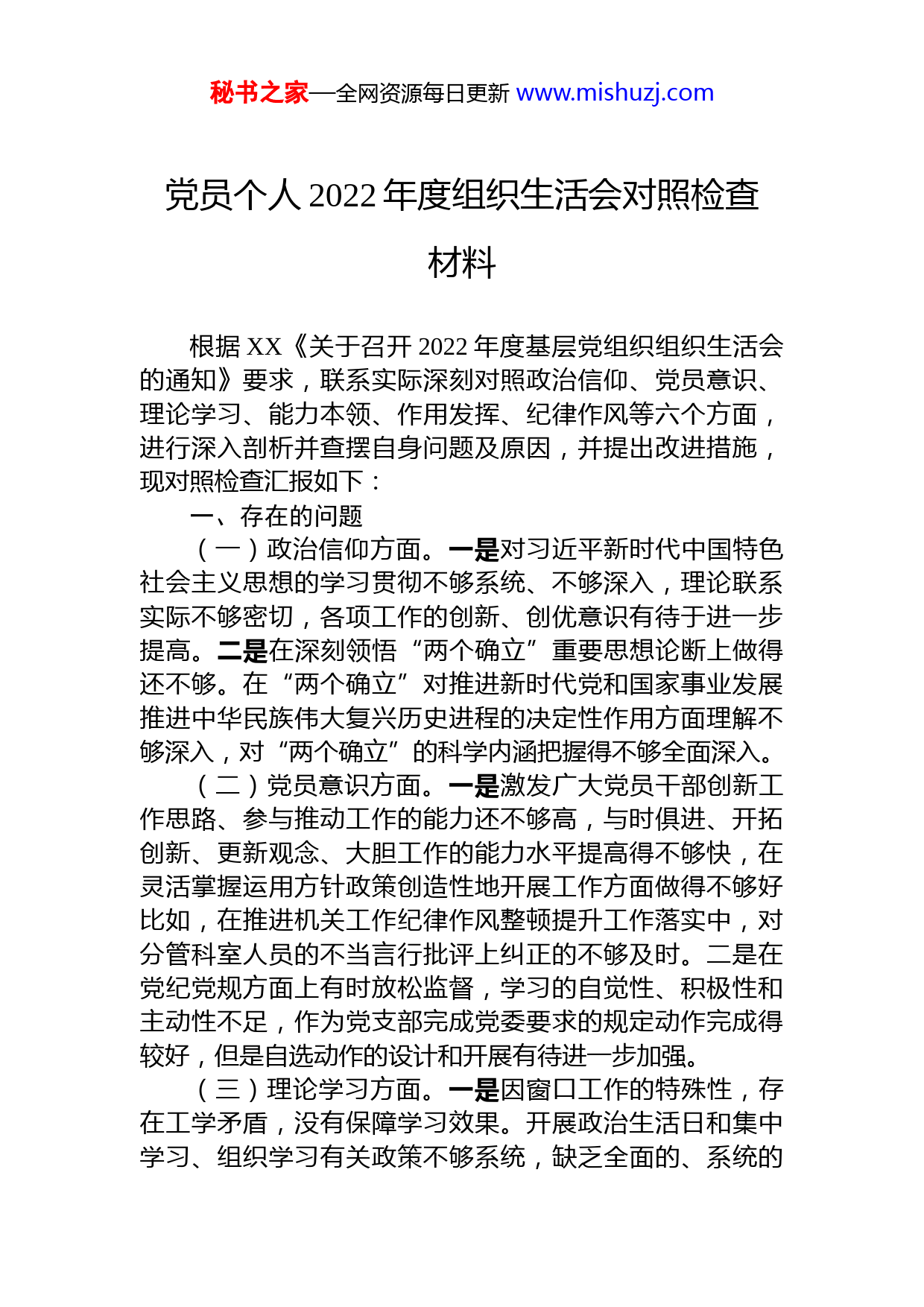秘书之家—全网资源每日更新www.mishuzj.com党员个人2022年度组织生活会对照检查材料根据XX《关于召开2022年度基层党组织组织生活会的通知》要求,联系实际深刻对照政治信仰、党员意识、理论学习、能力本领、作用发挥、纪律作风等六个方面,进行深入剖析并查摆自身问题及原因,并提出改进措施,现对照检查汇报如下:一、存在的问题(一)政治信仰方面。一是对习近平新时代中国特色社会主义思想的学习贯彻不够系统、不够深入,理论联系实际不够密切,各项工作的创新、创优意识有待于进一步提高。二是在深刻领悟“两个确立”重要思想论断上做得还不够。在“两个确立”对推进新时代党和国家事业发展推进中华民族伟大复兴历史进程的决定性作用方面理解不够深入,对“两个确立”的科学内涵把握得不够全面深入。(二)党员意识方面。一是激发广大党员干部创新工作思路、参与推动工作的能力还不够高,与时俱进、开拓创新、更新观念、大胆工作的能力水平提高得不够快,在灵活掌握运用方针政策创造性地开展工作方面做得不够好比如,在推进机关工作纪律作风整顿提升工作落实中,对分管科室人员的不当言行批评上纠正的不够及时。二是在党纪党规方面上有时放松监督,学习的自觉性、积极性和主动性不足,作为党支部完成党委要求的规定动作完成得较好,但是自选动作的设计和开展有待进一步加强。(三)理论学习方面。一是因窗口工作的特殊性,存在工学矛盾,没有保障学习效果。开展政治生活日和集中学习、组织学习有关政策不够系统,缺乏全面的、系统的秘书之家—全网资源每日更新www.mishuzj.com钻研精神。二是在学习中,有时还会习惯泛泛推进,针对中心特点和工作实际的实招硬招还不够多。比如,有时存在学习研讨形式不够丰富、内容不够多样的问题,有针对性地加强专题培训活动还不够多,引导党员干部联系工作职责和自身经历深入思考做得还不够到位。(四)能力本领方面。一是虽然能够很好地完成党工委、管委会和上级有关部门部署安排的工作,但在开展工作的过程中开拓创新意识还不够强,运用长远眼光开展各项工作做得还不够好、不够到位。缺乏前瞻性的对策和方法,缺乏开拓创新精神。思想观念和长远发展意识有待加强,调研解决突出问题的力度不够。二是工作中担当作为的魄力还不够强,攻坚克难的韧劲还不够足,主动承担工作任务和以钉钉子精神抓落实方面还有提升空间。比如,有时习惯于“上传下达”,满足于“照抄照搬”,上级布置什么就完成什么,创新性开展工作的主动性还不够高。(五)作用发挥方面。一是党员先锋模范作用发挥不够好,服务群众不够主动,工作作风还不够扎实,存在一定的形式主义和官僚主义,还没有真正在思想上、行动上树立起全心全意为群众服务的公仆意识。二是自觉践行党的群众路线、深入服务群众窗口一线加强调查研究的能力还有待提升。比如,在工作中,能够做到带队巡查及时发现并解决问题,但是有时忙于日常工作,与窗口工作人员的沟通交流不够多。(六)纪律作风方面。一是工作上有时缺乏积极主动性,工作标准有时不够严格,面上存在发现问题、解决问题的能力不强,工作作风有待于转变。二是团结带领党员干部、职工群众不折不扣贯彻落实党中央决策部署的水平还有待进一步提高,狠抓落实、一抓到底的魄力和胆识还有待进一步夯实。比如,对于个别干部职工出现的工作失误,教育、启示作用发挥的还不够明显。二、产生问题的原因秘书之家—全网资源每日更新www.mishuzj.com(一)党性锤炼还不够。学习教育有待深化,没有把思想政治建设放在首位;工作创新不足,面对繁重的工作任务,有时不能积极主动思考问题、研究办法,习惯于按部就班抓落实,从政治上把大局、看问题、想事情的能力还不够强,带头遵规守纪的自觉性、主动性还不够高,对新时代特征的把握还不够全面,理论创新、实践创新、制度创新意识还不够强,有时还存在缺乏运用新思路、探索新举措的勇气。(二)理论学习还不够。学习方式上,往往是上级要求学什么,与工作关系密切的就多学一些,与工作关系不大的就少学一点,存在实用主义思想,学习内容上都是通读、了解即可,没有做到全面系统,对习近平新时代中国特色社会主义思想中蕴含的马克思主义立场观点方法思考问题、分析问题和解决问题的能力还有欠缺,对理论学习的主动性有所懈怠,思想上还不够重视,导致行动上有偏差,进而影响到抓党员学习工作还不够到位,思想政治工作方法还不够灵活。(三)宗旨意识还不够。对“四风”问题的严重性、危害性认识不深,对不良风气、不良现象的危害性认识不清,缺乏“时时勤拂晓”、“处处警防范”的警惕性和危机感,有时存在失之于宽、失之于软的现象,对全面从严治党的认知还不够深刻,监督执纪效力还不够高。对一些问题的处理缺乏刚性,还存在“下不为例”的思想,缺乏“一查到底”的魄力。(四)是担当意识还不够。遇到问题不敢担当,带头抓工作的劲头小了,在工作中有一些决策和工作部署,也是为了完成上级任务或工作部署而提出的建议意见和想法总觉得有没有风险、做没做得出效果才要考虑这些问题,在执行方面还存在“打折扣”、“搞变通”现象,一些工作只满足于过得去、不出错。三、下步改进措施及