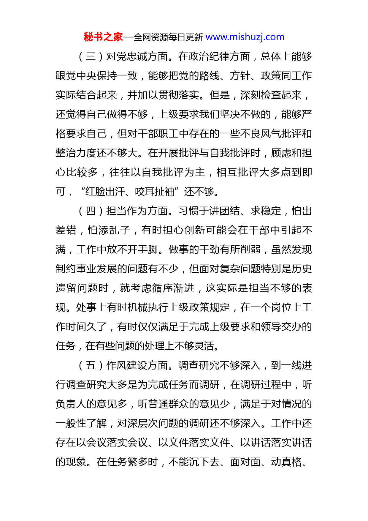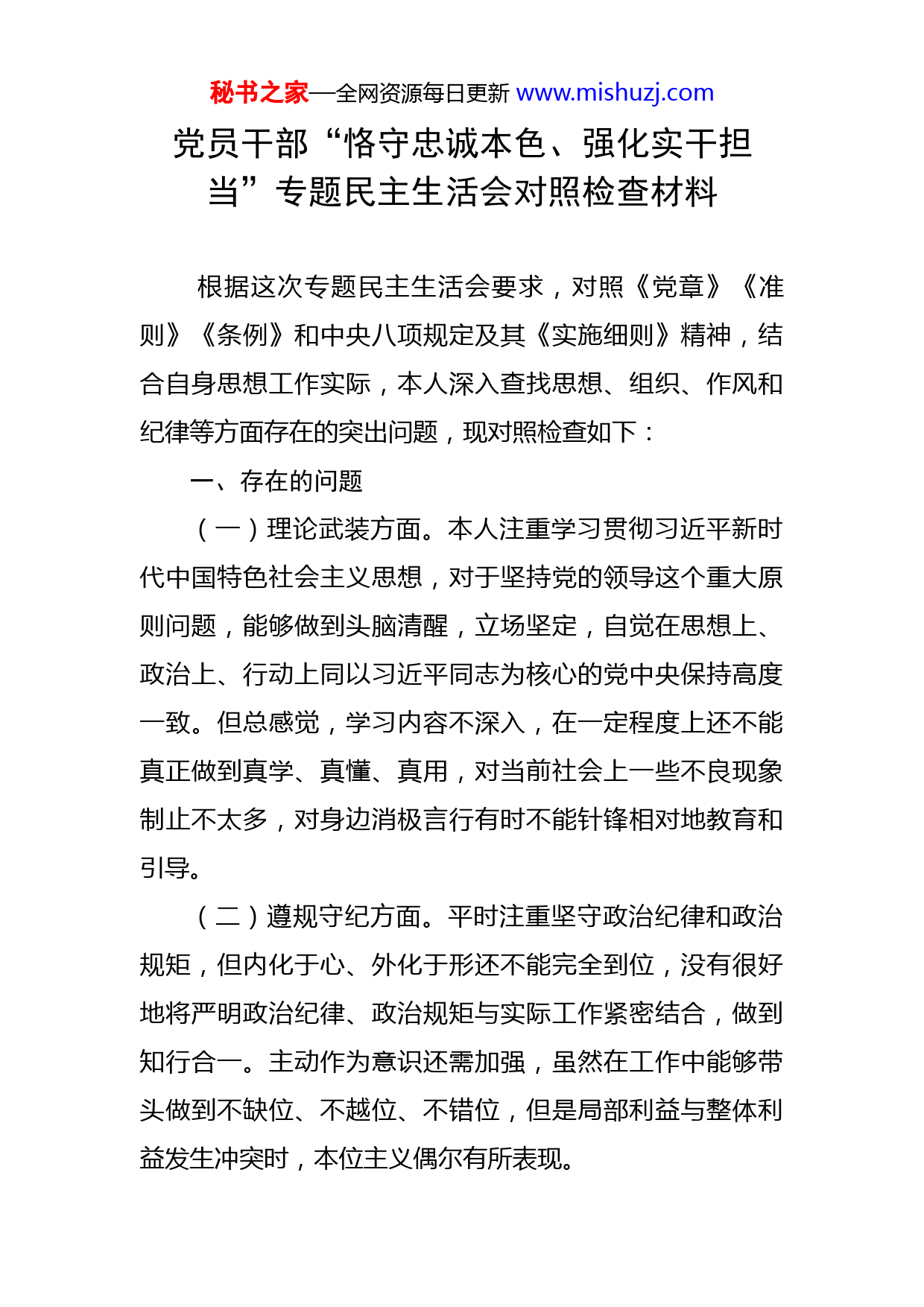 秘书之家—全网资源每日更新www.mishuzj.com党员干部“恪守忠诚本色、强化实干担当”专题民主生活会对照检查材料根据这次专题民主生活会要求,对照《党章》《准则》《条例》和中央八项规定及其《实施细则》精神,结合自身思想工作实际,本人深入查找思想、组织、作风和纪律等方面存在的突出问题,现对照检查如下:一、存在的问题(一)理论武装方面。本人注重学习贯彻习近平新时代中国特色社会主义思想,对于坚持党的领导这个重大原则问题,能够做到头脑清醒,立场坚定,自觉在思想上、政治上、行动上同以习近平同志为核心的党中央保持高度一致。但总感觉,学习内容不深入,在一定程度上还不能真正做到真学、真懂、真用,对当前社会上一些不良现象制止不太多,对身边消极言行有时不能针锋相对地教育和引导。(二)遵规守纪方面。平时注重坚守政治纪律和政治规矩,但内化于心、外化于形还不能完全到位,没有很好地将严明政治纪律、政治规矩与实际工作紧密结合,做到知行合一。主动作为意识还需加强,虽然在工作中能够带头做到不缺位、不越位、不错位,但是局部利益与整体利益发生冲突时,本位主义偶尔有所表现。秘书之家—全网资源每日更新www.mishuzj.com(三)对党忠诚方面。在政治纪律方面,总体上能够跟党中央保持一致,能够把党的路线、方针、政策同工作实际结合起来,并加以贯彻落实。但是,深刻检查起来,还觉得自己做得不够,上级要求我们坚决不做的,能够严格要求自己,但对干部职工中存在的一些不良风气批评和整治力度还不够大。在开展批评与自我批评时,顾虑和担心比较多,往往以自我批评为主,相互批评大多点到即可,“红脸出汗、咬耳扯袖”还不够。(四)担当作为方面。习惯于讲团结、求稳定,怕出差错,怕添乱子,有时担心创新可能会在干部中引起不满,工作中放不开手脚。做事的干劲有所削弱,虽然发现制约事业发展的问题有不少,但面对复杂问题特别是历史遗留问题时,就考虑循序渐进,这实际是担当不够的表现。处事上有时机械执行上级政策规定,在一个岗位上工作时间久了,有时仅仅满足于完成上级要求和领导交办的任务,在有些问题的处理上不够灵活。(五)作风建设方面。调查研究不够深入,到一线进行调查研究大多是为完成任务而调研,在调研过程中,听负责人的意见多,听普通群众的意见少,满足于对情况的一般性了解,对深层次问题的调研还不够深入。工作中还存在以会议落实会议、以文件落实文件、以讲话落实讲话的现象。在任务繁多时,不能沉下去、面对面、动真格、秘书之家—全网资源每日更新www.mishuzj.com反复抓。对“四风”隐形变异问题,还需持之以恒加以监督。对工作人员布置任务多,压的担子多,思想交流少,坐下来谈心少。(六)廉洁自律方面。自己能严格执行廉洁自律准则,严格落实中央八项规定及其《实施细则》精神,并经常对家人进行教育和提醒,自觉抵制“围猎”腐蚀,但对新形势下反腐倡廉工作的长期性、艰巨性和复杂性认识还不够深刻。二、产生上述问题的原因认真剖析上述问题根源,主要有以下几个方面:(一)理论学习有所放松。剖析本人存在的问题,一个深层次的原因就是放松了理论学习。本人自入党以来,长期受党的教育培养,自认为基本素质是具备的,因而放松了理论学习,尤其是对理论武装的重要性认识不高,自觉性不强,导致理论联系实际不够紧密,缺乏钉钉子精神,缺乏深学苦练的韧劲,缺乏把学习当做一种责任、一种境界的自觉行动。(二)宗旨意识有所弱化。对党的全心全意为人民服务的宗旨意识领悟不深,在思想深处强化不够,造成了平时脱离群众,不接地气,对群众的呼声、群众的疾苦、群众的困难了解不多,帮助解决实际问题也不主动、不及时。宗旨意识的淡薄,造成群众观念淡化,导致工作的出秘书之家—全网资源每日更新www.mishuzj.com发点和落脚点发生一些偏差。(三)进取精神有所松懈。在当前从严治党的大环境下,有时候心存顾虑,怕惹麻烦,缺乏锐意进取的精神,担当精神不够;有时候对于可搞可不搞的活动选择了不搞;有时候主观上可能放松了要求,思想上有所麻痹,精神上有所懈怠,觉得用不着那么拼,缺乏终生奋斗的进取意识。三、改进措施针对查摆出的问题,本人将以认真、较真的态度抓好整改,务求取得实效。(一)强化理论学习,筑牢思想根基。深入学习习近平新时代中国特色社会主义思想、党的十九大和十九届历次全会精神,系统学习《中国共产党廉政自律准则》《中国共产党纪律处分条例》《中国共产党党内监督条例》等党内法规,坚持先学一步、学深一层、学实一点,提高学习的质量和效果,筑牢理想信念之“魂”,补足精神之“钙”,做到真学、真懂、真信、真用。(二)持续改进作风,树牢为民宗旨。时刻以“四风”新表现对照检视自己,坚决克服形式主义、官僚主义,牢固树立群众观念,忠实执行党的群众路线。始终保持清醒头脑,时刻牢记全心全意为人民服务的宗旨,时刻警惕脱离群众的倾向,时刻注意摆正自己同广大群众的位秘书之家—全网资源每日更新www.mishuzj.com置,实实在在地为人民群众解难事、办实事、做好事。深入基层、深入一线、深入群众,调查研究,总结经验,汲取实践中的丰富营养,不断加深与广大基层工作者的感情,设身处地,换位思考,切实做到情为