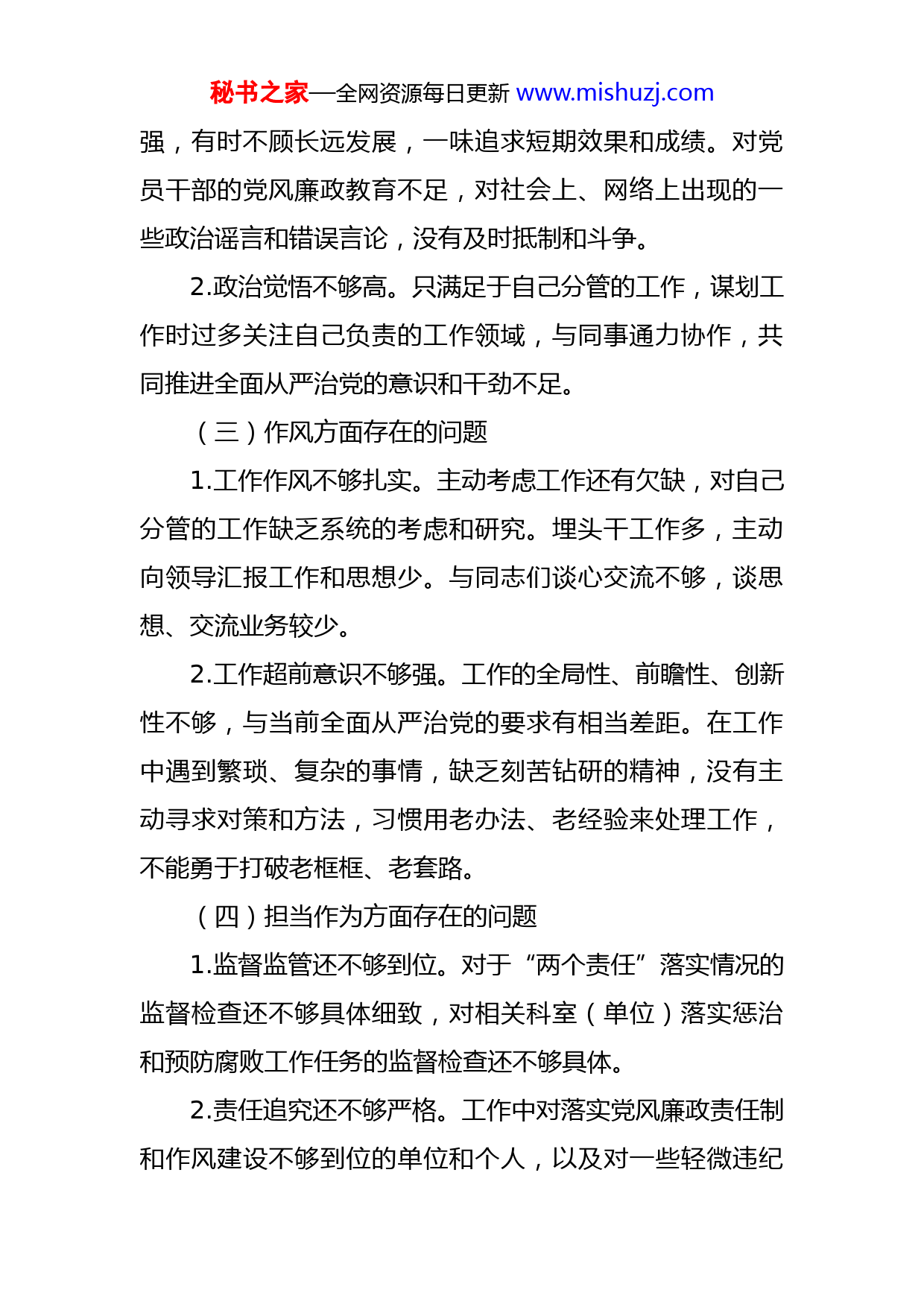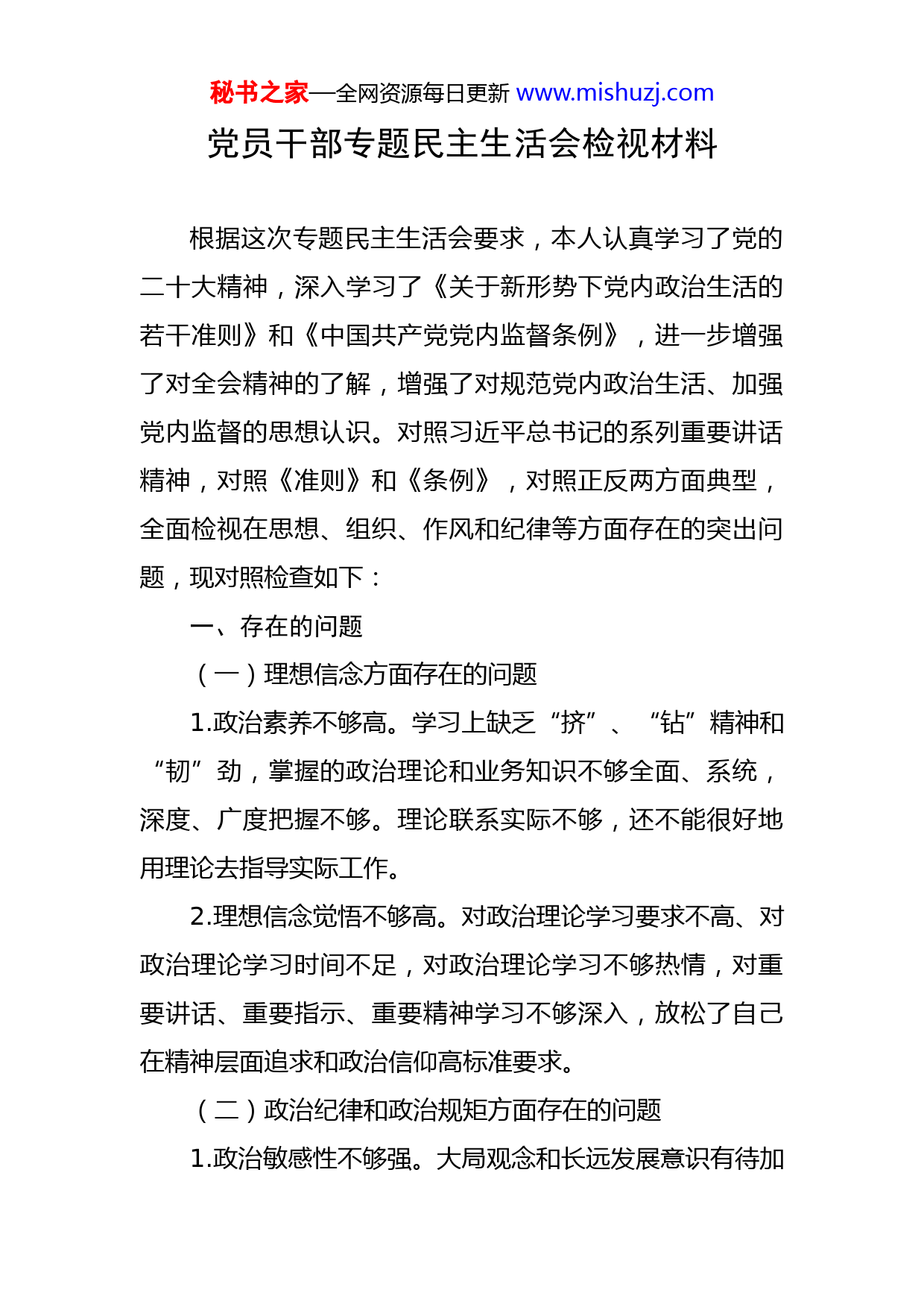 秘书之家—全网资源每日更新www.mishuzj.com党员干部专题民主生活会检视材料根据这次专题民主生活会要求,本人认真学习了党的二十大精神,深入学习了《关于新形势下党内政治生活的若干准则》和《中国共产党党内监督条例》,进一步增强了对全会精神的了解,增强了对规范党内政治生活、加强党内监督的思想认识。对照习近平总书记的系列重要讲话精神,对照《准则》和《条例》,对照正反两方面典型,全面检视在思想、组织、作风和纪律等方面存在的突出问题,现对照检查如下:一、存在的问题(一)理想信念方面存在的问题1.政治素养不够高。学习上缺乏“挤”、“钻”精神和“韧”劲,掌握的政治理论和业务知识不够全面、系统,深度、广度把握不够。理论联系实际不够,还不能很好地用理论去指导实际工作。2.理想信念觉悟不够高。对政治理论学习要求不高、对政治理论学习时间不足,对政治理论学习不够热情,对重要讲话、重要指示、重要精神学习不够深入,放松了自己在精神层面追求和政治信仰高标准要求。(二)政治纪律和政治规矩方面存在的问题1.政治敏感性不够强。大局观念和长远发展意识有待加秘书之家—全网资源每日更新www.mishuzj.com强,有时不顾长远发展,一味追求短期效果和成绩。对党员干部的党风廉政教育不足,对社会上、网络上出现的一些政治谣言和错误言论,没有及时抵制和斗争。2.政治觉悟不够高。只满足于自己分管的工作,谋划工作时过多关注自己负责的工作领域,与同事通力协作,共同推进全面从严治党的意识和干劲不足。(三)作风方面存在的问题1.工作作风不够扎实。主动考虑工作还有欠缺,对自己分管的工作缺乏系统的考虑和研究。埋头干工作多,主动向领导汇报工作和思想少。与同志们谈心交流不够,谈思想、交流业务较少。2.工作超前意识不够强。工作的全局性、前瞻性、创新性不够,与当前全面从严治党的要求有相当差距。在工作中遇到繁琐、复杂的事情,缺乏刻苦钻研的精神,没有主动寻求对策和方法,习惯用老办法、老经验来处理工作,不能勇于打破老框框、老套路。(四)担当作为方面存在的问题1.监督监管还不够到位。对于“两个责任”落实情况的监督检查还不够具体细致,对相关科室(单位)落实惩治和预防腐败工作任务的监督检查还不够具体。2.责任追究还不够严格。工作中对落实党风廉政责任制和作风建设不够到位的单位和个人,以及对一些轻微违纪秘书之家—全网资源每日更新www.mishuzj.com违规现象只是提醒提醒而已,责任追究还不够严格。考核工作缺乏具体量化标准和指标体系,不能全面准确反映责任制落实情况。二、产生上述问题的原因以上问题产生的原因,最根本的在于没有拧紧“总开关”,没有按照政治合格、执行纪律合格、品德合格、发挥作用合格“四个合格”严格要求自己。(一)理想信念不够坚定。虽然自己对加强理论学习、坚定理想信念的重要性必要性认识是清醒的,能长期坚持学习党和国家的路线、方针和政策,但总的来说,在学习过程中还缺乏系统性、全面性,对一些重要理论精神实质领悟得不够透彻,特别是对中国特色社会主义理论体系、习近平总书记系列讲话精神学习得不够全面深入,在理想信念上有所放松。(二)宗旨观念有所淡化。从小在农村长大,能够经常与群众面对面交谈,与群众建立了比较深厚的感情,但这几年随着职务的提升,与群众的距离远了,关系淡了,贴心话谈的少了。工作作风不够深入,得心应手的工作抓得多一些、实一些,难度大、难见效的工作抓得虚一些、少一些,对群众的呼声、疾苦、困难了解不够。(三)党性修养有待锤炼。平时大部分精力放在推动工作上,党性修养锻炼的主动性、自觉性有所减弱,没有时刻秘书之家—全网资源每日更新www.mishuzj.com按照党员的标准严格要求自己。开展批评与自我批评时,更多的是看到自己的成绩,对问题和差距认识不足;对班子同志的批评碍于面子,也没有做到推心置腹、开诚布公。(四)纪律约束不够严格。政治纪律方面注重方向态度问题,对消极思想和错误言论抵制不力,缺少斗争精神;组织纪律方面,对自己分管的工作关心得多,对不属自己分管的工作,关心不够,研究不透,有时“事不关己,高高挂起”,明知不对也不愿多说,不能严格按组织纪律要求说话办事。三、改进措施针对查摆出的问题,我将发挥示范带头作用,以认真、较真的态度抓好整改,务求取得实效。(一)强化党性修养,坚定理想信念。加强中国特色社会主义理论体系学习,学习贯彻习近平总书记系列重要讲话精神,始终用马克思主义中国化最新理论成果武装自己,坚定中国特色社会主义道路自信、理论自信、制度自信和文化自信,不断提高在中国特色社会主义道路上实现中国梦的思想自觉和行动自觉。坚持向实践学习,向群众学习,提高做好新形势下群众工作、妥善应对处理复杂矛盾的本领,以学促知、以知促行,增强服务群众的政治自觉、思想自觉和行动自觉。秘书之家—全网资源每日更新www.mishuzj.com(二)强化宗旨意识,为民务实担当。牢记宗旨意识,从实谋事,戒除高高在上的“官气”,坚持实事求是,尊重客观规律,维护群众最根本利益。切实改进调查研究,认真开展随机调研,主动到困难多、矛盾多的地方去。既要做好自己联系点的群众工作,也要深入其他村、
