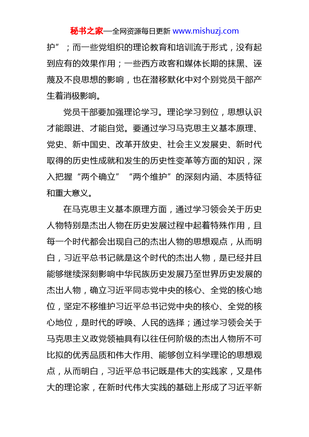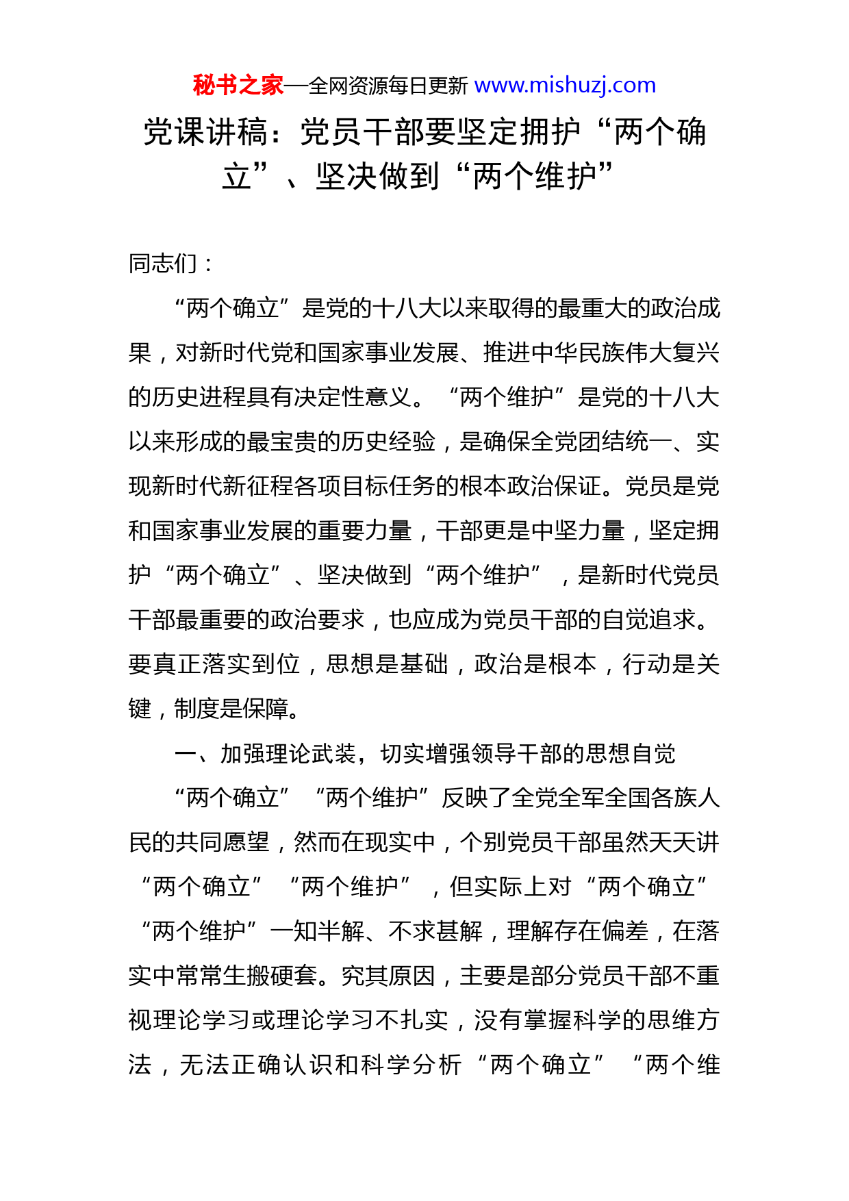 秘书之家—全网资源每日更新www.mishuzj.com党课讲稿:党员干部要坚定拥护“两个确立”、坚决做到“两个维护”同志们:“两个确立”是党的十八大以来取得的最重大的政治成果,对新时代党和国家事业发展、推进中华民族伟大复兴的历史进程具有决定性意义。“两个维护”是党的十八大以来形成的最宝贵的历史经验,是确保全党团结统一、实现新时代新征程各项目标任务的根本政治保证。党员是党和国家事业发展的重要力量,干部更是中坚力量,坚定拥护“两个确立”、坚决做到“两个维护”,是新时代党员干部最重要的政治要求,也应成为党员干部的自觉追求。要真正落实到位,思想是基础,政治是根本,行动是关键,制度是保障。一、加强理论武装,切实增强领导干部的思想自觉“两个确立”“两个维护”反映了全党全军全国各族人民的共同愿望,然而在现实中,个别党员干部虽然天天讲“两个确立”“两个维护”,但实际上对“两个确立”“两个维护”一知半解、不求甚解,理解存在偏差,在落实中常常生搬硬套。究其原因,主要是部分党员干部不重视理论学习或理论学习不扎实,没有掌握科学的思维方法,无法正确认识和科学分析“两个确立”“两个维秘书之家—全网资源每日更新www.mishuzj.com护”;而一些党组织的理论教育和培训流于形式,没有起到应有的效果作用;一些西方政客和媒体长期的抹黑、诬蔑及不良思想的影响,也在潜移默化中对个别党员干部产生着消极影响。党员干部要加强理论学习。理论学习到位,思想认识才能跟进、才能自觉。要通过学习马克思主义基本原理、党史、新中国史、改革开放史、社会主义发展史、新时代取得的历史性成就和发生的历史性变革等方面的知识,深入把握“两个确立”“两个维护”的深刻内涵、本质特征和重大意义。在马克思主义基本原理方面,通过学习领会关于历史人物特别是杰出人物在历史发展过程中起着特殊作用,且每一个时代都会出现自己的杰出人物的思想观点,从而明白,习近平总书记就是这个时代的杰出人物,是已经并且能够继续深刻影响中华民族历史发展乃至世界历史发展的杰出人物,确立习近平同志党中央的核心、全党的核心地位,坚定不移维护习近平总书记党中央的核心、全党的核心地位,是时代的呼唤、人民的选择;通过学习领会关于马克思主义政党领袖具有以往任何阶级的杰出人物所不可比拟的优秀品质和伟大作用、能够创立科学理论的思想观点,从而明白,习近平总书记既是伟大的实践家,又是伟大的理论家,在新时代伟大实践的基础上形成了习近平新秘书之家—全网资源每日更新www.mishuzj.com时代中国特色社会主义思想,实现了马克思主义中国化新的飞跃,这同样是时代的呼唤、人民的选择;通过学习领会关于马克思主义政党必须坚定不移地维护领袖权威的思想观点,从而明白,坚定拥护“两个确立”、坚决做到“两个维护”是全党的最高政治原则,也应该成为所有党员干部必须承担的根本政治责任。通过学习党史、新中国史、改革开放史、社会主义发展史的相关知识,从而明白,“两个确立”“两个维护”是深刻总结党的百年奋斗尤其是党的十八大以来伟大实践得出的重大历史结论和历史经验,“两个确立”“两个维护”具有历史的必然性。通过学习党的十八大以来党和国家事业取得历史性成就、发生历史性变革的相关知识,从而明白,习近平总书记作为马克思主义政治家、思想家、战略家,具有非凡的理论勇气、卓越的政治智慧、强烈的使命担当,是当之无愧的党的核心,是赢得全党全国各族人民衷心拥护与爱戴的人民领袖;习近平新时代中国特色社会主义思想是坚持把马克思主义基本原理同中国具体实际相结合、同中华优秀传统文化相结合,能够指导党和国家事业不断取得新的伟大成就的科学理论。强化对党员干部的理论教育和培训。要充分发挥我们党善于进行党内集中学习教育的优势,围绕“两个确立”秘书之家—全网资源每日更新www.mishuzj.com“两个维护”开展专门的党内集中学习教育活动,或者在其他党内集中学习教育活动中将“两个确立”“两个维护”作为核心内容,实现“两个确立”“两个维护”的党内学习教育常态化,让广大党员干部处于持续“充电”状态,从而帮助他们深刻领悟“两个确立”的内涵及其决定性意义,深刻领会“两个维护”的根本性作用。要充分发挥各级各类党校、行政学院、干部学院等机构的作用,针对一些重点领域、重点部门、重点岗位的党员干部围绕“两个确立”“两个维护”开展全覆盖的教育培训。教育培训的方式方法应丰富多样,内容应讲全讲准、讲深讲透。要严格教育培训的考核,保证质量和效果,防止教育培训流于形式、走过场。教育培训既要注重提高党员干部对“两个确立”“两个维护”的理论认识,也要注重提升党员干部的思维能力,从而增强他们落实“两个确立”“两个维护”的本领。特别是当前,党员干部应将围绕“两个确立”“两个维护”的理论学习,各级党组织应将围绕“两个确立”“两个维护”的教育培训,作为重大政治任务,尽可能地提高党员干部的理论素养,切实增强他们拥护“两个确立”、做到“两个维护”的思想自觉。只有拥有思想上的高度认同,才有政治上的绝对忠诚及行动上的坚定拥护。二、锤炼