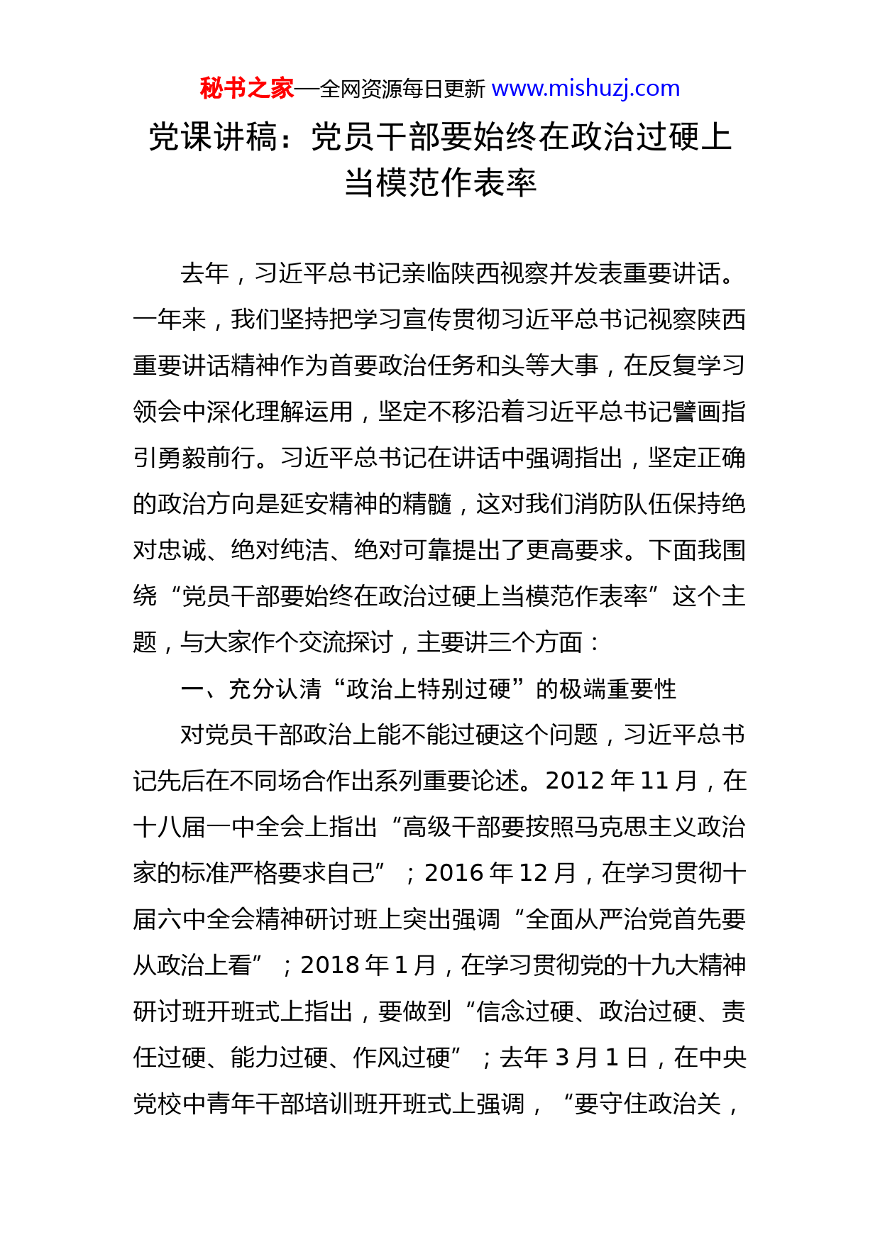 秘书之家—全网资源每日更新www.mishuzj.com党课讲稿:党员干部要始终在政治过硬上当模范作表率去年,习近平总书记亲临陕西视察并发表重要讲话。一年来,我们坚持把学习宣传贯彻习近平总书记视察陕西重要讲话精神作为首要政治任务和头等大事,在反复学习领会中深化理解运用,坚定不移沿着习近平总书记譬画指引勇毅前行。习近平总书记在讲话中强调指出,坚定正确的政治方向是延安精神的精髓,这对我们消防队伍保持绝对忠诚、绝对纯洁、绝对可靠提出了更高要求。下面我围绕“党员干部要始终在政治过硬上当模范作表率”这个主题,与大家作个交流探讨,主要讲三个方面:一、充分认清“政治上特别过硬”的极端重要性对党员干部政治上能不能过硬这个问题,习近平总书记先后在不同场合作出系列重要论述。2012年11月,在十八届一中全会上指出“高级干部要按照马克思主义政治家的标准严格要求自己”;2016年12月,在学习贯彻十届六中全会精神研讨班上突出强调“全面从严治党首先要从政治上看”;2018年1月,在学习贯彻党的十九大精神研讨班开班式上指出,要做到“信念过硬、政治过硬、责任过硬、能力过硬、作风过硬”;去年3月1日,在中央党校中青年干部培训班开班式上强调,“要守住政治关,秘书之家—全网资源每日更新www.mishuzj.com时刻绷紧旗帜鲜明讲政治这根弦”。学习领会习近平总书记这一系列重要论述,我感到,充分认清“政治上特别过硬”的极端重要性,可以从四个方面来理解把握:(一)“政治上特别过硬”是确保对党绝对忠诚最重要的基石。习近平总书记指出:“对党忠诚,是共产党人首要的政治品质。”我军一路走来,无论形势多么险恶,从来没有一支成建制的部队被策反、被拉走;无论野心家多么狡诈,篡夺军权的图谋一次也没有得逞;无论政治考验多么严峻,军队总能与党同心同德。从中我们不难发现,政治上不过硬,对党忠诚就难以做到“绝对”。我们作为消防队伍,一举一动彰显党的意志,一岗一警牵涉政治大局,要在“为谁执政、为谁执法”这个问题上立场特别坚定、态度特别鲜明、行动特别坚决,确保执政为民、执政为公。(二)“政治上特别过硬”是适应形势任务变化最根本的遵循。从党的十八大至今,是进入新时代的10年,是迈入强国新征程的10年,无论是外部社会环境还是使命任务要求,都发生了深刻变化,唯有不断提高“政治三力”,才能科学把握形势变化、精准识别现象本质、清醒明辨行为是非、有效抵御风险挑战。当前乃至今后一段时期,面对国际形势风云变幻、中美战略博弈升级和重要方向形势复杂多变的实际,我们必须深刻认识到,可能担负秘书之家—全网资源每日更新www.mishuzj.com的任务将会更加艰巨,面临的风险挑战将会更多,对我们坚持捍卫“两个确立”的政治要求更高,必须时刻保持政治上的绝对清醒,不断强化政治意识、坚定政治立场、增强政治自觉,准确识变、科学应变、主动求变,才能快速适应形势的发展变化,做到任何时候任何情况下都信得过、顶得上、靠得住。(三)“政治上特别过硬”是党员干部为官从政最基本的品质。我们每名党员干部都处在为官从政的重要位置,组织上把我们放在领导岗位上,实际上就把一个单位、一个部门、一个团队的发展前途交到了我们手上。能否做到政治过硬,尽心尽责把党交给的任务落到实处,这绝不是个人的小事,而是关乎全局的大事。党员干部只有在政治过硬这一条上过了关,才能在其他方面施展好才干;而那些政治上不合格、想混入党内捞好处的人,一个都不会要、一个都不能留。我们生逢伟大时代,个人事业要稳步发展,就必须守住政治过硬这个立身之本,常修为政之德、常思肩头之责、常紧纪法之弦,加强磨砺锤炼,努力成为忠诚可靠、廉洁有为的中流紙柱。二、对标“政治上特别过硬”标准解决突出矛盾问题当前,我们绝大部分同志对待讲政治问题,在认识上是清醒的,在行动上是坚决的,总体上是过硬的。但深刻反思总结,还存在一些模糊观念和错误认识,很容易导致秘书之家—全网资源每日更新www.mishuzj.com观念上的动摇、行动上的迟疑,甚至引发政治性问题。结合支队实际,我列举6个方面问题,供大家对照检视:一是着力解决“颓、息、迷”的问题,进一步坚定理想信念。当前,社会处在深刻转型期,浮躁心态成了一种通病。从我们单位看,这种心态在党员干部中也有不少,根源上是理想信念不够坚定,心中没有“主心骨”。这里有三句话和大家共勉:第一,心动不如行动。当前,个别同志“自我设计”“自我循环”,“位子等着好好干,没有位子减一半”“小荷才露尖尖角,就向组织要说法”。有的认为自己“高学历”“高起点”,眼高手低、贪大喜功,能力配不上野心、才华配不上梦想。有的认为单位条件艰苦,总想怎么“活动活动”调到其他单位,沉不下心、扎不下去、吃不了苦。追求进步是人之常情,也是前进的动力,但如果心浮气躁就可能一事无成,只有“耐得烦、受得苦、忍得气”,才能“云开见月明”。第二,躺平不会躺赢。有的同志幻想钱多事少离家近、位高权重责任轻,只想当官不想干事,只想出彩不想出力;有的遇事绕道走、推谈甩责任,导致落实制度有欠账、推进工作低标准、完成任务打折扣。现实一再告诉我们:生活从不眷顾因循守旧、满足现状者,从不