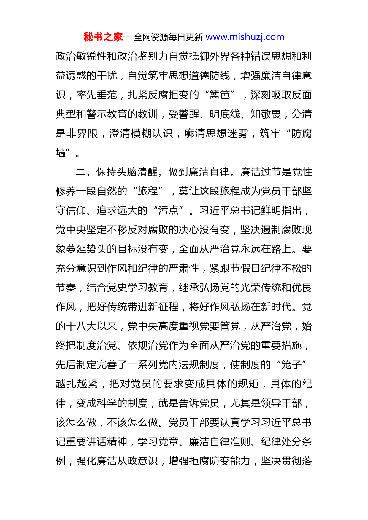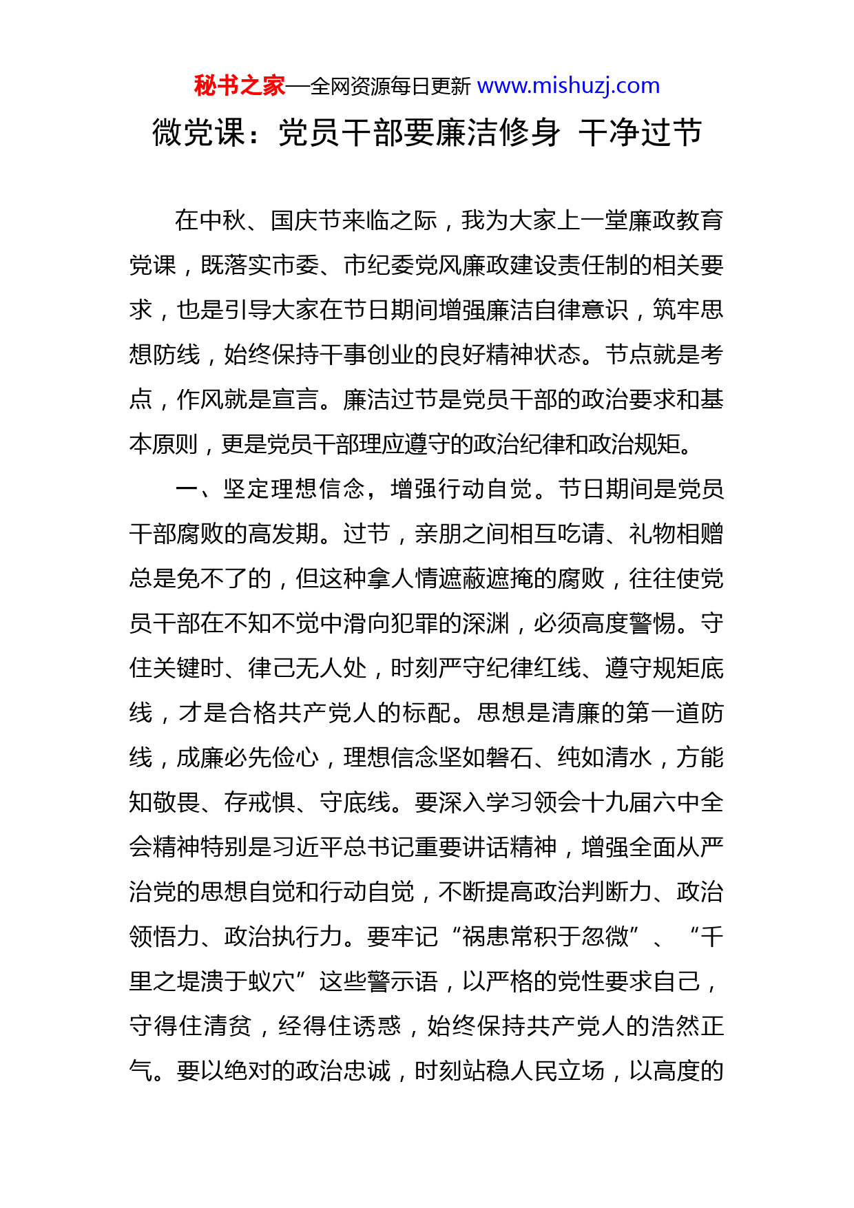 秘书之家—全网资源每日更新www.mishuzj.com微党课:党员干部要廉洁修身干净过节在中秋、国庆节来临之际,我为大家上一堂廉政教育党课,既落实市委、市纪委党风廉政建设责任制的相关要求,也是引导大家在节日期间增强廉洁自律意识,筑牢思想防线,始终保持干事创业的良好精神状态。节点就是考点,作风就是宣言。廉洁过节是党员干部的政治要求和基本原则,更是党员干部理应遵守的政治纪律和政治规矩。一、坚定理想信念,增强行动自觉。节日期间是党员干部腐败的高发期。过节,亲朋之间相互吃请、礼物相赠总是免不了的,但这种拿人情遮蔽遮掩的腐败,往往使党员干部在不知不觉中滑向犯罪的深渊,必须高度警惕。守住关键时、律己无人处,时刻严守纪律红线、遵守规矩底线,才是合格共产党人的标配。思想是清廉的第一道防线,成廉必先俭心,理想信念坚如磐石、纯如清水,方能知敬畏、存戒惧、守底线。要深入学习领会十九届六中全会精神特别是习近平总书记重要讲话精神,增强全面从严治党的思想自觉和行动自觉,不断提高政治判断力、政治领悟力、政治执行力。要牢记“祸患常积于忽微”、“千里之堤溃于蚁穴”这些警示语,以严格的党性要求自己,守得住清贫,经得住诱惑,始终保持共产党人的浩然正气。要以绝对的政治忠诚,时刻站稳人民立场,以高度的秘书之家—全网资源每日更新www.mishuzj.com政治敏锐性和政治鉴别力自觉抵御外界各种错误思想和利益诱惑的干扰,自觉筑牢思想道德防线,增强廉洁自律意识,率先垂范,扎紧反腐拒变的“篱笆”,深刻吸取反面典型和警示教育的教训,受警醒、明底线、知敬畏,分清是非界限,澄清模糊认识,廓清思想迷雾,筑牢“防腐墙”。二、保持头脑清醒,做到廉洁自律。廉洁过节是党性修养一段自然的“旅程”,莫让这段旅程成为党员干部坚守信仰、追求远大的“污点”。习近平总书记鲜明指出,党中央坚定不移反对腐败的决心没有变,坚决遏制腐败现象蔓延势头的目标没有变,全面从严治党永远在路上。要充分意识到作风和纪律的严肃性,紧跟节假日纪律不松的节奏,结合党史学习教育,继承弘扬党的光荣传统和优良作风,把好传统带进新征程,将好作风弘扬在新时代。党的十八大以来,党中央高度重视党要管党,从严治党,始终把制度治党、依规治党作为全面从严治党的重要措施,先后制定完善了一系列党内法规制度,使制度的“笼子”越扎越紧,把对党员的要求变成具体的规矩,具体的纪律,变成科学的制度,就是告诉党员,尤其是领导干部,该怎么做,不该怎么做。党员干部要认真学习习近平总书记重要讲话精神,学习党章、廉洁自律准则、纪律处分条例,强化廉洁从政意识,增强拒腐防变能力,坚决贯彻落秘书之家—全网资源每日更新www.mishuzj.com实中央八项规定,严守廉洁底线、纪律红线,谨记廉洁过节纪律要求,时刻警钟长鸣,不断增强对纪律的敬畏感以及对新时代的使命感,让遵规守纪、清廉过节成为行动自觉。要严格执行中央及各级党委、纪委的要求,认真落实中央八项规定精神,不该吃的坚决不吃,不该用的坚决不用,不该拿的坚决不拿,不该去的地方坚决不去。要严格自律,管好自己的手,不该拿的不拿;管好自己的口,不该吃的不吃;管好自己的腿,不该去的不去;管好自己的心,不该贪的不贪,始终保持清廉本色。三、带头廉洁过节,营造风清气正。古人云,其身正,不令而行,其身不正,虽令不从。党员干部在节日期间更应严以律己,守住纪律底线,经得起诱惑,把握好交往界限,牢牢堵上“礼尚往来”的旁门左道,不为物欲所累,真正从容过节。要自觉用党风廉政建设思想正身修己,积极借鉴我国历史上优秀廉政文化,传承红色廉政文化基因,守住底线,不越红线,不碰高压线。不仅要做到自己廉,还要做到班子廉,分管领域廉,身边人员、家属廉,这是领导干部应有的职责,尤其在“中秋节、国庆节”之际,一定要落实“一岗双责”,主动加强对自己家庭成员的廉洁教育,多念“廉政经”,多吹“清正风”,多向亲朋好友灌输廉洁过节的重要性,使廉洁风尚为自己和身边人保驾护航,共同筑起拒腐防变的稳固防线,切实秘书之家—全网资源每日更新www.mishuzj.com做到守土有责、守土负责、守土尽责,全面营造风清气正的节日环境。