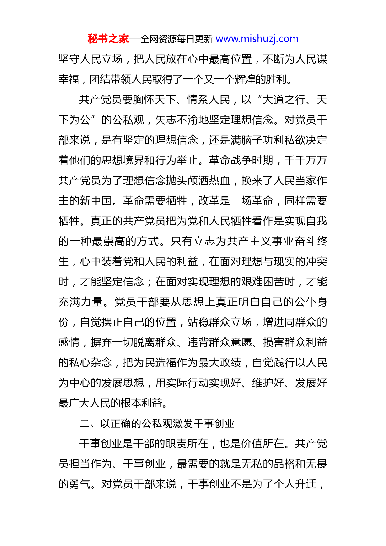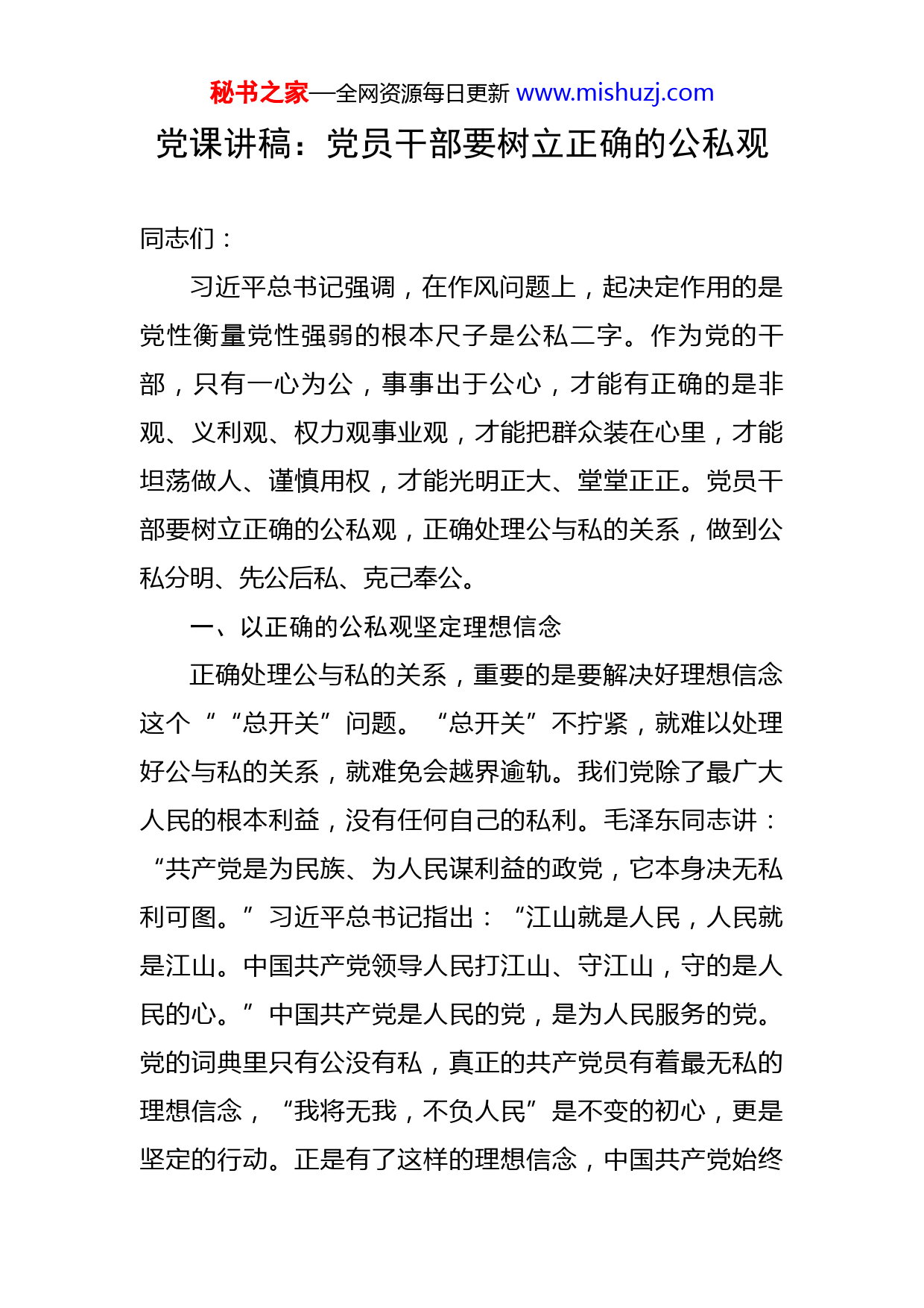 秘书之家—全网资源每日更新www.mishuzj.com党课讲稿:党员干部要树立正确的公私观同志们:习近平总书记强调,在作风问题上,起决定作用的是党性衡量党性强弱的根本尺子是公私二字。作为党的干部,只有一心为公,事事出于公心,才能有正确的是非观、义利观、权力观事业观,才能把群众装在心里,才能坦荡做人、谨慎用权,才能光明正大、堂堂正正。党员干部要树立正确的公私观,正确处理公与私的关系,做到公私分明、先公后私、克己奉公。一、以正确的公私观坚定理想信念正确处理公与私的关系,重要的是要解决好理想信念这个““总开关”问题。“总开关”不拧紧,就难以处理好公与私的关系,就难免会越界逾轨。我们党除了最广大人民的根本利益,没有任何自己的私利。毛泽东同志讲:“共产党是为民族、为人民谋利益的政党,它本身决无私利可图。”习近平总书记指出:“江山就是人民,人民就是江山。中国共产党领导人民打江山、守江山,守的是人民的心。”中国共产党是人民的党,是为人民服务的党。党的词典里只有公没有私,真正的共产党员有着最无私的理想信念,“我将无我,不负人民”是不变的初心,更是坚定的行动。正是有了这样的理想信念,中国共产党始终秘书之家—全网资源每日更新www.mishuzj.com坚守人民立场,把人民放在心中最高位置,不断为人民谋幸福,团结带领人民取得了一个又一个辉煌的胜利。共产党员要胸怀天下、情系人民,以“大道之行、天下为公”的公私观,矢志不渝地坚定理想信念。对党员干部来说,是有坚定的理想信念,还是满脑子功利私欲决定着他们的思想境界和行为举止。革命战争时期,千千万万共产党员为了理想信念抛头颅洒热血,换来了人民当家作主的新中国。革命需要牺牲,改革是一场革命,同样需要牺牲。真正的共产党员把为党和人民牺牲看作是实现自我的一种最崇高的方式。只有立志为共产主义事业奋斗终生,心中装着党和人民的利益,在面对理想与现实的冲突时,才能坚定信念;在面对实现理想的艰难困苦时,才能充满力量。党员干部要从思想上真正明白自己的公仆身份,自觉摆正自己的位置,站稳群众立场,增进同群众的感情,摒弃一切脱离群众、违背群众意愿、损害群众利益的私心杂念,把为民造福作为最大政绩,自觉践行以人民为中心的发展思想,用实际行动实现好、维护好、发展好最广大人民的根本利益。二、以正确的公私观激发干事创业干事创业是干部的职责所在,也是价值所在。共产党员担当作为、干事创业,最需要的就是无私的品格和无畏的勇气。对党员干部来说,干事创业不是为了个人升迁,秘书之家—全网资源每日更新www.mishuzj.com不是为了一家老小的小日子,而是为党和国家奋斗,为一方百姓谋福利,为党分忧为国尽责、为民奉献。公私分明是基本操守,公而忘私是崇高境界。公私分明、公而忘私,甘于奉献,善于推动、敢于揽过,这是成事之本;公而无私,干干净净做事,坚持为群众谋福利,密切联系群众,这是创业之基。党员干部要树立正确政绩观,坚持为党干事、为民创业,只有把个人发展融入党和人民事业之中,才能拥有高尚、充实的人生。干事创业要以大局为重、以人民为重,摒弃私心杂念,必须始终服从党和国家大局、服务人民的利益,紧密围绕发展主题聚精会神搞建设、一心一意谋发展。党员干部树立正确的公私观,既需要持续的理论学习、自我修炼和党内政治文化熏陶,更需要在现实的公私行为的选择中接受考验。“世界上最大的幸福莫过于为人民幸福而奋斗”,党员干部要用正确的幸福观看待干事创业、处理公与私的关系,懂得“干部辛苦一点,百姓才能幸福一点”的道理,为群众实干、干出实绩,用自己的辛苦指数换取人民群众的幸福指数。三、以正确的公私观规范履职用权履职用权能否做到公私分明,是对党员干部公私观的重要考验。党员干部掌握着一定的权力,能否树立正确的权力观,把握好公与私的界限,不仅关系党员干部的个人秘书之家—全网资源每日更新www.mishuzj.com前途,更直接关乎国家安宁和政权稳定。纵观许多“落马”官员的腐败堕落轨迹都有不能正确处理公私关系的原因,他们一再越界越轨,最后走向深渊。习近平总书记曾深刻指出:“作风问题都与公私问题有联系,都与公款、公权有关系。公款姓公,一分一厘都不能乱花!公权为民,一丝一毫都不能私用。”党员干部要始终牢记权为民所赋、权为民所用、利为民所谋。要清醒认识到党和人民赋予党员干部的权力,只能用来为党分忧、为国干事、为民谋利,始终做人民公仆,为人民服务。此外,必须把握好公与私、情与理的尺度,绝不允许自己包括家人和身边工作人员利用职务之便,突破公私界限、以权谋私,更不允许因私废公,甚至因私害公。要坚持公权不为私用,正确行使权力,做到依法用权、秉公用权、廉洁用权,做到法定职责必须为、法无授权不可为,保持如临深渊、如履薄冰的谨慎,做到心有所畏、言有所戒、行有所止。四、以正确的公私观对待名利得失看淡个人得失、看开功名利禄,是树立正确公私观的重要体现。和平年代,生与死、血与火的考验相对少了,名与利、得与失的考验却无处不在。共产党员既有高尚的追求和崇高的情怀,也是普普通通、有血有肉、食人间烟火的平常人,是具体的、现实的社会人,也存在
