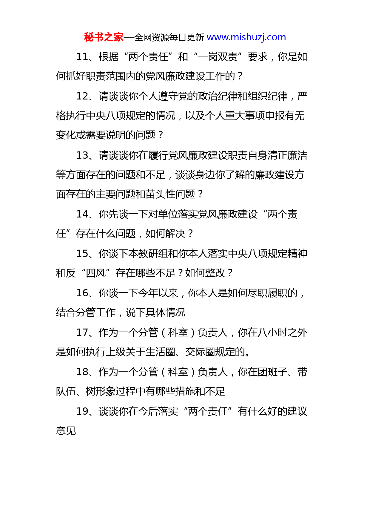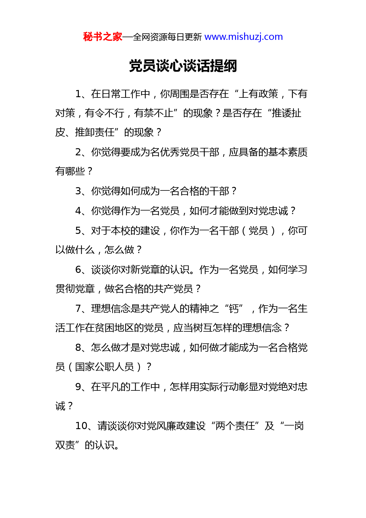 秘书之家—全网资源每日更新www.mishuzj.com党员谈心谈话提纲1、在日常工作中,你周围是否存在“上有政策,下有对策,有令不行,有禁不止”的现象?是否存在“推诿扯皮、推卸责任”的现象?2、你觉得要成为名优秀党员干部,应具备的基本素质有哪些?3、你觉得如何成为一名合格的干部?4、你觉得作为一名党员,如何才能做到对党忠诚?5、对于本校的建设,你作为一名干部(党员),你可以做什么,怎么做?6、谈谈你对新党章的认识。作为一名党员,如何学习贯彻党章,做名合格的共产党员?7、理想信念是共产党人的精神之“钙”,作为一名生活工作在贫困地区的党员,应当树互怎样的理想信念?8、怎么做才是对党忠诚,如何做才能成为一名合格党员(国家公职人员)?9、在平凡的工作中,怎样用实际行动彰显对党绝对忠诚?10、请谈谈你对党风廉政建设“两个责任”及“一岗双责”的认识。秘书之家—全网资源每日更新www.mishuzj.com11、根据“两个责任”和“一岗双责”要求,你是如何抓好职责范围内的党风廉政建设工作的?12、请谈谈你个人遵守党的政治纪律和组织纪律,严格执行中央八项规定的情况,以及个人重大事项申报有无变化或需要说明的问题?13、请谈谈你在履行党风廉政建设职责自身清正廉洁等方面存在的问题和不足,谈谈身边你了解的廉政建设方面存在的主要问题和苗头性问题?14、你先谈一下对单位落实党风廉政建设“两个责任”存在什么问题,如何解决?15、你谈下本教研组和你本人落实中央八项规定精神和反“四风”存在哪些不足?如何整改?16、你谈一下今年以来,你本人是如何尽职履职的,结合分管工作,说下具体情况17、作为一个分管(科室)负责人,你在八小时之外是如何执行上级关于生活圈、交际圈规定的。18、作为一个分管(科室)负责人,你在团班子、带队伍、树形象过程中有哪些措施和不足19、谈谈你在今后落实“两个责任”有什么好的建议意见秘书之家—全网资源每日更新www.mishuzj.com20、谈一谈你对个人的职业成长是如何规划的,现在事业单位人员离岗创业势态发展如火如荼,你本人有何意愿?21、你知道“四大纪律、八项要求”的内容是什么?22、你知道领导干部“六个不准”的具体内容吗?23、你知道我校领导干部外出请示报告制度吗?24、你学习过《关于加强对学校各级党政王要负责人临督的实施办法》?25、请汇报你任职以来的廉洁自律情况?26、谈谈领导班子和党员干部在“四风”方面存在的突出问题。27、你觉得党员应该如何发挥自己的示范引领作用?。28、谈谈你对党的“两学一做”学习教育制度化常态化活动的认识及巩固和扩大活动成果的意见建议。29、谈谈如何以身作则,明确示范带头责任,做好自己的工作。30、作为党员、你认为如何发挥自身作用,为企业经营管理工作贡献力量。31、你在日常工作中存在哪些困难?32、你认为如何影响和带动身边的非党员群众共同推动教育的发展。33、你是否还记得自己的入党时间和转正时间?秘书之家—全网资源每日更新www.mishuzj.com34、你对支部的工作有什么好的意见和建议吗?35、什么是“一岗双责”?本地区本单位党风廉政建设第一责任人履行“一岗双责”情况你了解吗?36、你是如何发挥党员先锋模范作用的?37、在日常生活中你是怎么样提高自身党性修养的?38、你认为合格党员的基本标准是什么?39、你是如何将做名合格党员和日常服务工作相结合的?40、对党支部、党员个人有何意见和建议?41、你认为自身在做合格党员方面存在哪些问题,你准备采取哪些措施更正这些问题?42、开展“讲严立”专题警示教育活动以来,你从中学习教育中认识到了什么?43、按照党支部计划安排,今天,我们俩谈谈心,交流下对开展“深入学习十九大精神”活动的认识。44、谈谈你在进一步明确责任,履行好“一岗双责”和如何进一步推进党风廉政建设反腐败工作万面的情况。45、根据安排,我们两个谈谈心,交流下对党建工作开展的认识,你先说说吧。根据上级要求和我行开展学习十九大精神安排,今天,我们俩谈谈心,交流一下对十九大精神的认识?秘书之家—全网资源每日更新www.mishuzj.com47、对照新《党章》要求,您觉得党支部以及党员在工作作风上存在哪些突出问题。48、您对党支部及成员在贯彻落实中央“八项规定”和省委、市委关于改进工作作风、密切联系群众有关规定的总体评价如何。49、对照省委、市委关于“四风”突出可题的表现,你认为目前党支部及成员,以及党员在“四风”方面存在哪些突出问题?50、您对党员干部在履行党员义务立足岗位发挥作用、完成党组织交给的任务等情况的总体如何?51、您对推动教育实践活动与机关党建工作相互促进,促进服务型基层党组织建设确哪些意见和建议?52、“两学一做”学习教育的概念是什么?自开展“两学一做”学习教育以来,你从中学到了什么?53、作为一名中层管理人员,谈一谈你本人去年作出哪些突出成绩,个人有哪些长处和优点,目前存在哪些不足,下步如何改进。54、谈谈你对本校基层管理的意见和建议,还存在哪些突出问题?55、开展“两学一做”活动以来,你从“两学一做”学习教育中认识到了什么?秘书之家—全网资源每日更新www.mishuzj.com56、简单谈一谈你对学校考核体系和激励机制的想法?57、学校最近总体情况怎么样?58、学校有哪些突出