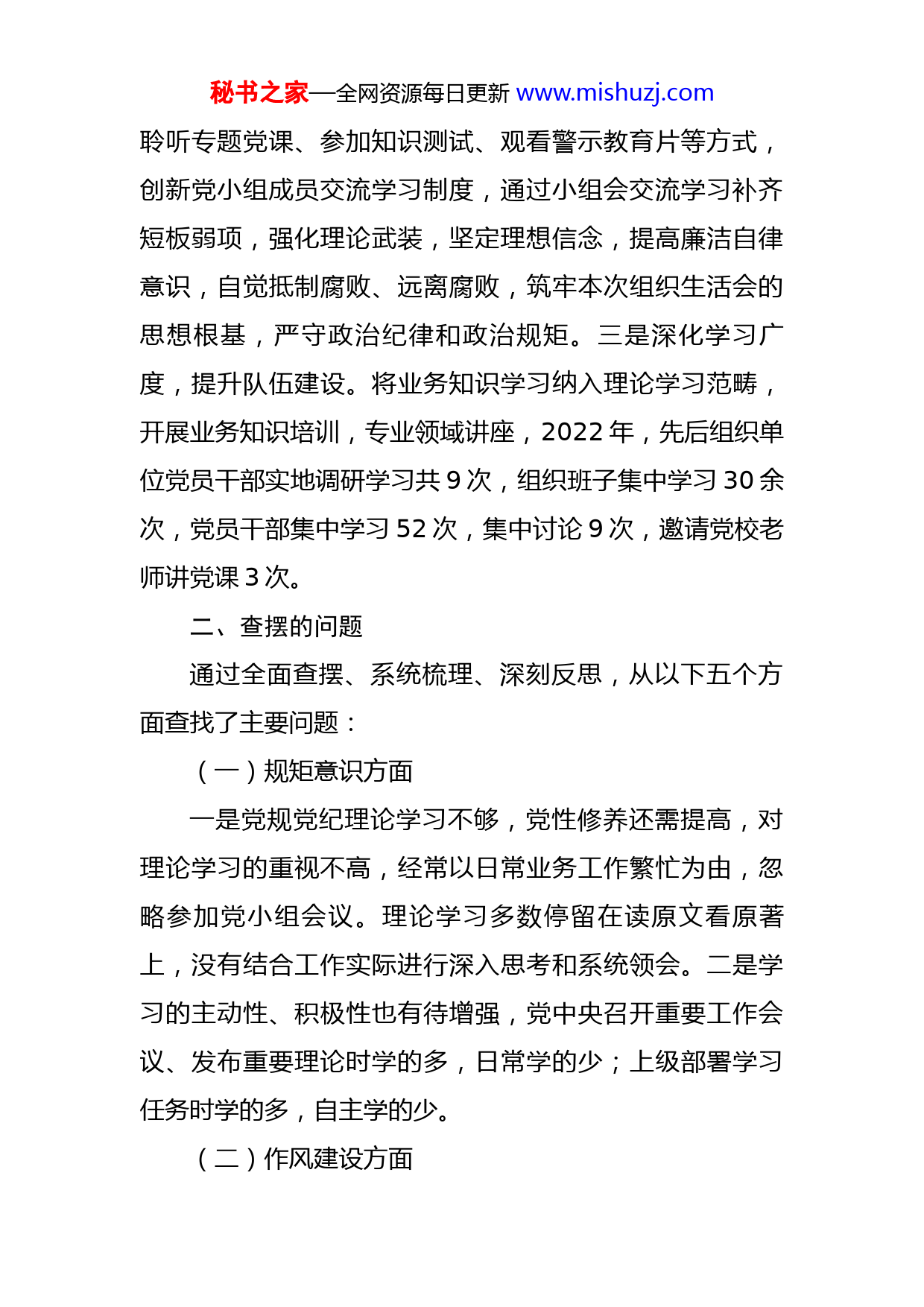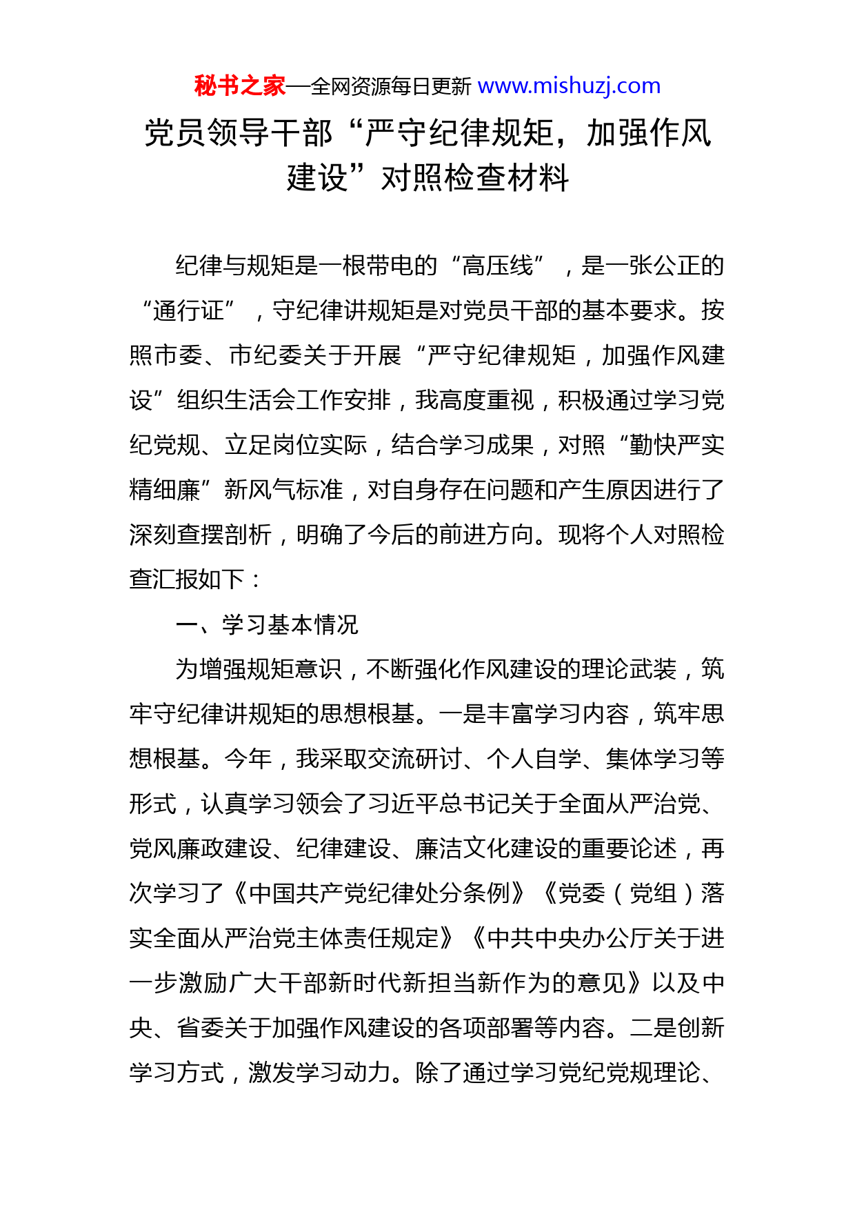 秘书之家—全网资源每日更新www.mishuzj.com党员领导干部“严守纪律规矩,加强作风建设”对照检查材料纪律与规矩是一根带电的“高压线”,是一张公正的“通行证”,守纪律讲规矩是对党员干部的基本要求。按照市委、市纪委关于开展“严守纪律规矩,加强作风建设”组织生活会工作安排,我高度重视,积极通过学习党纪党规、立足岗位实际,结合学习成果,对照“勤快严实精细廉”新风气标准,对自身存在问题和产生原因进行了深刻查摆剖析,明确了今后的前进方向。现将个人对照检查汇报如下:一、学习基本情况为增强规矩意识,不断强化作风建设的理论武装,筑牢守纪律讲规矩的思想根基。一是丰富学习内容,筑牢思想根基。今年,我采取交流研讨、个人自学、集体学习等形式,认真学习领会了习近平总书记关于全面从严治党、党风廉政建设、纪律建设、廉洁文化建设的重要论述,再次学习了《中国共产党纪律处分条例》《党委(党组)落实全面从严治党主体责任规定》《中共中央办公厅关于进一步激励广大干部新时代新担当新作为的意见》以及中央、省委关于加强作风建设的各项部署等内容。二是创新学习方式,激发学习动力。除了通过学习党纪党规理论、秘书之家—全网资源每日更新www.mishuzj.com聆听专题党课、参加知识测试、观看警示教育片等方式,创新党小组成员交流学习制度,通过小组会交流学习补齐短板弱项,强化理论武装,坚定理想信念,提高廉洁自律意识,自觉抵制腐败、远离腐败,筑牢本次组织生活会的思想根基,严守政治纪律和政治规矩。三是深化学习广度,提升队伍建设。将业务知识学习纳入理论学习范畴,开展业务知识培训,专业领域讲座,2022年,先后组织单位党员干部实地调研学习共9次,组织班子集中学习30余次,党员干部集中学习52次,集中讨论9次,邀请党校老师讲党课3次。二、查摆的问题通过全面查摆、系统梳理、深刻反思,从以下五个方面查找了主要问题:(一)规矩意识方面一是党规党纪理论学习不够,党性修养还需提高,对理论学习的重视不高,经常以日常业务工作繁忙为由,忽略参加党小组会议。理论学习多数停留在读原文看原著上,没有结合工作实际进行深入思考和系统领会。二是学习的主动性、积极性也有待增强,党中央召开重要工作会议、发布重要理论时学的多,日常学的少;上级部署学习任务时学的多,自主学的少。(二)作风建设方面秘书之家—全网资源每日更新www.mishuzj.com一是严实作风待于进一步加强。在上级文件部署和交办工作多时,疲于应付,以致有的工作存在以会议落实会议、以文件落实文件现象,虽然每项工作都进行了部署安排,缺乏亲自督办督促,只依靠科室和基层抓好落实,以致部分工作任务的完成效果不佳。二是统筹大局意识不强。没有科学处理好分管工作与单位整体工作的关系,对分管科室的工作就关注多一些,其他科室的工作就很少过问。三是形式主义有抬头倾向。特别在履行路长制、治污减霾巡查等工作时,没有能够认真坚持,有时只是拍拍照片,发发美篇,流于形式,没有真正的入脑入心,落实效果,有时只求过的去,不求过的硬。(三)担当负责方面一是攻坚克难毅力有待加强。对上级的决策部署都能态度坚决落实,但行动不够迅速,落实不够全面,效果不够理想,特别是在落实中碰到困难时,积极主动协调、想办法克服的少。在解决基层反映的疑难问题上解决方法不多,路子不活,措施不力。二是争先创优的意识不高。借口工作头绪多、工作经验少,对分管的科室和工作,存在标准不高、要求不严、创新不足等问题。如:在分管的党建工作方面,只求日常工作不出问题,大体上过得去就行了,有几个点能经得起检查就行了,没有深入思考、系统梳理使工作出彩出亮点。秘书之家—全网资源每日更新www.mishuzj.com(四)全面从严治党方面一是自身要求还不是很严。对照合格党员的标准,自己在工作中还有作风不实的现实,汇报思想不够经常,在街道机关支部的建设上投入精力不够,抓的不经常。二是干部管理不严。因分管事情较多,平时把时间和精力放都放在了抓业务工作上,与干部之间沟通交流少,对同志的思想动态了解少;工作要求的多,教方法的少;没有很好地发挥每名党员干部的主观能动性,特别是在对老同志的管理、教育和作用的发挥上方法不多,效果不实。(五)廉洁自律方面能严格执行廉洁自律准则,坚决反对特权思想和特权现象,带头落实中央八项规定和实施办法精神。但在执行各项纪律上还不够严格,对干部监督教育还需加强。艰苦奋斗精神、自律意识有待进一步提高。三、产生问题的原因剖析(一)理想信念和宗旨意识在具体行动上的体现不足一是没有把理论学习放在更重要的位置,对党规党纪的理解认识比较肤浅,缺乏对理论的系统性研究和深刻理解;二是学习的知识不全面,缺乏广度和深度。理论学习有时走形式主义,常把工作当成硬任务,学习变成软任务,缺乏学习的主动性和自觉性。三是把理论转化为实践、用理想信念和宗旨意识约束自己的具体行动不能一时秘书之家—全网资源每日更新www.mishuzj.com一刻地一以贯之,没有体现在每一句话、每一件事、每一项工作上,存在对党的理论知识和相关要求的学习理解存在挂在嘴上、记在心里而行动上体现不足、坚持不好的问题。(二)缺乏攻坚破难的魄力随着