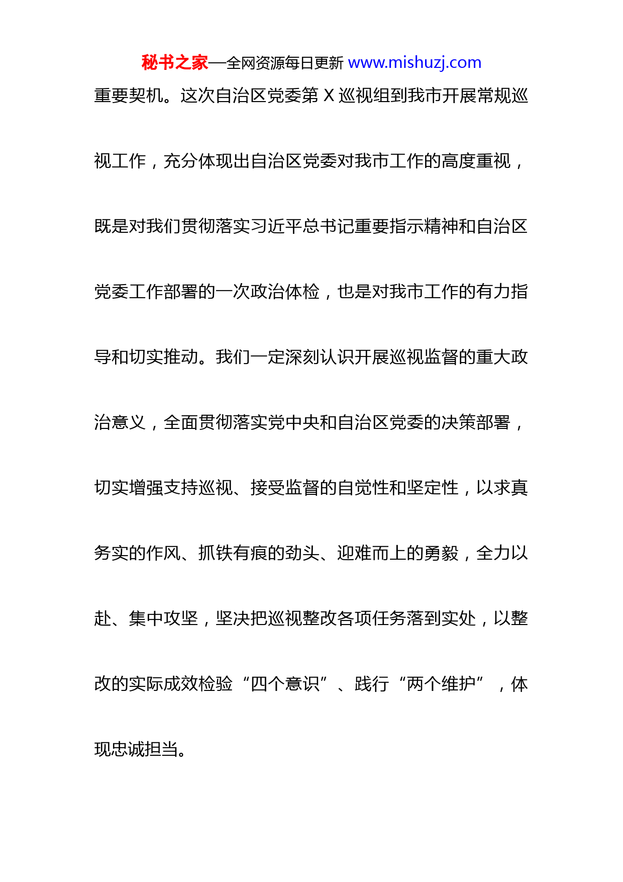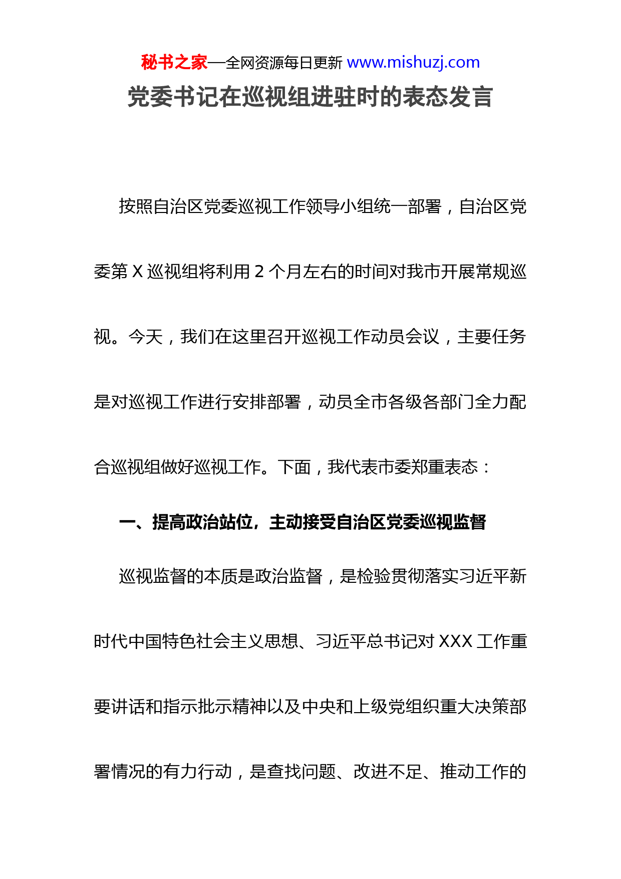 秘书之家—全网资源每日更新www.mishuzj.com党委书记在巡视组进驻时的表态发言按照自治区党委巡视工作领导小组统一部署,自治区党委第X巡视组将利用2个月左右的时间对我市开展常规巡视。今天,我们在这里召开巡视工作动员会议,主要任务是对巡视工作进行安排部署,动员全市各级各部门全力配合巡视组做好巡视工作。下面,我代表市委郑重表态:一、提高政治站位,主动接受自治区党委巡视监督巡视监督的本质是政治监督,是检验贯彻落实习近平新时代中国特色社会主义思想、习近平总书记对XXX工作重要讲话和指示批示精神以及中央和上级党组织重大决策部署情况的有力行动,是查找问题、改进不足、推动工作的秘书之家—全网资源每日更新www.mishuzj.com重要契机。这次自治区党委第X巡视组到我市开展常规巡视工作,充分体现出自治区党委对我市工作的高度重视,既是对我们贯彻落实习近平总书记重要指示精神和自治区党委工作部署的一次政治体检,也是对我市工作的有力指导和切实推动。我们一定深刻认识开展巡视监督的重大政治意义,全面贯彻落实党中央和自治区党委的决策部署,切实增强支持巡视、接受监督的自觉性和坚定性,以求真务实的作风、抓铁有痕的劲头、迎难而上的勇毅,全力以赴、集中攻坚,坚决把巡视整改各项任务落到实处,以整改的实际成效检验“四个意识”、践行“两个维护”,体现忠诚担当。秘书之家—全网资源每日更新www.mishuzj.com二、认真履职尽责,全力保障巡视工作顺利开展做好支持配合自治区党委巡视组开展巡视工作,是我们必须担负的政治责任和应尽义务。我们一定提高认识、端正态度,严格按照巡视组的部署和要求,认真细致做好各项配合服务工作。对巡视组交办的事项、布置的任务、提出的要求,坚决在规定时间内保质保量完成。在汇报和谈话中,客观公正反映情况,决不遮掩问题、决不避重就轻,保证巡视组能够掌握全面真实的情况。要优质高效做好协调服务,认真做好沟通联络、会务保障等相关工作,扎实细致做好食宿、出行、安全等生活服务,为巡视组开展工作提供最便利的条件和最有力的保障。秘书之家—全网资源每日更新www.mishuzj.com三、全面认领问题,通过巡视提升整改成效对巡视组指出的问题和提出的意见建议,我们一定诚恳接受、坚决认领、照单全收,一项一项研究、一件一件核查,采取有力措施,认真整改落实。要以此次巡视为契机,树立问题意识、强化问题导向,在坚决完成巡视反馈问题整改的同时,举一反三,全面梳理排查工作存在的盲点和死角,积极主动把问题查全面、查深入、查细致,对查到的问题无论大小、无论涉及谁,都要严肃认真、不折不扣、真刀真枪进行整治,充分利用这次巡视的有利机遇,推动破坏政治生态的问题得到彻底治理修复,确保整秘书之家—全网资源每日更新www.mishuzj.com改成果经得起历史和实践的检验,向自治区党委交上一份满意答卷。