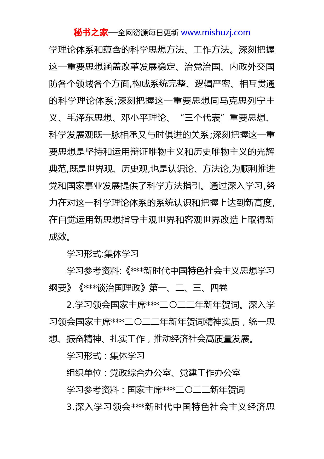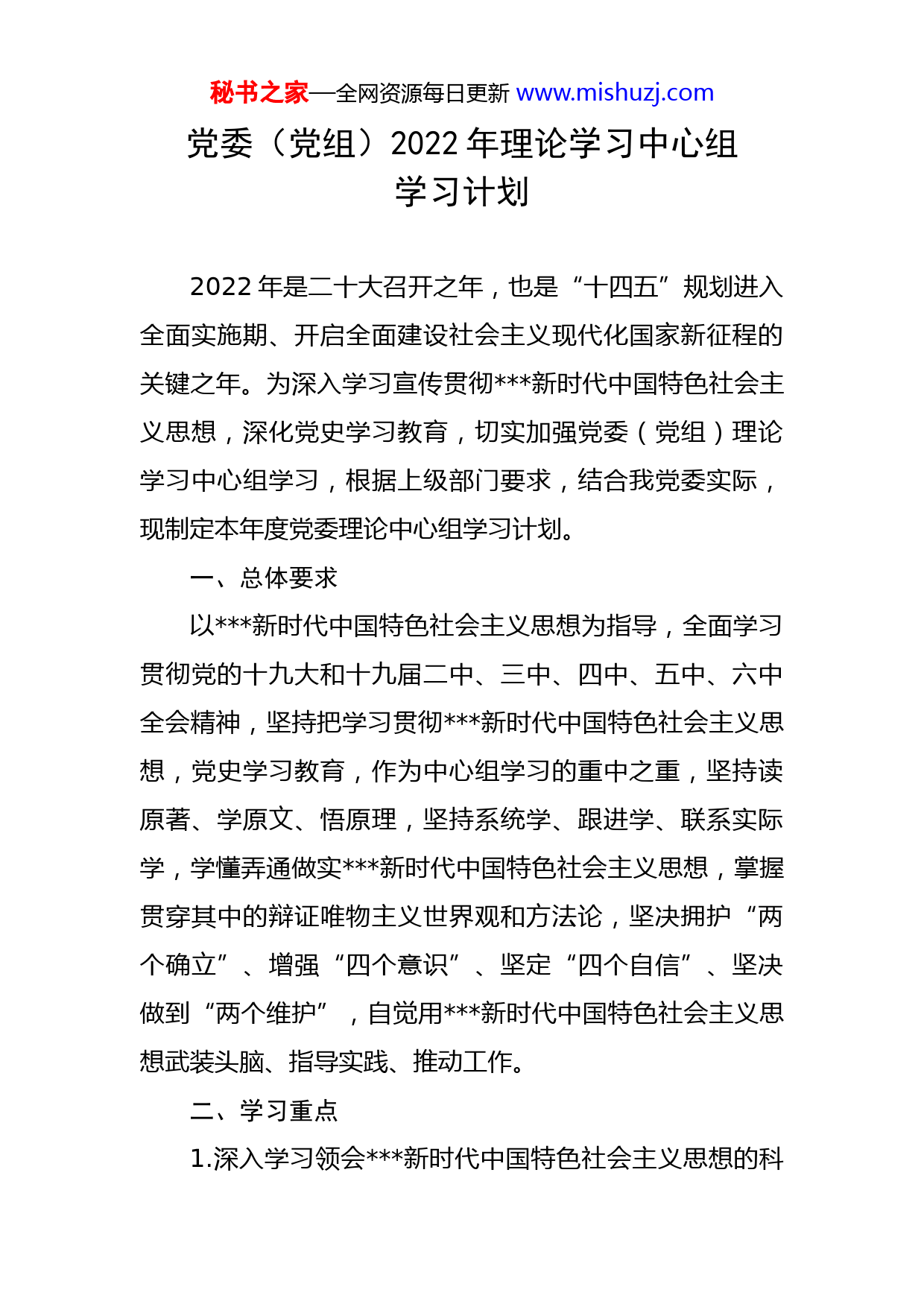 秘书之家—全网资源每日更新www.mishuzj.com党委(党组)2022年理论学习中心组学习计划2022年是二十大召开之年,也是“十四五”规划进入全面实施期、开启全面建设社会主义现代化国家新征程的关键之年。为深入学习宣传贯彻新时代中国特色社会主义思想,深化党史学习教育,切实加强党委(党组)理论学习中心组学习,根据上级部门要求,结合我党委实际,现制定本年度党委理论中心组学习计划。一、总体要求以新时代中国特色社会主义思想为指导,全面学习贯彻党的十九大和十九届二中、三中、四中、五中、六中全会精神,坚持把学习贯彻新时代中国特色社会主义思想,党史学习教育,作为中心组学习的重中之重,坚持读原著、学原文、悟原理,坚持系统学、跟进学、联系实际学,学懂弄通做实新时代中国特色社会主义思想,掌握贯穿其中的辩证唯物主义世界观和方法论,坚决拥护“两个确立”、增强“四个意识”、坚定“四个自信”、坚决做到“两个维护”,自觉用新时代中国特色社会主义思想武装头脑、指导实践、推动工作。二、学习重点1.深入学习领会新时代中国特色社会主义思想的科秘书之家—全网资源每日更新www.mishuzj.com学理论体系和蕴含的科学思想方法、工作方法。深刻把握这一重要思想涵盖改革发展稳定、治党治国、内政外交国防各个领域各个方面,构成系统完整、逻辑严密、相互贯通的科学理论体系;深刻把握这一重要思想同马克思列宁主义、毛泽东思想、邓小平理论、“三个代表”重要思想、科学发展观既一脉相承又与时俱进的关系;深刻把握这一重要思想是坚持和运用辩证唯物主义和历史唯物主义的光辉典范,既是世界观、历史观,也是认识论、方法论,为顺利推进党和国家事业发展提供了科学方法指引。通过深入学习,努力在对这一科学理论体系的系统认识和把握上达到新高度,在自觉运用新思想指导主观世界和客观世界改造上取得新成效。学习形式:集体学习学习参考资料:《新时代中国特色社会主义思想学习纲要》《谈治国理政》第一、二、三、四卷2.学习领会国家主席二〇二二年新年贺词。深入学习领会国家主席二〇二二年新年贺词精神实质,统一思想、振奋精神、扎实工作,推动经济社会高质量发展。学习形式:集体学习组织单位:党政综合办公室、党建工作办公室学习参考资料:国家主席二〇二二新年贺词3.深入学习领会新时代中国特色社会主义经济思秘书之家—全网资源每日更新www.mishuzj.com想。深入学习领会中央经济工作会议和省委、市委、县委经济工作会议精神和农村工作会议惊声,扎实做好“六稳”工作、全面落实“六保”任务,切实把中央、省委、市委、县委精神落实到经济社会发展各项工作中,以扎实举措推动经济社会高质量发展。学习形式:集体学习组织单位:党政综合办公室、党建工作办公室学习参考资料:中央、省委、市委、县委经济工作会议精神、农村工作会议惊声相关资料4.深入学习领会总书记在省部级主要领导干部学习贯彻党的十九届六中全会精神专题研讨班上的重要讲话精神。认真学习贯彻总书记在省部级主要领导干部专题研讨班上的重要讲话精神,着力加强政治建设,提高政治能力,坚守人民情怀,不断提高政治判断力、政治领悟力、政治执行力,始终同以同志为核心的党中央保持高度一致,准确把握新发展阶段,深入贯彻新发展理念,加快构建新发展格局,开启全面建设社会主义现代化新征程。学习形式:集体学习组织单位:党政综合办公室、党建工作办公室学习参考资料:总书记在省部级主要领导干部学习秘书之家—全网资源每日更新www.mishuzj.com贯彻党的十九届五中全会精神专题研讨班上的重要讲话5.深入学习领会总书记在十九届中央纪委六次全会上的重要讲话。认真学习领会总书记讲话精神实质,准确把握核心要义,严格落实主体责任,明确重点任务,推进全面从严治党。学习形式:集体学习组织单位:党政综合办公室、党建工作办公室站学习参考资料:近平总书记在十九届中央纪委五次全会上的重要讲话6.深入学习领会总书记关于开展党史、新中国史、改革开放史、社会主义发展史的重要论述。深入学习领会总书记关于开展党史、新中国史、改革开放史、社会主义发展史的重要论述的丰富内涵和实践要求,深化“四史”教育,推动理想信念教育常态化制度化。学习形式:集体学习组织单位:党政综合办公室、党建工作办公室学习参考资料:总书记关于总书记关于开展党史、新中国史、改革开放史、社会主义发展史的重要论述7.深入学习领会全国“两会”精神。认真学习宣传贯彻总书记在全国“两会”期间的重要讲话精神,学习《政府工作报告》,切实把思想和行动统一到党中央重大决策部署上来,把力量凝聚到实现“两会”确定的目标任务上秘书之家—全网资源每日更新www.mishuzj.com来,把全镇各项事业推向前进。学习形式:集体学习组织单位:党政综合办公室、党建工作办公室学习参考资料:全国“两会”相关资料和《政府工作办稿》8.深入学习领会生态文明思想。坚持新发展理念,坚定不移走生态优先、绿色发展之路,履行生态报国之责,统筹推进生态保护修复,坚决打好污染防治攻坚战,大力实施国家节水行动,建设生态安全屏障,不断提升全域生态文明建设水平。学习形式:集体学习组织单