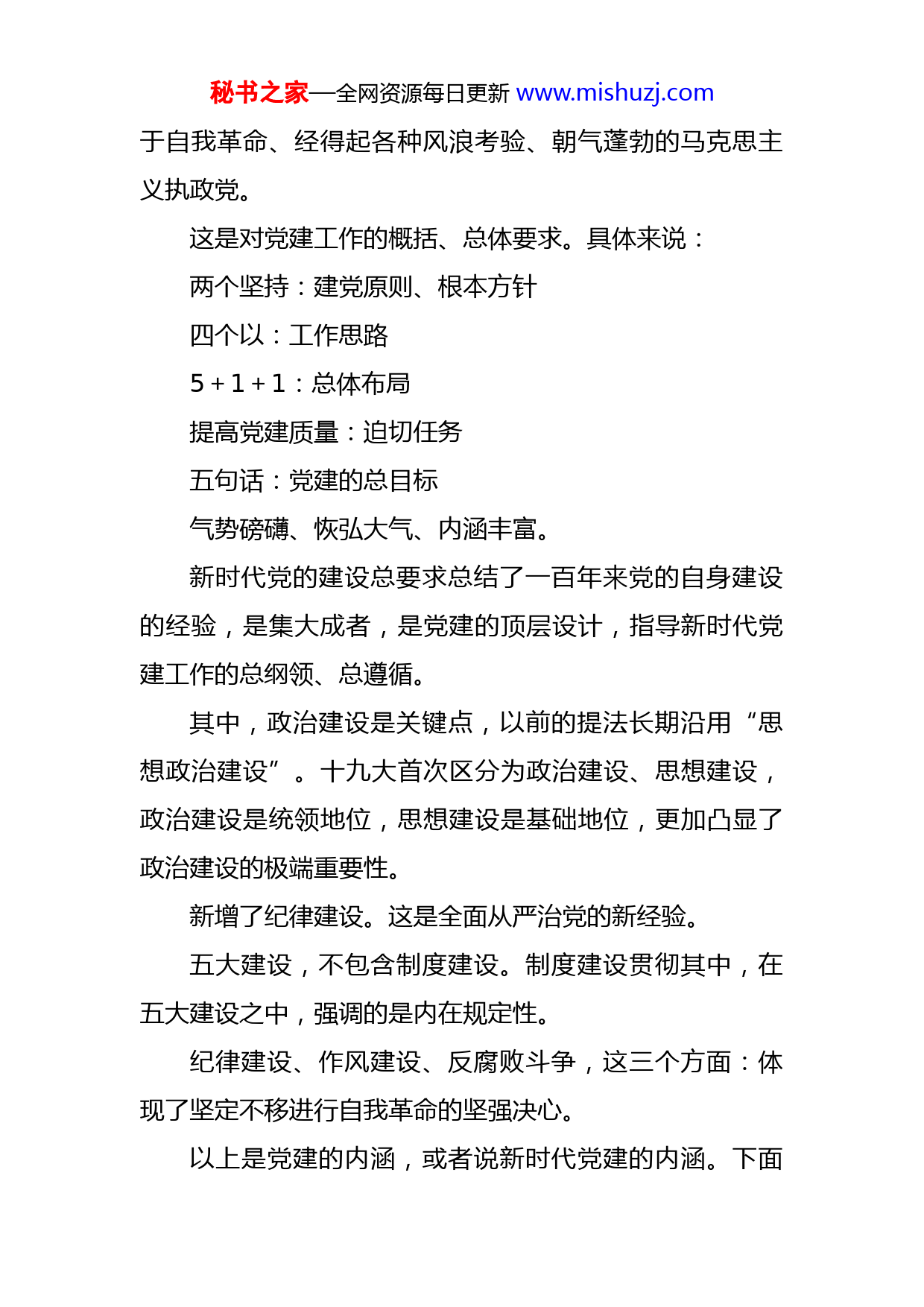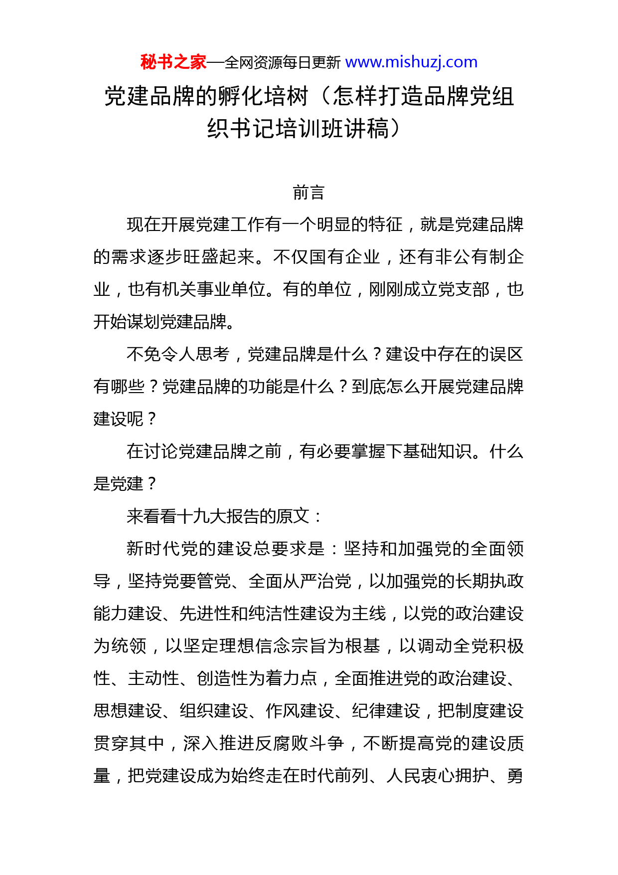 秘书之家—全网资源每日更新www.mishuzj.com党建品牌的孵化培树(怎样打造品牌党组织书记培训班讲稿)前言现在开展党建工作有一个明显的特征,就是党建品牌的需求逐步旺盛起来。不仅国有企业,还有非公有制企业,也有机关事业单位。有的单位,刚刚成立党支部,也开始谋划党建品牌。不免令人思考,党建品牌是什么?建设中存在的误区有哪些?党建品牌的功能是什么?到底怎么开展党建品牌建设呢?在讨论党建品牌之前,有必要掌握下基础知识。什么是党建?来看看十九大报告的原文:新时代党的建设总要求是:坚持和加强党的全面领导,坚持党要管党、全面从严治党,以加强党的长期执政能力建设、先进性和纯洁性建设为主线,以党的政治建设为统领,以坚定理想信念宗旨为根基,以调动全党积极性、主动性、创造性为着力点,全面推进党的政治建设、思想建设、组织建设、作风建设、纪律建设,把制度建设贯穿其中,深入推进反腐败斗争,不断提高党的建设质量,把党建设成为始终走在时代前列、人民衷心拥护、勇秘书之家—全网资源每日更新www.mishuzj.com于自我革命、经得起各种风浪考验、朝气蓬勃的马克思主义执政党。这是对党建工作的概括、总体要求。具体来说:两个坚持:建党原则、根本方针四个以:工作思路5+1+1:总体布局提高党建质量:迫切任务五句话:党建的总目标气势磅礴、恢弘大气、内涵丰富。新时代党的建设总要求总结了一百年来党的自身建设的经验,是集大成者,是党建的顶层设计,指导新时代党建工作的总纲领、总遵循。其中,政治建设是关键点,以前的提法长期沿用“思想政治建设”。十九大首次区分为政治建设、思想建设,政治建设是统领地位,思想建设是基础地位,更加凸显了政治建设的极端重要性。新增了纪律建设。这是全面从严治党的新经验。五大建设,不包含制度建设。制度建设贯彻其中,在五大建设之中,强调的是内在规定性。纪律建设、作风建设、反腐败斗争,这三个方面:体现了坚定不移进行自我革命的坚强决心。以上是党建的内涵,或者说新时代党建的内涵。下面秘书之家—全网资源每日更新www.mishuzj.com再看看什么是基层党建。首先,还是要掌握基本概念——党的组织体系。党的组织体系建设实践中一直都有,但是2018年全国组织工作会议,习近平总书记首次提出,作为重大命题提出。党的组织体系:以党的中央组织为统领,民主集中制为根本组织原则,由党的中央组织、地方组织、基层组织以及在非党组织中设立的党组,共同构成的,包括全体党员在内的统一整体。非常严密的组织体系。可以看出:党的组织分类有三种:中央、地方、基层。中央(党的全国代表大会、中央委员会(中央办公厅、中央组织部、中宣部、统战部、对外联络部等职能部门)、中央政治局、政治局常务委员会及其办事机构(书记处))地方(省、市、县、区……)基层(企业、农村、机关、学校、科研院所、街道社区、社会组织、人民解放军连队和其他基层单位,凡是有正式党员三人以上的,都应当成立党的基层组织。)我们知道了什么是党的基层组织,还要明白基层组织有哪几类。秘书之家—全网资源每日更新www.mishuzj.com党的基层组织,也有三种类型。基层党委、党总支、党支部(根据工作需要和党员人数,经上级党组织批准,分别设立党的基层委员会、总支部委员会、支部委员会。)100人以上,50-100人,3-50人,是一般性原则。如果有需要,也可以突破这个限制,比如xxx铁塔公司,19个党员,连总支条件都不够,经批准,成立了党委,下设两个党支部。基层委员会由党员大会或代表大会选举产生,总支部委员会和支部委员会由党员大会选举产生。可以看出,党的基层组织,是指党在社会基层单位(包括企业、农村、机关、学校、科研院所、街道社区、社会组织、人民解放军连队和其他基层单位)成立的组织。比如在党政机关,成立的机关党组织,开展的党建,叫机关党建。机关党组织属于基层党组织,也就是在机关设立的党的基层组织。同样,在国有企业,成立的是国有企业基层党组织,开展的党建是国企党建。有时,国有企业的本部也叫机关,机关一支部、二支部,等等,但是这个机关,和一般讲的机关党建,不是一回事,虽然都是基层党组织,但是定位有所区别。那么,基层党建的主要任务是什么?秘书之家—全网资源每日更新www.mishuzj.com着力解决一些基层党组织弱化、虚化、边缘化问题。1.目标:把基层党组织建设成为宣传党的主张、贯彻党的决定、领导基层治理、团结动员群众、推动改革发展的坚强战斗堡垒。扩大基层党的组织覆盖和工作覆盖,对象是什么?2.对象:企业、农村、机关、学校、科研院所、街道社区、社会组织等基层党组织,探索加强新兴业态和互联网党建工作。重点是什么?3.重点:以提升组织力为重点,突出政治功能。这是党建、基层党建。注意区别和联系。这与一些同志印象中的党建好像不大一样,好多人认为党建很简单,认为都有标准,照着做就行,三会一课、主题党日,收缴党费、发展党员、谈心谈话,组织生活会,总之,按部就班,有条不紊,这有何难?刚才说的这些,都是我们能经常听到的,但是这些,都是叫做党务工作。于是,在实际工作中,一些基层党组织以党务工作代替党建工作,党建工作低水平运作,导致党组织被虚化、弱化、边缘化。因此,正确处理好“党建”与