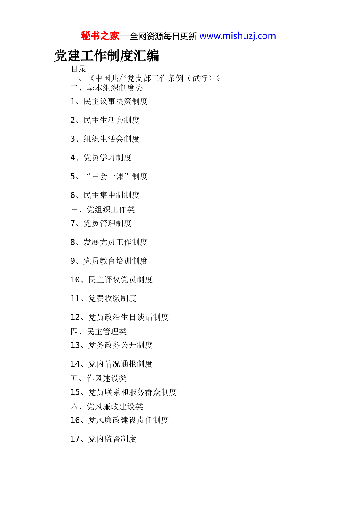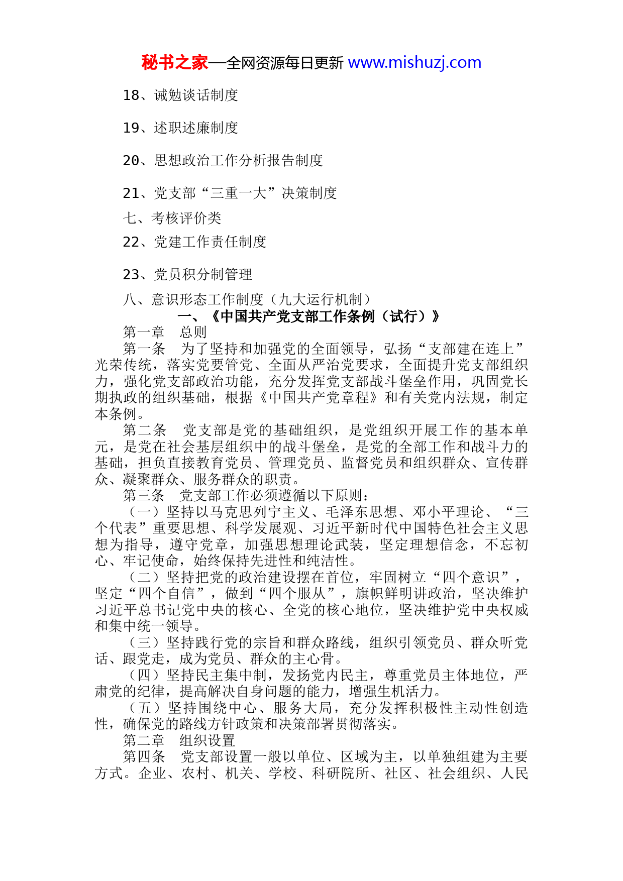 秘书之家—全网资源每日更新www.mishuzj.com党建工作制度汇编目录一、《中国共产党支部工作条例(试行)》二、基本组织制度类1、民主议事决策制度2、民主生活会制度3、组织生活会制度4、党员学习制度5、“三会一课”制度6、民主集中制制度三、党组织工作类7、党员管理制度8、发展党员工作制度9、党员教育培训制度10、民主评议党员制度11、党费收缴制度12、党员政治生日谈话制度四、民主管理类13、党务政务公开制度14、党内情况通报制度五、作风建设类15、党员联系和服务群众制度六、党风廉政建设类16、党风廉政建设责任制度17、党内监督制度秘书之家—全网资源每日更新www.mishuzj.com18、诫勉谈话制度19、述职述廉制度20、思想政治工作分析报告制度21、党支部“三重一大”决策制度七、考核评价类22、党建工作责任制度23、党员积分制管理八、意识形态工作制度(九大运行机制)一、《中国共产党支部工作条例(试行)》第一章总则第一条为了坚持和加强党的全面领导,弘扬“支部建在连上”光荣传统,落实党要管党、全面从严治党要求,全面提升党支部组织力,强化党支部政治功能,充分发挥党支部战斗堡垒作用,巩固党长期执政的组织基础,根据《中国共产党章程》和有关党内法规,制定本条例。第二条党支部是党的基础组织,是党组织开展工作的基本单元,是党在社会基层组织中的战斗堡垒,是党的全部工作和战斗力的基础,担负直接教育党员、管理党员、监督党员和组织群众、宣传群众、凝聚群众、服务群众的职责。第三条党支部工作必须遵循以下原则:(一)坚持以马克思列宁主义、毛泽东思想、邓小平理论、“三个代表”重要思想、科学发展观、习近平新时代中国特色社会主义思想为指导,遵守党章,加强思想理论武装,坚定理想信念,不忘初心、牢记使命,始终保持先进性和纯洁性。(二)坚持把党的政治建设摆在首位,牢固树立“四个意识”,坚定“四个自信”,做到“四个服从”,旗帜鲜明讲政治,坚决维护习近平总书记党中央的核心、全党的核心地位,坚决维护党中央权威和集中统一领导。(三)坚持践行党的宗旨和群众路线,组织引领党员、群众听党话、跟党走,成为党员、群众的主心骨。(四)坚持民主集中制,发扬党内民主,尊重党员主体地位,严肃党的纪律,提高解决自身问题的能力,增强生机活力。(五)坚持围绕中心、服务大局,充分发挥积极性主动性创造性,确保党的路线方针政策和决策部署贯彻落实。第二章组织设置第四条党支部设置一般以单位、区域为主,以单独组建为主要方式。企业、农村、机关、学校、科研院所、社区、社会组织、人民秘书之家—全网资源每日更新www.mishuzj.com解放军和武警部队连(中)队以及其他基层单位,凡是有正式党员3人以上的,都应当成立党支部。党支部党员人数一般不超过50人。第五条结合实际创新党支部设置形式,使党的组织和党的工作全覆盖。规模较大、跨区域的农民专业合作组织,专业市场、商业街区、商务楼宇等,符合条件的,应当成立党支部。正式党员不足3人的单位,应当按照地域相邻、行业相近、规模适当、便于管理的原则,成立联合党支部。联合党支部覆盖单位一般不超过5个。为期6个月以上的工程、工作项目等,符合条件的,应当成立党支部。流动党员较多,工作地或者居住地相对固定集中,应当由流出地党组织商流入地党组织,依托园区、商会、行业协会、驻外地办事机构等成立流动党员党支部。第六条党支部的成立,一般由基层单位提出申请,所在乡镇(街道)或者单位基层党委召开会议研究决定并批复,批复时间一般不超过1个月。基层党委审批同意后,基层单位召开党员大会选举产生党支部委员会或者不设委员会的党支部书记、副书记。批复和选举结果由基层党委报上级党委组织部门备案。根据工作需要,上级党委可以直接作出在基层单位成立党支部的决定。第七条对因党员人数或者所在单位、区域等发生变化,不再符合设立条件的党支部,上级党组织应当及时予以调整或者撤销。党支部的调整和撤销,一般由党支部报所在乡镇(街道)或者单位基层党委批准,也可以由所在乡镇(街道)或者单位基层党委直接作出决定,并报上级党委组织部门备案。第八条为执行某项任务临时组建的机构,党员组织关系不转接的,经上级党组织批准,可以成立临时党支部。临时党支部主要组织党员开展政治学习,教育、管理、监督党员,对入党积极分子进行教育培养等,一般不发展党员、处分处置党员,不收缴党费,不选举党代表大会代表和进行换届。临时党支部书记、副书记和委员由批准其成立的党组织指定。临时组建的机构撤销后,临时党支部自然撤销。第三章基本任务第九条党支部的基本任务是:(一)宣传和贯彻落实党的理论和路线方针政策,宣传和执行党中央、上级党组织及本党支部的决议。讨论决定或者参与决定本地区本部门本单位重要事项,充分发挥党员先锋模范作用,团结组织群众,努力完成本地区本部门本单位所担负的任务。(二)组织党员认真学习马克思列宁主义、毛泽东思想、邓小平理论、“三个代表”重要思想、科学发展观、习近平新时代中国特色社会主义思想,推进“两学一做”学习教育常态化制度化,学习党的路线方针政策和决议,学习党的基本知识,学习科学、文化、法律和秘书之家