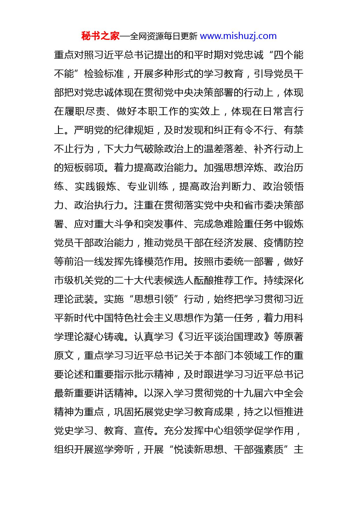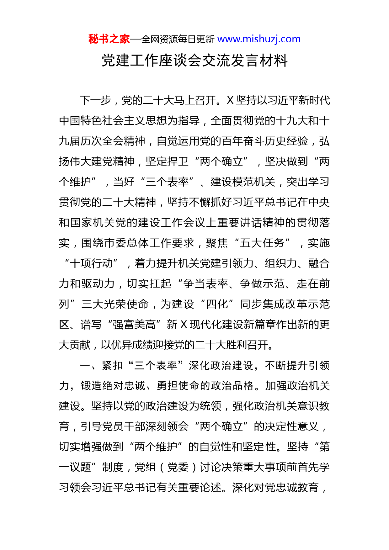 秘书之家—全网资源每日更新www.mishuzj.com党建工作座谈会交流发言材料下一步,党的二十大马上召开。X坚持以习近平新时代中国特色社会主义思想为指导,全面贯彻党的十九大和十九届历次全会精神,自觉运用党的百年奋斗历史经验,弘扬伟大建党精神,坚定捍卫“两个确立”,坚决做到“两个维护”,当好“三个表率”、建设模范机关,突出学习贯彻党的二十大精神,坚持不懈抓好习近平总书记在中央和国家机关党的建设工作会议上重要讲话精神的贯彻落实,围绕市委总体工作要求,聚焦“五大任务”,实施“十项行动”,着力提升机关党建引领力、组织力、融合力和驱动力,切实扛起“争当表率、争做示范、走在前列”三大光荣使命,为建设“四化”同步集成改革示范区、谱写“强富美高”新X现代化建设新篇章作出新的更大贡献,以优异成绩迎接党的二十大胜利召开。一、紧扣“三个表率”深化政治建设,不断提升引领力,锻造绝对忠诚、勇担使命的政治品格。加强政治机关建设。坚持以党的政治建设为统领,强化政治机关意识教育,引导党员干部深刻领会“两个确立”的决定性意义,切实增强做到“两个维护”的自觉性和坚定性。坚持“第一议题”制度,党组(党委)讨论决策重大事项前首先学习领会习近平总书记有关重要论述。深化对党忠诚教育,秘书之家—全网资源每日更新www.mishuzj.com重点对照习近平总书记提出的和平时期对党忠诚“四个能不能”检验标准,开展多种形式的学习教育,引导党员干部把对党忠诚体现在贯彻党中央决策部署的行动上,体现在履职尽责、做好本职工作的实效上,体现在日常言行上。严明党的纪律规矩,及时发现和纠正有令不行、有禁不止行为,下大力气破除政治上的温差落差、补齐行动上的短板弱项。着力提高政治能力。加强思想淬炼、政治历练、实践锻炼、专业训练,提高政治判断力、政治领悟力、政治执行力。注重在贯彻落实党中央和省市委决策部署、应对重大斗争和突发事件、完成急难险重任务中锻炼党员干部政治能力,推动党员干部在经济发展、疫情防控等前沿一线发挥先锋模范作用。按照市委统一部署,做好市级机关党的二十大代表候选人酝酿推荐工作。持续深化理论武装。实施“思想引领”行动,始终把学习贯彻习近平新时代中国特色社会主义思想作为第一任务,着力用科学理论凝心铸魂。认真学习《习近平谈治国理政》等原著原文,重点学习习近平总书记关于本部门本领域工作的重要论述和重要指示批示精神,及时跟进学习习近平总书记最新重要讲话精神。以深入学习贯彻党的十九届六中全会精神为重点,巩固拓展党史学习教育成果,持之以恒推进党史学习、教育、宣传。充分发挥中心组领学促学作用,组织开展巡学旁听,开展“悦读新思想、干部强素质”主秘书之家—全网资源每日更新www.mishuzj.com题活动,引导党员干部多吸“理论之氧”,常补“精神之钙”,夯实“信仰之基”。开展主题宣传文化活动。围绕迎接和宣传党的二十大,开展形势宣传、成就宣传、典型宣传。深化社会主义核心价值观宣传教育,开展精神文明创建,推进书香机关建设,推荐评选一批书香机关、学习型党组织、学习标兵。举办第七届机关文化艺术节,组织“盛世赞歌”市级机关喜迎二十大合唱比赛等活动,提振党员干部奋进新征程、建功新时代的精气神。认真学习宣传贯彻党的二十大精神。党的二十大召开后,采取理论学习中心组学习、宣讲报告会、辅导讲座、专题培训等形式,迅速在市级机关兴起学习宣传贯彻党的二十大精神热潮,切实把党员干部的思想和行动统一到党的二十大精神上来,统一到党的二十大确定的目标任务上来。严格党内政治生活。从严落实民主生活会、组织生活会、民主评议党员、领导干部双重组织生活等制度,不断提高批评与自我批评质量。通过“三会一课”、谈心谈话、党性定期分析等,推动党员干部开展经常性政治体检。把党章党规党纪作为党组(党委)理论学习中心组、青年理论学习小组和党支部学习的重要内容。严格落实意识形态工作责任制。把握重大时间节点,科学分析研判意识形态领域情况,旗帜鲜明反对和抵制各种错误观点,有效防范处置风险隐患。落实主管主办责任,加强对部门意识形态阵地的秘书之家—全网资源每日更新www.mishuzj.com管理。办好用好X机关党建网和微信公众号,推动机关宣传思想工作弘扬主旋律、凝聚正能量。二、着眼“两个全面”夯实基层基础,持续提升组织力,完善上下贯通、执行有力的组织体系。持之以恒固本强基。实施“党建强基”行动,深化提升“五聚焦五落实”,扎实推进党建“五强工程”,补短板、抓规范、促提升,推动基层党组织全面进步、全面过硬。抓牢责任落实“牛鼻子”,以基层党建“书记项目”为抓手,推动各级党组织干好“分内事”、种好“责任田”。健全完善挂钩联系县(区)机关工委机制,持续深化机关党建片区“四联共建”,整合资源、汇聚合力。规范提升基层支部。坚持“一切工作到支部”的鲜明导向,锻造坚强有力的战斗堡垒。严格制度执行,推动《中国共产党党和国家机关基层组织工作条例》《中国共产党支部工作条例(试行)》等落地落实。扎实推进党支部“标准+示范”建设,持续深化党支部和党员积分管理、评星定级,打造一批党