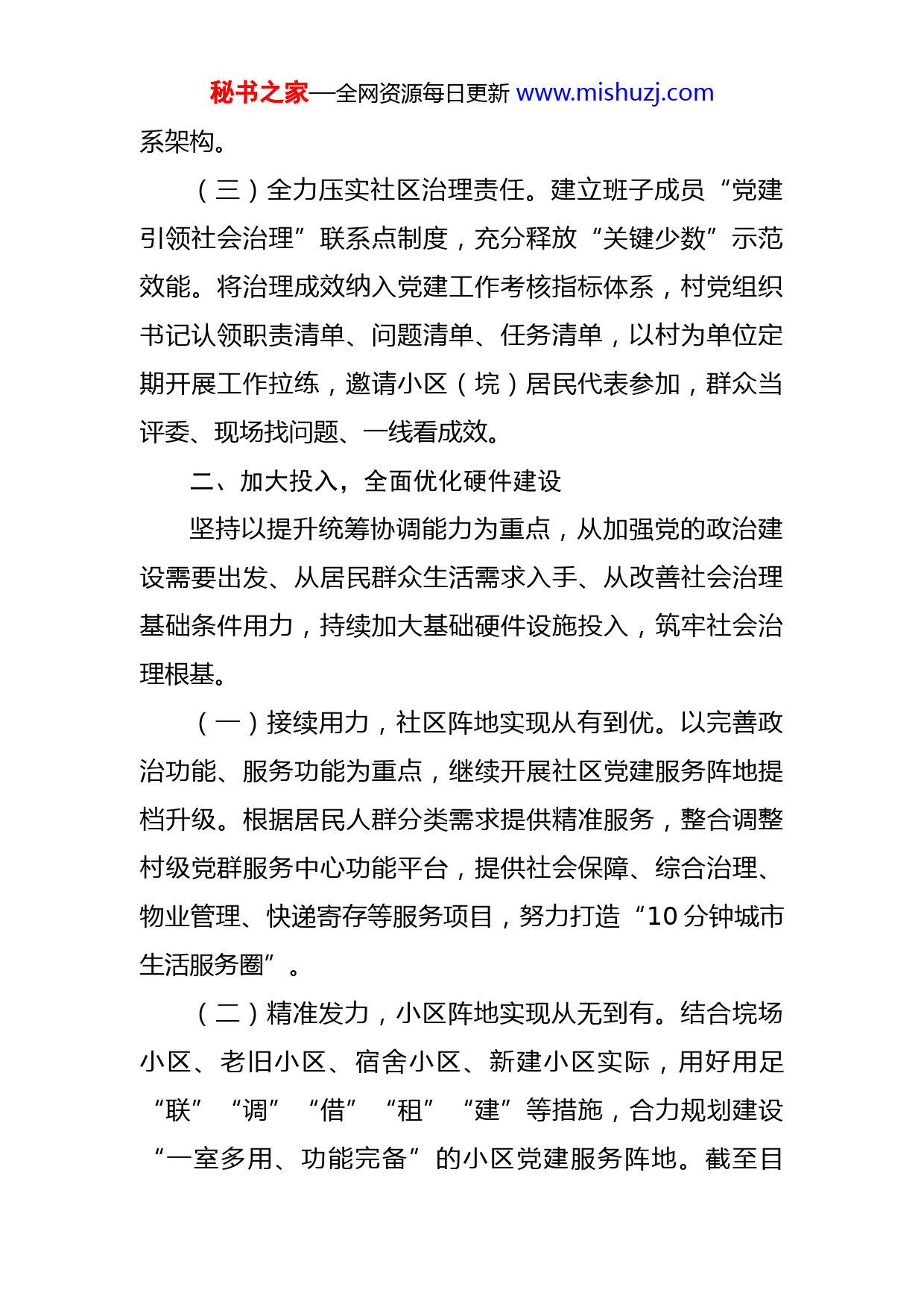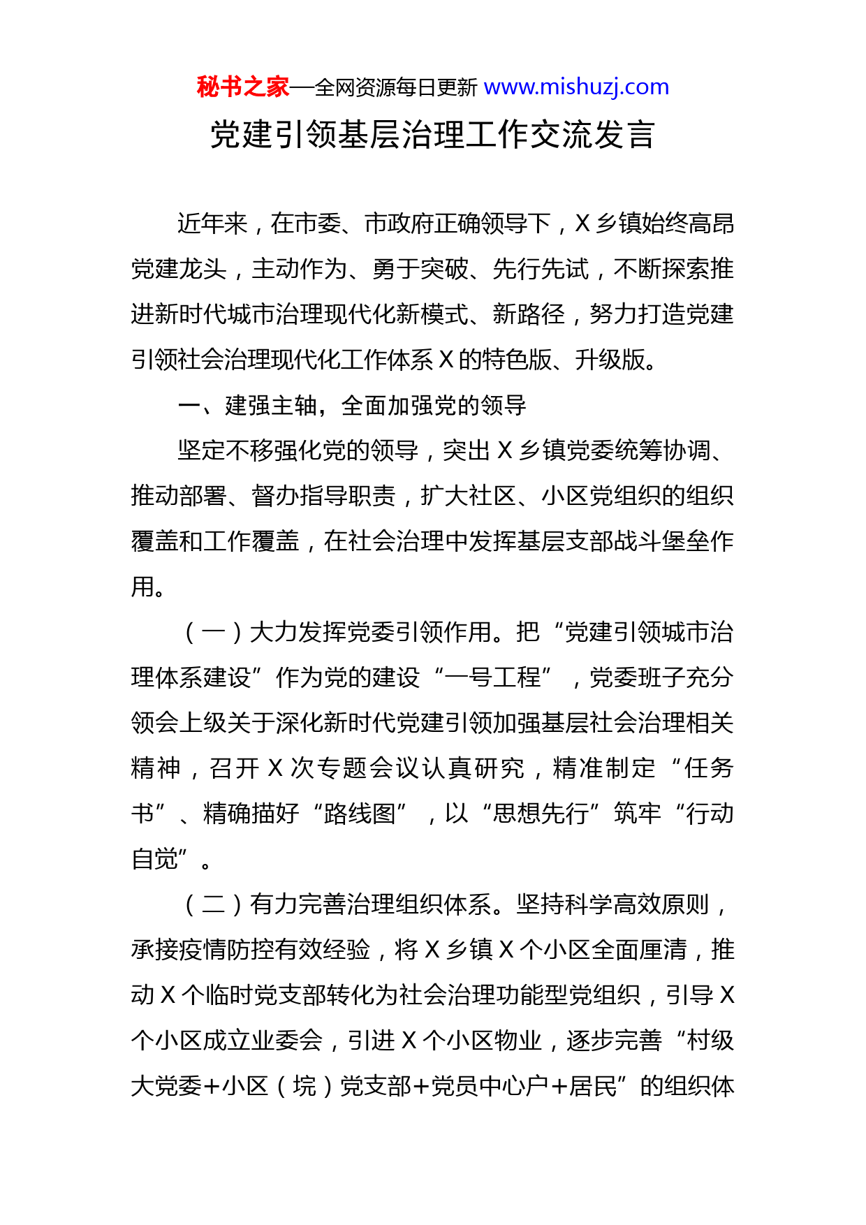 秘书之家—全网资源每日更新www.mishuzj.com党建引领基层治理工作交流发言近年来,在市委、市政府正确领导下,X乡镇始终高昂党建龙头,主动作为、勇于突破、先行先试,不断探索推进新时代城市治理现代化新模式、新路径,努力打造党建引领社会治理现代化工作体系X的特色版、升级版。一、建强主轴,全面加强党的领导坚定不移强化党的领导,突出X乡镇党委统筹协调、推动部署、督办指导职责,扩大社区、小区党组织的组织覆盖和工作覆盖,在社会治理中发挥基层支部战斗堡垒作用。(一)大力发挥党委引领作用。把“党建引领城市治理体系建设”作为党的建设“一号工程”,党委班子充分领会上级关于深化新时代党建引领加强基层社会治理相关精神,召开X次专题会议认真研究,精准制定“任务书”、精确描好“路线图”,以“思想先行”筑牢“行动自觉”。(二)有力完善治理组织体系。坚持科学高效原则,承接疫情防控有效经验,将X乡镇X个小区全面厘清,推动X个临时党支部转化为社会治理功能型党组织,引导X个小区成立业委会,引进X个小区物业,逐步完善“村级大党委+小区(垸)党支部+党员中心户+居民”的组织体秘书之家—全网资源每日更新www.mishuzj.com系架构。(三)全力压实社区治理责任。建立班子成员“党建引领社会治理”联系点制度,充分释放“关键少数”示范效能。将治理成效纳入党建工作考核指标体系,村党组织书记认领职责清单、问题清单、任务清单,以村为单位定期开展工作拉练,邀请小区(垸)居民代表参加,群众当评委、现场找问题、一线看成效。二、加大投入,全面优化硬件建设坚持以提升统筹协调能力为重点,从加强党的政治建设需要出发、从居民群众生活需求入手、从改善社会治理基础条件用力,持续加大基础硬件设施投入,筑牢社会治理根基。(一)接续用力,社区阵地实现从有到优。以完善政治功能、服务功能为重点,继续开展社区党建服务阵地提档升级。根据居民人群分类需求提供精准服务,整合调整村级党群服务中心功能平台,提供社会保障、综合治理、物业管理、快递寄存等服务项目,努力打造“10分钟城市生活服务圈”。(二)精准发力,小区阵地实现从无到有。结合垸场小区、老旧小区、宿舍小区、新建小区实际,用好用足“联”“调”“借”“租”“建”等措施,合力规划建设“一室多用、功能完备”的小区党建服务阵地。截至目秘书之家—全网资源每日更新www.mishuzj.com前,已落实X个小区支部活动阵地。(三)凝心聚力,文化阵地实现从虚到实。大力倡导新时代文明实践,在X个小区开展身边的最美家庭评选、广场舞预赛等文化活动,积极引导居民群众参与小区治理。在有条件的小区(垸)、商圈、街道建设“红色文化”阵地,以“红色元素”打造“红色风景”。三、协调联动,全面推动共治共建遵照区域化党建工作规律,借力市委X行动部署工作,大力推动市直单位单位、党员和居民共驻共建,健全完善协同共治机制。(一)整合下沉资源力量。主动对接X家下沉单位结对帮扶共驻共建,围绕“基层组织体系建设、服务体系完善、老旧小区改造、乡村振兴、发展壮大集体经济”等工作任务,签订任务清单承诺书,强化共建共治共享合力。(二)强化三方联动合力。充分发挥党支部、业委会、物业三方力量,建立“党群协商议事和党员联户帮扶、党员接单服务”机制,配套建立居民需求收集动态、党员志愿服务积分管理和群众满意度评价等清单管理制度,切实为居民解决身边的“难事、烦事”,共同服务小区居民。(三)创新智慧服务管理。结合和“人口普查”和“X工程”,在X试点推行智慧社区平台建设,提供居民基础秘书之家—全网资源每日更新www.mishuzj.com数据、楼栋基础数据、生活数据等关联、处理、分析、预警的大数据分析支撑,着力推进共享型“城乡基层治理大数据平台”建设。四、优化服务,发挥党员先锋作用创新党员先锋模范作用发挥活动载体,把下沉村垸、服务居民的一线作为践行党员初心、滋养人民情怀的主场。(一)推进无职党员定岗履责。创新推动党建引领基层治理服务体系,坚持围绕“居民所需、社区所缺”,细化政策法规宣传岗、环境卫生维护岗、文明新风倡导岗等岗位职责,持续发动X余名无职党员参与社区治理。(二)推动下沉党员报到服务。推动在职党员干部下沉社区(小区)亮相、发声、管事常态化,推行菜单式服务模式,参与社区疫情常态化防控,人口普查和社区服务等工作,落实一对一包保居民制度,走访X户困难居民,协同解决X起矛盾纠纷,让X个老旧小区改造、美丽乡村建设等惠民工程落地落实。(三)推广志愿服务实践探索。按照“一区一特”要求,在X、X及X等X个小区开展试点,成立以党员为主体、居民共同参与的小区志愿服务队、矛盾调解队、应急管理队等多支志愿者队伍,推进扎实开展“送政策、送温暖、送平安、送活动”行动志愿服务。