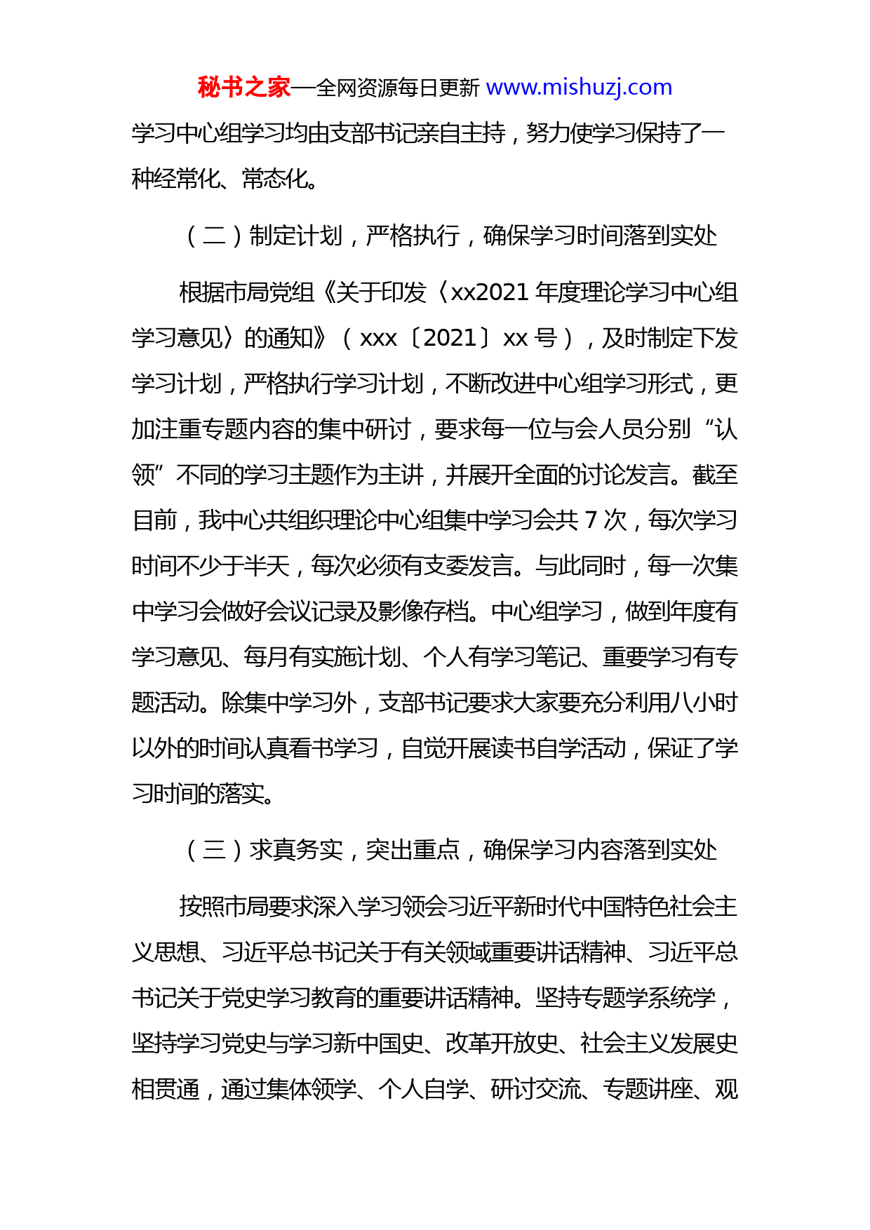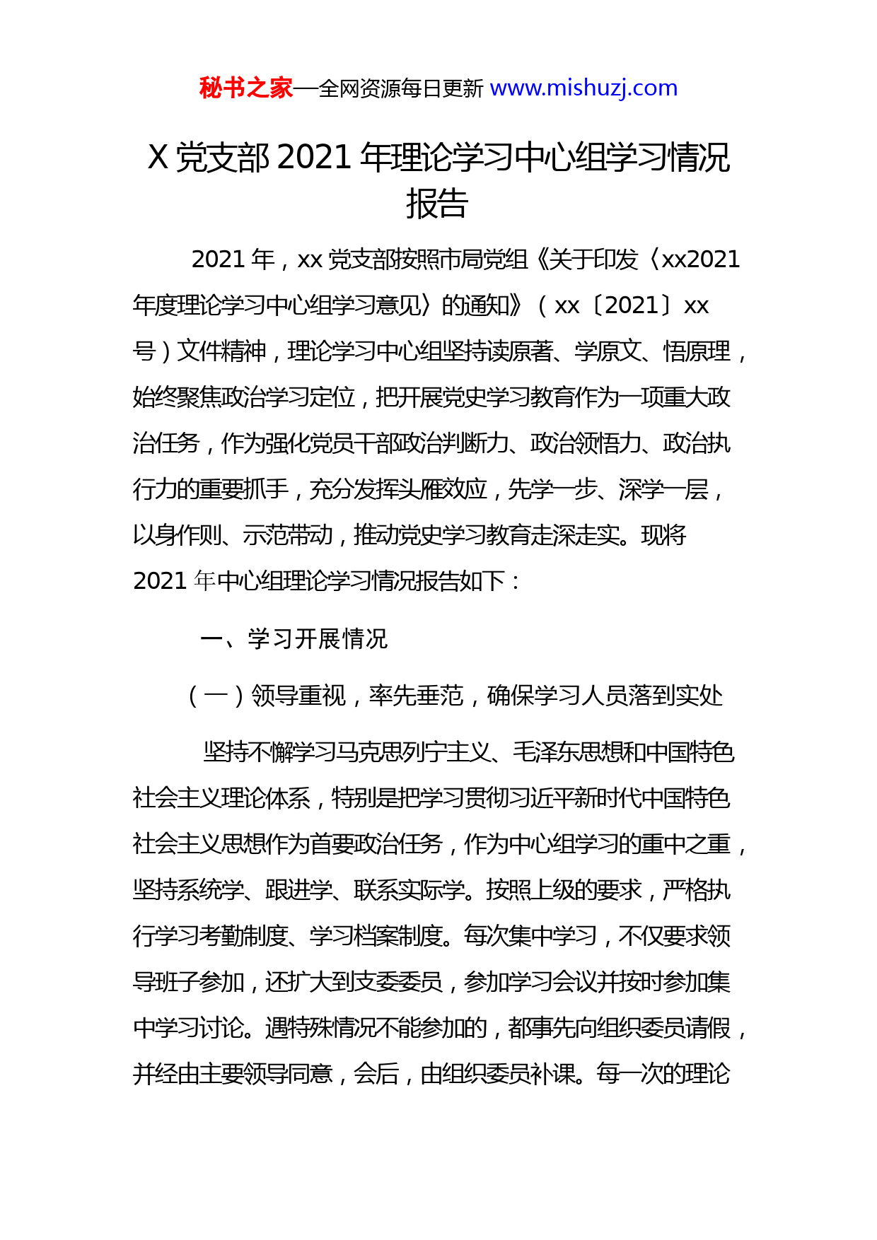 秘书之家—全网资源每日更新www.mishuzj.comX党支部2021年理论学习中心组学习情况报告2021年,xx党支部按照市局党组《关于印发〈xx2021年度理论学习中心组学习意见〉的通知》(xx〔2021〕xx号)文件精神,理论学习中心组坚持读原著、学原文、悟原理,始终聚焦政治学习定位,把开展党史学习教育作为一项重大政治任务,作为强化党员干部政治判断力、政治领悟力、政治执行力的重要抓手,充分发挥头雁效应,先学一步、深学一层,以身作则、示范带动,推动党史学习教育走深走实。现将2021年中心组理论学习情况报告如下:一、学习开展情况(一)领导重视,率先垂范,确保学习人员落到实处坚持不懈学习马克思列宁主义、毛泽东思想和中国特色社会主义理论体系,特别是把学习贯彻习近平新时代中国特色社会主义思想作为首要政治任务,作为中心组学习的重中之重,坚持系统学、跟进学、联系实际学。按照上级的要求,严格执行学习考勤制度、学习档案制度。每次集中学习,不仅要求领导班子参加,还扩大到支委委员,参加学习会议并按时参加集中学习讨论。遇特殊情况不能参加的,都事先向组织委员请假,并经由主要领导同意,会后,由组织委员补课。每一次的理论秘书之家—全网资源每日更新www.mishuzj.com学习中心组学习均由支部书记亲自主持,努力使学习保持了一种经常化、常态化。(二)制定计划,严格执行,确保学习时间落到实处根据市局党组《关于印发〈xx2021年度理论学习中心组学习意见〉的通知》(xxx〔2021〕xx号),及时制定下发学习计划,严格执行学习计划,不断改进中心组学习形式,更加注重专题内容的集中研讨,要求每一位与会人员分别“认领”不同的学习主题作为主讲,并展开全面的讨论发言。截至目前,我中心共组织理论中心组集中学习会共7次,每次学习时间不少于半天,每次必须有支委发言。与此同时,每一次集中学习会做好会议记录及影像存档。中心组学习,做到年度有学习意见、每月有实施计划、个人有学习笔记、重要学习有专题活动。除集中学习外,支部书记要求大家要充分利用八小时以外的时间认真看书学习,自觉开展读书自学活动,保证了学习时间的落实。(三)求真务实,突出重点,确保学习内容落到实处按照市局要求深入学习领会习近平新时代中国特色社会主义思想、习近平总书记关于有关领域重要讲话精神、习近平总书记关于党史学习教育的重要讲话精神。坚持专题学系统学,坚持学习党史与学习新中国史、改革开放史、社会主义发展史相贯通,通过集体领学、个人自学、研讨交流、专题讲座、观秘书之家—全网资源每日更新www.mishuzj.com看视频等形式反复学。将习近平《论中国共产党历史》《毛泽东邓小平江泽民胡锦涛关于中国共产党历史论述摘编》《习近平新时代中国特色社会主义思想学习问答》《中国共产党简史》列为重点必读书籍;《习近平谈治国理政》(第一、二、三卷)《中华人民共和国简史》《改革开放简史》《社会主义发展简史》列为辅助读本。(四)严格制度,创新形式,确保学习效果落到实处中心学习组注重学习制度建设,以制度保障、规范和深化学习,创新学习方式,提高学习质量。一是以制度保障学习计划的落实。每次学习都由党务干部提前通知,把要学习内容、方法、个人自学准备的内容、重点发言人都一一通知每一位中心组成员,使参加学习的同志有充裕的时间安排好其他工作,避免工学矛盾,搞好自学,做好学习准备。二是以制度保障学习效果的落实。不断完善考核制度,实行述学、评学制度,把运用理论解决实际问题的能力,作为年度考核的一项重要内容。使学习的成效转化为实际工作的效果,转化为提高中心组成员的思想理论水平,转化为增强中心组成员解决问题的能力,转化为服务企业的具体行动。通过学习,支部委员政治信念更加坚定,工作思路更加拓宽,建设服务型单位的自觉性、使命感、责任感得到提升。二、学习成效秘书之家—全网资源每日更新www.mishuzj.com(一)逐步形成勤思善学氛围制定完善了中心组学习、集中学习、自主学习等学习制度以中心组理论学习、交流研讨学、个人自学为抓手,真正将学习融入日常工作生活之中,持续强化理论武装,党员领导干部的党性修养、理论素质、政策水平进一步增强,“四个自信”、“四个意识”进一步树立。特别是将习近平总书记提出的营造良好政治生态,坚持“两点”定位、“两地”“两高”目标,发挥“三个作用”和推动成渝地区双城经济圈建设等重要指示要求与产业发展的问题相结合,班子把方向、谋大局、定政策、促发展的能力进一步加强,发展思路更加清晰,行动自觉更加坚定。(二)作风建设持续从严向好始终将党史学习同总结经验、推动工作结合,切实把学习成效转化为工作动力和成效,结合工作实际,着眼为群众解决实际问题,开展“我为群众办实事”“开门问计暨调查研究”活动。对照局党组确定的“我为群众办实事”重点项目,建立工作台账,确定三个重点项目优化检验检测服务、加快能力建设、提升公众安全科学素养。通过学习中央一系列重大方针政策,通过党史学习教育活动,进一步增强了忧患意识和责任意识,从思想上筑起抵御腐朽思想侵蚀的坚固防线。企业普遍反映我中心工作人员服务态度好、廉洁自律。企业对我中心廉政秘书之家