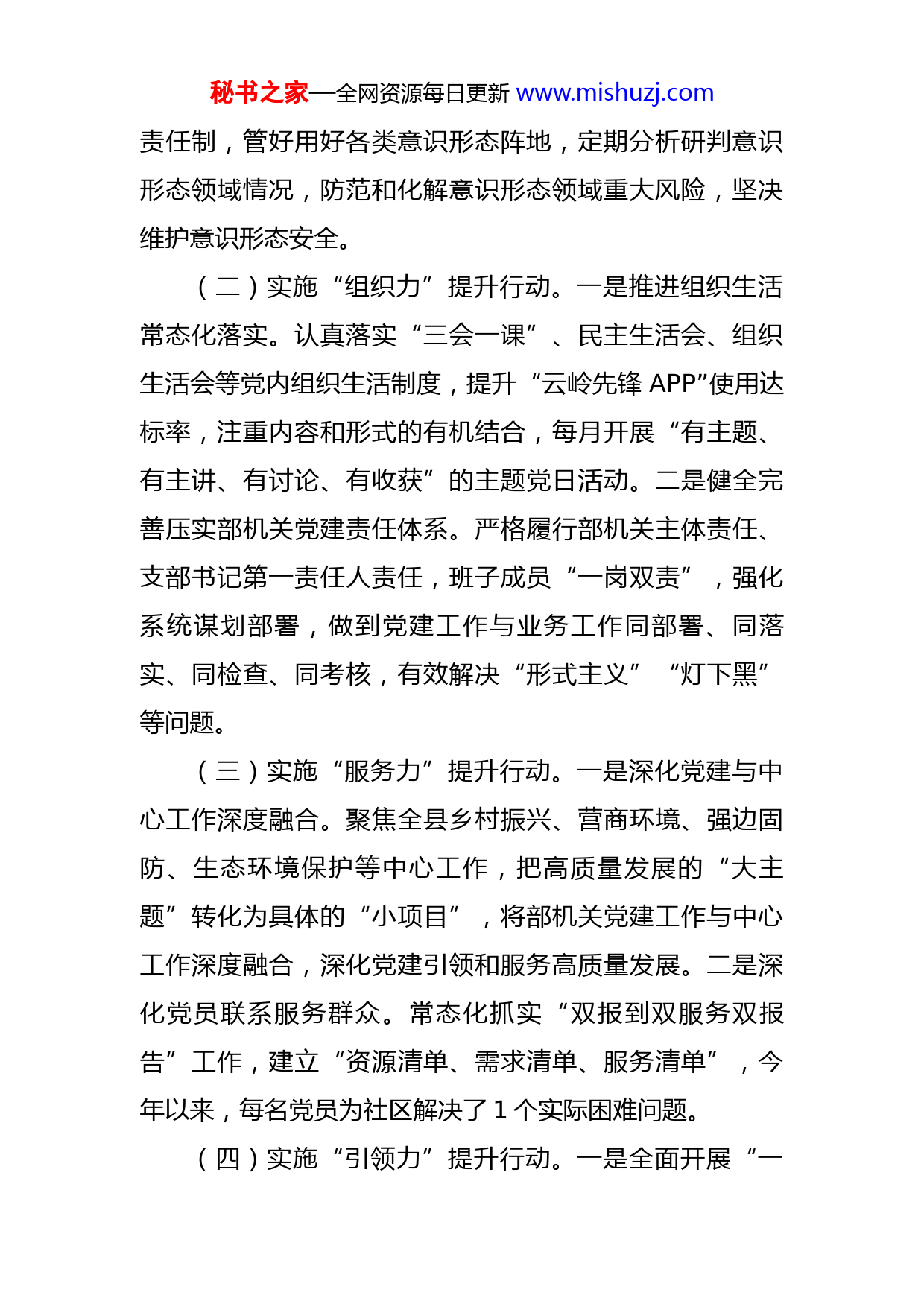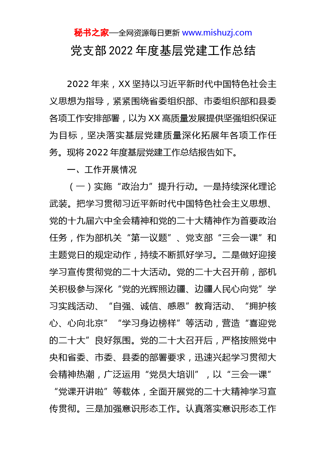 秘书之家—全网资源每日更新www.mishuzj.com党支部2022年度基层党建工作总结2022年来,XX坚持以习近平新时代中国特色社会主义思想为指导,紧紧围绕省委组织部、市委组织部和县委各项工作安排部署,以为XX高质量发展提供坚强组织保证为目标,坚决落实基层党建质量深化拓展年各项工作任务。现将2022年度基层党建工作总结报告如下。一、工作开展情况(一)实施“政治力”提升行动。一是持续深化理论武装。把学习贯彻习近平新时代中国特色社会主义思想、党的十九届六中全会精神和党的二十大精神作为首要政治任务,作为部机关“第一议题”、党支部“三会一课”和主题党日的规定动作,持续不断抓好学习。二是做好迎接学习宣传贯彻党的二十大活动。党的二十大召开前,部机关积极参与深化“党的光辉照边疆、边疆人民心向党”学习实践活动、“自强、诚信、感恩”教育活动、“拥护核心、心向北京”“学习身边榜样”等活动,营造“喜迎党的二十大”良好氛围。党的二十大召开后,严格按照党中央和省委、市委、县委的部署要求,迅速兴起学习贯彻大会精神热潮,广泛运用“党员大培训”,以“三会一课”“党课开讲啦”等载体,全面开展党的二十大精神学习宣传贯彻。三是加强意识形态工作。认真落实意识形态工作秘书之家—全网资源每日更新www.mishuzj.com责任制,管好用好各类意识形态阵地,定期分析研判意识形态领域情况,防范和化解意识形态领域重大风险,坚决维护意识形态安全。(二)实施“组织力”提升行动。一是推进组织生活常态化落实。认真落实“三会一课”、民主生活会、组织生活会等党内组织生活制度,提升“云岭先锋APP”使用达标率,注重内容和形式的有机结合,每月开展“有主题、有主讲、有讨论、有收获”的主题党日活动。二是健全完善压实部机关党建责任体系。严格履行部机关主体责任、支部书记第一责任人责任,班子成员“一岗双责”,强化系统谋划部署,做到党建工作与业务工作同部署、同落实、同检查、同考核,有效解决“形式主义”“灯下黑”等问题。(三)实施“服务力”提升行动。一是深化党建与中心工作深度融合。聚焦全县乡村振兴、营商环境、强边固防、生态环境保护等中心工作,把高质量发展的“大主题”转化为具体的“小项目”,将部机关党建工作与中心工作深度融合,深化党建引领和服务高质量发展。二是深化党员联系服务群众。常态化抓实“双报到双服务双报告”工作,建立“资源清单、需求清单、服务清单”,今年以来,每名党员为社区解决了1个实际困难问题。(四)实施“引领力”提升行动。一是全面开展“一秘书之家—全网资源每日更新www.mishuzj.com支部一品牌”创建。部机关从工作性质、业务特点、服务对象需求等实际出发,坚持把部机关党建示范点创建与模范机关创建紧密融合起来同部署、同推进、同评比,参与打造全县机关党建“双融双创•红色领航”党建品牌。二是全面开展模范机关创建。深化“对标达标创标”行动,围绕“三个表率、一个模范”工作要求,按照开展“对标先进、争创一流”主题实践活动的“四有”“八对标”要求,重点围绕政治建设、业务工作、机关党建工作等3方面全面寻标对标达标创标,建设讲政治、守纪律、负责任、有效率的模范机关(五)实施“战斗力”提升行动。一是推进作风革命加强机关效能建设。扎实开展“推进作风革命、加强效能建设,争做杨善洲式好党员好干部”主题实践活动,常态化落实“三法四晒”工作机制,深入开展“项目建设、指标完成情况、深入一线解决问题、优化营商环境、作风建设、模范机关创建”“六个比拼”,努力建设对标先进、争创一流的效能部门。二是严格党员日常教育管理。坚持教育、管理、监督、服务相结合,采取集中培训与日常教育、个人自学等方式,开展形式多样的学习教育活动。完善党员大会悬挂党旗、党员佩戴徽章、重温入党誓词等政治仪式,组织党员过好“政治生日”,强化党的意识和组织观念。严把发展党员入口关,规范党费收缴使用管理,秘书之家—全网资源每日更新www.mishuzj.com注重人文关怀和心理疏导,完善党员干部谈心谈话、家访制度,推进家庭家教家风建设。三是持续加强党风廉政建设。组织部机关党员干部开展廉政学习和警示教育,深刻汲取吴松、杨建洪、“3·29”专案等教训,持续深化“以案促改”。健全落实廉政风险防控机制,强化对权力、资源、资金集中的重点岗位及人员的监督。坚持开短会、讲短话、发短文,力戒形式主义、官僚主义,持续纠治“四风”突出问题,弘扬良好家风家教。(六)实施对标达标创建行动。建设“政治清明”“干部清正”“业务清楚”“作风清廉”“氛围清新”的模范机关。以腾冲、昌宁等县区为学习标杆和追赶对象,重点明确村干部“能力素质和学历水平”提升行动、职务与职级并行“套转即超”消化整改、“万名人才兴万村”行动、网络和新闻宣传工作等四项工作为争创一流的对标内容,以3年为时限,明确工作措施,制定任务书、时间表、路线图,推动工作逐年上台阶、升层次,做到一年一进步、三年一大步,实现争创一流的奋斗目标。二、存在的问题一是党建责任压得还不够实。因人员变动快,支委班子成员流转变动较频繁,有时存在抓党建工作压力