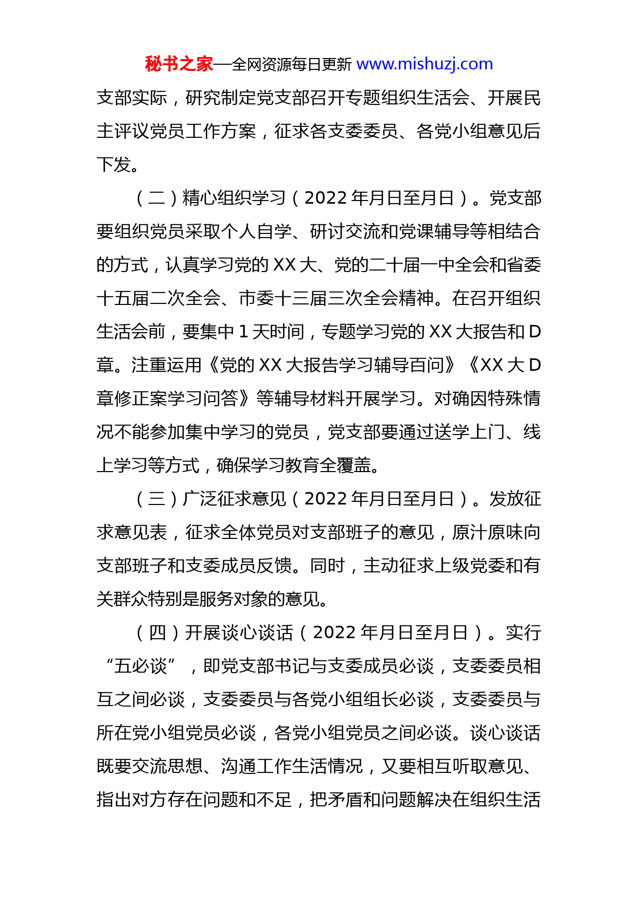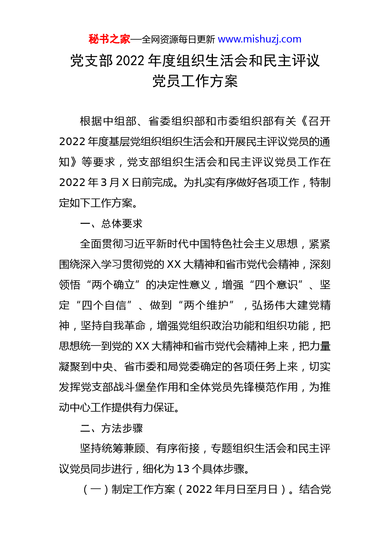 秘书之家—全网资源每日更新www.mishuzj.com党支部2022年度组织生活会和民主评议党员工作方案根据中组部、省委组织部和市委组织部有关《召开2022年度基层党组织组织生活会和开展民主评议党员的通知》等要求,党支部组织生活会和民主评议党员工作在2022年3月X日前完成。为扎实有序做好各项工作,特制定如下工作方案。一、总体要求全面贯彻习近平新时代中国特色社会主义思想,紧紧围绕深入学习贯彻党的XX大精神和省市党代会精神,深刻领悟“两个确立”的决定性意义,增强“四个意识”、坚定“四个自信”、做到“两个维护”,弘扬伟大建党精神,坚持自我革命,增强党组织政治功能和组织功能,把思想统一到党的XX大精神和省市党代会精神上来,把力量凝聚到中央、省市委和局党委确定的各项任务上来,切实发挥党支部战斗堡垒作用和全体党员先锋模范作用,为推动中心工作提供有力保证。二、方法步骤坚持统筹兼顾、有序衔接,专题组织生活会和民主评议党员同步进行,细化为13个具体步骤。(一)制定工作方案(2022年月日至月日)。结合党秘书之家—全网资源每日更新www.mishuzj.com支部实际,研究制定党支部召开专题组织生活会、开展民主评议党员工作方案,征求各支委委员、各党小组意见后下发。(二)精心组织学习(2022年月日至月日)。党支部要组织党员采取个人自学、研讨交流和党课辅导等相结合的方式,认真学习党的XX大、党的二十届一中全会和省委十五届二次全会、市委十三届三次全会精神。在召开组织生活会前,要集中1天时间,专题学习党的XX大报告和D章。注重运用《党的XX大报告学习辅导百问》《XX大D章修正案学习问答》等辅导材料开展学习。对确因特殊情况不能参加集中学习的党员,党支部要通过送学上门、线上学习等方式,确保学习教育全覆盖。(三)广泛征求意见(2022年月日至月日)。发放征求意见表,征求全体党员对支部班子的意见,原汁原味向支部班子和支委成员反馈。同时,主动征求上级党委和有关群众特别是服务对象的意见。(四)开展谈心谈话(2022年月日至月日)。实行“五必谈”,即党支部书记与支委成员必谈,支委委员相互之间必谈,支委委员与各党小组组长必谈,支委委员与所在党小组党员必谈,各党小组党员之间必谈。谈心谈话既要交流思想、沟通工作生活情况,又要相互听取意见、指出对方存在问题和不足,把矛盾和问题解决在组织生活秘书之家—全网资源每日更新www.mishuzj.com会前。谈心谈话要做好记录。(五)查找突出问题(2022年月日至月日)。1.党支部委员会要重点查在增强政治功能和组织功能、贯彻落实上级党组织部署要求、定期开展党的组织生活、严格党员日常教育管理监督、密切联系服务群众、力戒形式主义官僚主义等方面的问题和差距,看有没有把支部建设与中心工作有效融合、有没有认真落实“三会一课”等基本制度、有没有每月开展支部主题党日、有没有党员失联失管、有没有规范做好党务工作、有没有从严把好发展党员质量关等情况。2.党员要重点查在政治信仰、党员意识、理论学习、能力本领、作用发挥、纪律作风等方面的不足和问题,看有没有认真学习习近平新时代中国特色社会主义思想、有没有积极参加组织生活、有没有按期交纳党费、有没有履职尽责、有没有发挥先锋模范作用、有没有廉洁自律等情况。党支部委员会和党员查摆的问题分别形成问题清单。(六)准备班子情况通报和个人发言提纲(2022年月日至月日)。支部班子根据征求意见、查摆问题情况,提出初步整改措施,集体研究形成情况通报;支委成员撰写个人发言提纲,检查反思自身存在的问题,剖析思想根源,提出整改措施。(七)做好会前沟通(2022年月日至月日)。党支部秘书之家—全网资源每日更新www.mishuzj.com提前与上级党委沟通情况,听取意见建议,确定会议召开的时间和开法,邀请派员参加指导会议。同时提前通知党员按时参加会议。(八)召开支委会,开展批评和自我批评(2022年月日至月日)。会上,支部书记要检查党支部建设存在的问题,班子成员要检查履行职责情况、进行自我批评、开展相互批评。批评和自我批评要联系具体人具体事,不能大而化之、不痛不痒。开展批评要一律称呼同志,不称呼党内外职务。批评和自我批评结束后,参加会议的上级党委有关同志进行点评。党支部书记作表态发言。会议要有专人负责做好记录。(九)召开党小组会议,民主评议党员(2022年月日至月日)。支委会召开后,各党小组分别召开会议,按照个人自评、党员互评、民主测评的程序,对党员进行评议。个人自评、党员互评要讲学习、工作、生活等实际表现,用具体事例说话,指出问题和不足。党小组长和支委成员要带头示范,党员领导干部要落实双重组织生活制度,以普通党员身份参加所在党小组组织生活会,带头开展批评和自我批评。民主测评实行进行分类评议。领导班子成员不参加民主评议党员。预备党员参加民主评议党员,但不评定等次。每名党员都要认真填写《民主评议党员登记表》。各党小组要对民主评议结果进行汇总并形成秘书之家—全网资源每日更新www.mishuzj.com专题报告报送支委。(十)召开支部党员大会通报有关情况年月曰至月曰)。党小组会议后,召开党支部全体党员大会,党支部书记通报党支部班子查摆问题、开展批评和