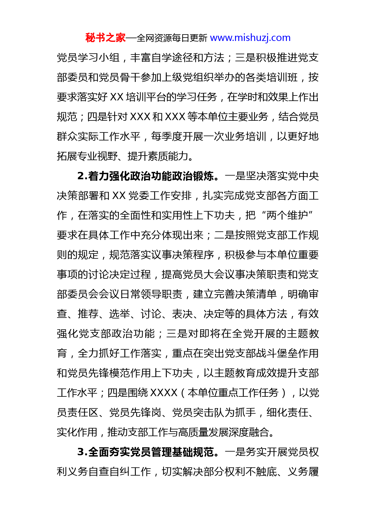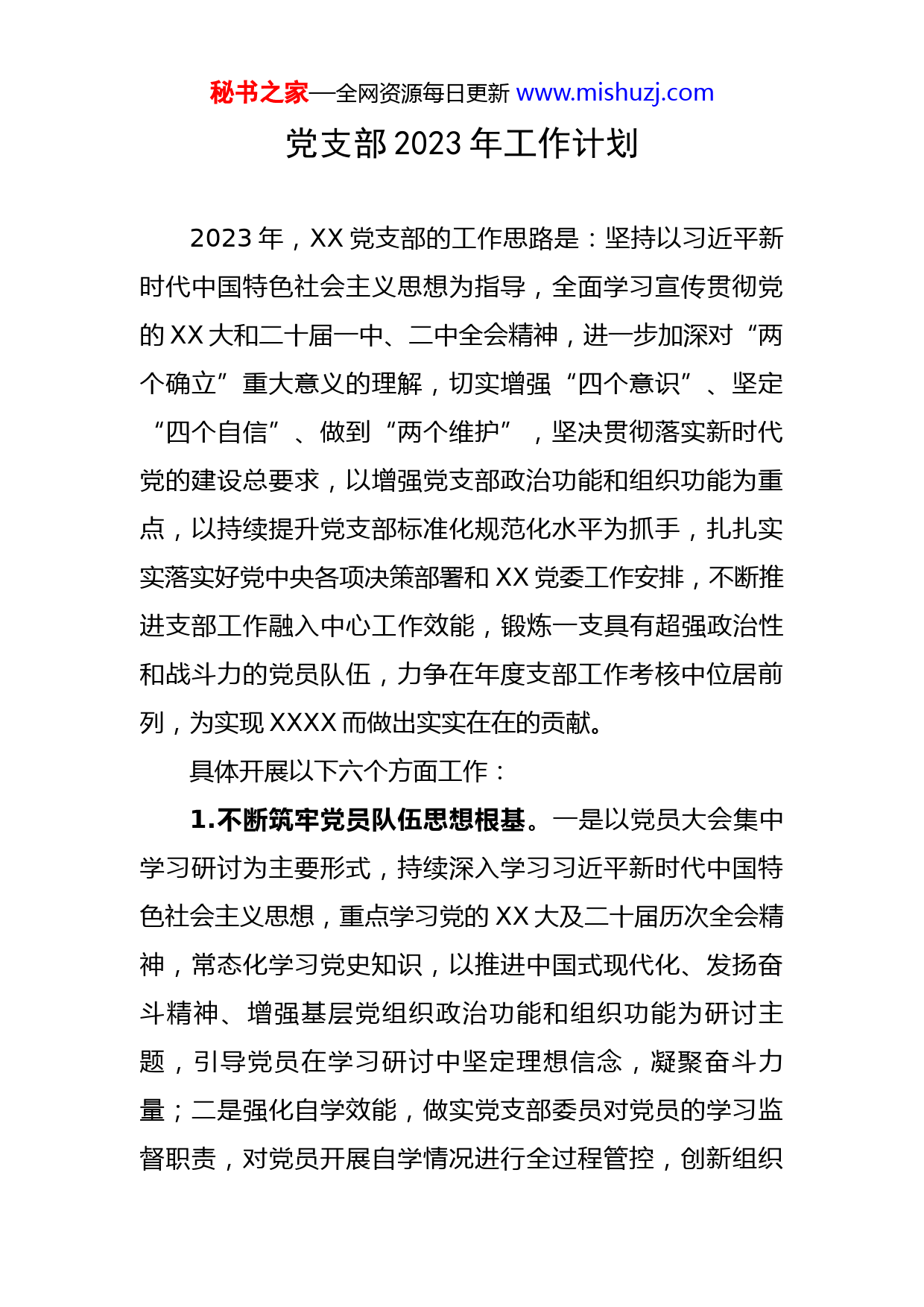 秘书之家—全网资源每日更新www.mishuzj.com党支部2023年工作计划2023年,XX党支部的工作思路是:坚持以习近平新时代中国特色社会主义思想为指导,全面学习宣传贯彻党的XX大和二十届一中、二中全会精神,进一步加深对“两个确立”重大意义的理解,切实增强“四个意识”、坚定“四个自信”、做到“两个维护”,坚决贯彻落实新时代党的建设总要求,以增强党支部政治功能和组织功能为重点,以持续提升党支部标准化规范化水平为抓手,扎扎实实落实好党中央各项决策部署和XX党委工作安排,不断推进支部工作融入中心工作效能,锻炼一支具有超强政治性和战斗力的党员队伍,力争在年度支部工作考核中位居前列,为实现XXXX而做出实实在在的贡献。具体开展以下六个方面工作:1.不断筑牢党员队伍思想根基。一是以党员大会集中学习研讨为主要形式,持续深入学习习近平新时代中国特色社会主义思想,重点学习党的XX大及二十届历次全会精神,常态化学习党史知识,以推进中国式现代化、发扬奋斗精神、增强基层党组织政治功能和组织功能为研讨主题,引导党员在学习研讨中坚定理想信念,凝聚奋斗力量;二是强化自学效能,做实党支部委员对党员的学习监督职责,对党员开展自学情况进行全过程管控,创新组织秘书之家—全网资源每日更新www.mishuzj.com党员学习小组,丰富自学途径和方法;三是积极推进党支部委员和党员骨干参加上级党组织举办的各类培训班,按要求落实好XX培训平台的学习任务,在学时和效果上作出规范;四是针对XXX和XXX等本单位主要业务,结合党员群众实际工作水平,每季度开展一次业务培训,以更好地拓展专业视野、提升素质能力。2.着力强化政治功能政治锻炼。一是坚决落实党中央决策部署和XX党委工作安排,扎实完成党支部各方面工作,在落实的全面性和实用性上下功夫,把“两个维护”要求在具体工作中充分体现出来;二是按照党支部工作规则的规定,规范落实议事决策程序,积极参与本单位重要事项的讨论决定过程,提高党员大会议事决策职责和党支部委员会会议日常领导职责,建立完善决策清单,明确审查、推荐、选举、讨论、表决、决定等的具体方法,有效强化党支部政治功能;三是对即将在全党开展的主题教育,全力抓好工作落实,重点在突出党支部战斗堡垒作用和党员先锋模范作用上下功夫,以主题教育成效提升支部工作水平;四是围绕XXXX(本单位重点工作任务),以党员责任区、党员先锋岗、党员突击队为抓手,细化责任、实化作用,推动支部工作与高质量发展深度融合。3.全面夯实党员管理基础规范。一是务实开展党员权利义务自查自纠工作,切实解决部分权利不触底、义务履秘书之家—全网资源每日更新www.mishuzj.com行不彻底的问题,以党支部和党员双向承诺的方式推动相关机制更加成熟完善;二是重点做好流动党员的管理工作,全面梳理流入及流出党员具体情况,划清流入地党支部与流出地党支部之间的责任边界,主动与相关党组织联系,通过签订委托书、试行流动党员证等方式确保流动党员全部纳入党组织管理、正常参加组织生活;三是按照XX党委的要求,进一步优化党费的收缴程序,统筹用好XXAPP和纸质存单的管理模式;四是推进党务公开、党员帮扶、党员处置、党员发展等工作更加规范,实现制度流程上墙,修整党员活动室,对党支部手册及其它支部工作资料进行全面整理,明确存档标准和责任划分。4.精准高效凝聚员工群众力量。一是深化党员对群众的帮扶效果,结合阶段性工作任务推进“1+N”的动态帮扶机制落地,实时掌握员工群众的思想和工作情况,在党员责任区、党员先锋队中适当增加群众比例,构建既突出党员作用又实现协作效能的工作格局;二是结合学习宣传贯彻党的XX大精神工作部署,组织开展群众性主题宣传活动,鼓励党员走上讲台为员工群众讲解党的XX大重要意义和核心思想,以更好地团结凝聚群众力量;三是统筹做好党员和群众的思想政治工作,通过常态化谈心谈话及时解开大家的思想困惑,及时了解在工作生活中切实存在的困难并予以帮助;四是以群众喜闻乐见的文体类活动为主要秘书之家—全网资源每日更新www.mishuzj.com形式,落实好上级工会、共青团的工作安排,与XX支部共同成立联合团支部,有效凝聚大家的智慧和力量。5.务实创新落实组织生活制度。一是完善“三会一课”落实清单,结合疫情防控三年来积累的新思路新办法,在内容、程序等方面进一步对“三会一课”作出规范,实现季度有计划、月度有研讨、细节有记录,明确党支部书记、党支部委员和党员在落实“三会一课”制度中的责任和管理关系;二是深入开展支部共建类活动,以主题党日为主要形式,以具体业务为基本导向,创新开展与XX党委领导下的其它党支部及有业务关联的业主党支部、社区党支部的联建活动,激发党小组主动向外借力、广泛联建;三是常态化开展批评和自我批评,除认真做好年度或专题组织生活会,每季度结合生产经营业务开展至少一次简化步骤、直指问题的党性分析活动;四是加强与组织关系在本支部的XX(上级领导)的沟通交流,提升党员领导干部双重组织生活在频次和效果上的贯通。6.提升政治素质加强自身建设。一是充分利用党支部委员会会议加强政治理论学习,以提升政治判断力、政治领悟力、政治执行力为重点,有计划系