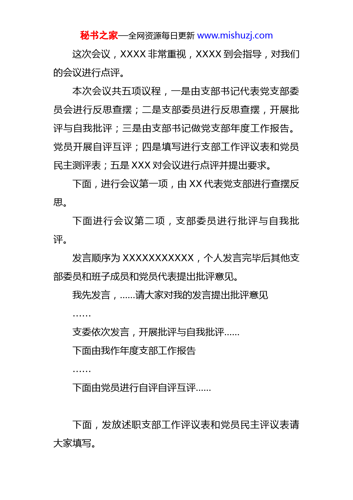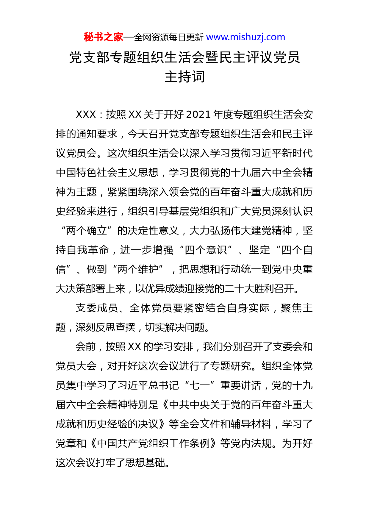 秘书之家—全网资源每日更新www.mishuzj.com党支部专题组织生活会暨民主评议党员主持词XXX:按照XX关于开好2021年度专题组织生活会安排的通知要求,今天召开党支部专题组织生活会和民主评议党员会。这次组织生活会以深入学习贯彻习近平新时代中国特色社会主义思想,学习贯彻党的十九届六中全会精神为主题,紧紧围绕深入领会党的百年奋斗重大成就和历史经验来进行,组织引导基层党组织和广大党员深刻认识“两个确立”的决定性意义,大力弘扬伟大建党精神,坚持自我革命,进一步增强“四个意识”、坚定“四个自信”、做到“两个维护”,把思想和行动统一到党中央重大决策部署上来,以优异成绩迎接党的二十大胜利召开。支委成员、全体党员要紧密结合自身实际,聚焦主题,深刻反思查摆,切实解决问题。会前,按照XX的学习安排,我们分别召开了支委会和党员大会,对开好这次会议进行了专题研究。组织全体党员集中学习了习近平总书记“七一”重要讲话,党的十九届六中全会精神特别是《中共中央关于党的百年奋斗重大成就和历史经验的决议》等全会文件和辅导材料,学习了党章和《中国共产党组织工作条例》等党内法规。为开好这次会议打牢了思想基础。秘书之家—全网资源每日更新www.mishuzj.com这次会议,XXXX非常重视,XXXX到会指导,对我们的会议进行点评。本次会议共五项议程,一是由支部书记代表党支部委员会进行反思查摆;二是支部委员进行反思查摆,开展批评与自我批评;三是由支部书记做党支部年度工作报告。党员开展自评互评;四是填写进行支部工作评议表和党员民主测评表;五是XXX对会议进行点评并提出要求。下面,进行会议第一项,由XX代表党支部进行查摆反思。下面进行会议第二项,支部委员进行批评与自我批评。发言顺序为XXXXXXXXXXX,个人发言完毕后其他支部委员和班子成员和党员代表提出批评意见。我先发言,……请大家对我的发言提出批评意见……支委依次发言,开展批评与自我批评……下面由我作年度支部工作报告……下面由党员进行自评自评互评……下面,发放述职支部工作评议表和党员民主评议表请大家填写。秘书之家—全网资源每日更新www.mishuzj.com(强调注意事项)下面,请XXXX对会议情况进行点评。好,刚才,XXXX对我们党支部班子进行了点评,对我们工作给予了肯定,同时提出了希望和要求,我们一定要不辜负领导的信任和期望,以更加饱满的工作热情、更加昂扬的斗志,投入到工作中。今天的会议到此结束,散会!