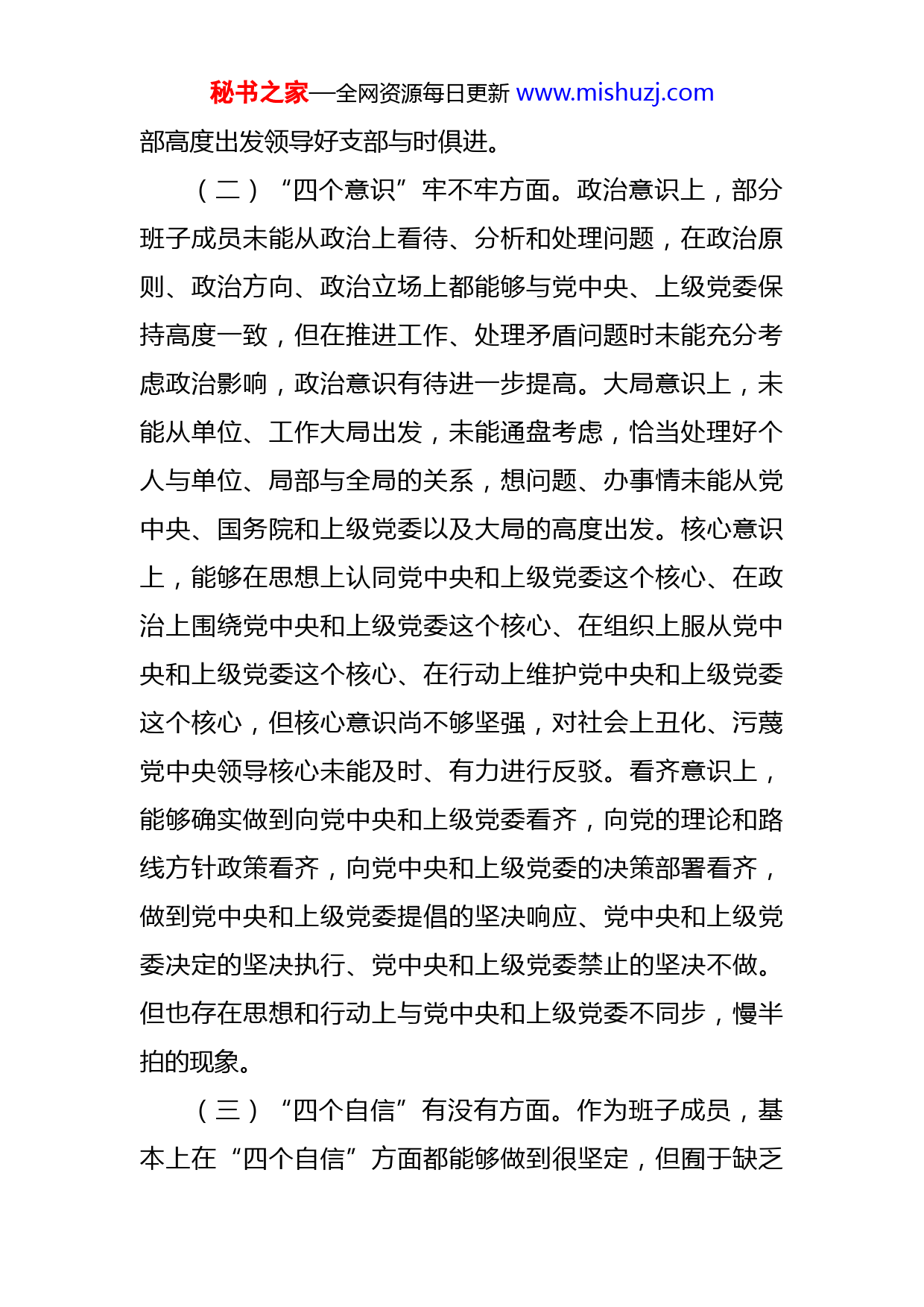 秘书之家—全网资源每日更新www.mishuzj.com党支部六个方面问题专题组织生活会对照检查材料按照组织生活会的通知要求,我支部严格对照自身“政治功能强不强、‘四个意识’牢不牢、‘四个自信’有没有、工作作风实不实、作用发挥好不好、自我要求严不严”等六个方面的要求和标准,认真进行了深入剖析,深刻查摆支部存在的问题和不足,并深入进行原因分析和明确整改措施,现将xx支部对照检查情况报告如下:一、存在问题和不足(一)政治功能强不强方面。总体来说,支部班子始终能够做到在言行上与党中央、国务院及上级党委保持高度一致,有较高的政治敏锐性和较强的政治责任感、使命感,政治坚定,立场鲜明。但也存在一些问题:一是大局观念不够。一些班子成员为能从政治的大局看问题、想事情,大局谋划不足,责任担当有所欠缺。二是抵御社会上的歪风邪气不够坚定,少数班子成员存在要干好工作,履行好职责,就要融入社会,要适应社会上的一些不良风气的错误想法。三是受市场经济大潮的冲击,部分班子成员政治信念有所松动,甚至有拜金主义、享乐主义、个人主义萌发的苗头。四是部分班子成员没有从班子做表率的高度出发,对大局把控不牢,对政治走向不明确,未能从支秘书之家—全网资源每日更新www.mishuzj.com部高度出发领导好支部与时俱进。(二)“四个意识”牢不牢方面。政治意识上,部分班子成员未能从政治上看待、分析和处理问题,在政治原则、政治方向、政治立场上都能够与党中央、上级党委保持高度一致,但在推进工作、处理矛盾问题时未能充分考虑政治影响,政治意识有待进一步提高。大局意识上,未能从单位、工作大局出发,未能通盘考虑,恰当处理好个人与单位、局部与全局的关系,想问题、办事情未能从党中央、国务院和上级党委以及大局的高度出发。核心意识上,能够在思想上认同党中央和上级党委这个核心、在政治上围绕党中央和上级党委这个核心、在组织上服从党中央和上级党委这个核心、在行动上维护党中央和上级党委这个核心,但核心意识尚不够坚强,对社会上丑化、污蔑党中央领导核心未能及时、有力进行反驳。看齐意识上,能够确实做到向党中央和上级党委看齐,向党的理论和路线方针政策看齐,向党中央和上级党委的决策部署看齐,做到党中央和上级党委提倡的坚决响应、党中央和上级党委决定的坚决执行、党中央和上级党委禁止的坚决不做。但也存在思想和行动上与党中央和上级党委不同步,慢半拍的现象。(三)“四个自信”有没有方面。作为班子成员,基本上在“四个自信”方面都能够做到很坚定,但囿于缺乏秘书之家—全网资源每日更新www.mishuzj.com系统全面地学习,部分班子成员对“四个自信”理解不够到位,对“四个自信”的理论精髓、思想内涵未能全面、深刻的认识。(四)工作作风实不实方面。工作作风方面,支部班子始终能够做到实事求是、求真务实,严格贯彻落实党的群众路线,深入落实党风廉政,都能够深入基层、深入群众,与群众打成一片,坚持走党的群众路线。但也存在解放思想、开拓创新不够,想问题、办事情多受主观主义、经验主义的影响,解放思想、开拓创新能力不足。极个别班子成员甚至存在工作作风不实,有溜须拍马、重安排不重落实、重会议不重执行等不良现象,极大影响了班子的威信力和公信力,破坏了支部的光辉形象。(五)作用发挥好不好方面。作用发挥方面,支部班子始终能够做到牢记自身工作职责,恪尽职守、认认真真、兢兢业业、任劳任怨,履行班子义务,带领支部党员积极发挥自身作用。但也存在支部班子过于重工作落实轻作用发挥等不足。将大多数时间投入在支部工作上,对支部党员作用发挥好不好、足不足、行不行没有认真监督、勤于督促,一定程度导致支部党员作用发挥意识不牢,作用发挥不够。(六)自我要求严不严方面。总体而言,支部班子能够对自我有所要求,但要求尚不够严格,表现在:一是从秘书之家—全网资源每日更新www.mishuzj.com严从实的标准尚未确立。部分支部班子成员存在对他人要求严格,对自己却放个口子、网开一面的不良现象。二是对业务知识学习不够。部分支部班子成员总认为自己是领导者,不用做具体业务,业务知识不用深入系统去学。三是工作纪律遵守不够严格。部分班子成员认为自己是领导,存在摆老资格的现象。四是工作创先争优氛围不足。部分班子成员存在得过且过、混日子、做一天和尚撞一天钟的消极思想,干事创业意愿不强烈,怕出事、怕出问题,总认为多一事不如少一事,宁做庸官也不愿意出错担责。二、存在问题的主要原因造成以上问题的原因主要有以下几点:一是政治和业务的学习不够。支部班子对政治理论和业务学习不够系统深入,一定程度上削弱了自身政治功能。二是党性锤炼不足。对个人世界观、人生观、价值观改造不够。三是工作作风不够扎实。“高标准、严要求”的意识还不强,对班子要求不能从严,工作作风漂浮,深入基层、群众的工作作风还有待加强。四是宗旨和信念意识不够坚定。总认为全心全意为人民服务只是一种口号,共产主义的理想信念也不可能在我们这一代人实现,抱着只要平时工作不出错,认真工作,就是全心全意为人民服务,慵懒的思想较为严重,乏积极进取的主动性和积极性尚不