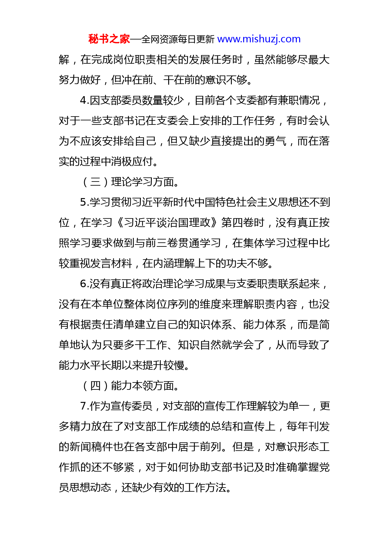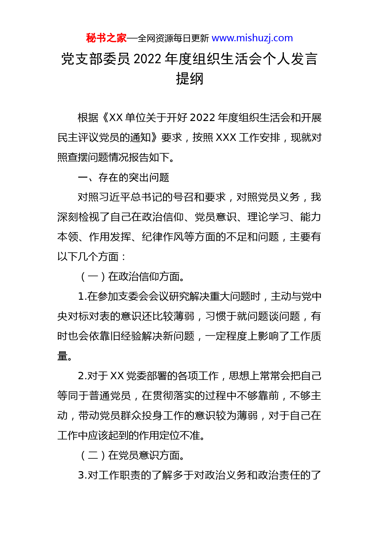 秘书之家—全网资源每日更新www.mishuzj.com党支部委员2022年度组织生活会个人发言提纲根据《XX单位关于开好2022年度组织生活会和开展民主评议党员的通知》要求,按照XXX工作安排,现就对照查摆问题情况报告如下。一、存在的突出问题对照习近平总书记的号召和要求,对照党员义务,我深刻检视了自己在政治信仰、党员意识、理论学习、能力本领、作用发挥、纪律作风等方面的不足和问题,主要有以下几个方面:(一)在政治信仰方面。1.在参加支委会会议研究解决重大问题时,主动与党中央对标对表的意识还比较薄弱,习惯于就问题谈问题,有时也会依靠旧经验解决新问题,一定程度上影响了工作质量。2.对于XX党委部署的各项工作,思想上常常会把自己等同于普通党员,在贯彻落实的过程中不够靠前,不够主动,带动党员群众投身工作的意识较为薄弱,对于自己在工作中应该起到的作用定位不准。(二)在党员意识方面。3.对工作职责的了解多于对政治义务和政治责任的了秘书之家—全网资源每日更新www.mishuzj.com解,在完成岗位职责相关的发展任务时,虽然能够尽最大努力做好,但冲在前、干在前的意识不够。4.因支部委员数量较少,目前各个支委都有兼职情况,对于一些支部书记在支委会上安排的工作任务,有时会认为不应该安排给自己,但又缺少直接提出的勇气,而在落实的过程中消极应付。(三)理论学习方面。5.学习贯彻习近平新时代中国特色社会主义思想还不到位,在学习《习近平谈治国理政》第四卷时,没有真正按照学习要求做到与前三卷贯通学习,在集体学习过程中比较重视发言材料,在内涵理解上下的功夫不够。6.没有真正将政治理论学习成果与支委职责联系起来,没有在本单位整体岗位序列的维度来理解职责内容,也没有根据责任清单建立自己的知识体系、能力体系,而是简单地认为只要多干工作、知识自然就学会了,从而导致了能力水平长期以来提升较慢。(四)能力本领方面。7.作为宣传委员,对支部的宣传工作理解较为单一,更多精力放在了对支部工作成绩的总结和宣传上,每年刊发的新闻稿件也在各支部中居于前列。但是,对意识形态工作抓的还不够紧,对于如何协助支部书记及时准确掌握党员思想动态,还缺少有效的工作方法。秘书之家—全网资源每日更新www.mishuzj.com8.在工作中遭遇困难难以解决时,有等一等、看一看的心理,2022年因疫情管控进行静默管理期间,组织生活没有按规定进行落实。自己作为组织委员,没有想办法通过创新形式尽可能地开展工作,而采取了一味等待的策略,这也导致了2022年支部组织生活的空档,影响了考核得分。(五)在作用发挥方面。9.在三年来的疫情防控工作中,工作热情、工作劲头随着时间的推移不断减弱,一开始能够按照要求坚决落实每一项工作,思想上高度紧张、严防死守,但在防控逐渐趋于常态化之后,对于行程排查、卫生消杀等措施的落实没有以前严格了,重视程度也降低了。10.对于支委的带头作用认识比较模糊,在开展支部组织生活的过程中,把落实好支部书记交办的任务作为唯一目的,在与党员共同学习共同进行党性锻炼时没有以更高标准要求自己。(六)纪律作风方面。11.作为纪检委员,把工作的重心都放在了开展警示教育上,对于工作纪律中的小事小节不够重视,从党员的言行中及时发现问题、管住问题还没有真正做到。12.在开展批评和自我批评的过程中,能够指出自己和对方客观存在的一般性问题,但对于一些涉及工作能力、秘书之家—全网资源每日更新www.mishuzj.com认知短板的敏感性问题有时会选择视而不见。二、产生问题的原因分析通过对以上问题的深入分析,我认为主要有以下原因导致了问题出现:一是政治标准不够落实。对党支部委员应该肩负的政治责任在思想认识上还不清晰,站在讲政治的高度看待支委分工和支部工作还不主动不具体,对于党中央的决策部署和XX党委的工作安排,虽然能够全力推进落实,但对于有的内容并没有做到完全理解领会,这对执行效果有一定影响,政治锻炼和实践锻炼没有实现有机统一。二是履职尽责不够坚定。在思想上更为重视岗位职责的履行,而把支委职责放在了次要的位置,特别是近年来随着全面从严治党不断向纵深发展,支部工作在复杂度与工作量上都明显升高,而自己党性认识的提升还不够快,无法对持续递增的工作压力进行有效支撑,对自己肩负的支部XX工作缺乏深度思考,与岗位职责互促互补的格局还没有形成。三是工作模式不够有效。对XXXX等需要XX委员落实的重点工作,在方法途径上还有些因循守旧,没有正确处理好守正创新的关系,面对上级党委的指导意见虽然能够坚定推进落实,但有时理解并不透彻,结合支部工作现状和党员队伍呈现的新特点创新开展工作的能力还不够高,秘书之家—全网资源每日更新www.mishuzj.com在条线上将支委工作与上级党委职能部门工作联系起来还不紧密。四是拼搏劲头不够充足。对支部委员在推进高质量发展的大方向下应该起到的作用认识不清,对如何通过自己的努力有效提升支部工作水平思考不深,也没有对职业发展路径进行清晰谋划,整体上缺少宏观定位,这导致了自己的工作热情忽高忽低,受外部因素影响较大,发自内心的拼搏进取、锐意奋发的斗志和动力没有真正形成。三、下一步整改措施2023年,我将继续以习近平新时