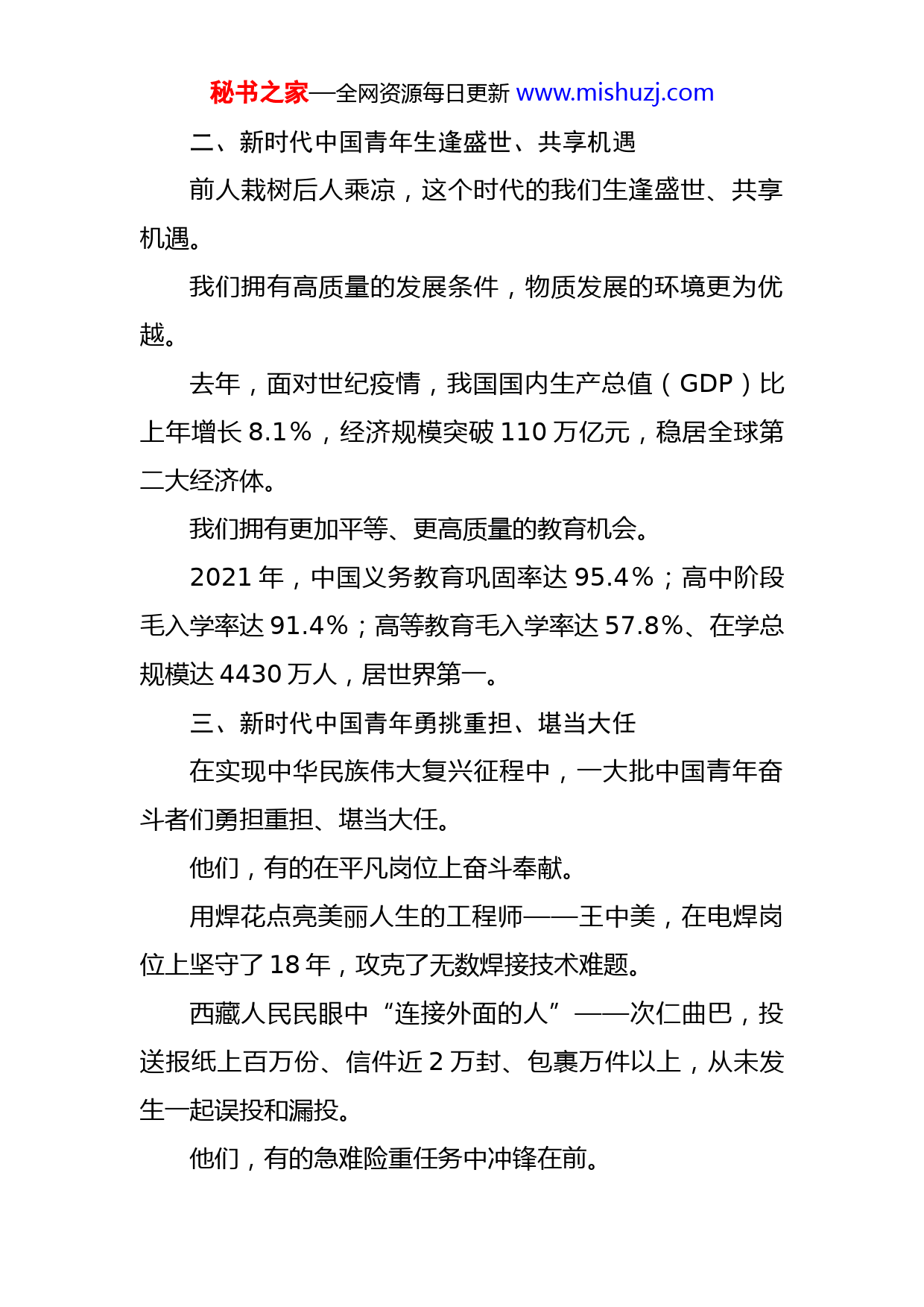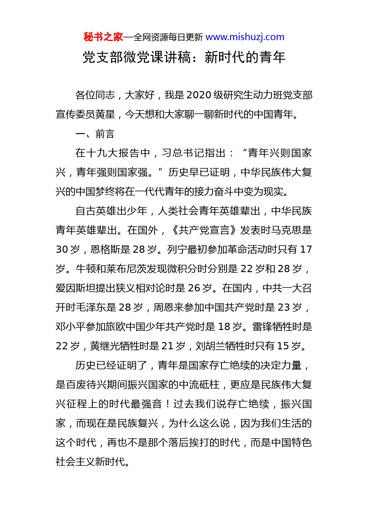 秘书之家—全网资源每日更新www.mishuzj.com党支部微党课讲稿:新时代的青年各位同志,大家好,我是2020级研究生动力班党支部宣传委员黄星,今天想和大家聊一聊新时代的中国青年。一、前言在十九大报告中,习总书记指出:“青年兴则国家兴,青年强则国家强。”历史早已证明,中华民族伟大复兴的中国梦终将在一代代青年的接力奋斗中变为现实。自古英雄出少年,人类社会青年英雄辈出,中华民族青年英雄辈出。在国外,《共产党宣言》发表时马克思是30岁,恩格斯是28岁。列宁最初参加革命活动时只有17岁。牛顿和莱布尼茨发现微积分时分别是22岁和28岁,爱因斯坦提出狭义相对论时是26岁。在国内,中共一大召开时毛泽东是28岁,周恩来参加中国共产党时是23岁,邓小平参加旅欧中国少年共产党时是18岁。雷锋牺牲时是22岁,黄继光牺牲时是21岁,刘胡兰牺牲时只有15岁。历史已经证明了,青年是国家存亡绝续的决定力量,是百废待兴期间振兴国家的中流砥柱,更应是民族伟大复兴征程上的时代最强音!过去我们说存亡绝续,振兴国家,而现在是民族复兴,为什么这么说,因为我们生活的这个时代,再也不是那个落后挨打的时代,而是中国特色社会主义新时代。秘书之家—全网资源每日更新www.mishuzj.com二、新时代中国青年生逢盛世、共享机遇前人栽树后人乘凉,这个时代的我们生逢盛世、共享机遇。我们拥有高质量的发展条件,物质发展的环境更为优越。去年,面对世纪疫情,我国国内生产总值(GDP)比上年增长8.1%,经济规模突破110万亿元,稳居全球第二大经济体。我们拥有更加平等、更高质量的教育机会。2021年,中国义务教育巩固率达95.4%;高中阶段毛入学率达91.4%;高等教育毛入学率达57.8%、在学总规模达4430万人,居世界第一。三、新时代中国青年勇挑重担、堪当大任在实现中华民族伟大复兴征程中,一大批中国青年奋斗者们勇担重担、堪当大任。他们,有的在平凡岗位上奋斗奉献。用焊花点亮美丽人生的工程师——王中美,在电焊岗位上坚守了18年,攻克了无数焊接技术难题。西藏人民民眼中“连接外面的人”——次仁曲巴,投送报纸上百万份、信件近2万封、包裹万件以上,从未发生一起误投和漏投。他们,有的急难险重任务中冲锋在前。秘书之家—全网资源每日更新www.mishuzj.com武警少校宋文博,他因参加洞口县抗洪救灾,疲劳过度引发高血压脑出血,不幸倒在救灾一线,年仅36岁。彭银华医生,为抗击疫情,他推迟了原定的婚期,不幸在抗击疫情一线感染新冠肺炎去世,“永远”地延迟了婚期。他们,有的在基层一线经受磨砺。如守护苗乡的”白衣天使”李春燕,从卫校毕业后来到贵州大塘村,筹集资金开办了该村有史以来的第一个卫生室。还有我们身边的榜样人物,投身西部支教的青春之花——李莎。李莎是我校2019届本科毕业生、研究生支教团成员。在赴学校开会途中遭遇车祸,经全力抢救无效,不幸去世,年仅21岁。他们,有的则在社会文明建设中引风气之先。我们熟知的青年男歌手、演员——张艺兴。担任湖南省共青团宣传工作推广大使,通过个人影响力带动粉丝们做公益,实施捐赠图书室、音乐教室等多个助学项目。北京奥运会火炬手董明,她在跳水比赛中为避让队友摔成了高位截瘫,身残志坚,向上向善,参加全国残疾人运动会,继续学习。四、新时代中国青年素质过硬、全面发展这个时代不仅有他们,也有我们,新时代的我们练就秘书之家—全网资源每日更新www.mishuzj.com过硬素质、全面发展。新时代的我们把树立正确的理想、坚定的信念作为立身之本,努力成长为党、国家和人民所期盼的有志青年。新时代的我们身心素质更好更强,能够经得起风雨、受得住磨砺、扛得住摔打。新时代的我们学习的主动性、自觉性进一步提高,科学文化素养迈上新台阶。新时代的我们以更加自信的态度、更加主动的精神,适应社会、融入社会,参与社会发展进程,展现出积极的社会参与意识和能力,成为正能量的倡导者和践行者。五、总结青年一代有理想、有本领、有担当,国家就有前途,民族就有希望。中国的未来属于青年,让我们在实现民族复兴的伟大实践中放飞青春梦想!