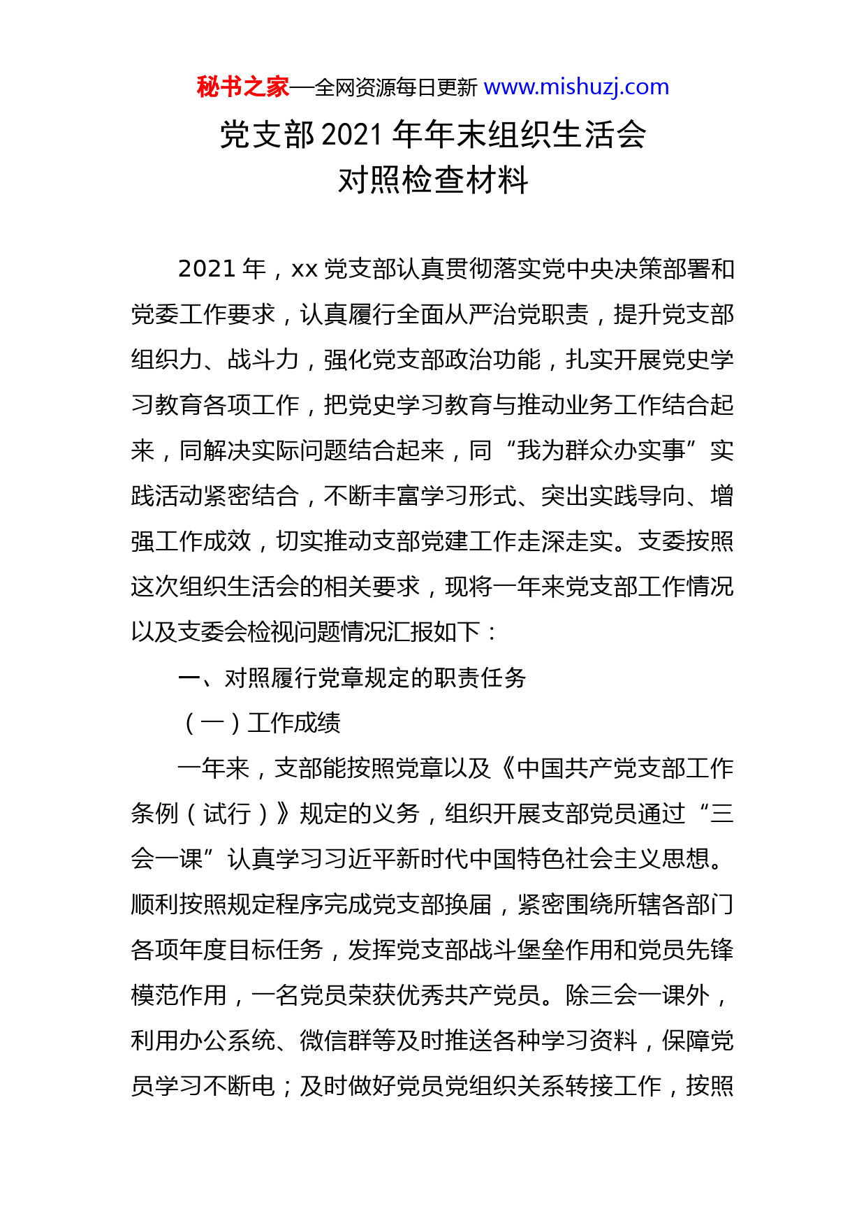 秘书之家—全网资源每日更新www.mishuzj.com党支部2021年年末组织生活会对照检查材料2021年,xx党支部认真贯彻落实党中央决策部署和党委工作要求,认真履行全面从严治党职责,提升党支部组织力、战斗力,强化党支部政治功能,扎实开展党史学习教育各项工作,把党史学习教育与推动业务工作结合起来,同解决实际问题结合起来,同“我为群众办实事”实践活动紧密结合,不断丰富学习形式、突出实践导向、增强工作成效,切实推动支部党建工作走深走实。支委按照这次组织生活会的相关要求,现将一年来党支部工作情况以及支委会检视问题情况汇报如下:一、对照履行党章规定的职责任务(一)工作成绩一年来,支部能按照党章以及《中国共产党支部工作条例(试行)》规定的义务,组织开展支部党员通过“三会一课”认真学习习近平新时代中国特色社会主义思想。顺利按照规定程序完成党支部换届,紧密围绕所辖各部门各项年度目标任务,发挥党支部战斗堡垒作用和党员先锋模范作用,一名党员荣获优秀共产党员。除三会一课外,利用办公系统、微信群等及时推送各种学习资料,保障党员学习不断电;及时做好党员党组织关系转接工作,按照秘书之家—全网资源每日更新www.mishuzj.com规范发展党员1名,入党积极分子2名,并完成新党员培训。做好与预备党员以及新提交入党申请书的员工谈心谈话工作;抓好党费收缴和管理工作。(二)工作不足对照党章规定,党支部在支部日常管理中还有不足。一是主题党日活动主题不鲜明,时常将主题党日活动与“三会一课”的日常学习混淆,且每月固定的一天时间不固定,没有充分体现主题党日的作用。二是支部换届中,对党组织换届的相关党内规章研究不透,导致初次选举人数未满足应到会人数要求,存在选举失误,后虽经过改正,但造成的影响不容忽视。三是支委研究支部工作不充分,在涉及支部重大问题如换届、党员发展等,支委研讨发表意见不充分,且各支委围绕纪检、组织、宣传、群团等条线发挥作用不明显,支部书记工作压力较重,一些日常工作容易有瑕疵。(三)改进措施一是安排月度支部工作计划,支委对计划开展定期研究,尤其是对下月主题党日活动的主题进行明确,开展具有重要意义同时又丰富多彩的主题活动,每次总结活动效果,给活动评分。二是开展党员积分活动,对党员参加组织生活的情况,进行量化,出勤次数不达标的党员予以公示,并在民主评议时不得评为优秀。三是更好地发挥支委秘书之家—全网资源每日更新www.mishuzj.com作用,党支部书记更多授权支委在相关业务条线主导开展各项工作和活动,呈现支委齐抓共管的面貌。二、对照落实党中央和公司党委部署要求(一)工作成绩一年来,党支部能认真宣传和执行党委布置的各项工作任务,按照党委工作要点认真编制支部工作年度工作计划,并将工作计划分解到支委个人,明确时间节点、目标、成果标志,共完成年度工作项目x条,截至年底完成率100%。每月按时检验党委布置的党史学习教育、100周年活动等工作要求。支部书记在年度述职中,就上述工作完全情况一一向党委汇报。(二)工作不足一是支委对一些党中央和公司党委的部署理解还不透彻,没有分清哪些是党委层面应该做的,哪些是支部层面应该做的,更多侧重学习,但贯彻比较弱化。二是支部结合上级部署,动员广大党员职工落实不够有力,方法不多,融入中心的举措不够扎实,党建特色不够鲜明。(三)改进措施开展支部党员工程项目,对党委的部署,将任务目标结合支部所在单位的业务实际进行分解,通过建立党员责任区、党员工程等,以党员项目制的方式,组织党员攻坚克难,确保相关任务得到落实。秘书之家—全网资源每日更新www.mishuzj.com三、对照完成党史学习教育、专项整治、巡视巡察以及上年度组织生活会问题整改情况(一)工作成绩党支部能把坚持抓好党史学习教育作为今年的一项重要政治任务,把思想和行动统一到习近平总书记重要讲话精神及公司党委各项部署要求上来,精心组织开展党支部党史教育学习,突出重点、明确要求、务求实效,从党的百年伟大奋斗历程中汲取继续前进的智慧和力量。一方面,党支部下发《党史学习教育学习材料清单》及学习材料,利用党员大会、主题党日活动等活动集中学习习近平总书记“七一”重要讲话精神、十九届六中全会精神等内容;另一方面,组织党员收看“七一”庆祝中国共产党成立100周年大会直播,组织党员前往纪念馆开展党史学习教育。(二)工作不足在组织开展党史学习教育方面,理论学习还不够深入系统,对《中国共产党简史》等的学习不够深入,读原著、学原文、悟原理还有待加强,熟练运用党史中的宝贵经验指导实际工作方面还需要进一步提升。(三)改进措施把党史学习教育作为增强党性修养的基本功,常态化抓紧抓好,从党史中汲取宝贵历史经验,坚定不移向党中秘书之家—全网资源每日更新www.mishuzj.com央看齐,不断提高政治判断力、政治领悟力、政治执行力,严明政治纪律和政治规矩,推动党员干部政治意识明显增强、政治觉悟明显提高。高质量安排好党支部中心组学习,邀请公司党委委员讲党课,进一步增强以史为鉴、开创未来的责任感。四、对照职工群众的新期待(一)工作成绩突出实践导向,切实推动“我为群众办实事”重点项目。注重将党史学习