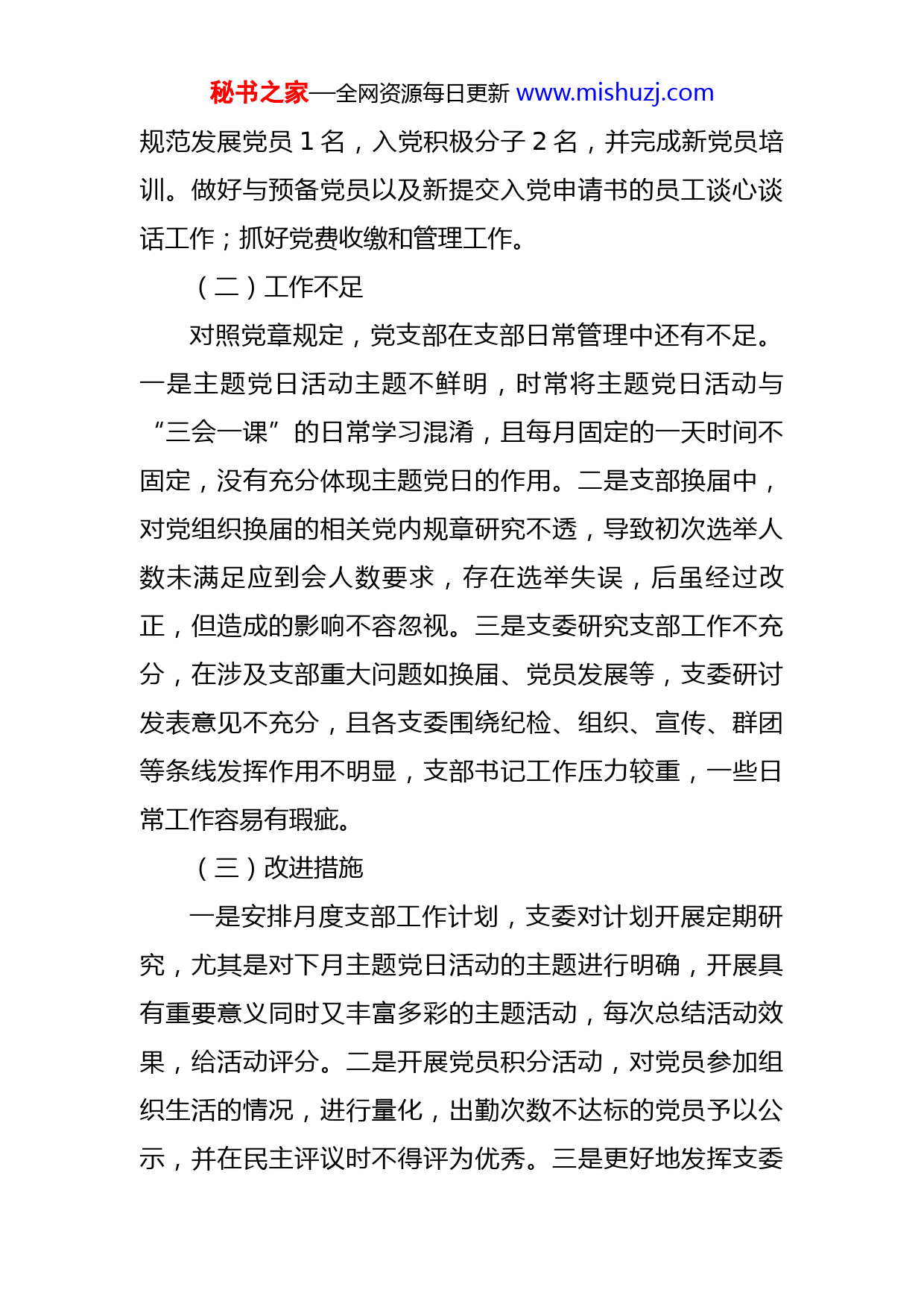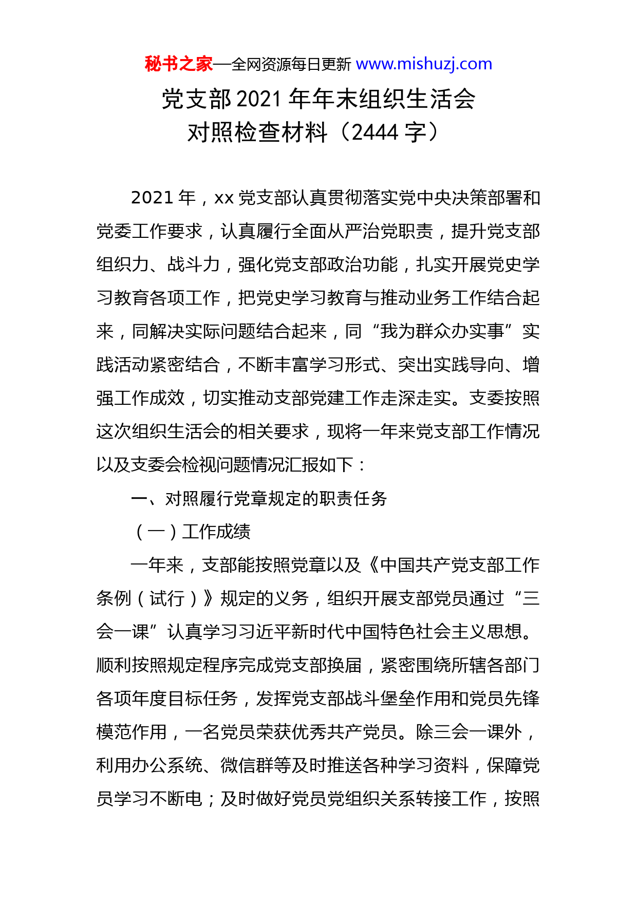 秘书之家—全网资源每日更新www.mishuzj.com党支部2021年年末组织生活会对照检查材料(2444字)2021年,xx党支部认真贯彻落实党中央决策部署和党委工作要求,认真履行全面从严治党职责,提升党支部组织力、战斗力,强化党支部政治功能,扎实开展党史学习教育各项工作,把党史学习教育与推动业务工作结合起来,同解决实际问题结合起来,同“我为群众办实事”实践活动紧密结合,不断丰富学习形式、突出实践导向、增强工作成效,切实推动支部党建工作走深走实。支委按照这次组织生活会的相关要求,现将一年来党支部工作情况以及支委会检视问题情况汇报如下:一、对照履行党章规定的职责任务(一)工作成绩一年来,支部能按照党章以及《中国共产党支部工作条例(试行)》规定的义务,组织开展支部党员通过“三会一课”认真学习习近平新时代中国特色社会主义思想。顺利按照规定程序完成党支部换届,紧密围绕所辖各部门各项年度目标任务,发挥党支部战斗堡垒作用和党员先锋模范作用,一名党员荣获优秀共产党员。除三会一课外,利用办公系统、微信群等及时推送各种学习资料,保障党员学习不断电;及时做好党员党组织关系转接工作,按照秘书之家—全网资源每日更新www.mishuzj.com规范发展党员1名,入党积极分子2名,并完成新党员培训。做好与预备党员以及新提交入党申请书的员工谈心谈话工作;抓好党费收缴和管理工作。(二)工作不足对照党章规定,党支部在支部日常管理中还有不足。一是主题党日活动主题不鲜明,时常将主题党日活动与“三会一课”的日常学习混淆,且每月固定的一天时间不固定,没有充分体现主题党日的作用。二是支部换届中,对党组织换届的相关党内规章研究不透,导致初次选举人数未满足应到会人数要求,存在选举失误,后虽经过改正,但造成的影响不容忽视。三是支委研究支部工作不充分,在涉及支部重大问题如换届、党员发展等,支委研讨发表意见不充分,且各支委围绕纪检、组织、宣传、群团等条线发挥作用不明显,支部书记工作压力较重,一些日常工作容易有瑕疵。(三)改进措施一是安排月度支部工作计划,支委对计划开展定期研究,尤其是对下月主题党日活动的主题进行明确,开展具有重要意义同时又丰富多彩的主题活动,每次总结活动效果,给活动评分。二是开展党员积分活动,对党员参加组织生活的情况,进行量化,出勤次数不达标的党员予以公示,并在民主评议时不得评为优秀。三是更好地发挥支委秘书之家—全网资源每日更新www.mishuzj.com作用,党支部书记更多授权支委在相关业务条线主导开展各项工作和活动,呈现支委齐抓共管的面貌。二、对照落实党中央和公司党委部署要求(一)工作成绩一年来,党支部能认真宣传和执行党委布置的各项工作任务,按照党委工作要点认真编制支部工作年度工作计划,并将工作计划分解到支委个人,明确时间节点、目标、成果标志,共完成年度工作项目x条,截至年底完成率100%。每月按时检验党委布置的党史学习教育、100周年活动等工作要求。支部书记在年度述职中,就上述工作完全情况一一向党委汇报。(二)工作不足一是支委对一些党中央和公司党委的部署理解还不透彻,没有分清哪些是党委层面应该做的,哪些是支部层面应该做的,更多侧重学习,但贯彻比较弱化。二是支部结合上级部署,动员广大党员职工落实不够有力,方法不多,融入中心的举措不够扎实,党建特色不够鲜明。(三)改进措施开展支部党员工程项目,对党委的部署,将任务目标结合支部所在单位的业务实际进行分解,通过建立党员责任区、党员工程等,以党员项目制的方式,组织党员攻坚克难,确保相关任务得到落实。秘书之家—全网资源每日更新www.mishuzj.com三、对照完成党史学习教育、专项整治、巡视巡察以及上年度组织生活会问题整改情况(一)工作成绩党支部能把坚持抓好党史学习教育作为今年的一项重要政治任务,把思想和行动统一到习近平总书记重要讲话精神及公司党委各项部署要求上来,精心组织开展党支部党史教育学习,突出重点、明确要求、务求实效,从党的百年伟大奋斗历程中汲取继续前进的智慧和力量。一方面,党支部下发《党史学习教育学习材料清单》及学习材料,利用党员大会、主题党日活动等活动集中学习习近平总书记“七一”重要讲话精神、十九届六中全会精神等内容;另一方面,组织党员收看“七一”庆祝中国共产党成立100周年大会直播,组织党员前往纪念馆开展党史学习教育。(二)工作不足在组织开展党史学习教育方面,理论学习还不够深入系统,对《中国共产党简史》等的学习不够深入,读原著、学原文、悟原理还有待加强,熟练运用党史中的宝贵经验指导实际工作方面还需要进一步提升。(三)改进措施把党史学习教育作为增强党性修养的基本功,常态化抓紧抓好,从党史中汲取宝贵历史经验,坚定不移向党中秘书之家—全网资源每日更新www.mishuzj.com央看齐,不断提高政治判断力、政治领悟力、政治执行力,严明政治纪律和政治规矩,推动党员干部政治意识明显增强、政治觉悟明显提高。高质量安排好党支部中心组学习,邀请公司党委委员讲党课,进一步增强以史为鉴、开创未来的责任感。四、对照职工群众的新期待(一)工作成绩突出实践导向,切实推动“我为群众办实事”重点项目。注重将党