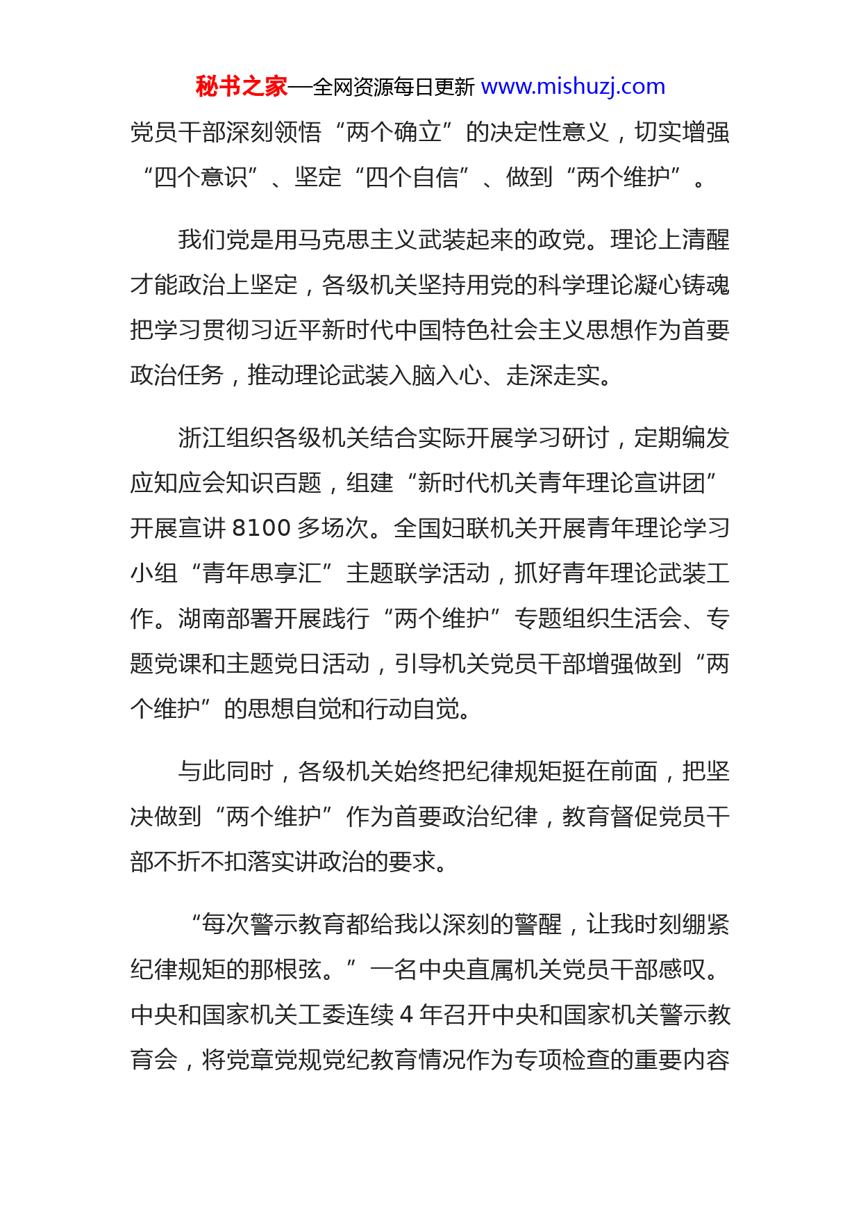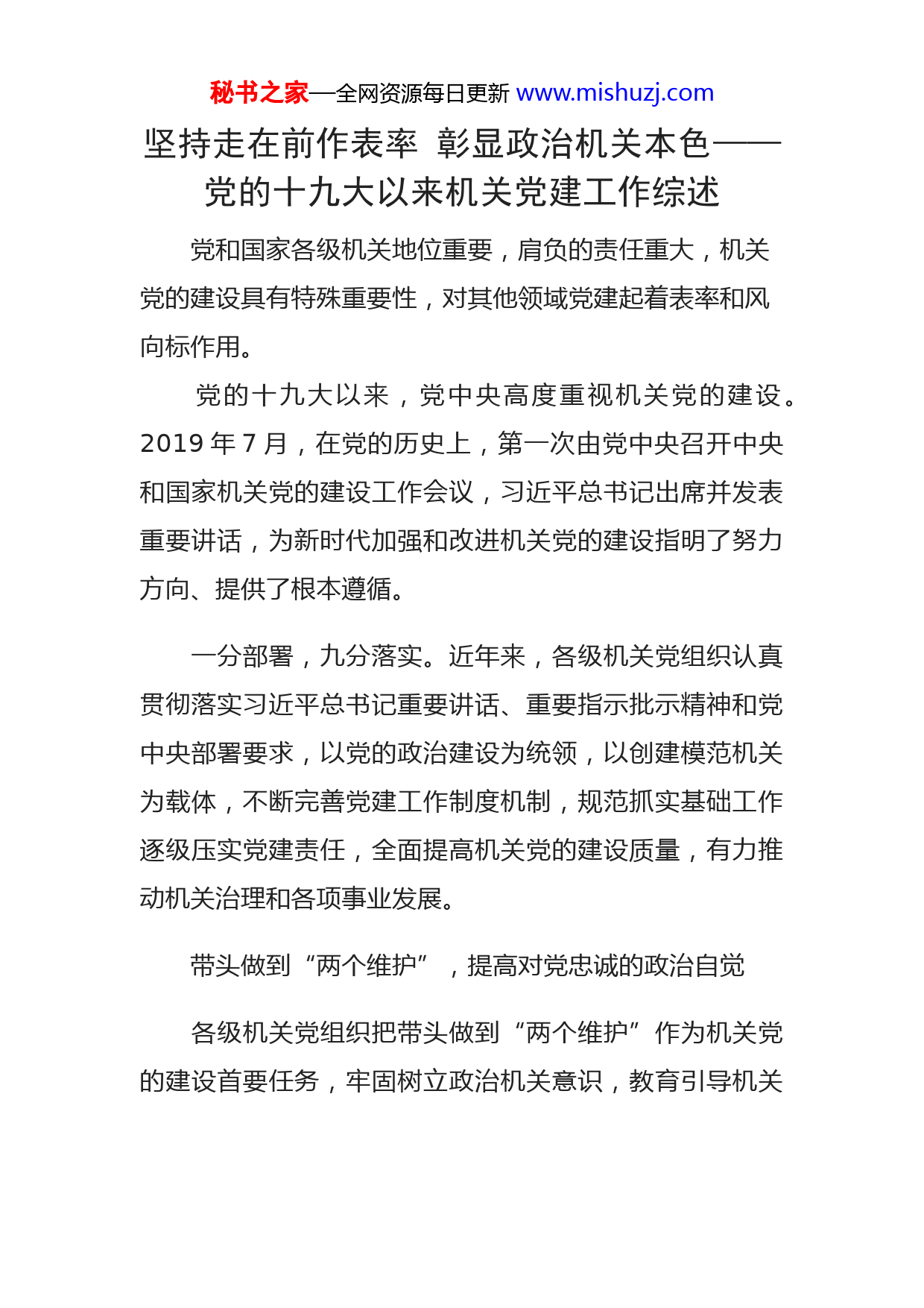 秘书之家—全网资源每日更新www.mishuzj.com坚持走在前作表率彰显政治机关本色——党的十九大以来机关党建工作综述党和国家各级机关地位重要,肩负的责任重大,机关党的建设具有特殊重要性,对其他领域党建起着表率和风向标作用。党的十九大以来,党中央高度重视机关党的建设。2019年7月,在党的历史上,第一次由党中央召开中央和国家机关党的建设工作会议,习近平总书记出席并发表重要讲话,为新时代加强和改进机关党的建设指明了努力方向、提供了根本遵循。一分部署,九分落实。近年来,各级机关党组织认真贯彻落实习近平总书记重要讲话、重要指示批示精神和党中央部署要求,以党的政治建设为统领,以创建模范机关为载体,不断完善党建工作制度机制,规范抓实基础工作逐级压实党建责任,全面提高机关党的建设质量,有力推动机关治理和各项事业发展。带头做到“两个维护”,提高对党忠诚的政治自觉各级机关党组织把带头做到“两个维护”作为机关党的建设首要任务,牢固树立政治机关意识,教育引导机关秘书之家—全网资源每日更新www.mishuzj.com党员干部深刻领悟“两个确立”的决定性意义,切实增强“四个意识”、坚定“四个自信”、做到“两个维护”。我们党是用马克思主义武装起来的政党。理论上清醒才能政治上坚定,各级机关坚持用党的科学理论凝心铸魂把学习贯彻习近平新时代中国特色社会主义思想作为首要政治任务,推动理论武装入脑入心、走深走实。浙江组织各级机关结合实际开展学习研讨,定期编发应知应会知识百题,组建“新时代机关青年理论宣讲团”开展宣讲8100多场次。全国妇联机关开展青年理论学习小组“青年思享汇”主题联学活动,抓好青年理论武装工作。湖南部署开展践行“两个维护”专题组织生活会、专题党课和主题党日活动,引导机关党员干部增强做到“两个维护”的思想自觉和行动自觉。与此同时,各级机关始终把纪律规矩挺在前面,把坚决做到“两个维护”作为首要政治纪律,教育督促党员干部不折不扣落实讲政治的要求。“每次警示教育都给我以深刻的警醒,让我时刻绷紧纪律规矩的那根弦。”一名中央直属机关党员干部感叹。中央和国家机关工委连续4年召开中央和国家机关警示教育会,将党章党规党纪教育情况作为专项检查的重要内容秘书之家—全网资源每日更新www.mishuzj.com制定《党员工作时间之外政治言行若干规定(试行)》,引导党员干部做政治上的明白人、老实人。云南深入开展“以案促改”警示教育,严肃查处违反政治纪律和政治规矩问题,持续净化政治生态。重庆深化“以案四说”,推动“以案四改”,突出治理不担当不作为、形式主义官僚主义等问题。习近平总书记强调,“带头做到‘两个维护’,既要体现高度的理性认同、情感认同,又要有坚决的维护定力和能力。提高政治定力和政治能力,要靠学习,更要靠政治历练和实践锻炼。”为提高政治本领,各级机关加强对党员干部的政治能力训练,强化政治担当。贵州实施党员干部政治能力提升行动,从政治领导、政治信仰、政治功能、政治生态和责任落实五个方面明确27条具体措施。江西充分利用红色资源优势开展机关红色文化建设,在全省各级机关广泛开展红色家书诵读活动,讲好红色故事、传承红色精神。党建与业务融合互促,在服务大局中担当作为2019年12月,党中央印发新修订的《中国共产党党和国家机关基层组织工作条例》,提出了机关基层党组织工作应当遵循的5条原则,其中之一就是“坚持围绕中心秘书之家—全网资源每日更新www.mishuzj.com建设队伍、服务群众,推动党建工作与业务工作深度融合相互促进”。处理好党建和业务的关系,解决“两张皮”问题,关键是找准结合点,推动机关党建和业务工作相互促进。围绕中心工作,各级机关党组织坚持把政治标准、政治要求贯彻工作全过程,推动党的主张和决策部署及时转化为本单位本领域政策措施,促进经济社会发展。中央和国家机关工委组织开展“以机关党建推动落实习近平总书记重要指示和党中央经济工作决策部署专项工作”,推动中央和国家机关党员干部认真学习贯彻习近平总书记重要指示批示精神,完整、准确、全面贯彻新发展理念,更好地按经济规律办事。国家税务总局在税收征管改革、减税降费等改革中,推动各级税务局成立党委书记任组长的领导小组,建立“一竿子到底”抓落实机制,把党对税收改革工作的领导落到实处。河北建立“激励奋斗促发展”机制,开展问计群众、问计企业、问计基层活动激励机关党员干部担当作为。辽宁持续推进“党建+营商环境建设”,组织党员领导干部建立党建工作联系点,深入基层开展调研,解决服务对象急难愁盼问题2800余个。秘书之家—全网资源每日更新www.mishuzj.com面对急难险重任务,各级机关党组织迅速行动,组织党员干部迎难而上,全力投入重大任务保障、疫情防控、防汛救灾等工作,让党旗在一线高高飘扬。北京统筹300家单位1.2万名党员干部参与新中国成立70周年、建党100周年庆祝活动服务保障工作,抽调上千名机关党员干部组建冬奥会冬残奥会筹办各工作专班吉林、广东积极应对今年的新冠肺炎疫情,迅速发动各级机关党员干部下沉基层,广泛参与物资配送等任务。山东统筹推进疫情防控和复工复产,累计选派