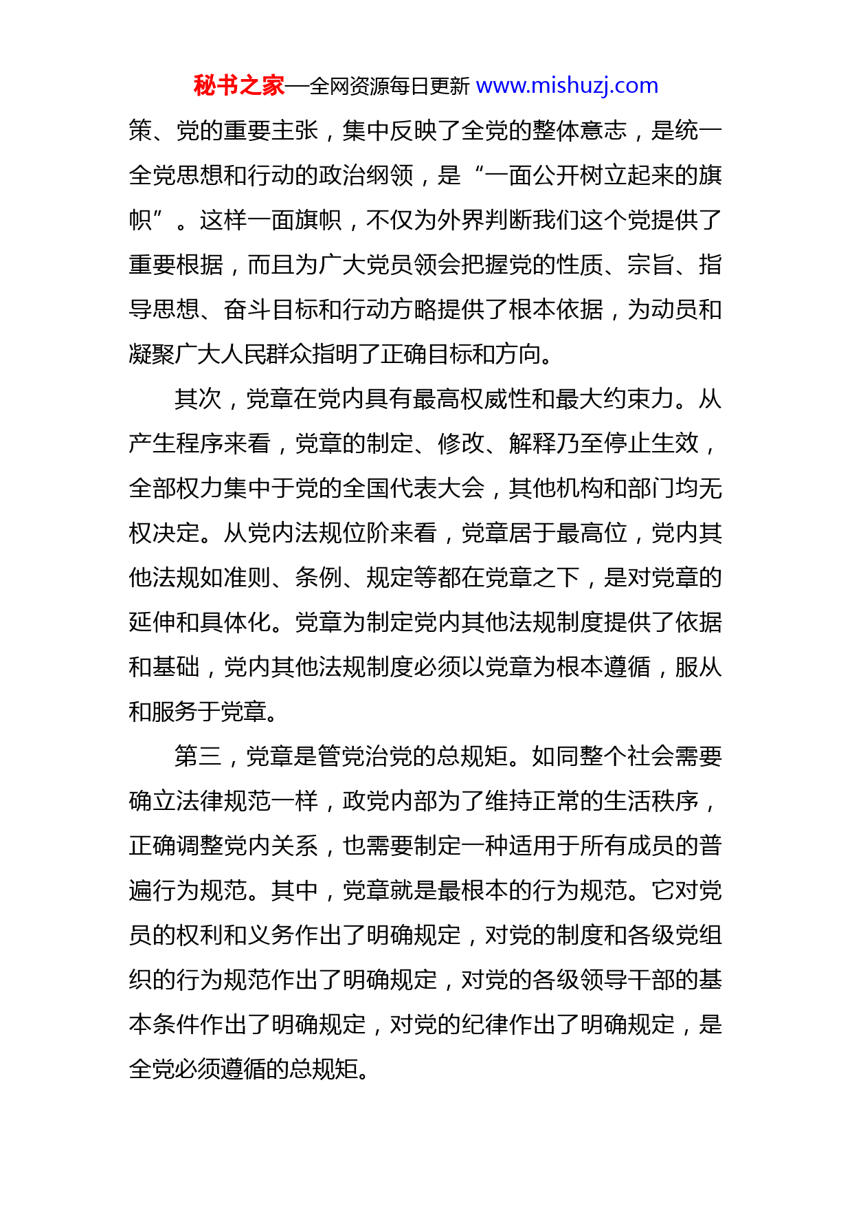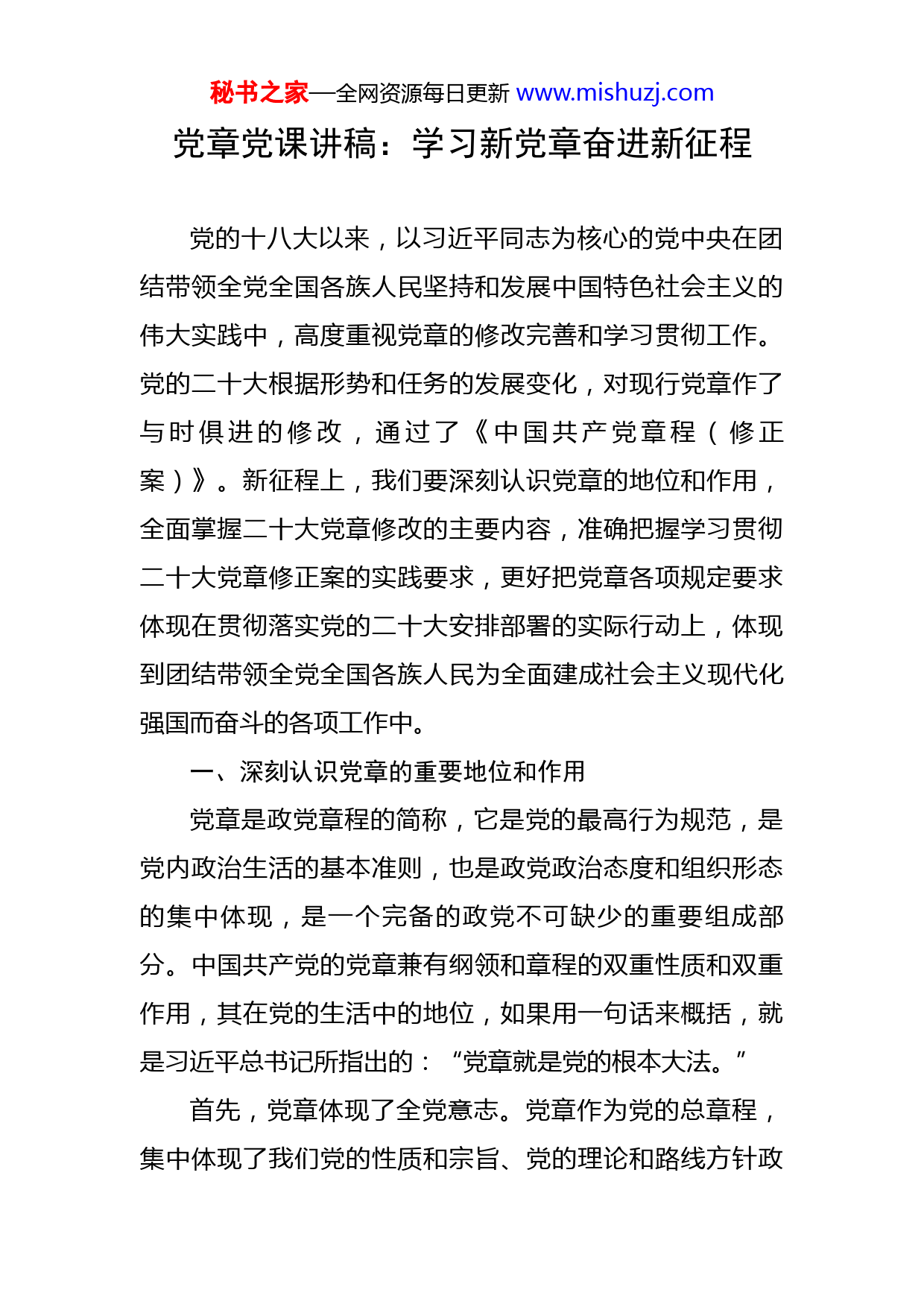 秘书之家—全网资源每日更新www.mishuzj.com党章党课讲稿:学习新党章奋进新征程党的十八大以来,以习近平同志为核心的党中央在团结带领全党全国各族人民坚持和发展中国特色社会主义的伟大实践中,高度重视党章的修改完善和学习贯彻工作。党的二十大根据形势和任务的发展变化,对现行党章作了与时俱进的修改,通过了《中国共产党章程(修正案)》。新征程上,我们要深刻认识党章的地位和作用,全面掌握二十大党章修改的主要内容,准确把握学习贯彻二十大党章修正案的实践要求,更好把党章各项规定要求体现在贯彻落实党的二十大安排部署的实际行动上,体现到团结带领全党全国各族人民为全面建成社会主义现代化强国而奋斗的各项工作中。一、深刻认识党章的重要地位和作用党章是政党章程的简称,它是党的最高行为规范,是党内政治生活的基本准则,也是政党政治态度和组织形态的集中体现,是一个完备的政党不可缺少的重要组成部分。中国共产党的党章兼有纲领和章程的双重性质和双重作用,其在党的生活中的地位,如果用一句话来概括,就是习近平总书记所指出的:“党章就是党的根本大法。”首先,党章体现了全党意志。党章作为党的总章程,集中体现了我们党的性质和宗旨、党的理论和路线方针政秘书之家—全网资源每日更新www.mishuzj.com策、党的重要主张,集中反映了全党的整体意志,是统一全党思想和行动的政治纲领,是“一面公开树立起来的旗帜”。这样一面旗帜,不仅为外界判断我们这个党提供了重要根据,而且为广大党员领会把握党的性质、宗旨、指导思想、奋斗目标和行动方略提供了根本依据,为动员和凝聚广大人民群众指明了正确目标和方向。其次,党章在党内具有最高权威性和最大约束力。从产生程序来看,党章的制定、修改、解释乃至停止生效,全部权力集中于党的全国代表大会,其他机构和部门均无权决定。从党内法规位阶来看,党章居于最高位,党内其他法规如准则、条例、规定等都在党章之下,是对党章的延伸和具体化。党章为制定党内其他法规制度提供了依据和基础,党内其他法规制度必须以党章为根本遵循,服从和服务于党章。第三,党章是管党治党的总规矩。如同整个社会需要确立法律规范一样,政党内部为了维持正常的生活秩序,正确调整党内关系,也需要制定一种适用于所有成员的普遍行为规范。其中,党章就是最根本的行为规范。它对党员的权利和义务作出了明确规定,对党的制度和各级党组织的行为规范作出了明确规定,对党的各级领导干部的基本条件作出了明确规定,对党的纪律作出了明确规定,是全党必须遵循的总规矩。秘书之家—全网资源每日更新www.mishuzj.com二、全面掌握二十大党章修改的主要内容在百年奋斗历程中,我们党总是认真总结革命建设改革的成功经验,及时把党的实践创新、理论创新、制度创新的重要成果体现到党章中,从而使党章在推进党的事业、加强党的建设中发挥了重要指导作用。实践证明,根据新形势、新任务,对党章进行适当修改,有利于更好发挥党章对党的工作和党的建设的根本性规范和指导作用。党的十九大以来,以习近平同志为核心的党中央团结带领全党全军全国各族人民,有效应对严峻复杂的国际形势和接踵而至的巨大风险挑战,坚定不移把中国特色社会主义事业推向前进,取得新的重大理论成果、实践成果、制度成果。党的二十大坚持发扬党内民主,集中全党智慧,对党章作出适当修改,实现了党章的又一次与时俱进。党的二十大党章修正案充实完善了习近平新时代中国特色社会主义思想的科学内涵和历史定位,用“两个结合”阐释了习近平新时代中国特色社会主义思想创立的过程,用“回答重大时代课题”阐释了习近平新时代中国特色社会主义思想的核心要义,用“六个是”的重要判断阐释了习近平新时代中国特色社会主义思想的科学定位,阐释了习近平新时代中国特色社会主义思想的真理力量;增写了党百年奋斗的重大成就和历史经验,进一步统一了全秘书之家—全网资源每日更新www.mishuzj.com党对党的百年奋斗重大成就和历史经验的思想认识,进一步激发了全体党员爱党忧党兴党护党的责任感和使命感,有利于激励全党增强历史主动精神,在新时代新征程奋力创造新的历史伟业;调整完善了党的百年奋斗目标的表述,将实现“两个一百年”奋斗目标、实现中华民族伟大复兴的中国梦而奋斗,修改为实现第二个百年奋斗目标、实现中华民族伟大复兴的中国梦而奋斗,有利于全党同志更加全面准确把握新时代新征程党和国家事业发展新要求,凝聚起全党全国各族人民共同奋斗的意志和力量。此外,还调整完善了社会主义初级阶段方面的内容,充实了“五位一体”总体布局、国防和军队建设、统一战线、外交方面的内容,调整充实了党的建设总体要求的内容,充实完善了坚持党的全面领导的内容,并对条文部分作了适当修改,对党员、党的基层组织、党的干部提出了一些新的要求,充实了完善党的纪律、党的纪律检查机关、党组的职责定位等方面的内容。经过修改和完善,党章更加体现时代性、把握规律性、富于创造性。三、准确把握学习贯彻新党章的实践要求习近平总书记指出,全党学习贯彻党章的水平,决定着党员队伍党性修养的水平,决定着各级党组织凝聚力和