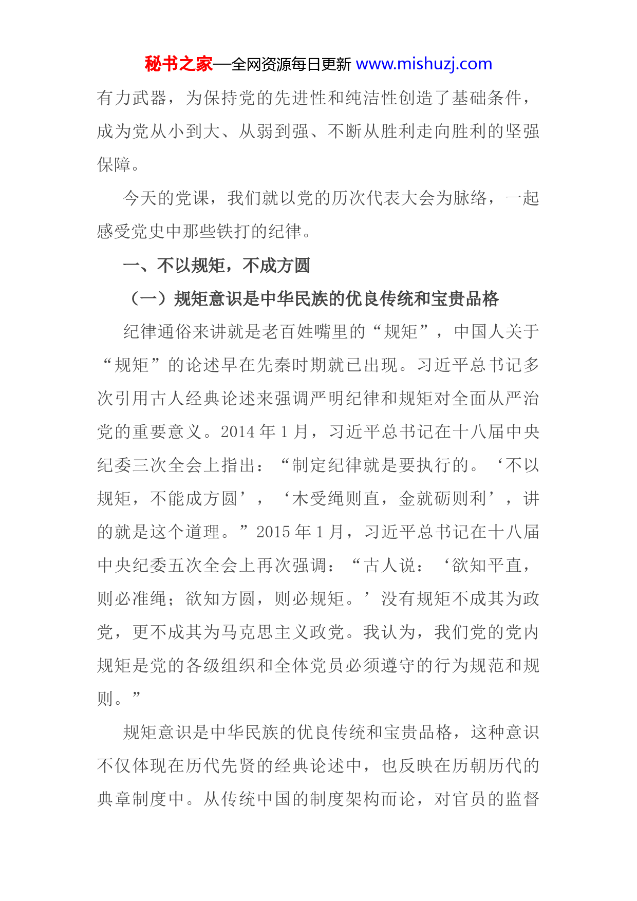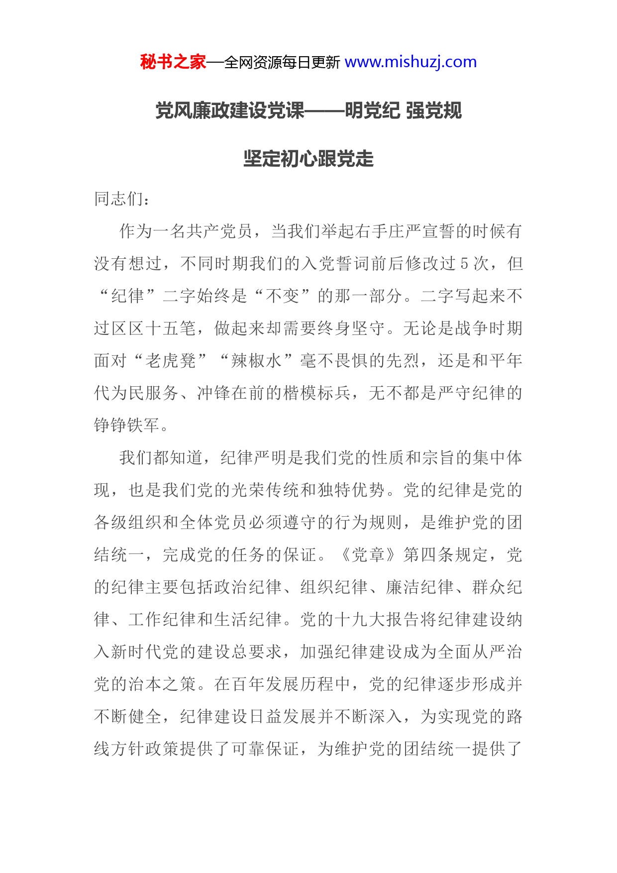 秘书之家—全网资源每日更新www.mishuzj.com党风廉政建设党课——明党纪强党规坚定初心跟党走同志们:作为一名共产党员,当我们举起右手庄严宣誓的时候有没有想过,不同时期我们的入党誓词前后修改过5次,但“纪律”二字始终是“不变”的那一部分。二字写起来不过区区十五笔,做起来却需要终身坚守。无论是战争时期面对“老虎凳”“辣椒水”毫不畏惧的先烈,还是和平年代为民服务、冲锋在前的楷模标兵,无不都是严守纪律的铮铮铁军。我们都知道,纪律严明是我们党的性质和宗旨的集中体现,也是我们党的光荣传统和独特优势。党的纪律是党的各级组织和全体党员必须遵守的行为规则,是维护党的团结统一,完成党的任务的保证。《党章》第四条规定,党的纪律主要包括政治纪律、组织纪律、廉洁纪律、群众纪律、工作纪律和生活纪律。党的十九大报告将纪律建设纳入新时代党的建设总要求,加强纪律建设成为全面从严治党的治本之策。在百年发展历程中,党的纪律逐步形成并不断健全,纪律建设日益发展并不断深入,为实现党的路线方针政策提供了可靠保证,为维护党的团结统一提供了秘书之家—全网资源每日更新www.mishuzj.com有力武器,为保持党的先进性和纯洁性创造了基础条件,成为党从小到大、从弱到强、不断从胜利走向胜利的坚强保障。今天的党课,我们就以党的历次代表大会为脉络,一起感受党史中那些铁打的纪律。一、不以规矩,不成方圆(一)规矩意识是中华民族的优良传统和宝贵品格纪律通俗来讲就是老百姓嘴里的“规矩”,中国人关于“规矩”的论述早在先秦时期就已出现。习近平总书记多次引用古人经典论述来强调严明纪律和规矩对全面从严治党的重要意义。2014年1月,习近平总书记在十八届中央纪委三次全会上指出:“制定纪律就是要执行的。‘不以规矩,不能成方圆’,‘木受绳则直,金就砺则利’,讲的就是这个道理。”2015年1月,习近平总书记在十八届中央纪委五次全会上再次强调:“古人说:‘欲知平直,则必准绳;欲知方圆,则必规矩。’没有规矩不成其为政党,更不成其为马克思主义政党。我认为,我们党的党内规矩是党的各级组织和全体党员必须遵守的行为规范和规则。”规矩意识是中华民族的优良传统和宝贵品格,这种意识不仅体现在历代先贤的经典论述中,也反映在历朝历代的典章制度中。从传统中国的制度架构而论,对官员的监督秘书之家—全网资源每日更新www.mishuzj.com主要通过御史纠察等来完成。自秦朝始,中国统一多民族国家不断得到加强,而在这一过程中,中央监察力量的向外延伸,特别是巡视制度,发挥了不可替代的作用。中国早在商周时期,就把监察纳入法制化规程,监察制度在整饬吏治、规范国家正常运转,维护社会稳定和发展,巩固多民族国家的统一等方面,发挥了重要功能,也为后世积累了可资借鉴的本土资源。习近平总书记在世界经济论坛2017年年会开幕式上指出,“中国立足自身国情和实践,从中华文明中汲取智慧,博采东西方各家之长,坚守但不僵化,借鉴但不照搬,在不断探索中形成了自己的发展道路。”坚持和完善党和国家监督体系,正是习近平总书记所指出的“以古人之规矩,开自己之生面”,实现中华文化的创造性转化和创新性发展的重要组成部分,是中国共产党在新的历史条件下,适应新时代发展需要的重要探索。(二)严明的纪律和规矩是马克思主义政党的基本特性马克思、恩格斯在创建无产阶级政党的过程中,非常重视党内监督和纪律问题,提出了一些重要的思想观点,并在《共产主义者同盟章程》中做出了明确而严格的规定。他们提出,严明纪律是无产阶级政党的建党原则之一,是能够经受各种复杂考验的组织保障。1859年5月18日,马克思在写给恩格斯的信中指出:“我们现在必须绝对保持党的纪律,否则将一事无成。”恩格斯进而提出,在革命秘书之家—全网资源每日更新www.mishuzj.com斗争中,无产阶级“胜利的首要条件是严格遵守法律”“这种纪律是一个有成效的和坚强的组织的首要条件,是资产阶级最害怕的”。列宁也指出,布尔什维克成功的基本条件是严明纪律,要使无产阶级能够正确地、有效地、胜利地发挥自己的组织作用,无产阶级政党的内部就必须实行极严格的集中和极严格的纪律。习近平总书记在纪念马克思诞辰200周年大会上的讲话中强调“要学习和实践马克思主义关于马克思主义政党建设的思想”。作为马克思主义政党,中国共产党自成立之日起,就把严明纪律和规矩摆在重要位置。党的十八大以来,以习近平同志为核心的党中央,始终把立规矩、讲规矩作为重要抓手,强调党要管党、全面从严治党。2015年1月,在中央政治局常务委员会会议上,习近平总书记指出:“坚持党的领导,首先是要坚持党中央的集中统一领导,这是一条根本的政治规矩。”在2018年1月学习贯彻党的十九大精神研讨班开班式上,习近平总书记强调,我们党要始终成为时代先锋、民族脊梁,始终成为马克思主义执政党,自身必须始终过硬。(三)“铁规生威”关键要有一套制约和监督体系来保障执行党的十八大以来,党中央在全面从严治党的过程中,特别注重明规矩、立规矩。习近平总书记指出,“党要管党秘书之家—全网资源每日更新www.mishuzj.com从严治党,靠什么管,凭什么治?就要靠严明纪律”“治理一个国家