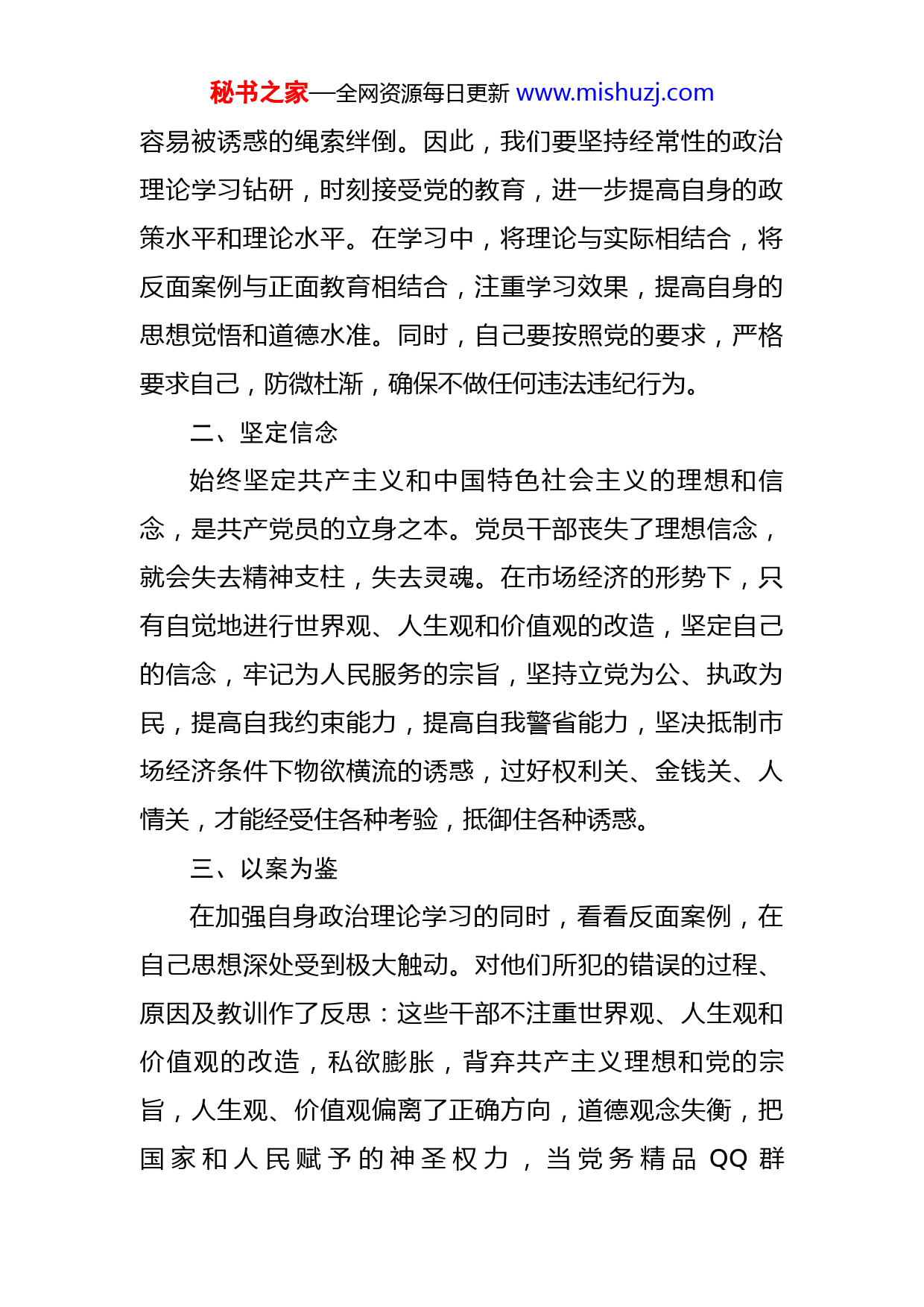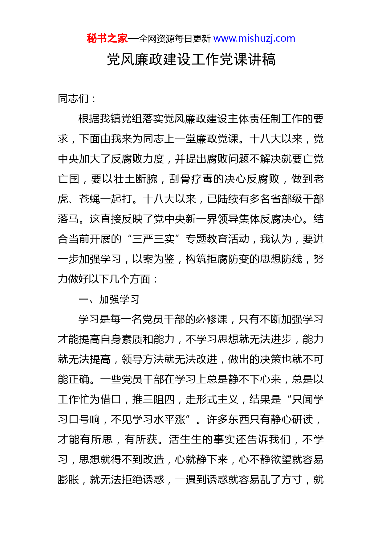 秘书之家—全网资源每日更新www.mishuzj.com党风廉政建设工作党课讲稿同志们:根据我镇党组落实党风廉政建设主体责任制工作的要求,下面由我来为同志上一堂廉政党课。十八大以来,党中央加大了反腐败力度,并提出腐败问题不解决就要亡党亡国,要以壮土断腕,刮骨疗毒的决心反腐败,做到老虎、苍蝇一起打。十八大以来,已陆续有多名省部级干部落马。这直接反映了党中央新一界领导集体反腐决心。结合当前开展的“三严三实”专题教育活动,我认为,要进一步加强学习,以案为鉴,构筑拒腐防变的思想防线,努力做好以下几个方面:一、加强学习学习是每一名党员干部的必修课,只有不断加强学习才能提高自身素质和能力,不学习思想就无法进步,能力就无法提高,领导方法就无法改进,做出的决策也就不可能正确。一些党员干部在学习上总是静不下心来,总是以工作忙为借口,推三阻四,走形式主义,结果是“只闻学习口号响,不见学习水平涨”。许多东西只有静心研读,才能有所思,有所获。活生生的事实还告诉我们,不学习,思想就得不到改造,心就静下来,心不静欲望就容易膨胀,就无法拒绝诱惑,一遇到诱惑就容易乱了方寸,就秘书之家—全网资源每日更新www.mishuzj.com容易被诱惑的绳索绊倒。因此,我们要坚持经常性的政治理论学习钻研,时刻接受党的教育,进一步提高自身的政策水平和理论水平。在学习中,将理论与实际相结合,将反面案例与正面教育相结合,注重学习效果,提高自身的思想觉悟和道德水准。同时,自己要按照党的要求,严格要求自己,防微杜渐,确保不做任何违法违纪行为。二、坚定信念始终坚定共产主义和中国特色社会主义的理想和信念,是共产党员的立身之本。党员干部丧失了理想信念,就会失去精神支柱,失去灵魂。在市场经济的形势下,只有自觉地进行世界观、人生观和价值观的改造,坚定自己的信念,牢记为人民服务的宗旨,坚持立党为公、执政为民,提高自我约束能力,提高自我警省能力,坚决抵制市场经济条件下物欲横流的诱惑,过好权利关、金钱关、人情关,才能经受住各种考验,抵御住各种诱惑。三、以案为鉴在加强自身政治理论学习的同时,看看反面案例,在自己思想深处受到极大触动。对他们所犯的错误的过程、原因及教训作了反思:这些干部不注重世界观、人生观和价值观的改造,私欲膨胀,背弃共产主义理想和党的宗旨,人生观、价值观偏离了正确方向,道德观念失衡,把国家和人民赋予的神圣权力,当党务精品QQ群秘书之家—全网资源每日更新www.mishuzj.com824703735为党务工作者提供大量资料,每天更新40多篇,请加QQ:962665491进行咨询!成了谋取不义之财,谋取私利的工具。我们要清醒的认识到:作为一名共产党员,应该时刻提醒自己,时刻牢记一个共产党员的标准,强化政治意识、大局意识、奉献意识、服务意识、勤政意识,忠实践行科学发展观重要思想。通过学习对照,既提高了自己的认识水平,又从反面教材中汲取了教训,从各方面严格要求自己。四、廉洁自律两袖清风,廉洁从政,这是每一名干部最基本的行为准绳。廉洁自律是反对腐败、加强党风廉政建设的关键。党员干部能否以身作则,对加强党风廉政建设,推动反腐败斗争的深入发展至关重要。只有以身作则,党员领导干部才有示范作用,才有教育和管好身边的人,党一直教育我们要廉洁奉公、严格自律,才能体现共产党员的先进性。党员干部不廉洁,不仅会使党在群众中的形象受到扭曲和破坏,而且会使党、国家和人民的利益受到损害。有些党员干部并非学识不高,能力不强,就是因为未能廉洁自律,最后走向犯罪。因此,我们一定要树立正确的世界观、人生观和价值观,牢记全心全意为人民服务的宗旨,自重、自律、自醒,排除非份之想,始终保持共产党人的高尚品质。党员干部一定要树立正确的权力观和科学的发秘书之家—全网资源每日更新www.mishuzj.com展观,权力必须为群众谋利益,绝不能为个人或少数人谋取私利。要把心思用在工作上,用在干事业上,用在为群众谋利益上。特别要严格遵守廉洁自律的有关规定,守得住清贫,耐得住寂寞,管得住小节,挡得住诱惑,做一个清清白白的人。五、艰苦奋斗近年来,有一部分党员干部,淡忘了艰苦奋斗作风,贪图享受,热衷于追求个人和小家庭的安逸,抛弃党纪法规,贪污腐化,走上犯罪的道路。我们一定要引以为戒,要继续发扬艰苦奋斗的作风,恪守党的宗旨,提倡勤俭节约,反对铺张浪费,始终不渝地保持和发扬艰苦奋斗的优良传统。各位同志,加强党风廉政建设教育活动尤为必要,对于广大党员干部廉洁从政,严守党纪国法,推动党风廉政建设和反腐败斗争,都具有重要的意义。在社会主义经济建设时期,有些党员干部在个人欲望的驱使下逐步淡漠了法制观念,在权力、金钱、美色、人情面前丧失原则,置党多年的培养教育于不顾,利用职务之便做出有悖于共产党员、人民公仆的原则和宗旨的事情,迈出了罪恶的步子,最终身败名裂,甚至付出了生命的代价。教训是深刻的、惨痛的,前车之鉴,后车之师,在今后两馆的工作中,特别是涉及到免费开放活动及农村文化专项资金的工秘书之家—全网资源每日更新www.mishuzj.com作,我们一定要树立廉洁自律的思想,要从这些案例特别是身边的案例中吸取教训,引以为戒。