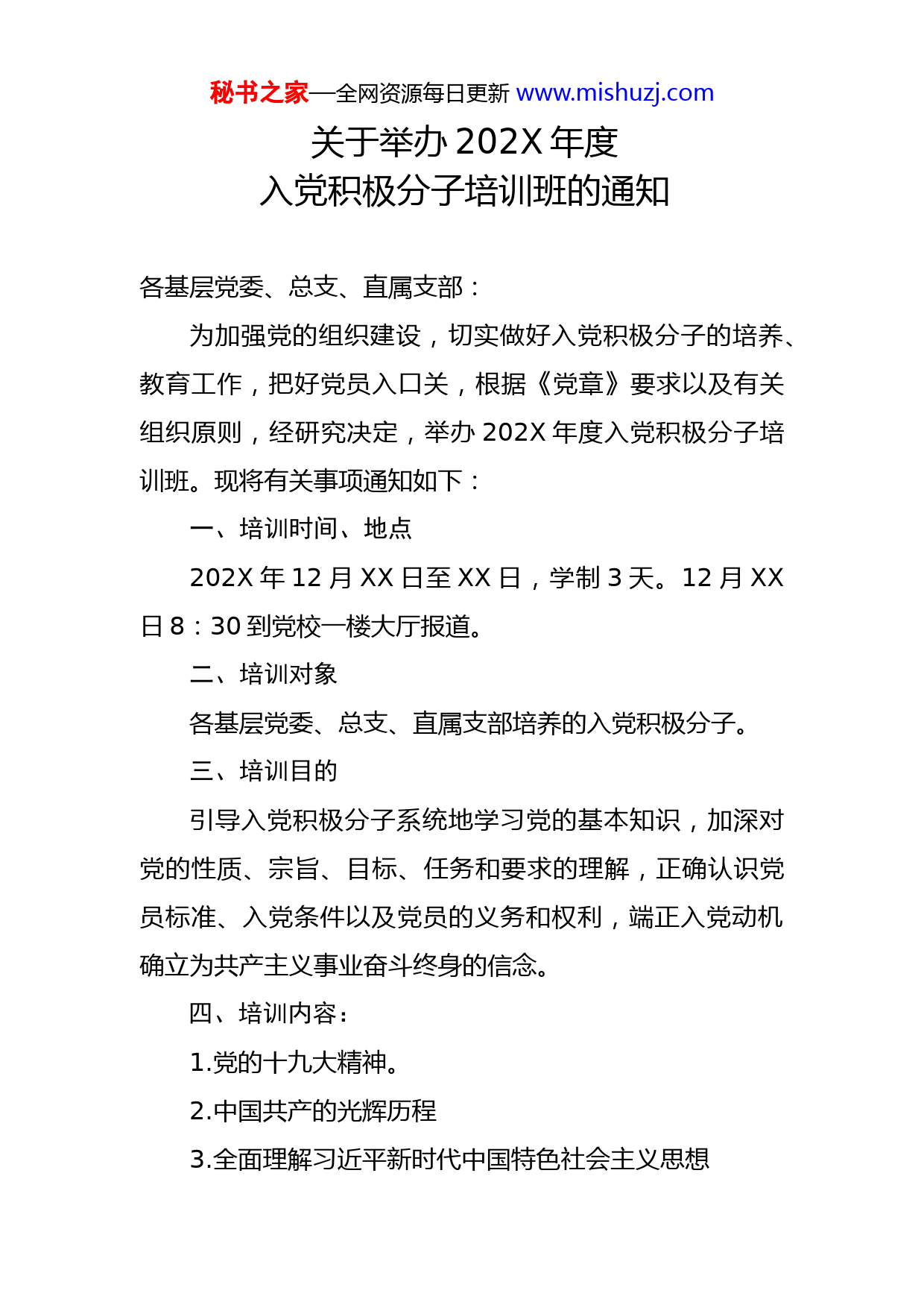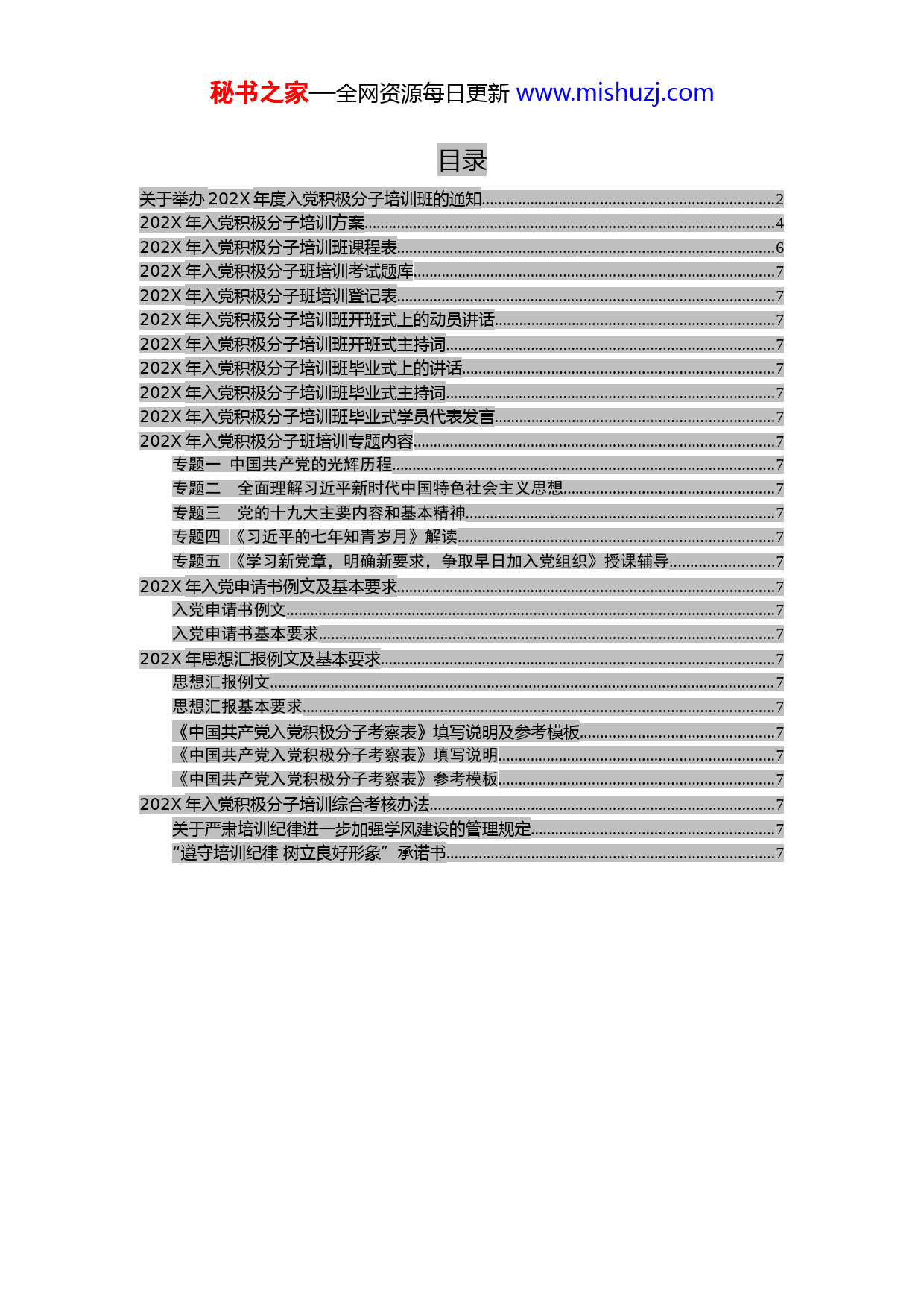 秘书之家—全网资源每日更新www.mishuzj.com目录关于举办202X年度入党积极分子培训班的通知.......................................................................2202X年入党积极分子培训方案....................................................................................................4202X年入党积极分子培训班课程表............................................................................................6202X年入党积极分子班培训考试题库........................................................................................7202X年入党积极分子班培训登记表............................................................................................7202X年入党积极分子培训班开班式上的动员讲话....................................................................7202X年入党积极分子培训班开班式主持词................................................................................7202X年入党积极分子培训班毕业式上的讲话............................................................................7202X年入党积极分子培训班毕业式主持词................................................................................7202X年入党积极分子培训班毕业式学员代表发言....................................................................7202X年入党积极分子班培训专题内容........................................................................................7专题一中国共产党的光辉历程.............................................................................................7专题二全面理解习近平新时代中国特色社会主义思想...................................................7专题三党的十九大主要内容和基本精神...........................................................................7专题四《习近平的七年知青岁月》解读.............................................................................7专题五《学习新党章,明确新要求,争取早日加入党组织》授课辅导.........................7202X年入党申请书例文及基本要求............................................................................................7入党申请书例文.......................................................................................................................7入党申请书基本要求...............................................................................................................7202X年思想汇报例文及基本要求................................................................................................7思想汇报例文..........................................................................................................................7思想汇报基本要求...................................................................................................................7《中国共产党入党积极分子考察表》填写说明及参考模板...............................................7《中国共产党入党积极分子考察表》填写说明...................................................................7《中国共产党入党积极分子考察表》参考模板...................................................................7202X年入党积极分子培训综合考核办法....................................................................................7关于严肃培训纪律进一步加强学风建设的管理规定...........................................................7“遵守培训纪律树立良好形象”承诺书................................................................................7秘书之家—全网资源每日更新www.mishuzj.com关于举办202X年度入党积极分子培训班的通知各基层党委、总支、直属支部:为加强党的组织建设,切实做好入党积极分子的培养、教育工作,把好党员入口关,根据《党章》要求以及有关组织原则,经研究决定,举办202X年度入党积极分子培训班。现将有关事项通知如下:一、培训时间、地点202X年12月XX日至XX日,学制3天。12月XX日8:30到党校一楼大厅报道。二、培训对象各基层党委、总支、直属支部培养的入党积极分子。三、培训目的引导入党积极分子系统地学习党的基本知识,加深对党的性质、宗旨、目标、任务和要求的理解,正确认识党员标准、入党条件以及党员的义务和权利,端正入党动机确立为共产主义事业奋斗终身的信念。四、培训内容:1.党的十九大精神。2.中国共产的光辉历程3.全面理解习近平新时代中国特色社会主义思想秘书之家—全网资源每日更新www.mishuzj.com4.《习近平的七年知青岁月》解读5.《学习新党章,明确新要求,争取早日加入党组织》授课辅导五、培训方式培训采取集中辅导、个人自学等方式结合进行。六、培训要求1、各党支部要认真组织入党积极分子参加培训,合理安排时间,确保培训对象完成规定的学时和培训质量。2、本次培训以提高入党积极分子对党的认识为主,参训人员要提高认识,积极认真参加这次培训,希望受训后能积极向党组织靠拢。3、参训人员应严格遵守培训纪律,做好学习笔记,不得迟到早退,不得无故缺席及请假。4、入党积极分子参加培训是其发展入党的前提条件,培训期间表现要作为组织发展的参考。请各党支部按照名额分配表认真做好本单位的入党积极分子的培训组织工作。附件:参加培训学员名单中共XX党委组织部202X年12月X日秘书之家—全网资源每日更新www.mishuzj.com202X年入党积极分子培训方案为进一步加强对入党积极分子的培训工作,切实增强入党积极分子的责任意识和先锋队意识,提高党员队伍的凝聚力和