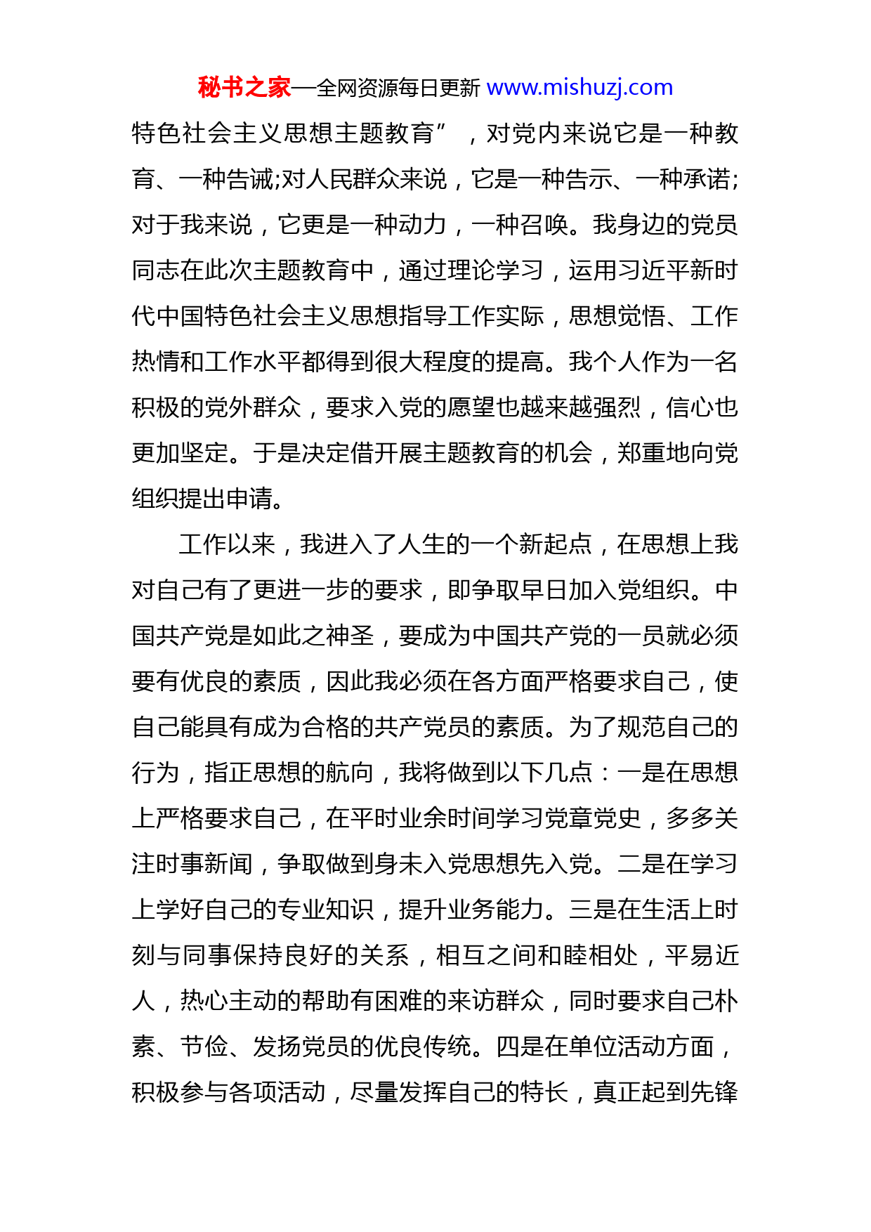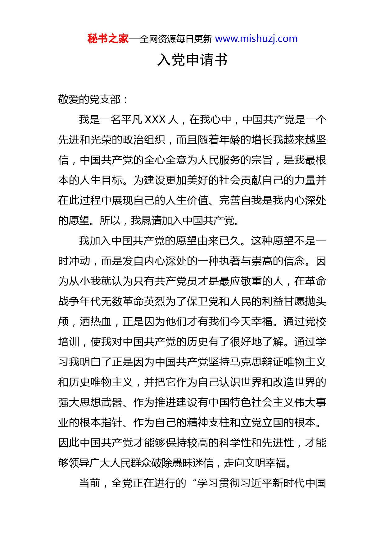 秘书之家—全网资源每日更新www.mishuzj.com入党申请书敬爱的党支部:我是一名平凡XXX人,在我心中,中国共产党是一个先进和光荣的政治组织,而且随着年龄的增长我越来越坚信,中国共产党的全心全意为人民服务的宗旨,是我最根本的人生目标。为建设更加美好的社会贡献自己的力量并在此过程中展现自己的人生价值、完善自我是我内心深处的愿望。所以,我恳请加入中国共产党。我加入中国共产党的愿望由来已久。这种愿望不是一时冲动,而是发自内心深处的一种执著与崇高的信念。因为从小我就认为只有共产党员才是最应敬重的人,在革命战争年代无数革命英烈为了保卫党和人民的利益甘愿抛头颅,洒热血,正是因为他们才有我们今天幸福。通过党校培训,使我对中国共产党的历史有了很好地了解。通过学习我明白了正是因为中国共产党坚持马克思辩证唯物主义和历史唯物主义,并把它作为自己认识世界和改造世界的强大思想武器、作为推进建设有中国特色社会主义伟大事业的根本指针、作为自己的精神支柱和立党立国的根本。因此中国共产党才能够保持较高的科学性和先进性,才能够领导广大人民群众破除愚昧迷信,走向文明幸福。当前,全党正在进行的“学习贯彻习近平新时代中国秘书之家—全网资源每日更新www.mishuzj.com特色社会主义思想主题教育”,对党内来说它是一种教育、一种告诫;对人民群众来说,它是一种告示、一种承诺;对于我来说,它更是一种动力,一种召唤。我身边的党员同志在此次主题教育中,通过理论学习,运用习近平新时代中国特色社会主义思想指导工作实际,思想觉悟、工作热情和工作水平都得到很大程度的提高。我个人作为一名积极的党外群众,要求入党的愿望也越来越强烈,信心也更加坚定。于是决定借开展主题教育的机会,郑重地向党组织提出申请。工作以来,我进入了人生的一个新起点,在思想上我对自己有了更进一步的要求,即争取早日加入党组织。中国共产党是如此之神圣,要成为中国共产党的一员就必须要有优良的素质,因此我必须在各方面严格要求自己,使自己能具有成为合格的共产党员的素质。为了规范自己的行为,指正思想的航向,我将做到以下几点:一是在思想上严格要求自己,在平时业余时间学习党章党史,多多关注时事新闻,争取做到身未入党思想先入党。二是在学习上学好自己的专业知识,提升业务能力。三是在生活上时刻与同事保持良好的关系,相互之间和睦相处,平易近人,热心主动的帮助有困难的来访群众,同时要求自己朴素、节俭、发扬党员的优良传统。四是在单位活动方面,积极参与各项活动,尽量发挥自己的特长,真正起到先锋秘书之家—全网资源每日更新www.mishuzj.com模范作用。我将努力做到以上四点,并随时向身边的优秀同事看齐,向优秀党员看齐,始终从党员的高标准来衡量自己的一言一行。我深知按党的要求,自己的差距还很大,如处理问题不够成熟,政治理论水平不高等,倘若党组织认为我还不能成为一名合格的共产党员,我也不会气馁,我会继续为成为一名合格共产党员而奋斗!我会诚恳地接受组织的建议反思自己的不足,并在以后的生活和工作中不断地改进,努力完善自我,使自己能够具备成为中国共产党员的品质,希望党组织从严要求,以使我更快进步。我将用党员的标准严格要求自己,自觉地接受党员和群众的帮助与监督,努力克服自己的缺点,弥补不足,争取早日在思想上,进而在组织上入党。我渴望成为一名共产党员,并诚请党组织能够对我进行多方面的考验,批准我入党的申请。此致敬礼!申请人:XXX申请时间:XXXX年X月X日