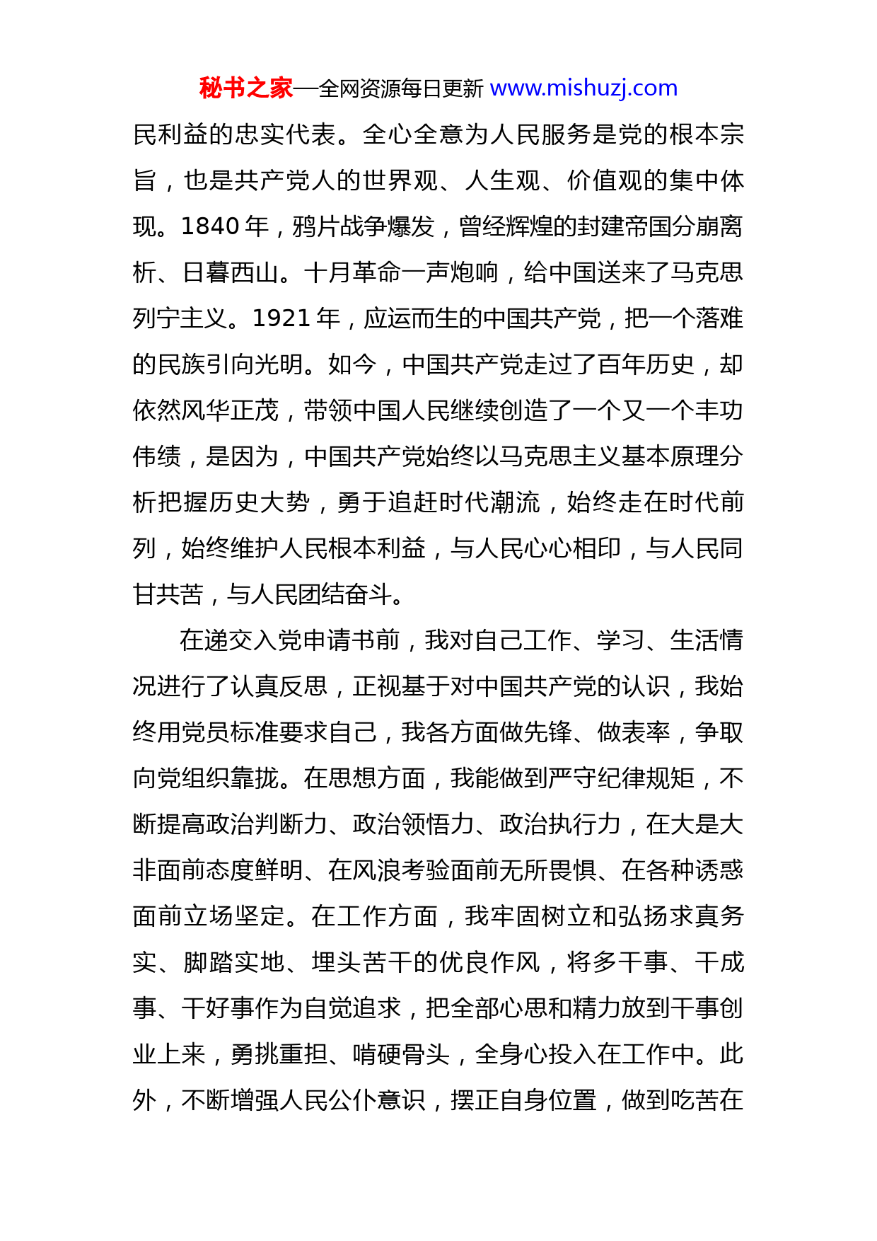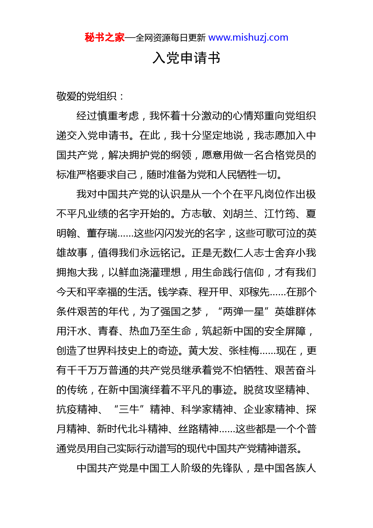 秘书之家—全网资源每日更新www.mishuzj.com入党申请书敬爱的党组织:经过慎重考虑,我怀着十分激动的心情郑重向党组织递交入党申请书。在此,我十分坚定地说,我志愿加入中国共产党,解决拥护党的纲领,愿意用做一名合格党员的标准严格要求自己,随时准备为党和人民牺牲一切。我对中国共产党的认识是从一个个在平凡岗位作出极不平凡业绩的名字开始的。方志敏、刘胡兰、江竹筠、夏明翰、董存瑞……这些闪闪发光的名字,这些可歌可泣的英雄故事,值得我们永远铭记。正是无数仁人志士舍弃小我拥抱大我,以鲜血浇灌理想,用生命践行信仰,才有我们今天和平幸福的生活。钱学森、程开甲、邓稼先……在那个条件艰苦的年代,为了强国之梦,“两弹一星”英雄群体用汗水、青春、热血乃至生命,筑起新中国的安全屏障,创造了世界科技史上的奇迹。黄大发、张桂梅……现在,更有千千万万普通的共产党员继承着党不怕牺牲、艰苦奋斗的传统,在新中国演绎着不平凡的事迹。脱贫攻坚精神、抗疫精神、“三牛”精神、科学家精神、企业家精神、探月精神、新时代北斗精神、丝路精神……这些都是一个个普通党员用自己实际行动谱写的现代中国共产党精神谱系。中国共产党是中国工人阶级的先锋队,是中国各族人秘书之家—全网资源每日更新www.mishuzj.com民利益的忠实代表。全心全意为人民服务是党的根本宗旨,也是共产党人的世界观、人生观、价值观的集中体现。1840年,鸦片战争爆发,曾经辉煌的封建帝国分崩离析、日暮西山。十月革命一声炮响,给中国送来了马克思列宁主义。1921年,应运而生的中国共产党,把一个落难的民族引向光明。如今,中国共产党走过了百年历史,却依然风华正茂,带领中国人民继续创造了一个又一个丰功伟绩,是因为,中国共产党始终以马克思主义基本原理分析把握历史大势,勇于追赶时代潮流,始终走在时代前列,始终维护人民根本利益,与人民心心相印,与人民同甘共苦,与人民团结奋斗。在递交入党申请书前,我对自己工作、学习、生活情况进行了认真反思,正视基于对中国共产党的认识,我始终用党员标准要求自己,我各方面做先锋、做表率,争取向党组织靠拢。在思想方面,我能做到严守纪律规矩,不断提高政治判断力、政治领悟力、政治执行力,在大是大非面前态度鲜明、在风浪考验面前无所畏惧、在各种诱惑面前立场坚定。在工作方面,我牢固树立和弘扬求真务实、脚踏实地、埋头苦干的优良作风,将多干事、干成事、干好事作为自觉追求,把全部心思和精力放到干事创业上来,勇挑重担、啃硬骨头,全身心投入在工作中。此外,不断增强人民公仆意识,摆正自身位置,做到吃苦在秘书之家—全网资源每日更新www.mishuzj.com前、享乐在后,克己奉公、甘于奉献,努力办好人民群众的急事、难事、愁事,切实增强群众获得感、幸福感、安全感。在日常工作和生活中,我一直以一个党员的标准要求自己,注意积极团结同事,热心助人,树立良好的职业道德观念,干一行爱一行,扎扎实实工作,时刻保持积极进取的良好心态。踏上新的征程,祖国的建设面临着更大的机遇和挑战,祖国的事业需要我们无私奉献、努力付出。我们要传承弘扬爱国奉献精神,自觉把个人的理想和志向同国家的前途和需要紧密结合起来,以身许国,到国家最需要的地方去建功立业。我知道,自己离一个优秀共产党员的标准和要求还有一定距离,还存在一些需要克服的缺点。比如,有时忙于工作放松了学习,在业务钻研方面还不够刻苦,在创新工作方面也有很大的空间可以努力。在今后工作中,我会正视自身存在的缺点,多向优秀党员看齐,用他们的事迹激励自己,努力提高自己,向党组织看齐。我相信,在党组织的关怀下,在各同事的帮助下,我会不断积累经验,提高自身素质、增强工作能力,使自己真正成为一个能经受任何考验的真正的共产党员。今天,我向党组织递交了入党申请书,并愿意接受党组织的考验。此致秘书之家—全网资源每日更新www.mishuzj.com敬礼!申请人:X20XX年X月X日