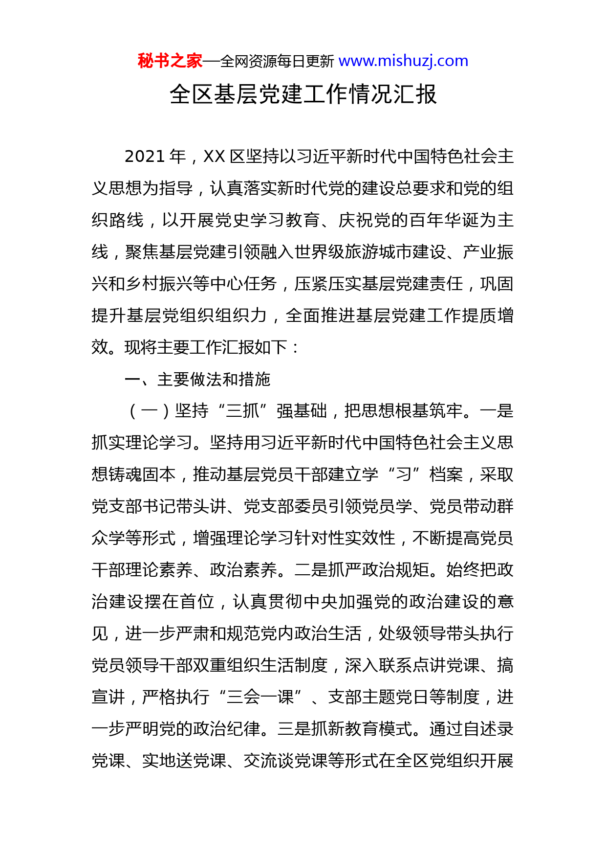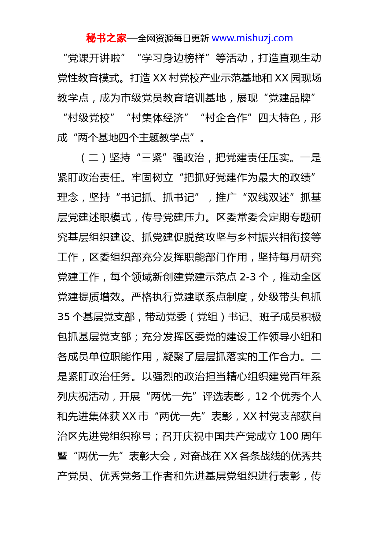 秘书之家—全网资源每日更新www.mishuzj.com全区基层党建工作情况汇报2021年,XX区坚持以习近平新时代中国特色社会主义思想为指导,认真落实新时代党的建设总要求和党的组织路线,以开展党史学习教育、庆祝党的百年华诞为主线,聚焦基层党建引领融入世界级旅游城市建设、产业振兴和乡村振兴等中心任务,压紧压实基层党建责任,巩固提升基层党组织组织力,全面推进基层党建工作提质增效。现将主要工作汇报如下:一、主要做法和措施(一)坚持“三抓”强基础,把思想根基筑牢。一是抓实理论学习。坚持用习近平新时代中国特色社会主义思想铸魂固本,推动基层党员干部建立学“习”档案,采取党支部书记带头讲、党支部委员引领党员学、党员带动群众学等形式,增强理论学习针对性实效性,不断提高党员干部理论素养、政治素养。二是抓严政治规矩。始终把政治建设摆在首位,认真贯彻中央加强党的政治建设的意见,进一步严肃和规范党内政治生活,处级领导带头执行党员领导干部双重组织生活制度,深入联系点讲党课、搞宣讲,严格执行“三会一课”、支部主题党日等制度,进一步严明党的政治纪律。三是抓新教育模式。通过自述录党课、实地送党课、交流谈党课等形式在全区党组织开展秘书之家—全网资源每日更新www.mishuzj.com“党课开讲啦”“学习身边榜样”等活动,打造直观生动党性教育模式。打造XX村党校产业示范基地和XX园现场教学点,成为市级党员教育培训基地,展现“党建品牌”“村级党校”“村集体经济”“村企合作”四大特色,形成“两个基地四个主题教学点”。(二)坚持“三紧”强政治,把党建责任压实。一是紧盯政治责任。牢固树立“把抓好党建作为最大的政绩”理念,坚持“书记抓、抓书记”,推广“双线双述”抓基层党建述职模式,传导党建压力。区委常委会定期专题研究基层组织建设、抓党建促脱贫攻坚与乡村振兴相衔接等工作,区委组织部充分发挥职能部门作用,坚持每月研究党建工作,每个领域新创建党建示范点2-3个,推动全区党建提质增效。严格执行党建联系点制度,处级带头包抓35个基层党支部,带动党委(党组)书记、班子成员积极包抓基层党支部;充分发挥区委党的建设工作领导小组和各成员单位职能作用,凝聚了层层抓落实的工作合力。二是紧盯政治任务。以强烈的政治担当精心组织建党百年系列庆祝活动,开展“两优一先”评选表彰,12个优秀个人和先进集体获XX市“两优一先”表彰,XX村党支部获自治区先进党组织称号;召开庆祝中国共产党成立100周年暨“两优一先”表彰大会,对奋战在XX各条战线的优秀共产党员、优秀党务工作者和先进基层党组织进行表彰,传秘书之家—全网资源每日更新www.mishuzj.com递榜样力量;开展党内关爱帮扶,组织各基层党组织开展“七一”走访慰问,为XX名老党员颁发“光荣在党50年”纪念章;组织观看庆祝中国共产党成立100周年庆祝大会、升旗仪式和重温入党誓词等活动,营造庆祝建党100周年的浓厚氛围;积极开展“党旗在基层一线高高飘扬”活动,深化“我为群众办实事”实践活动,激励动员基层党组织和广大党员发挥党组织战斗堡垒作用和党员先锋模范作用,切实为群众办实事解难题,为建党100周年献礼。三是紧盯整改提升。做实选人用人专项巡察“后半篇文章”,对7个方面15个具体问题进行全面落实整改。制定《XX区2021年后进村党组织整顿提升实施方案》,落实落细“八个一”措施,排查整顿1个后进村党组织。扎实开展排查整顿农村党员违规违纪问题工作,对十八大以来发展的XX名农村党员进行排查整顿,排查发现疑似问题线索XX条,现正进行梳理甄别及认定工作。(三)坚持“三硬”强堡垒,把组织优势放大。一是打造过硬党组织。全力推进农村基层党建“整乡推进、整区提升”示范区乡创建行动,全区处级干部与XX个行政村建立党支部工作联系点,开展“六个一”常态化联系,推动基层党建提质聚力。持续深化村级党组织星级化管理,新增申报1个五星级党组织、2个四星级党组织和2个三星级党组织。成立XX文旅等3个“两新”和1个小区党组秘书之家—全网资源每日更新www.mishuzj.com织,党的组织和工作覆盖进一步加强。二是锻造过硬“领头雁”。坚持“五个贯穿始终”,选举产生新一届村(社区)“两委”干部XX名,村(社区)“两委”换届实现4个100%,村(社区)“两委”换届工作经验做法在全市村(社区)“两委”换届工作会议上作书面发言。统筹选拔XX名优秀“五方面人员”、调任XX名区直事业单位干部进入乡镇领导班子,自治区换届工作督导指导组亲临XX观摩指导。抓好新任村“两委”干部、村集体经济组织负责人系统培训轮训,增强“领头雁”带动群众致富能力。完善新任村支部书记区级备案管理制度,实行村党组织书记系统化培养、专职化管理、星级化考核。选优派强驻村工作队伍,新选派21名干部驻村,配备XX个村级组织员,建立XX个行政村(社区)后备人才信息和档案库,增强村级后备力量,强化后备人才储备。三是铸造过硬“先锋队”。注重在农村优秀青年、致富带头人、高知识群体、35岁以下青年等类型中大力发展党员,推行党员“4+1”工作法,超额完成党员发展指导数,确保发展党员数量和质量“双线”提升。制定《XX区2021年农村党员大培训实施方案》,开展务实管用的专题培训,